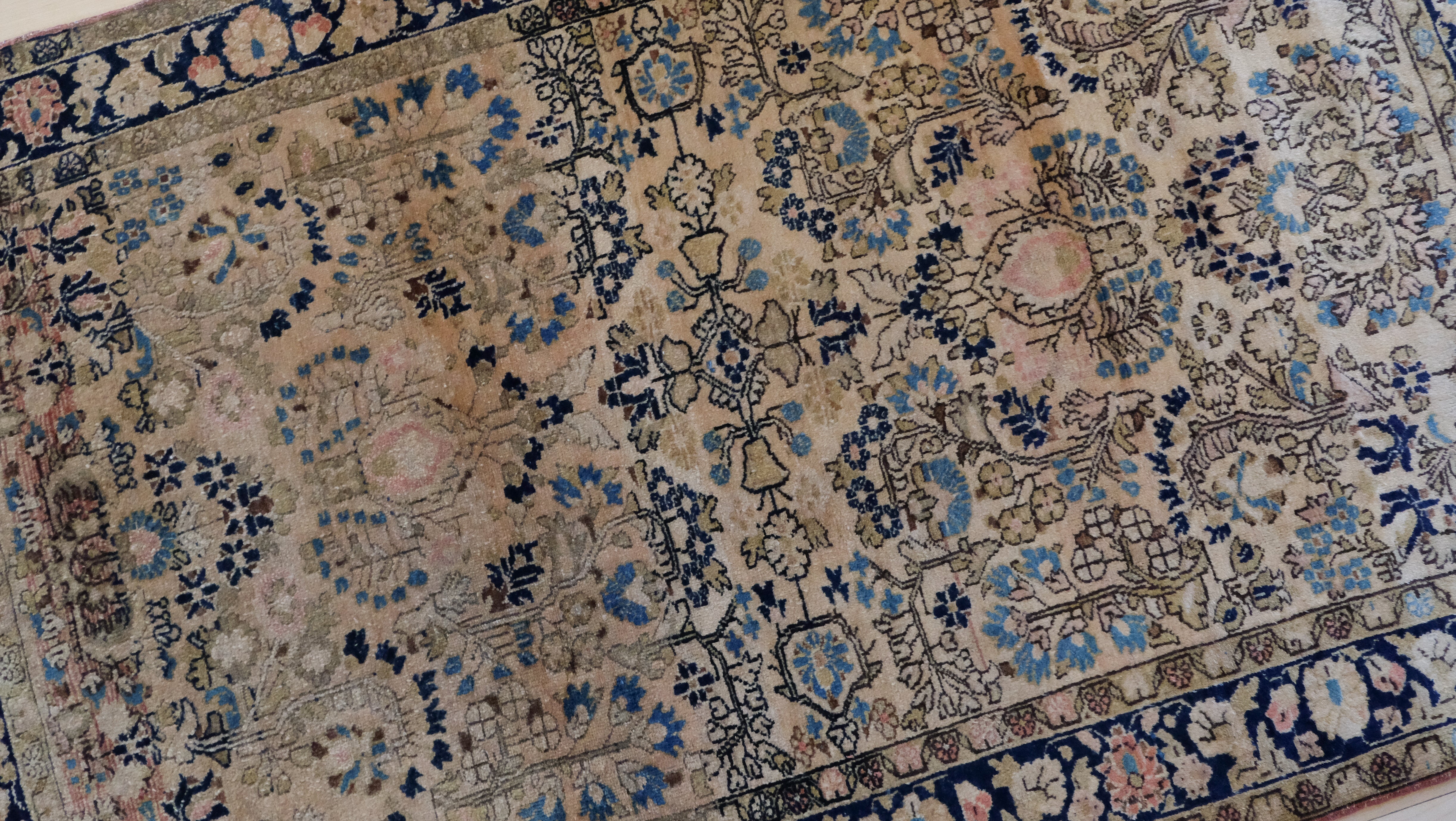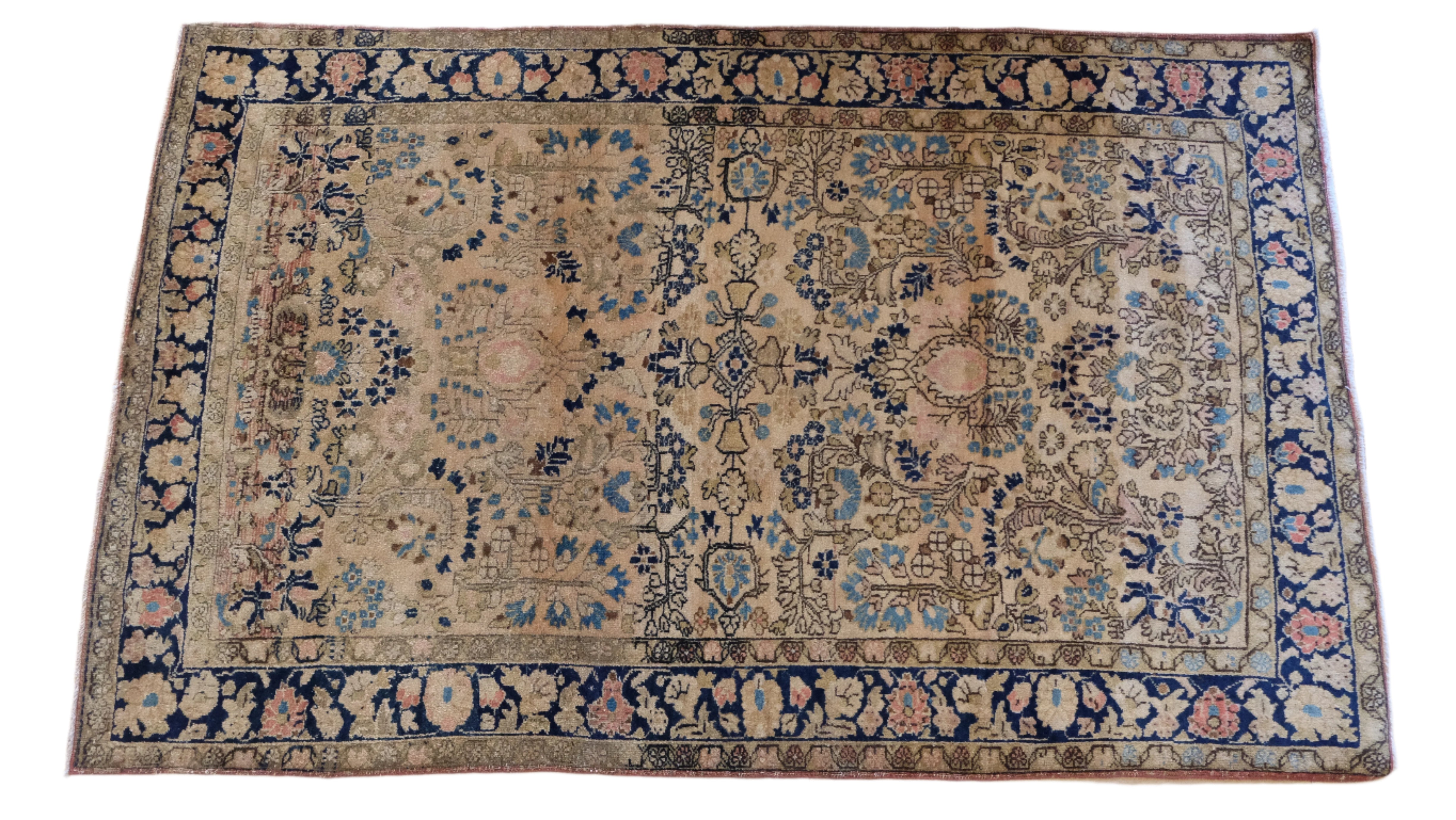 Persian Sarouk with a blush field and accents of navy, olive green and cream