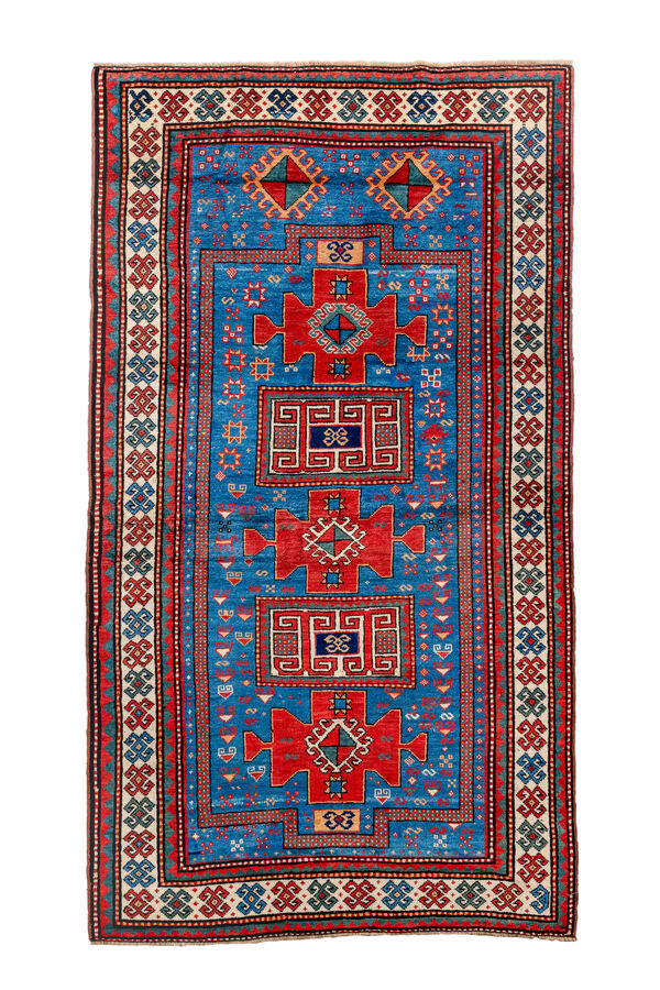 Turn of the century Kazak with French blue, vibrant red, emerald green and ivory