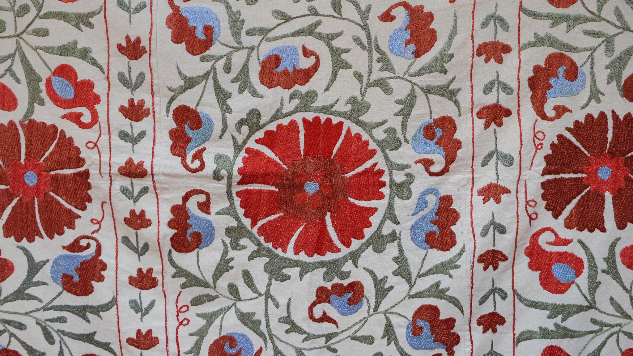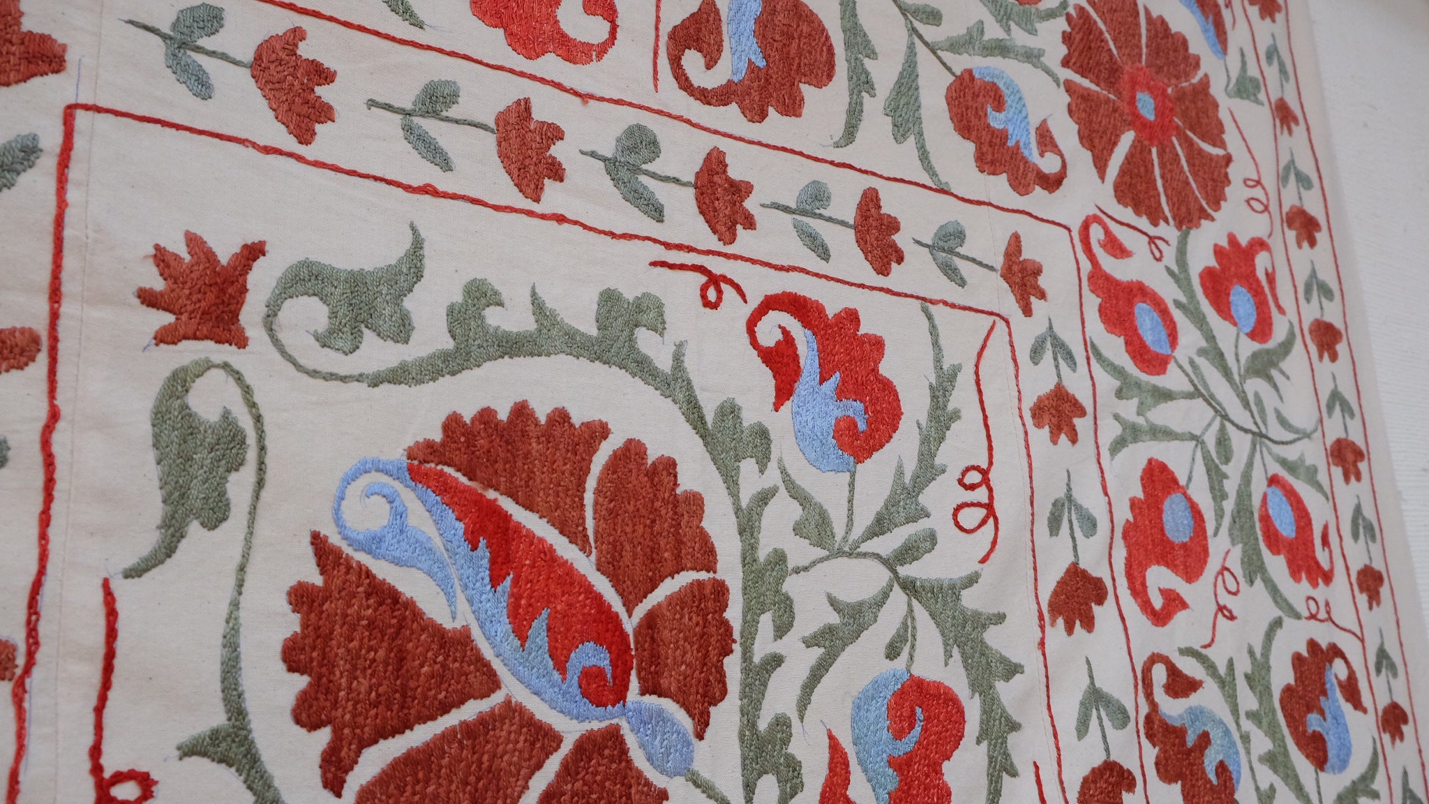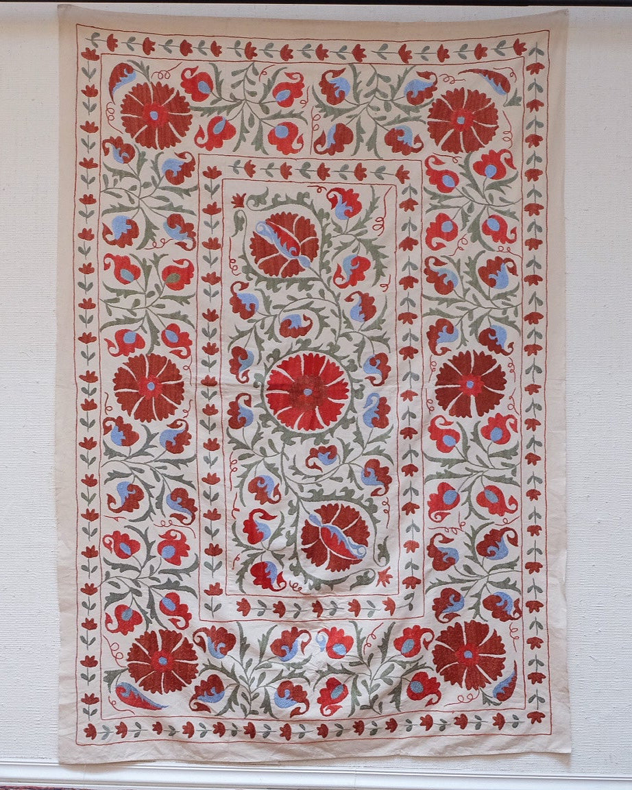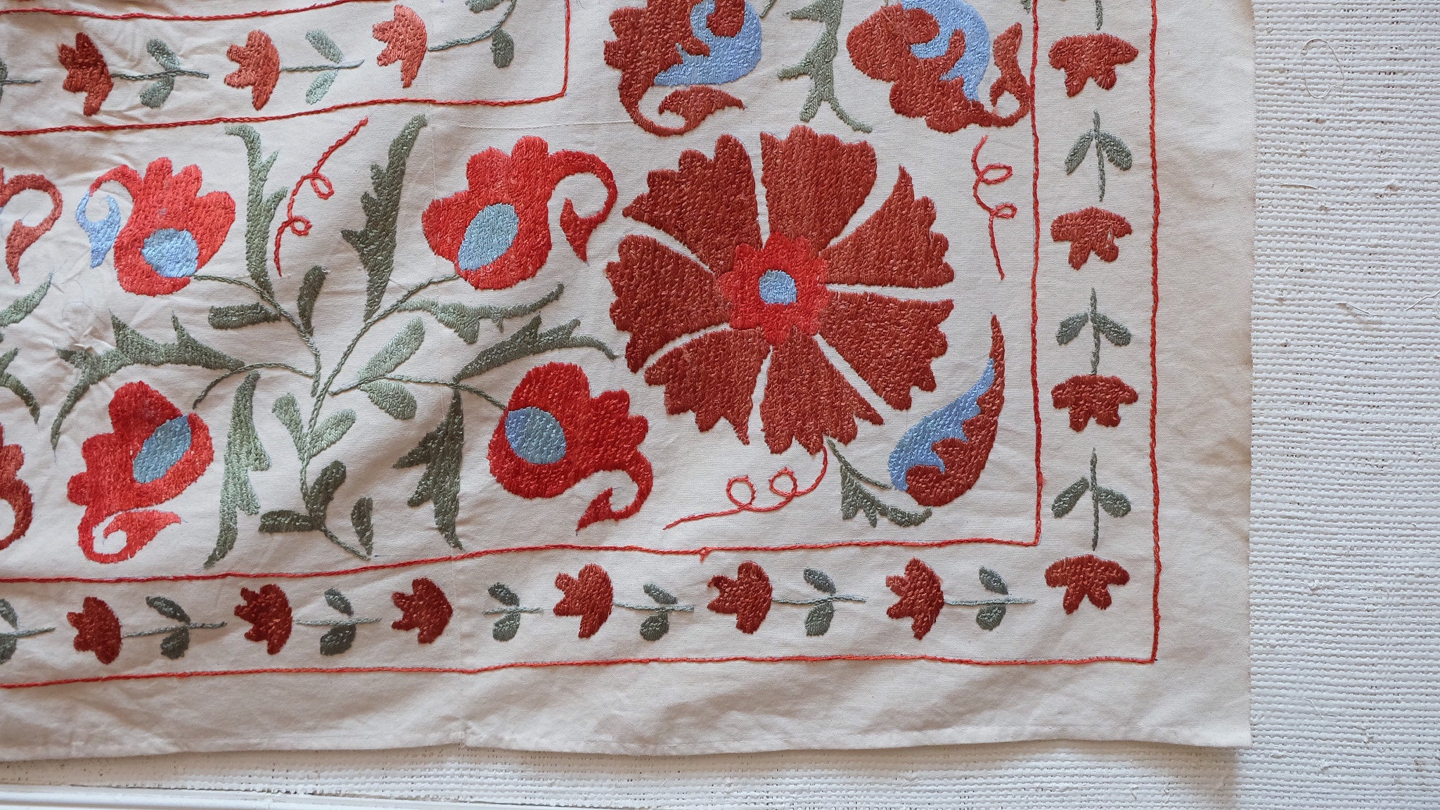 Suzanis were made and used by nomadic tribes in Central Asia. Utilizing different design elements from flowers and vines to the sun and pomegranates, each carry their own symbolism.