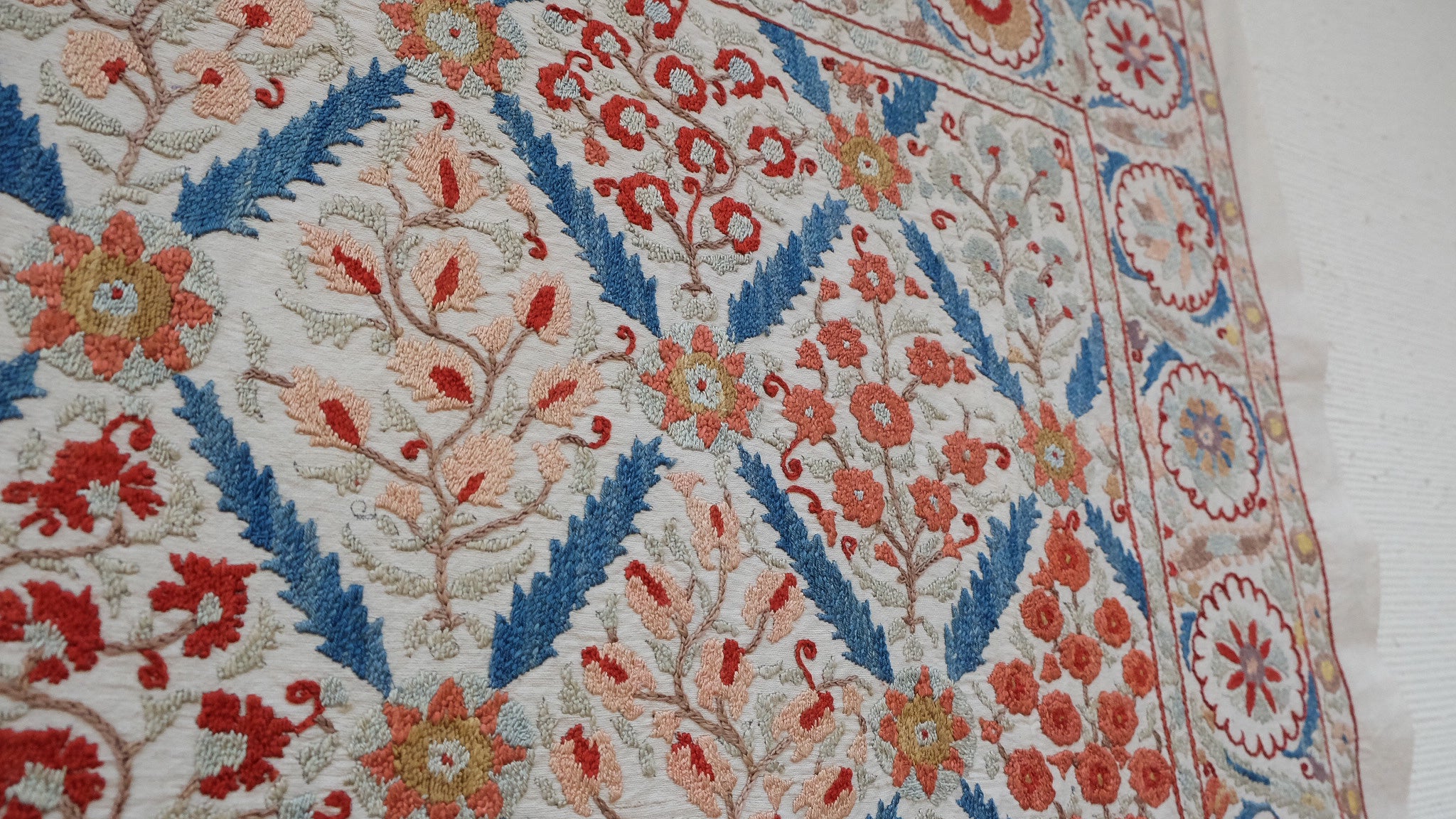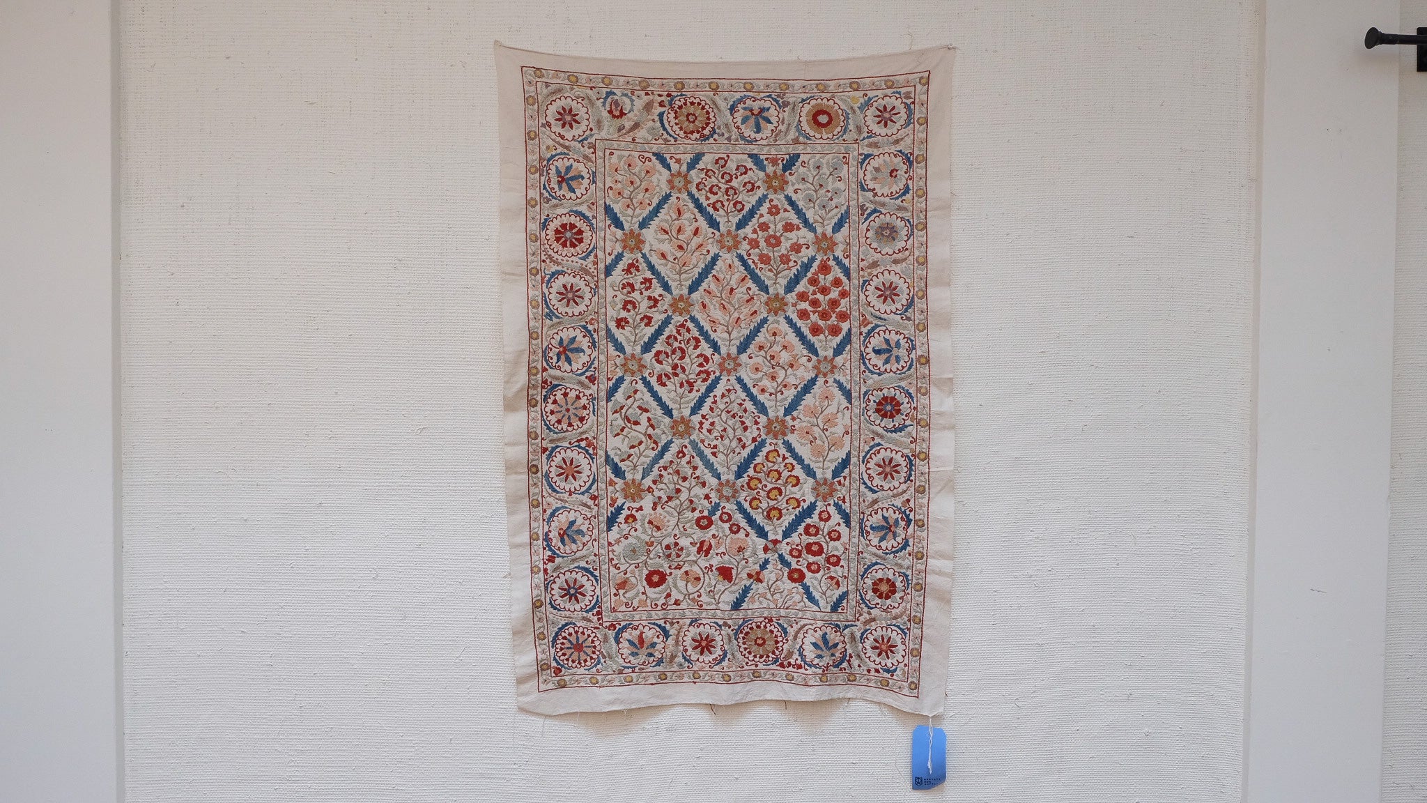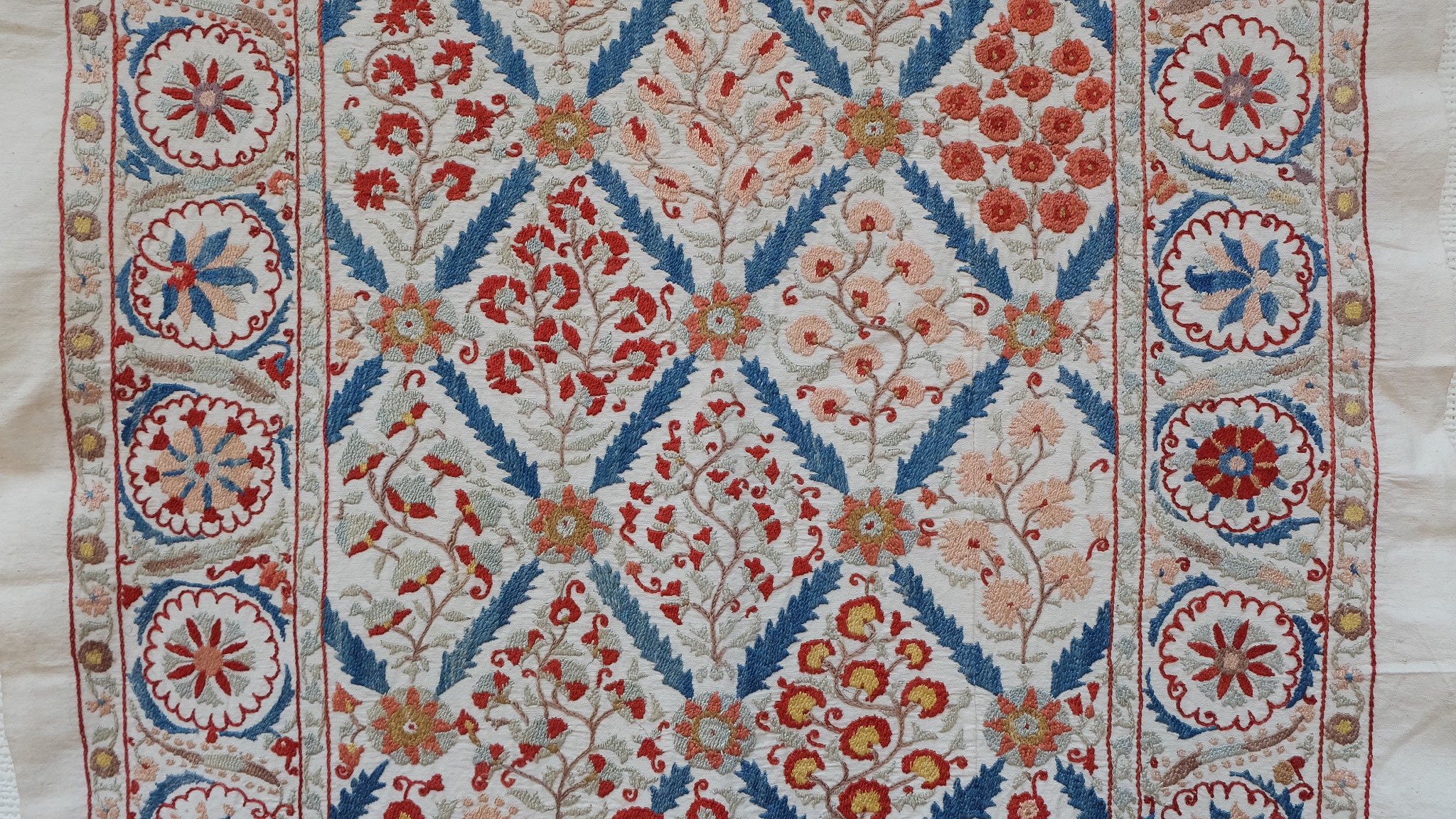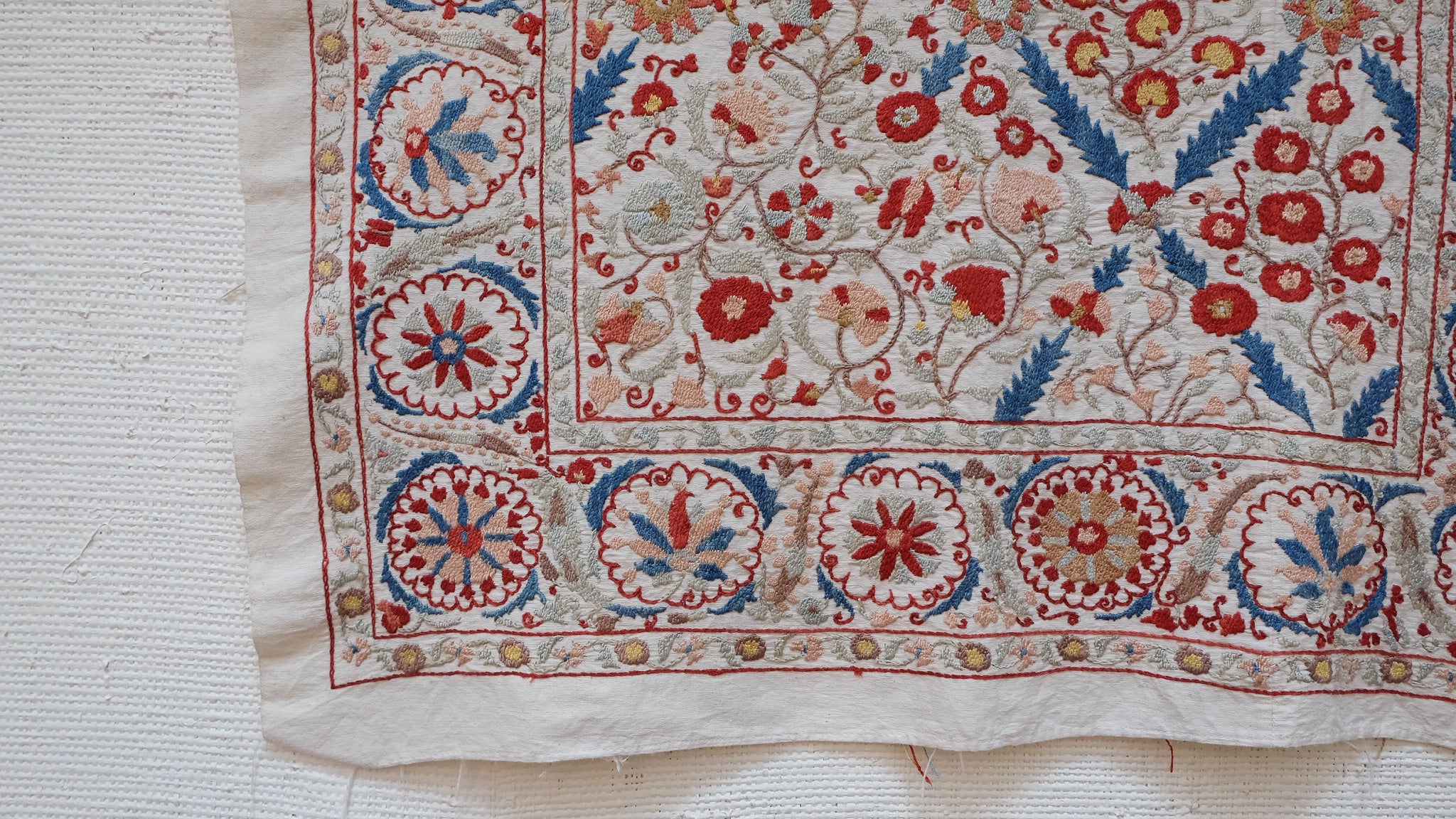 Suzanis were made and used by nomadic tribes in Central Asia. Utilizing different design elements from flowers and vines to the sun and pomegranates, each carry their own symbolism.