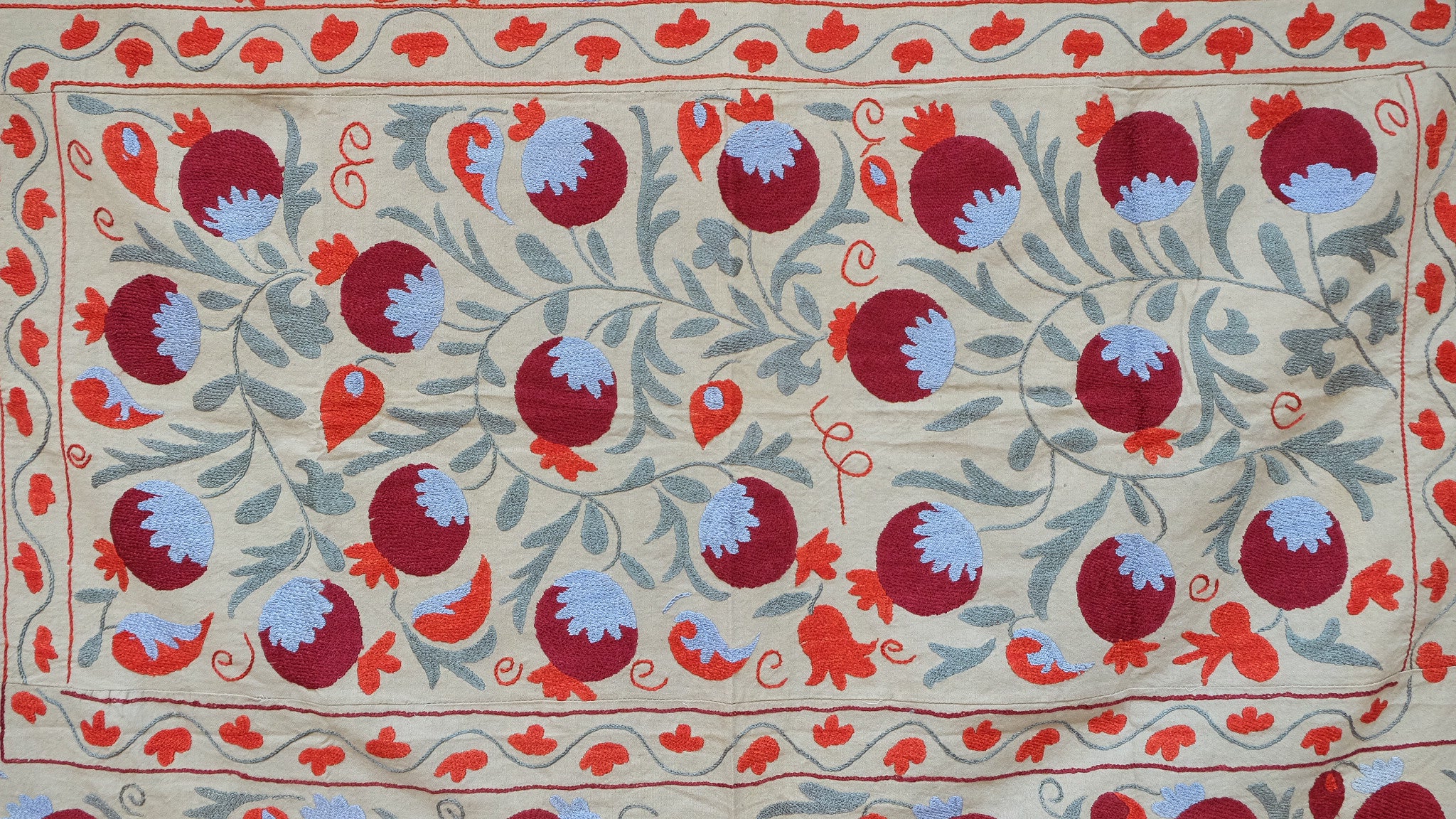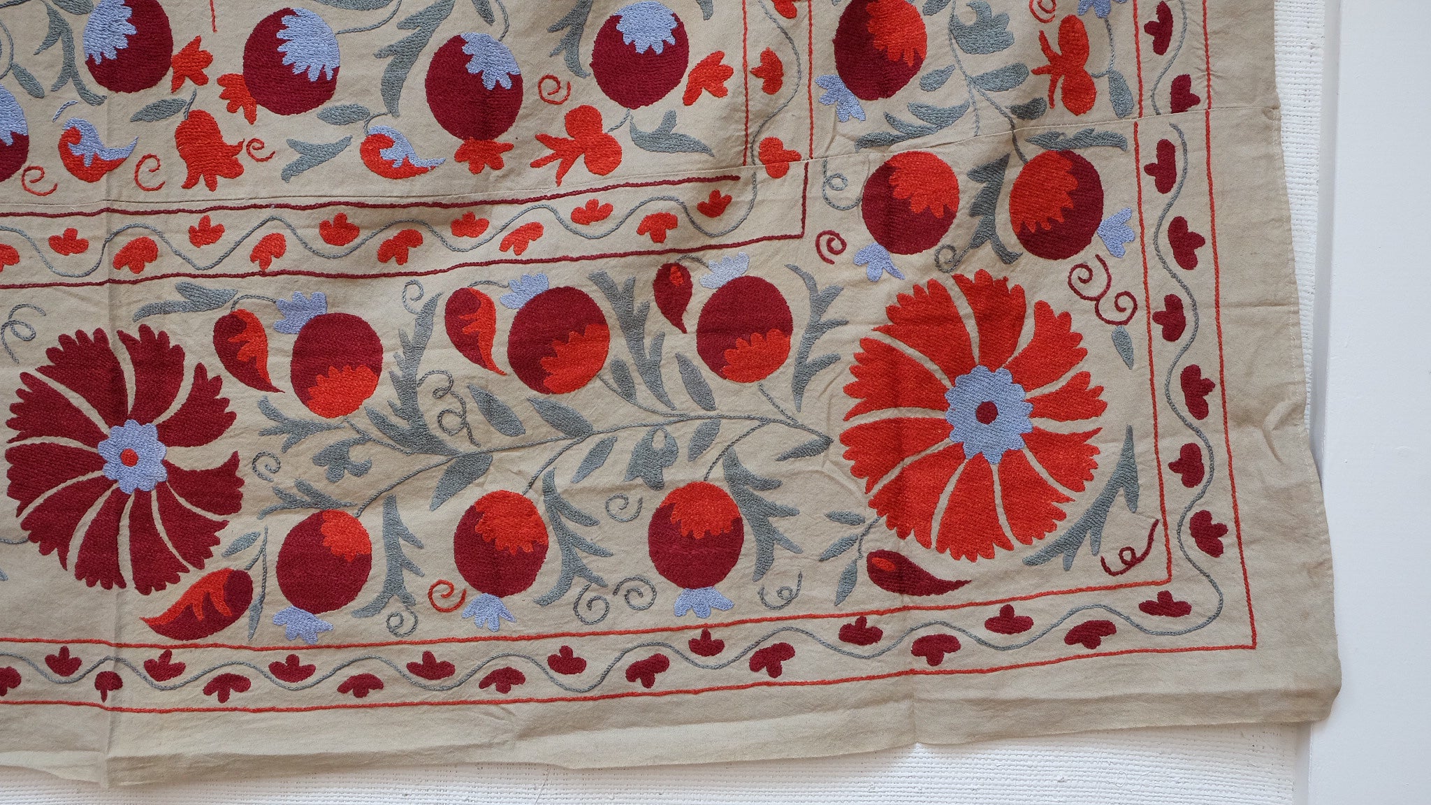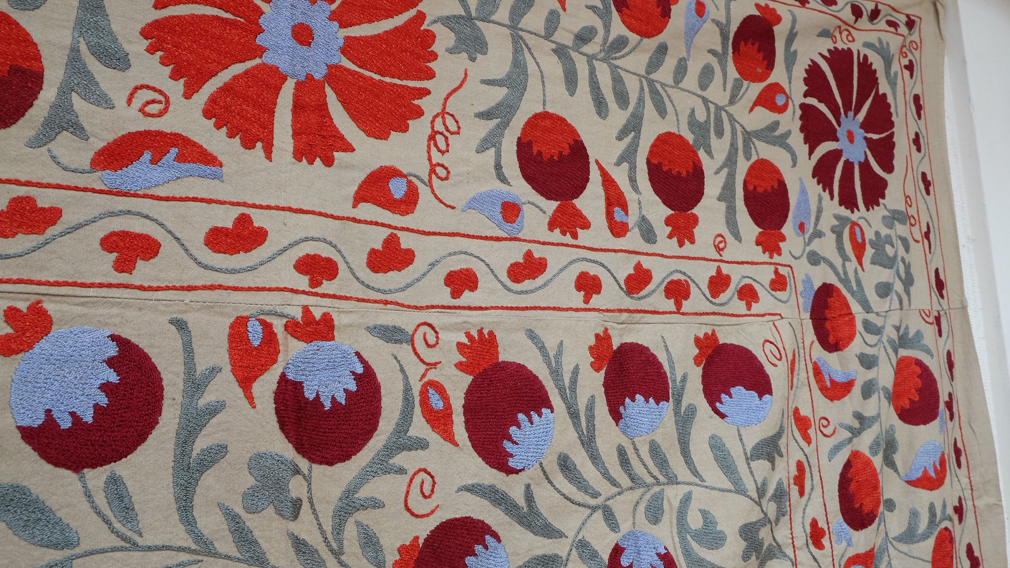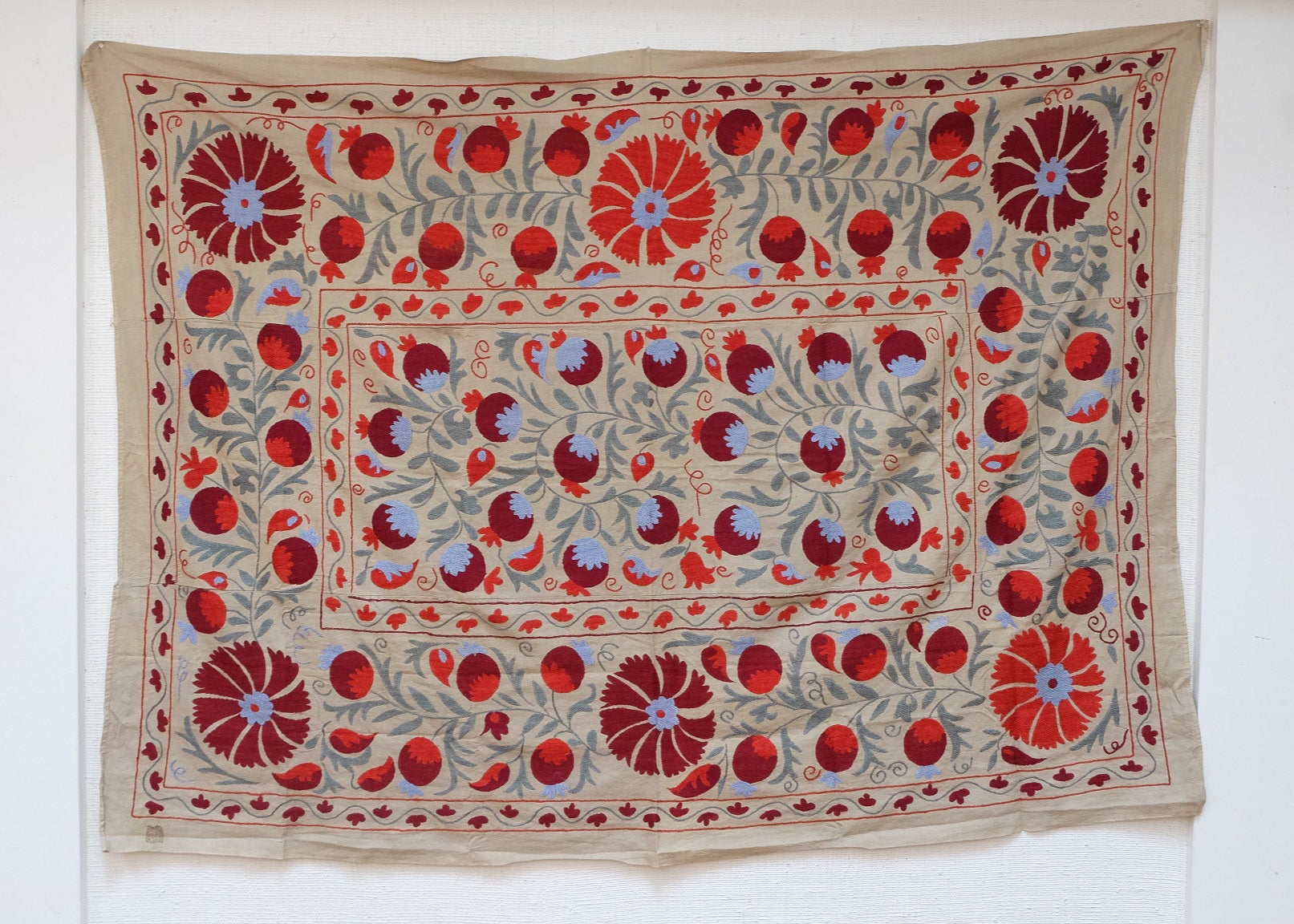 Suzanis were made and used by nomadic tribes in Central Asia. Utilizing different design elements from flowers and vines to the sun and pomegranates, each carry their own symbolism.