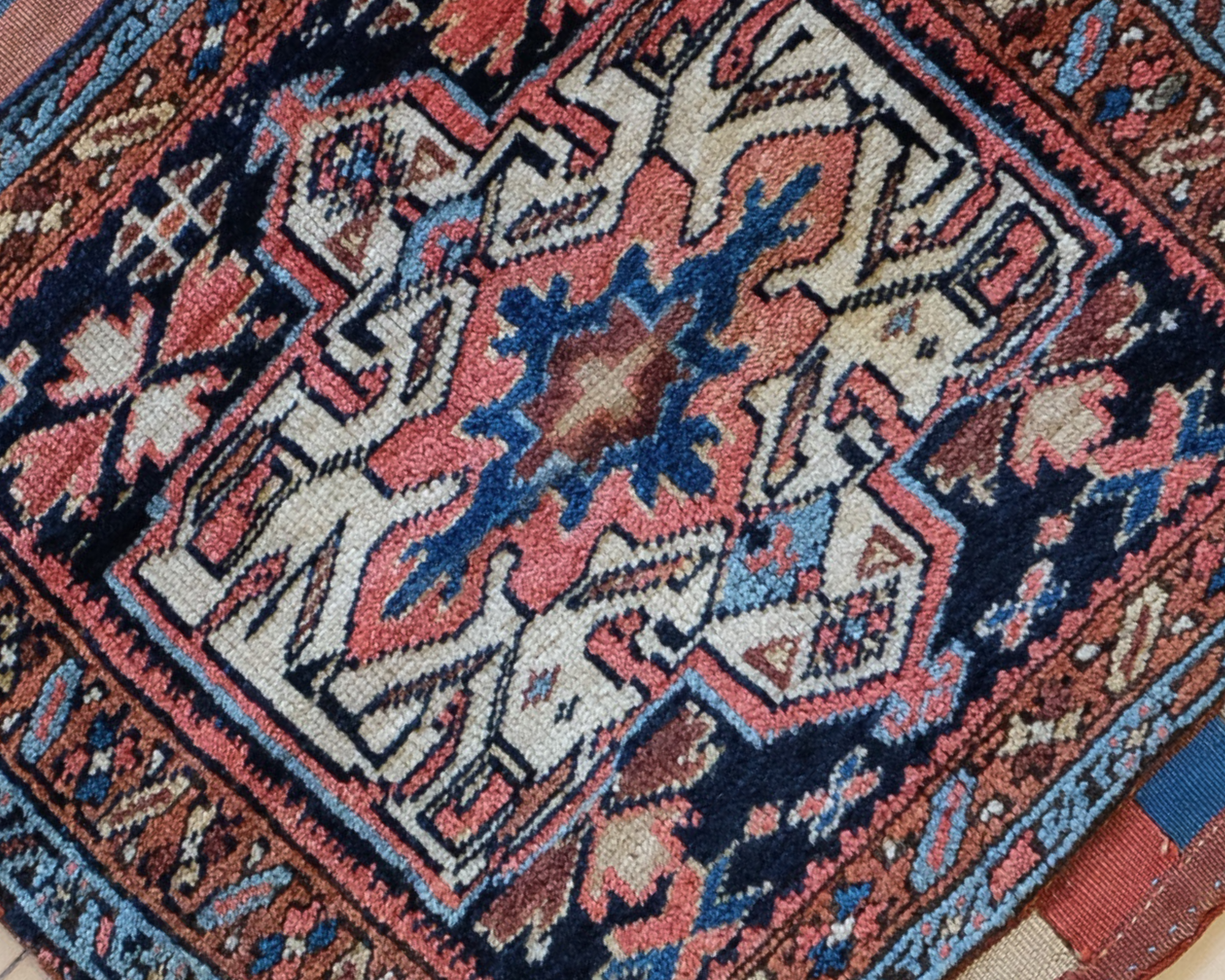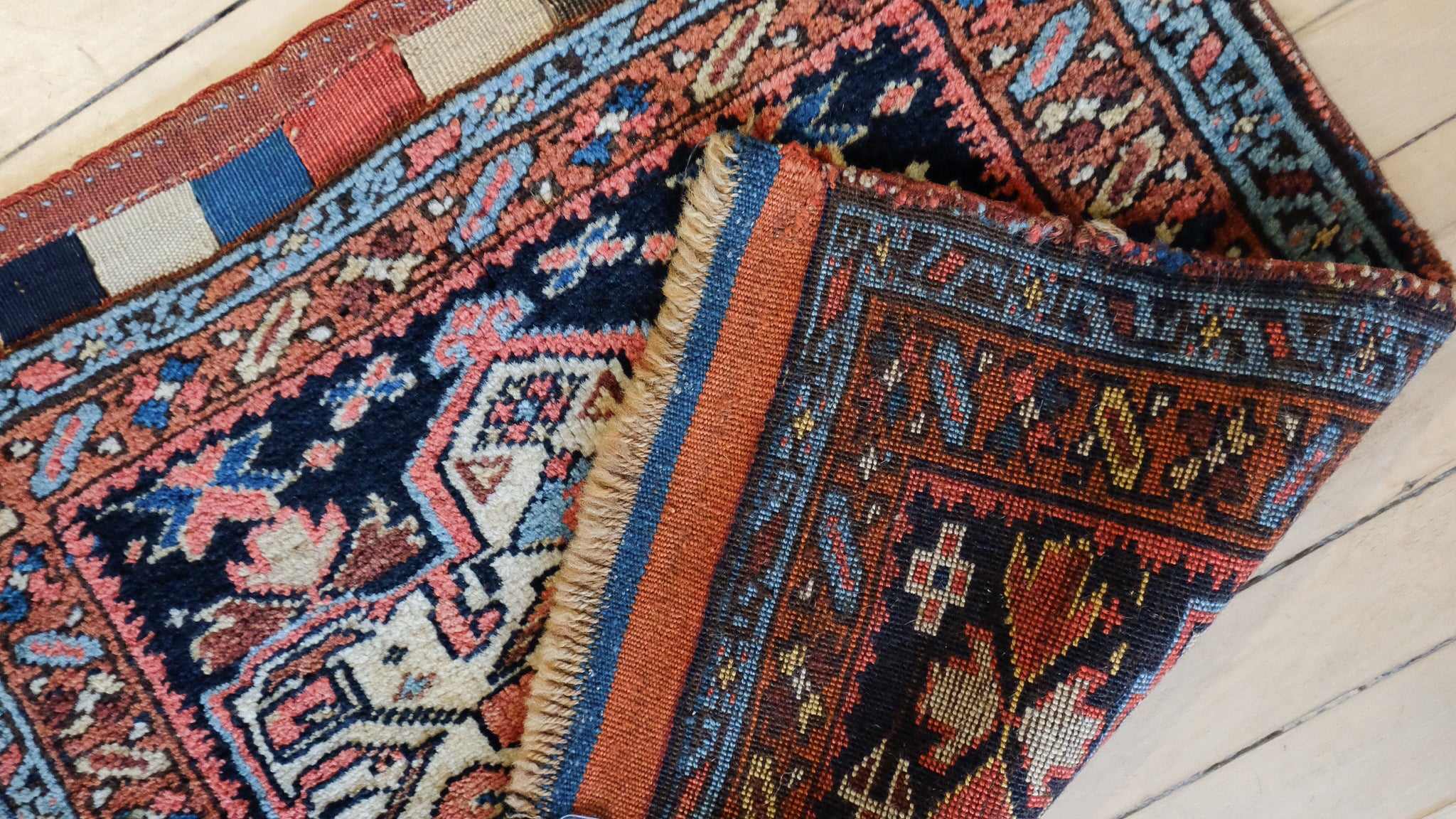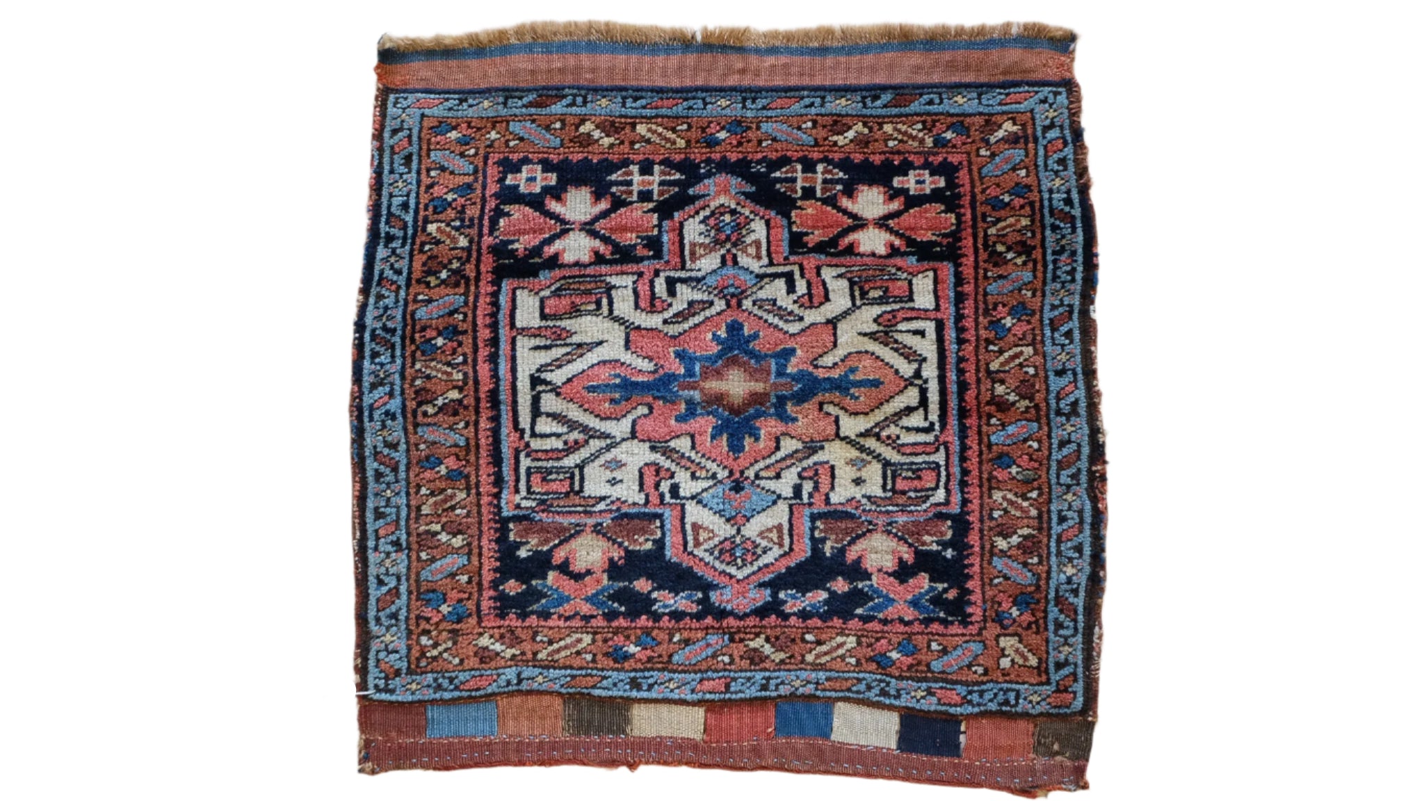 Antique Heriz bag face with kilim ends and a dense wool pile.