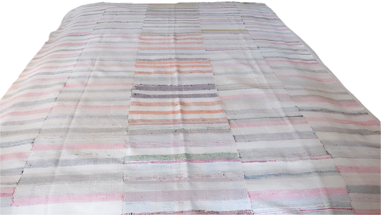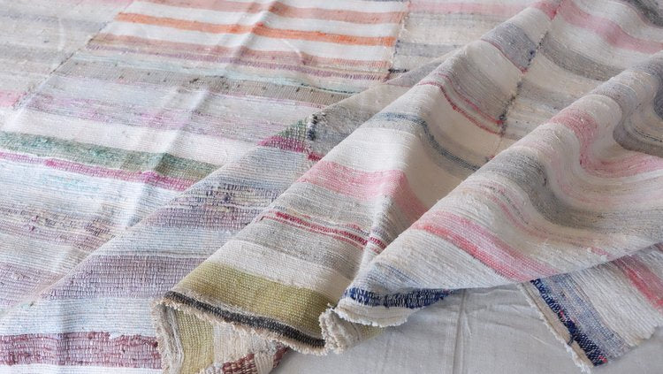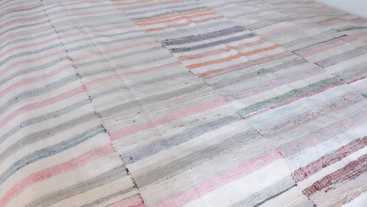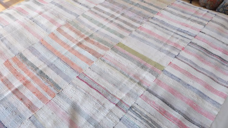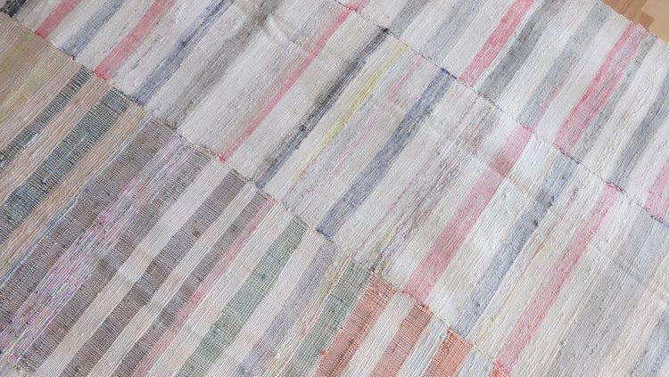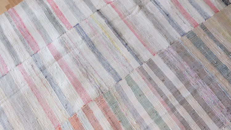 Vintage rag rug sewn into three panels with ivory and pastel tones