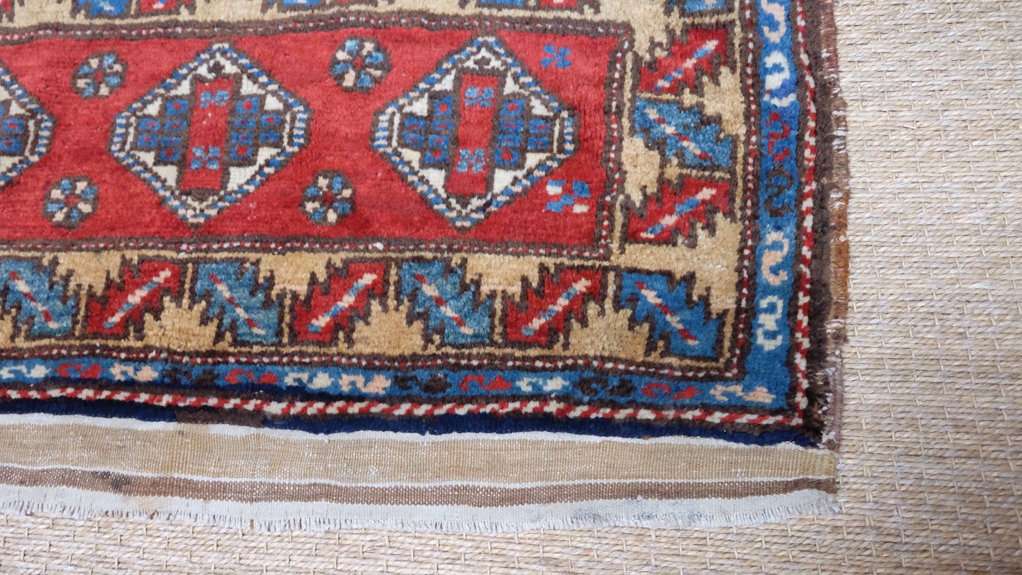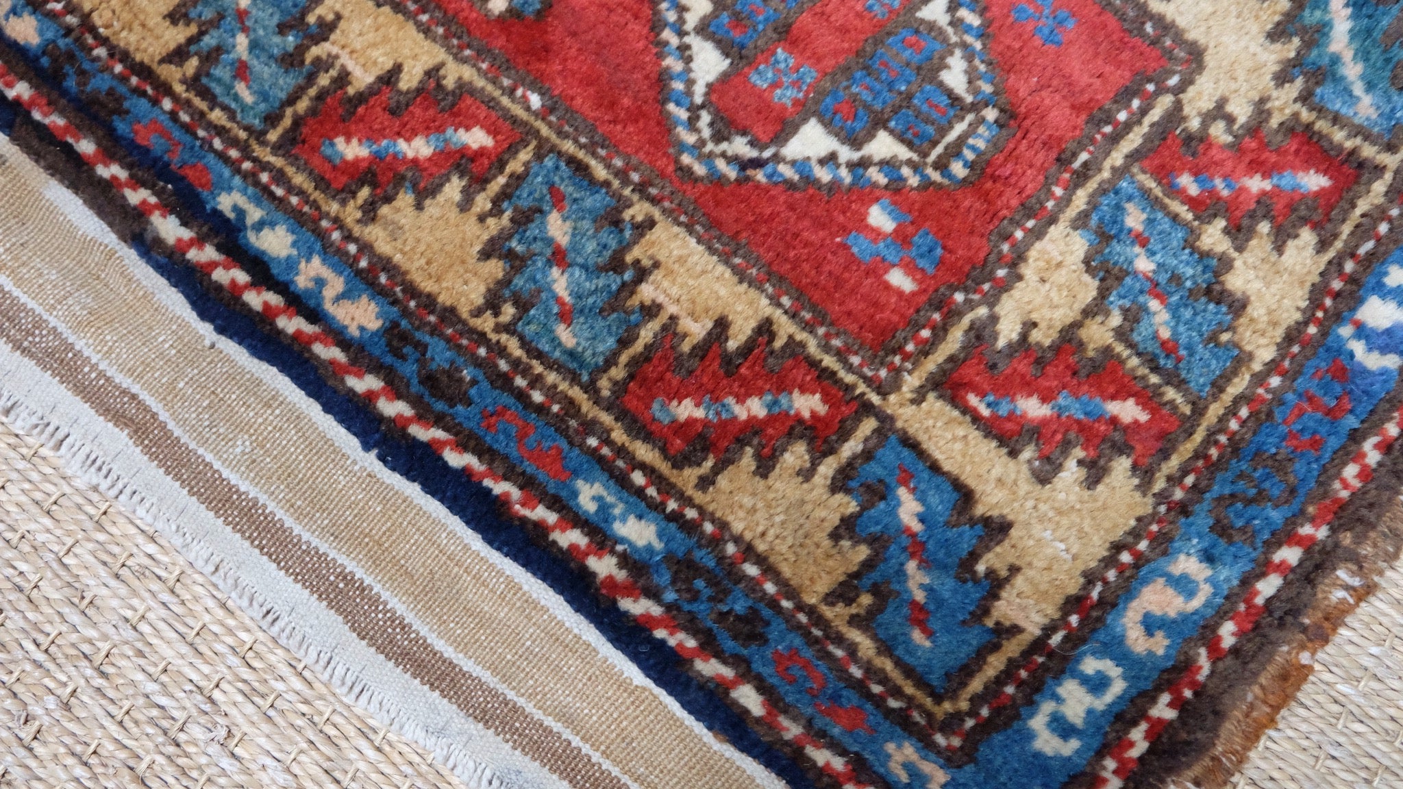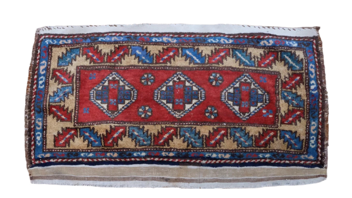 Antique mat from Northwest Iran with classic madder red, indigo and wheat.