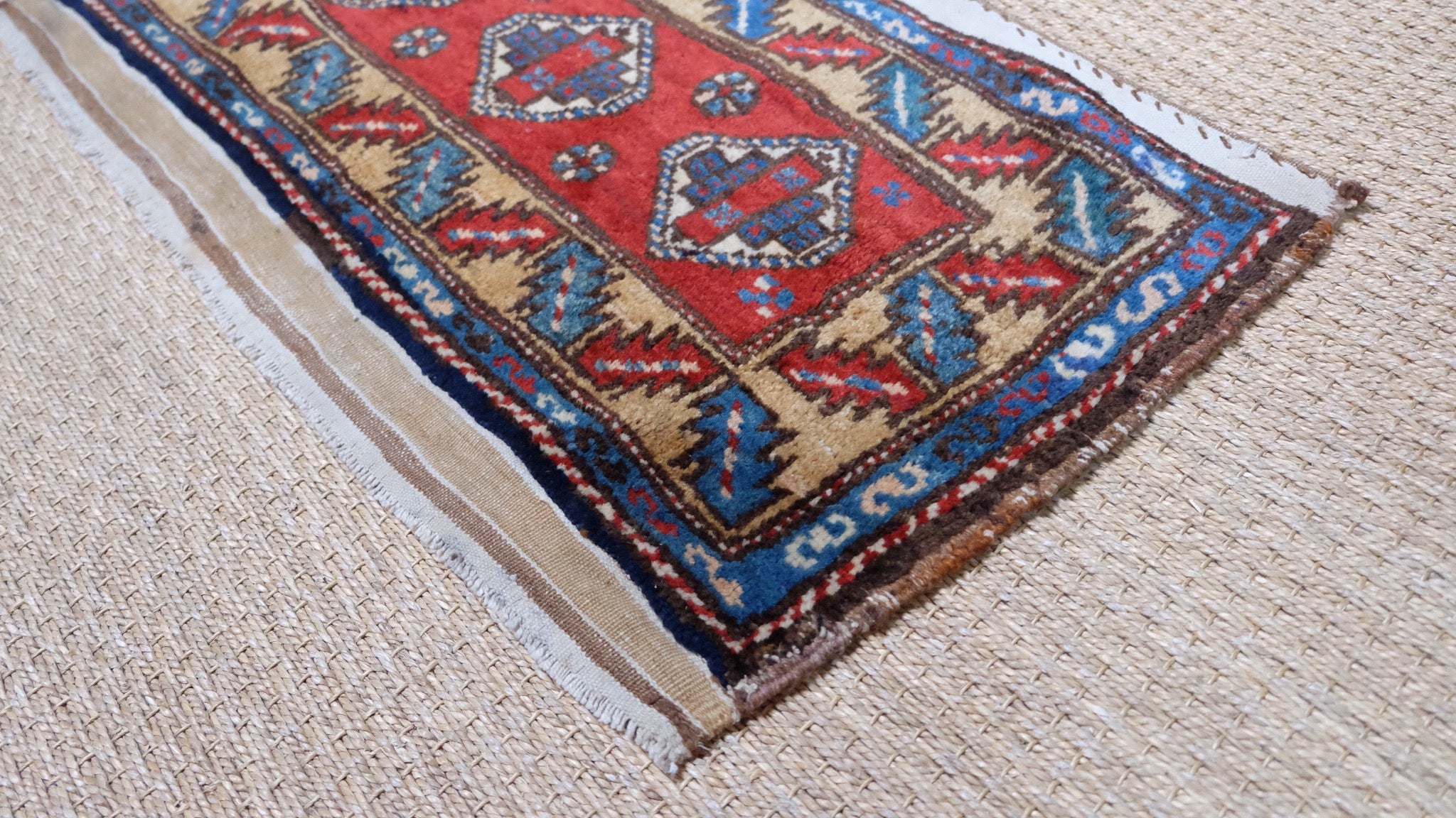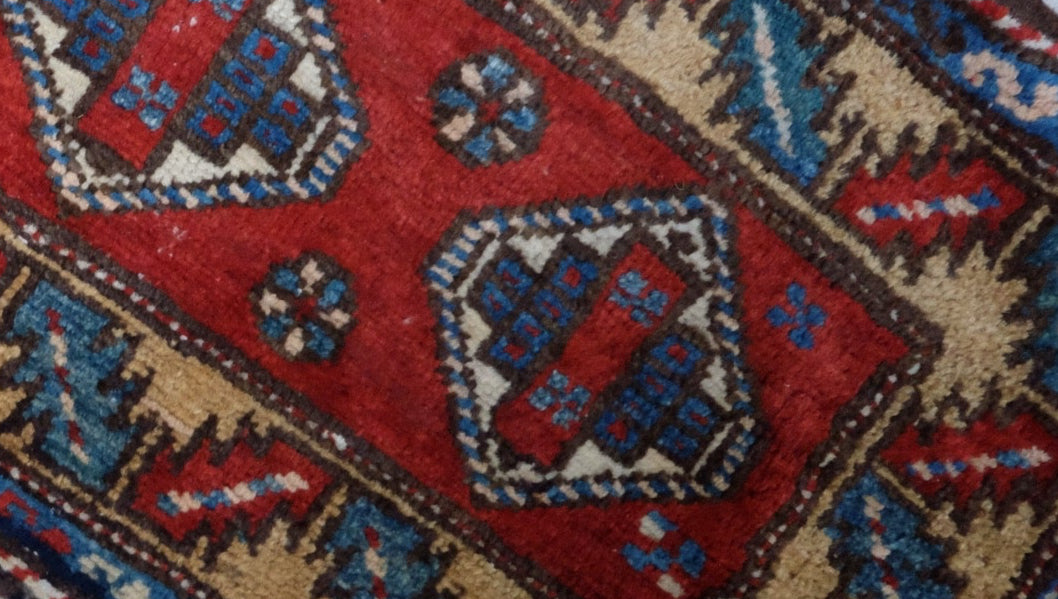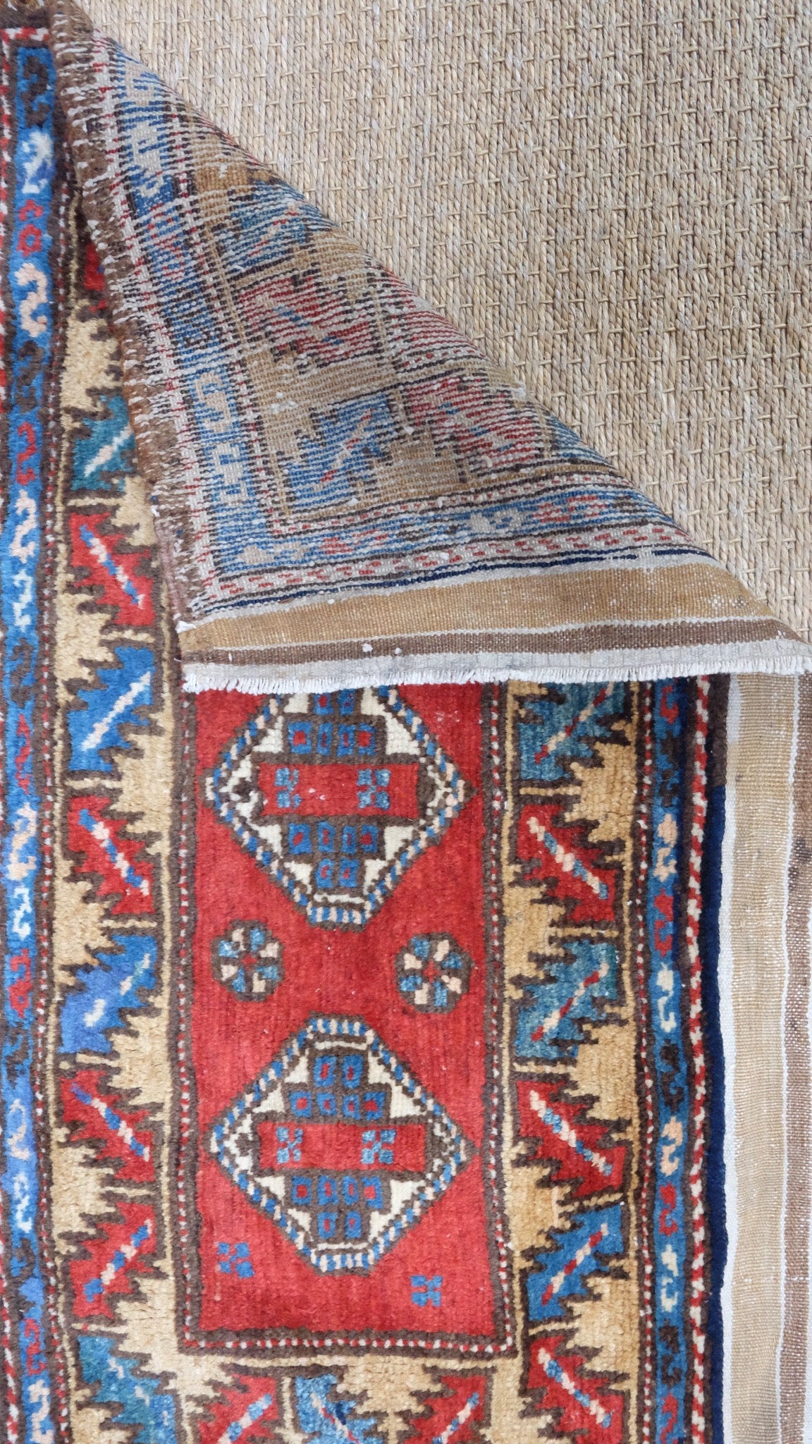 Antique mat from Northwest Iran with classic madder red, indigo and wheat.