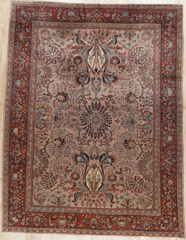 A Ferehan Sarouk with a soft pink field and accent colors of red, cornflower blue, olive green and navy