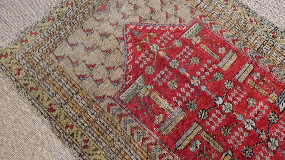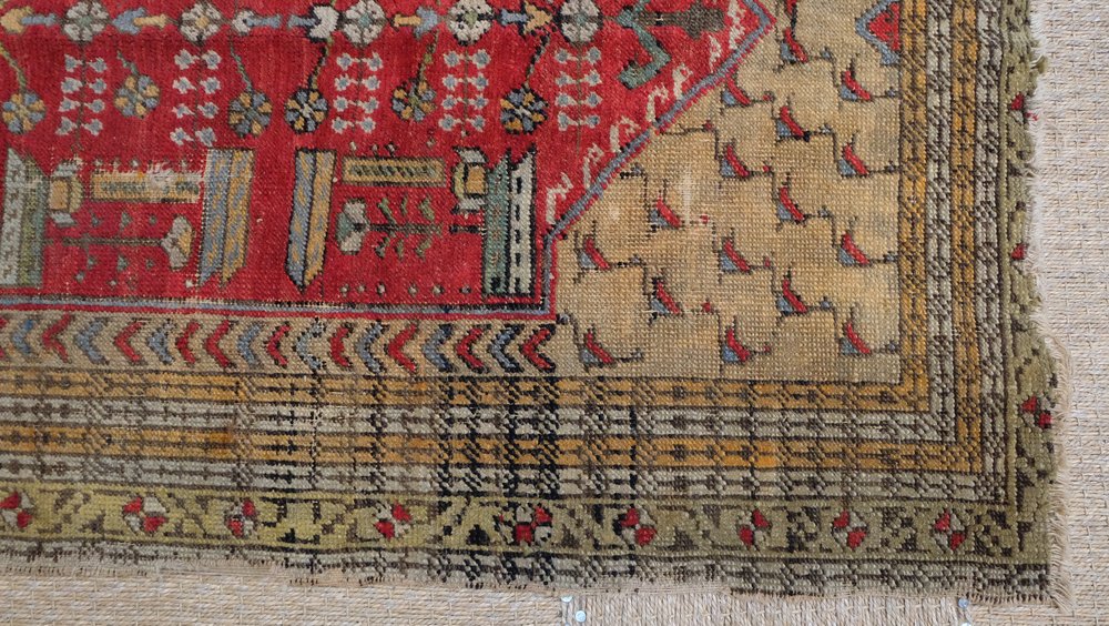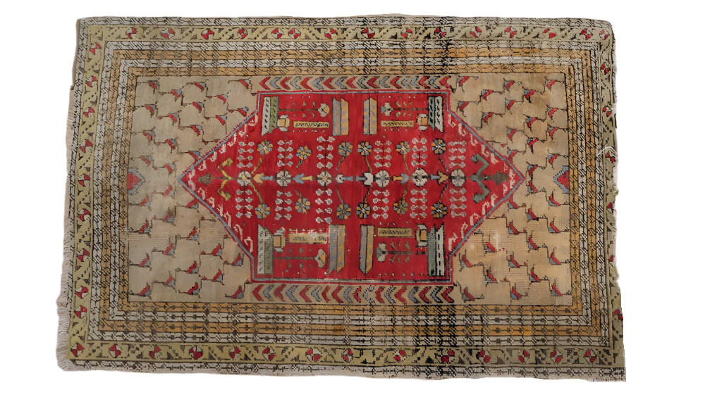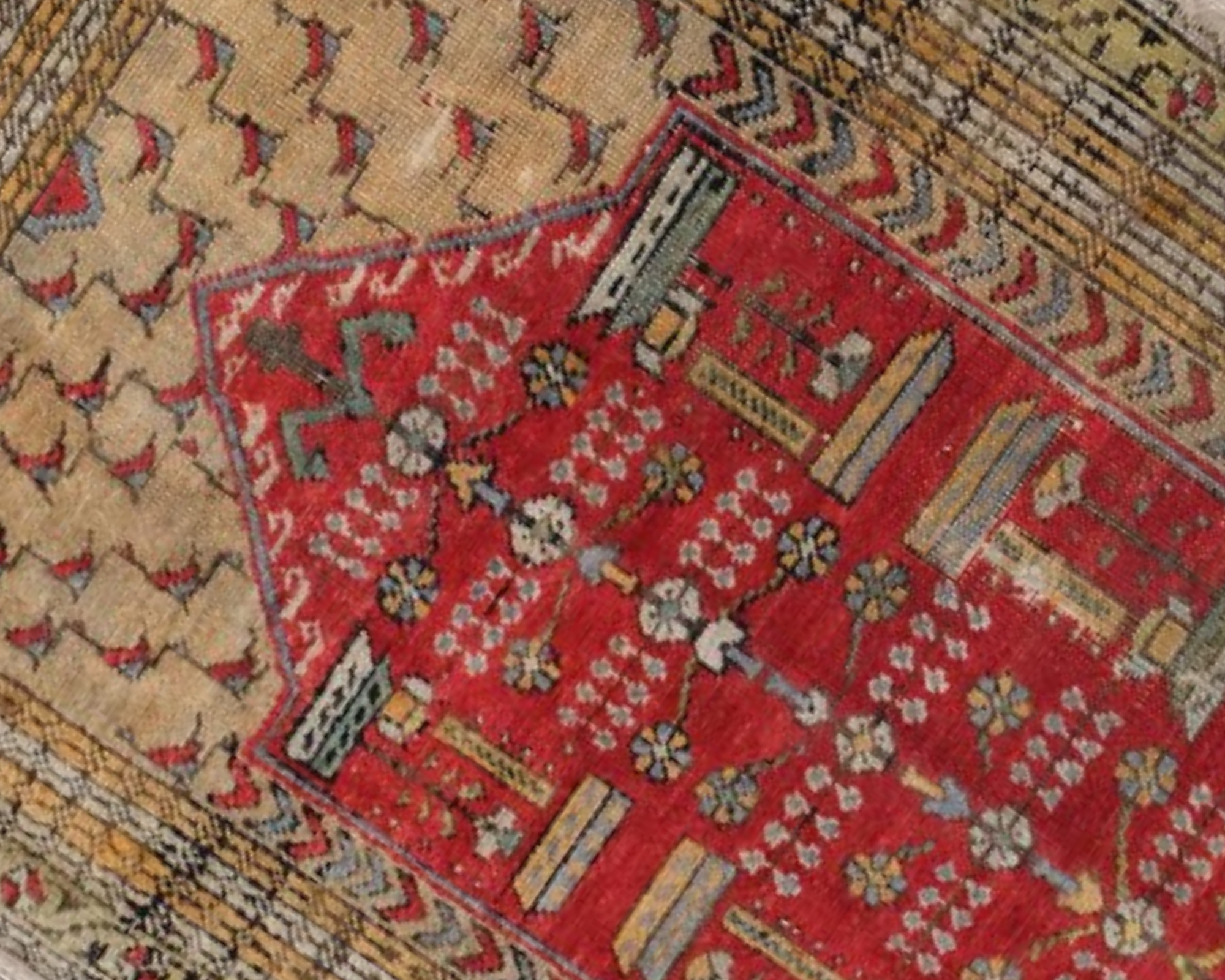 An antique Turkish with fuchsia, peach, yellow and aqua blue.