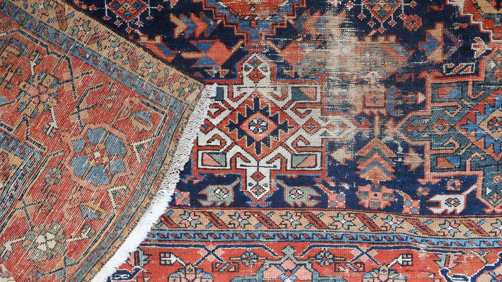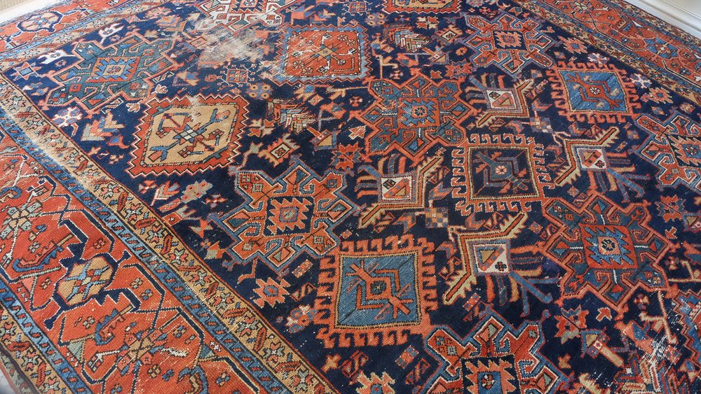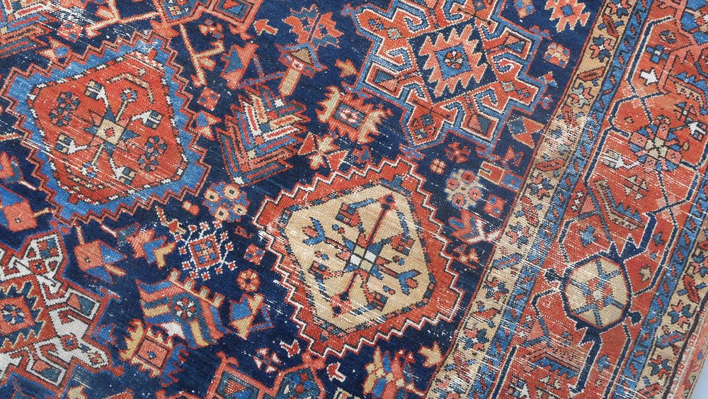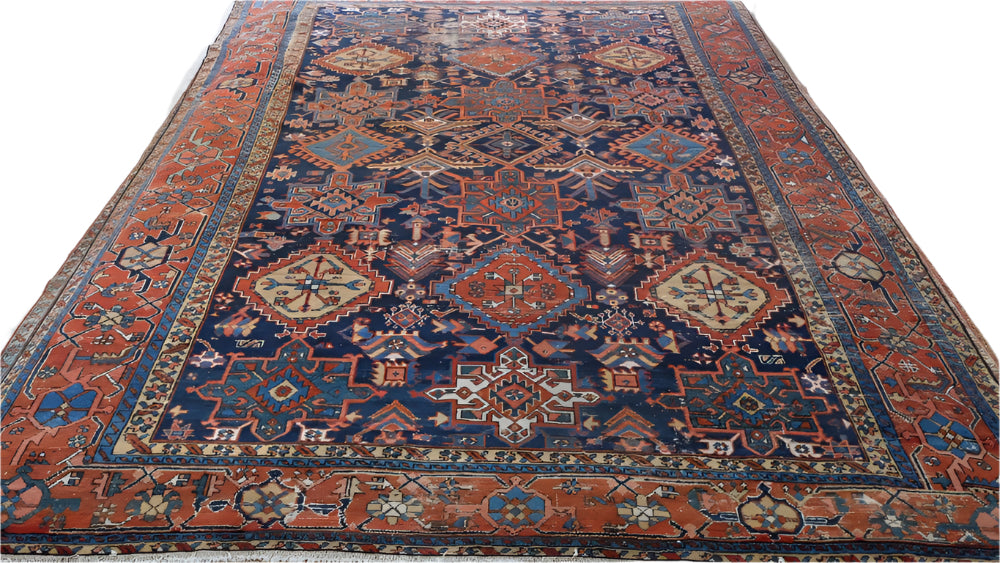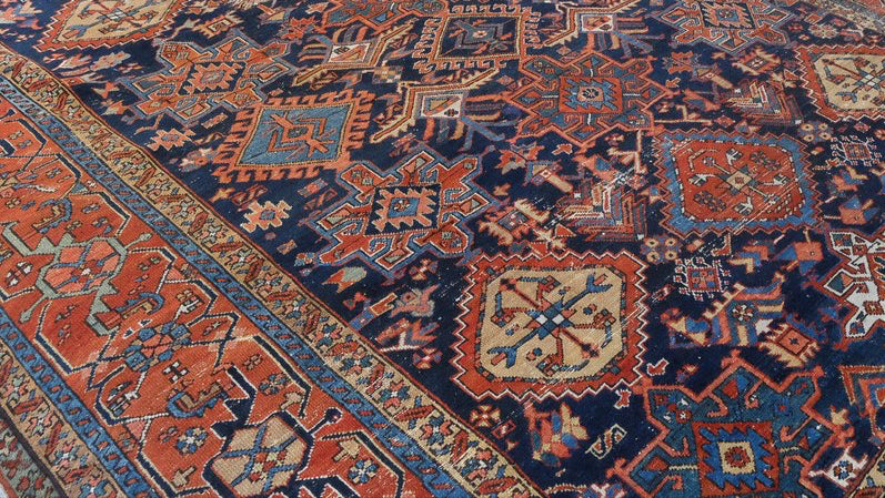 Antique Karajeh from Northwest Iran with a navy field and tones of camel, teal and coral