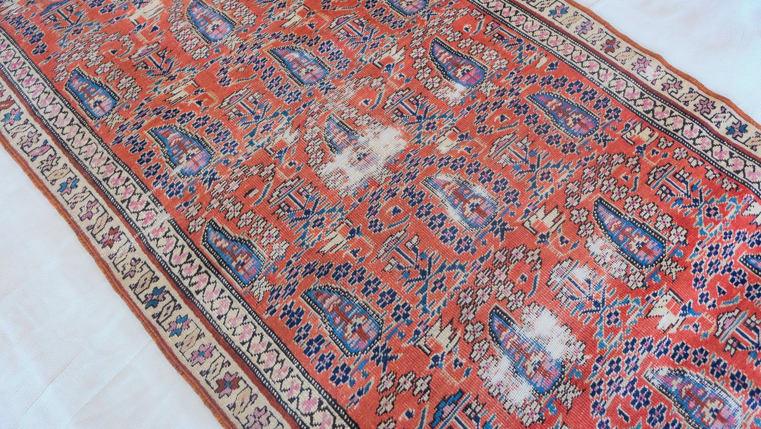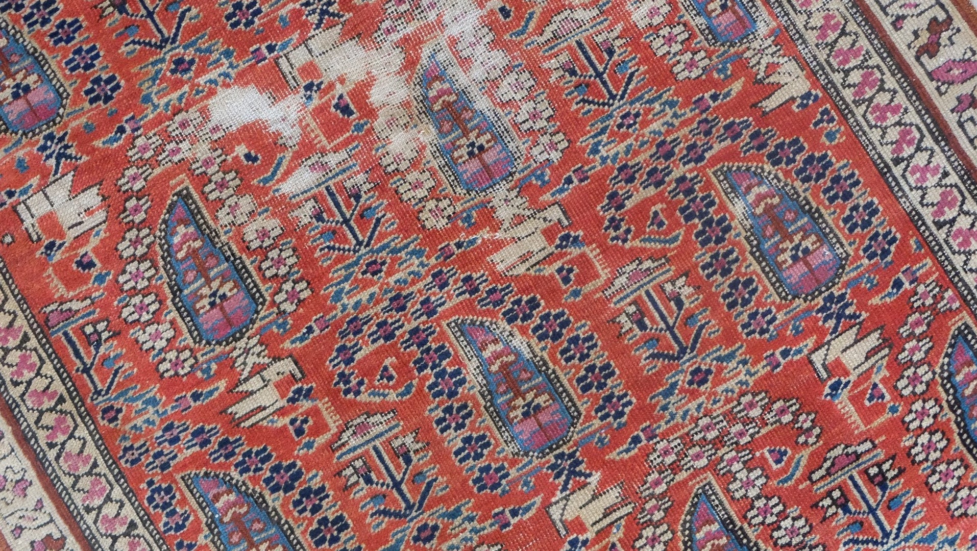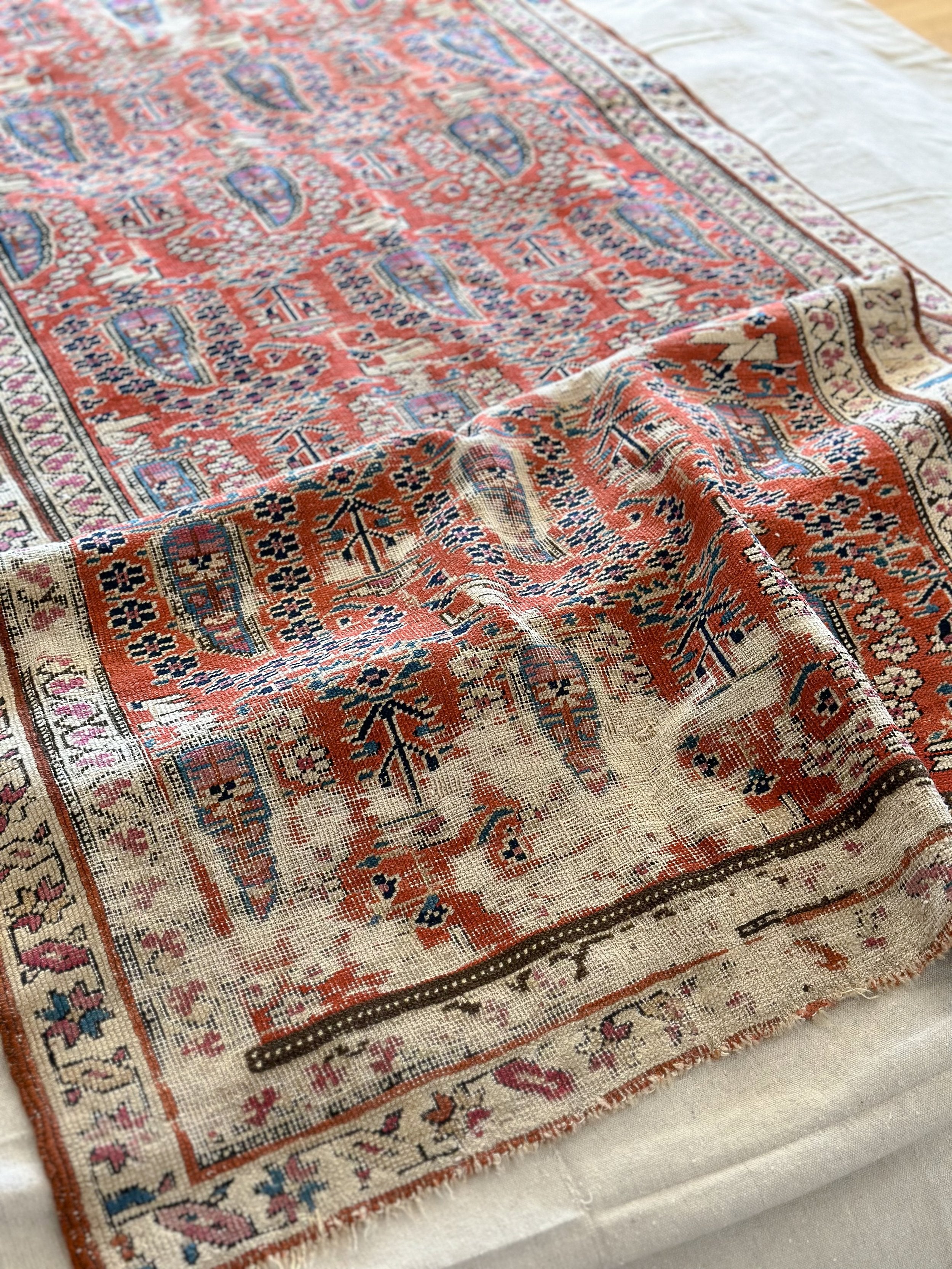 Karabagh with an all-over boteh design on a red field with accents of cornflower blue, lilac and cream