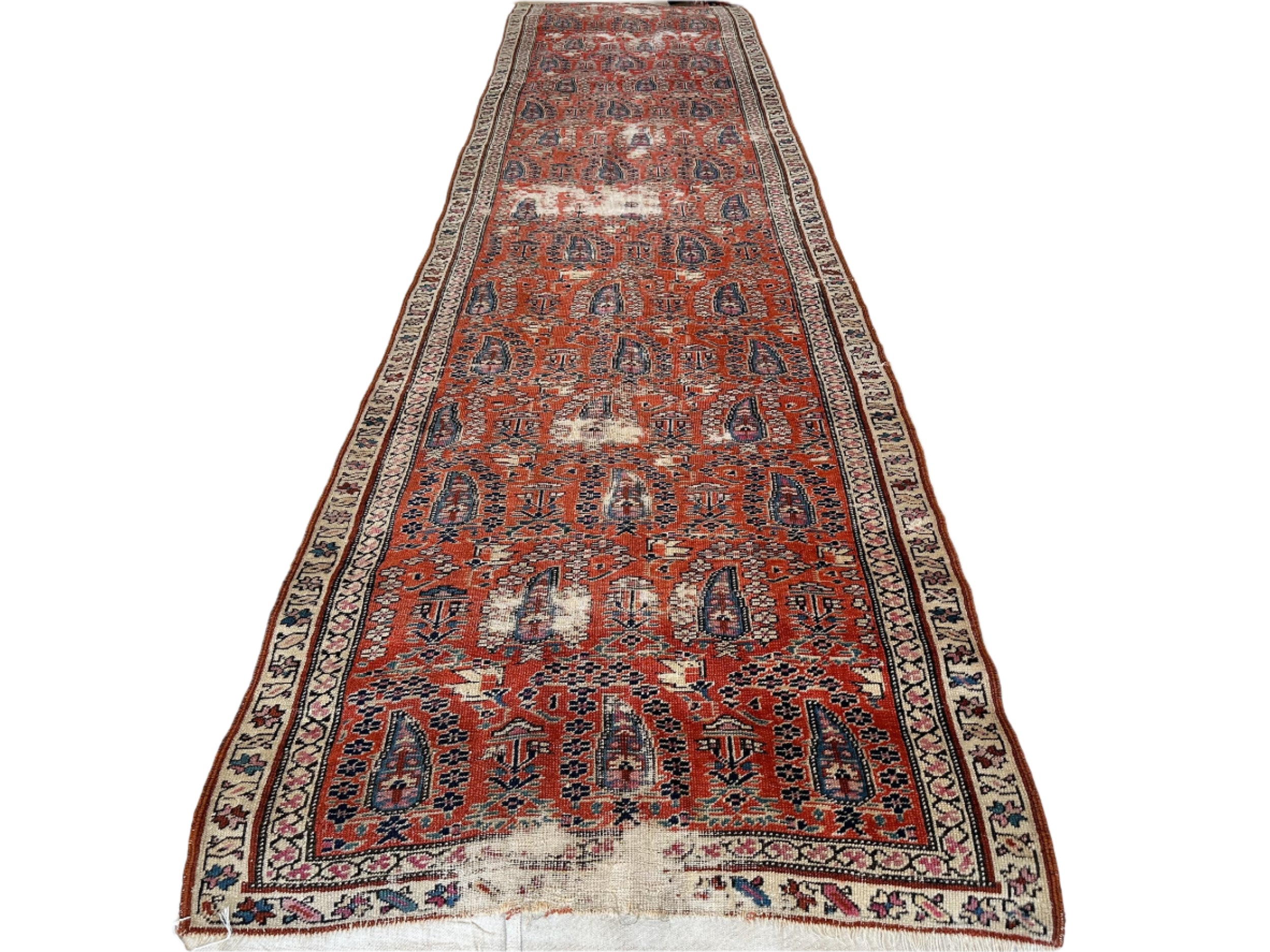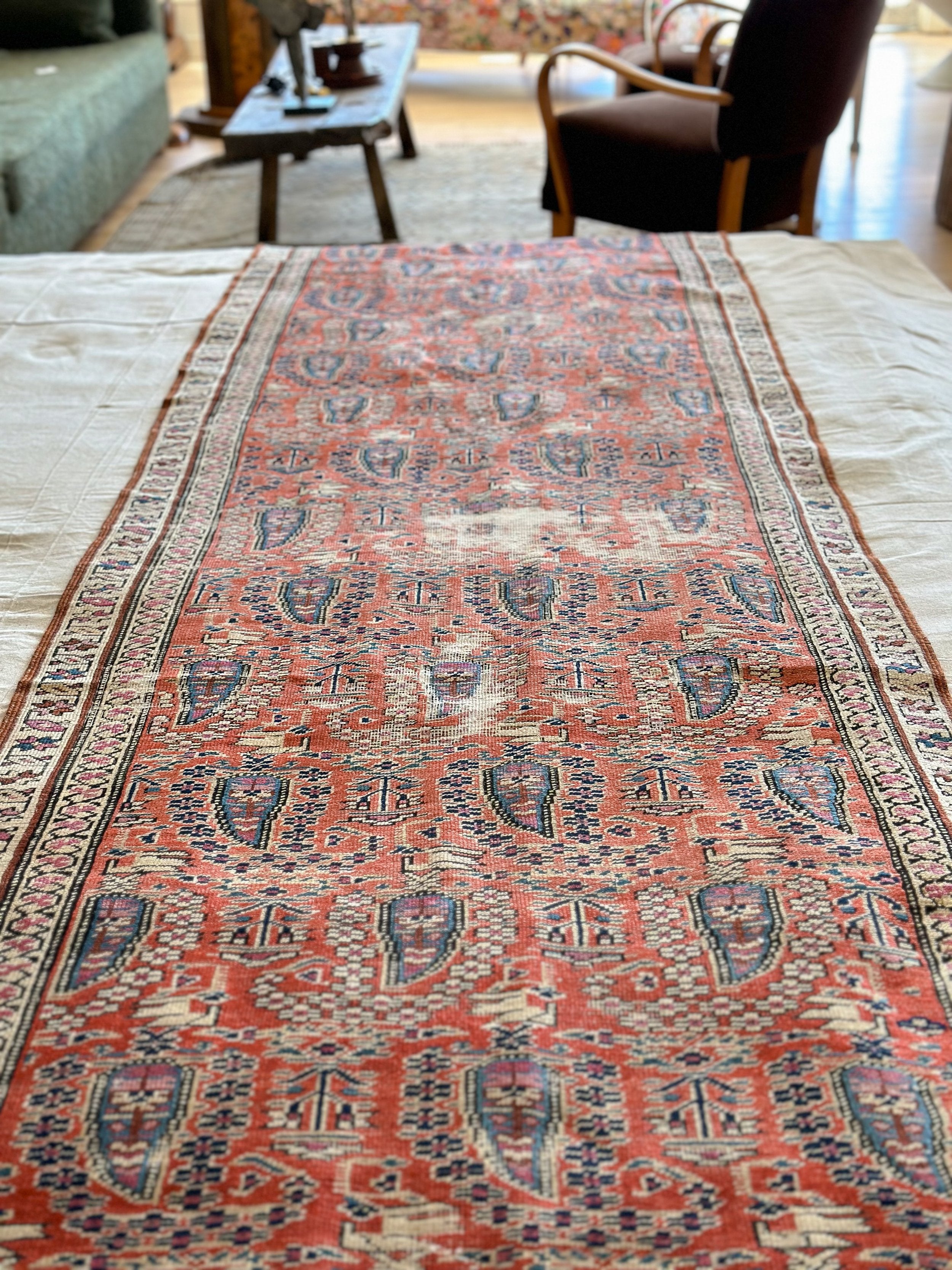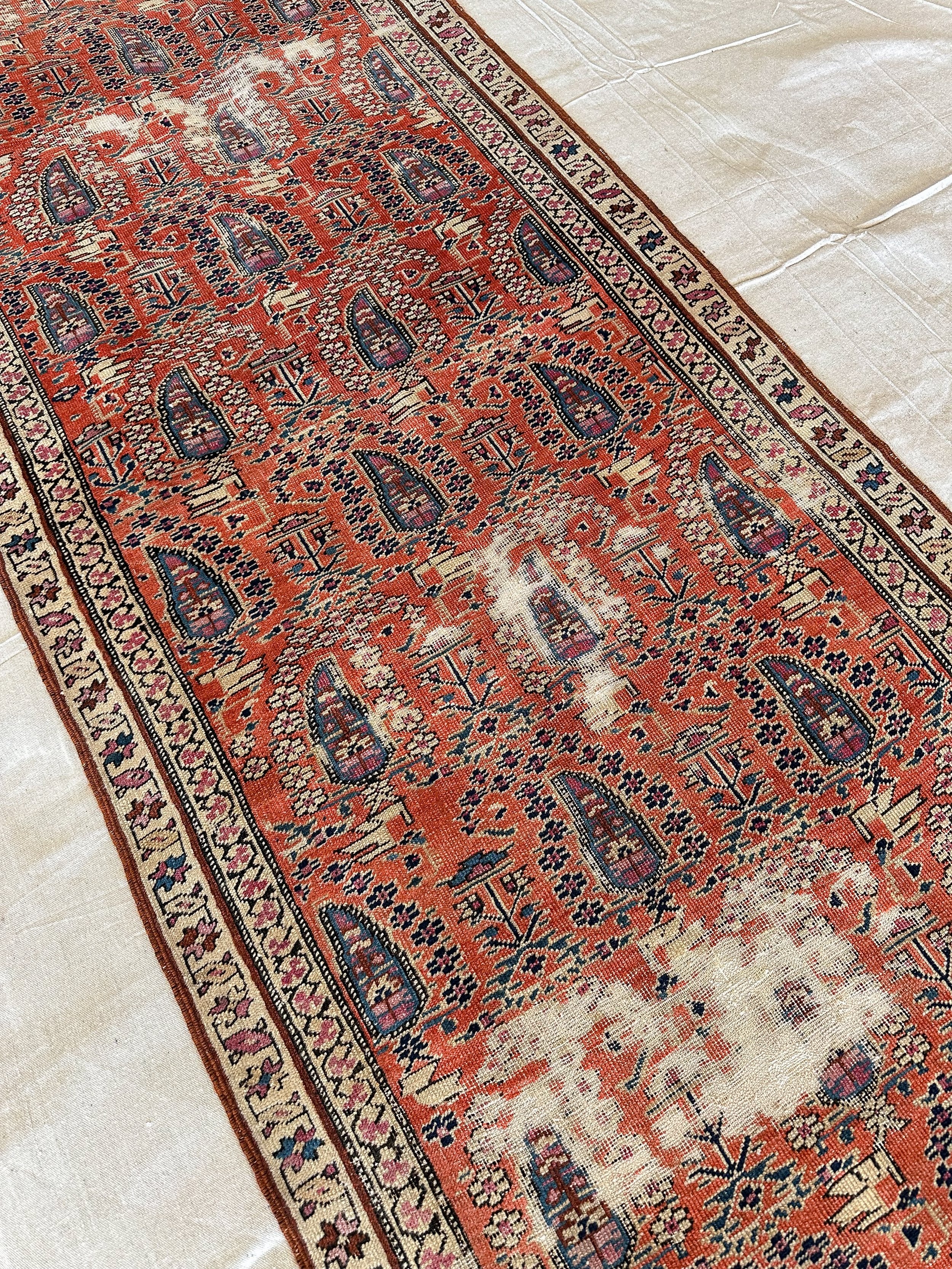 Karabagh with an all-over boteh design on a red field with accents of cornflower blue, lilac and cream