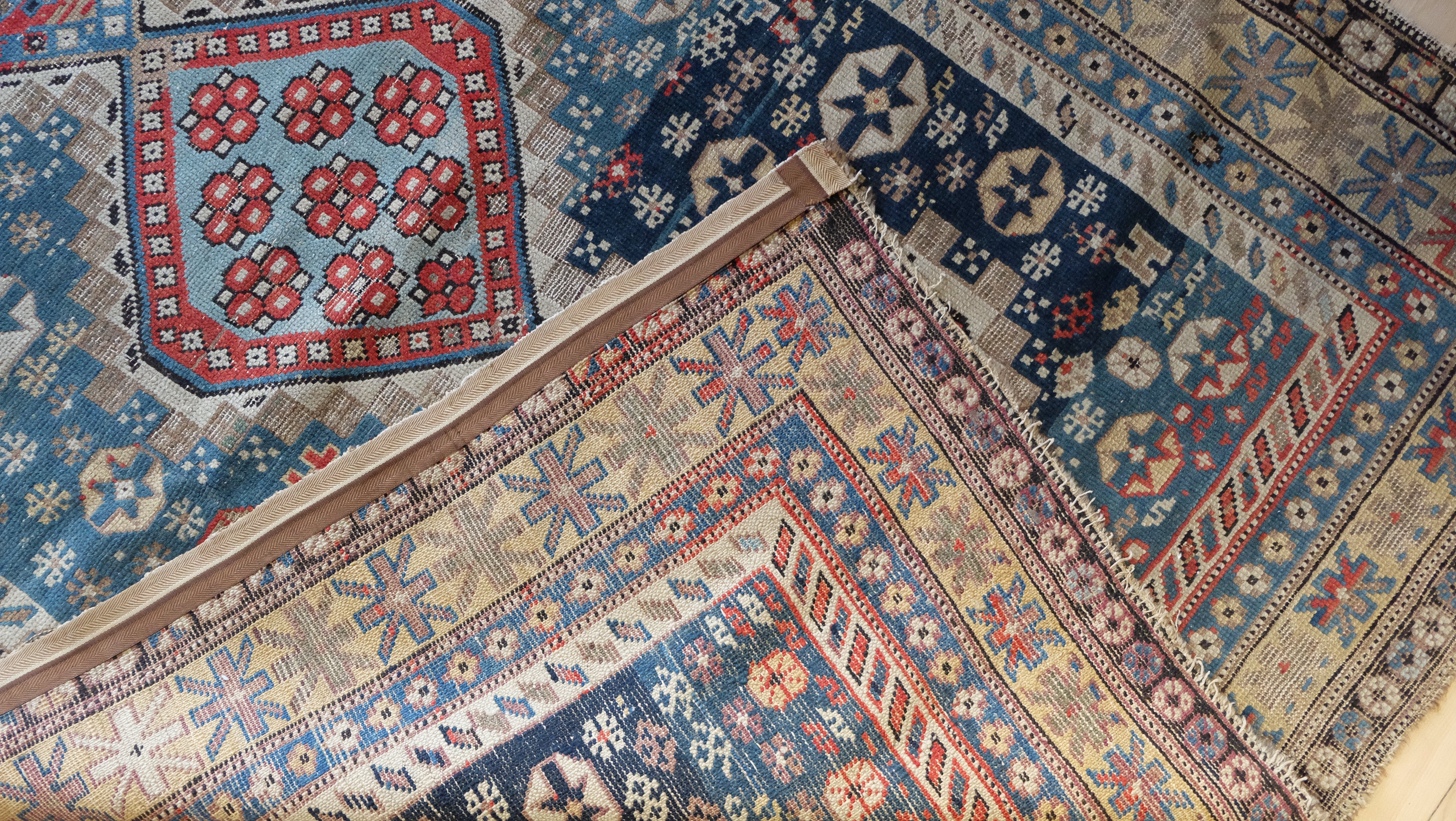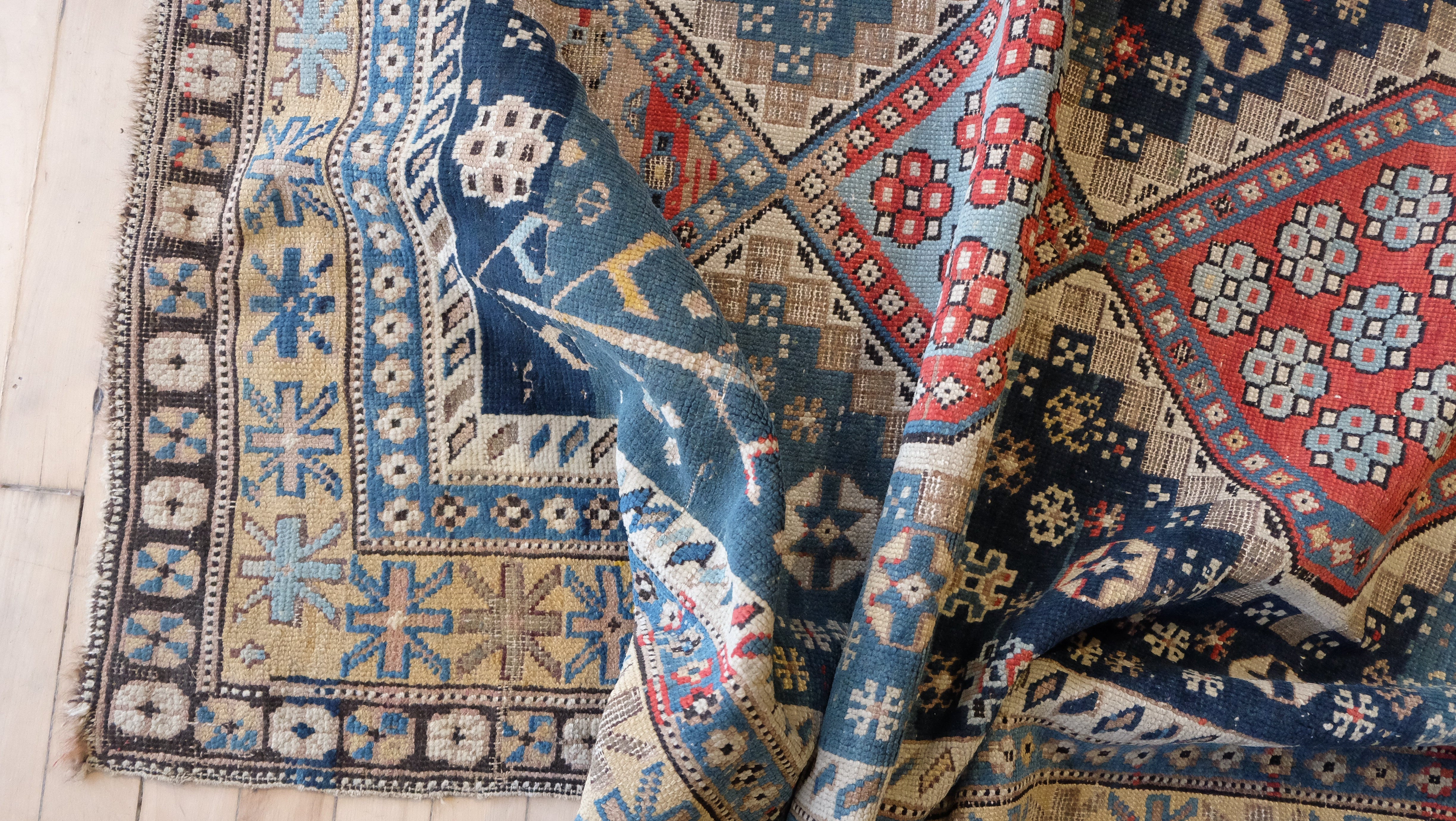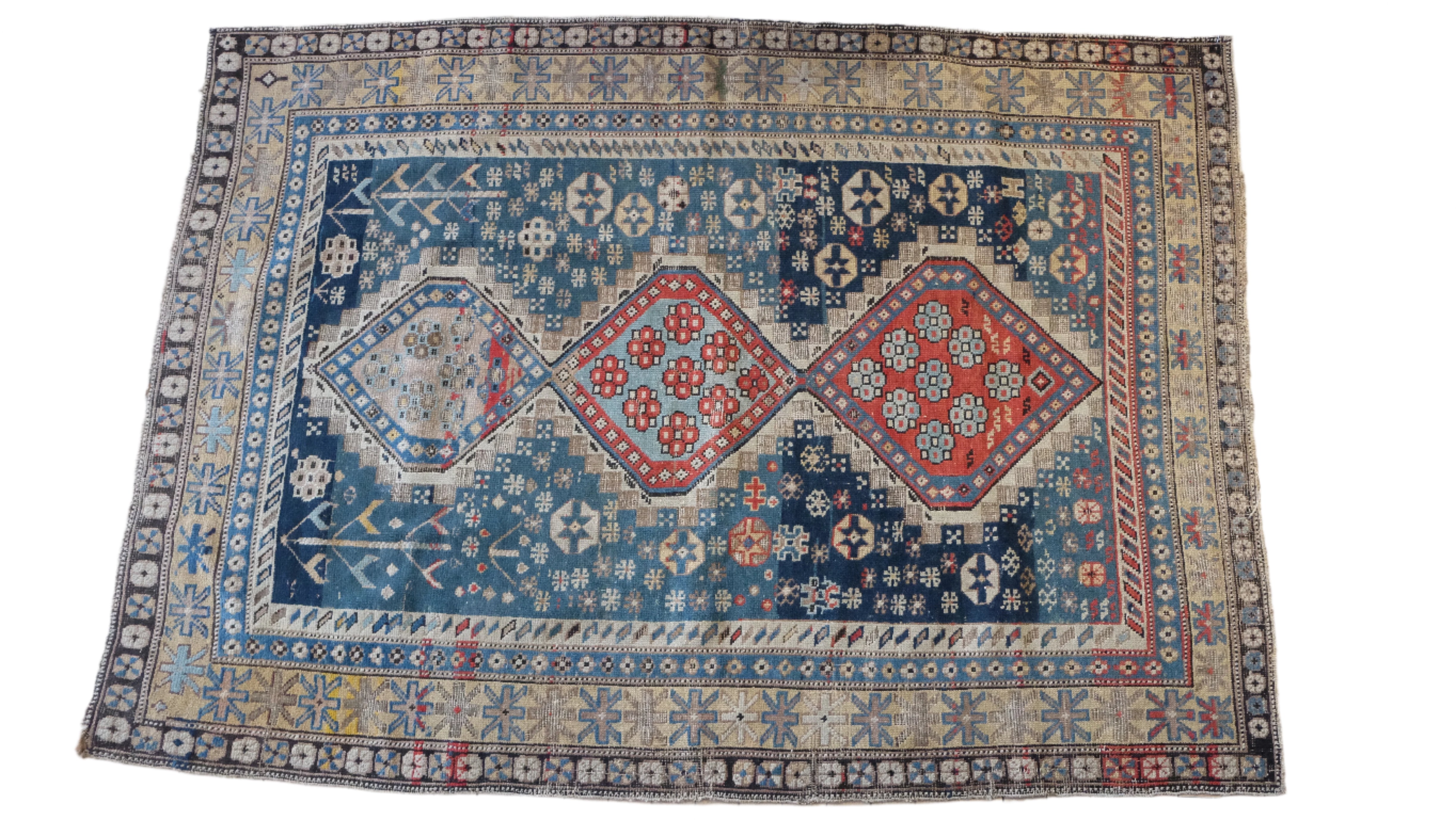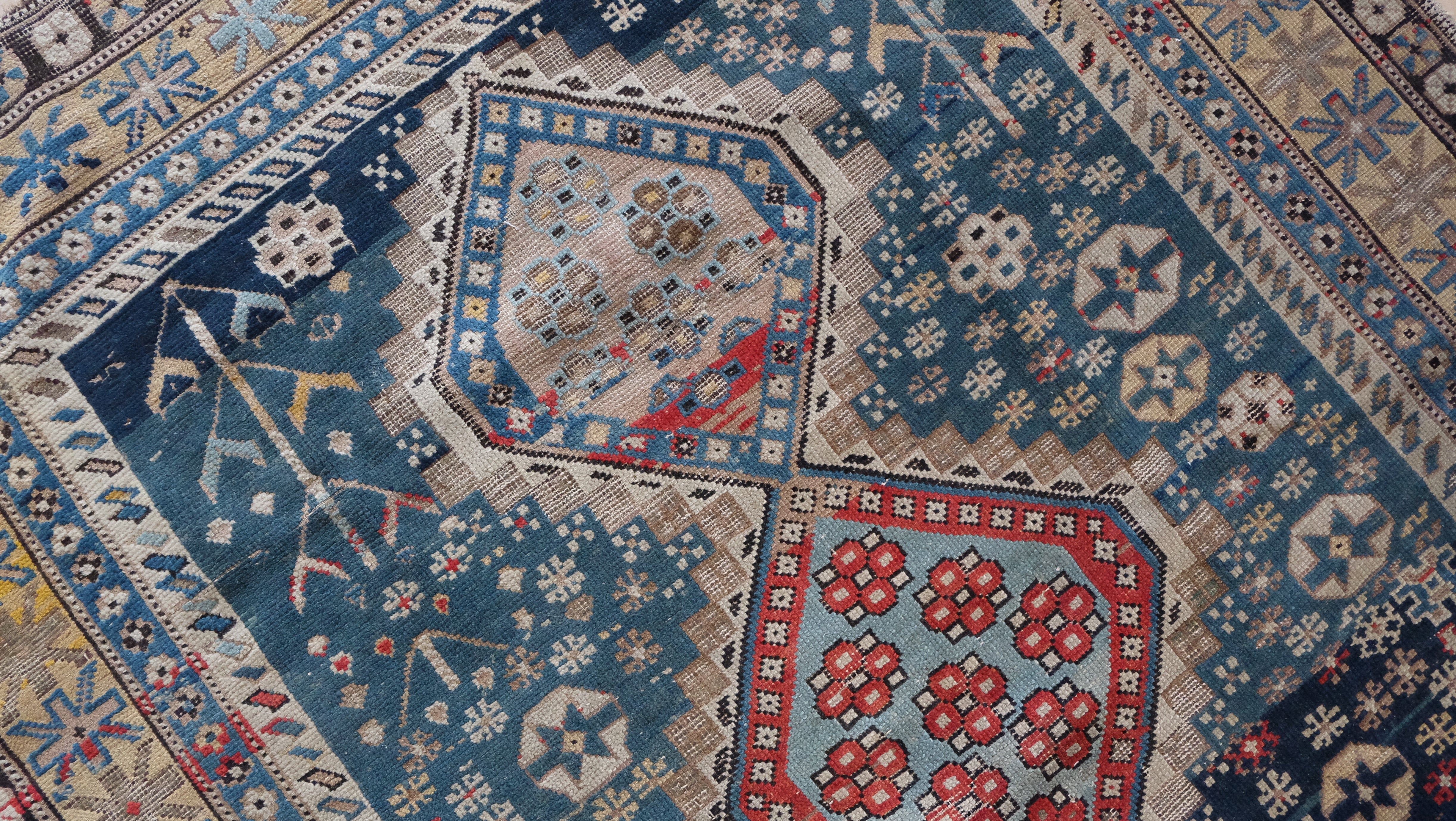 A Shirvan Kazak with a soft blue field with neutral designs and red medallions