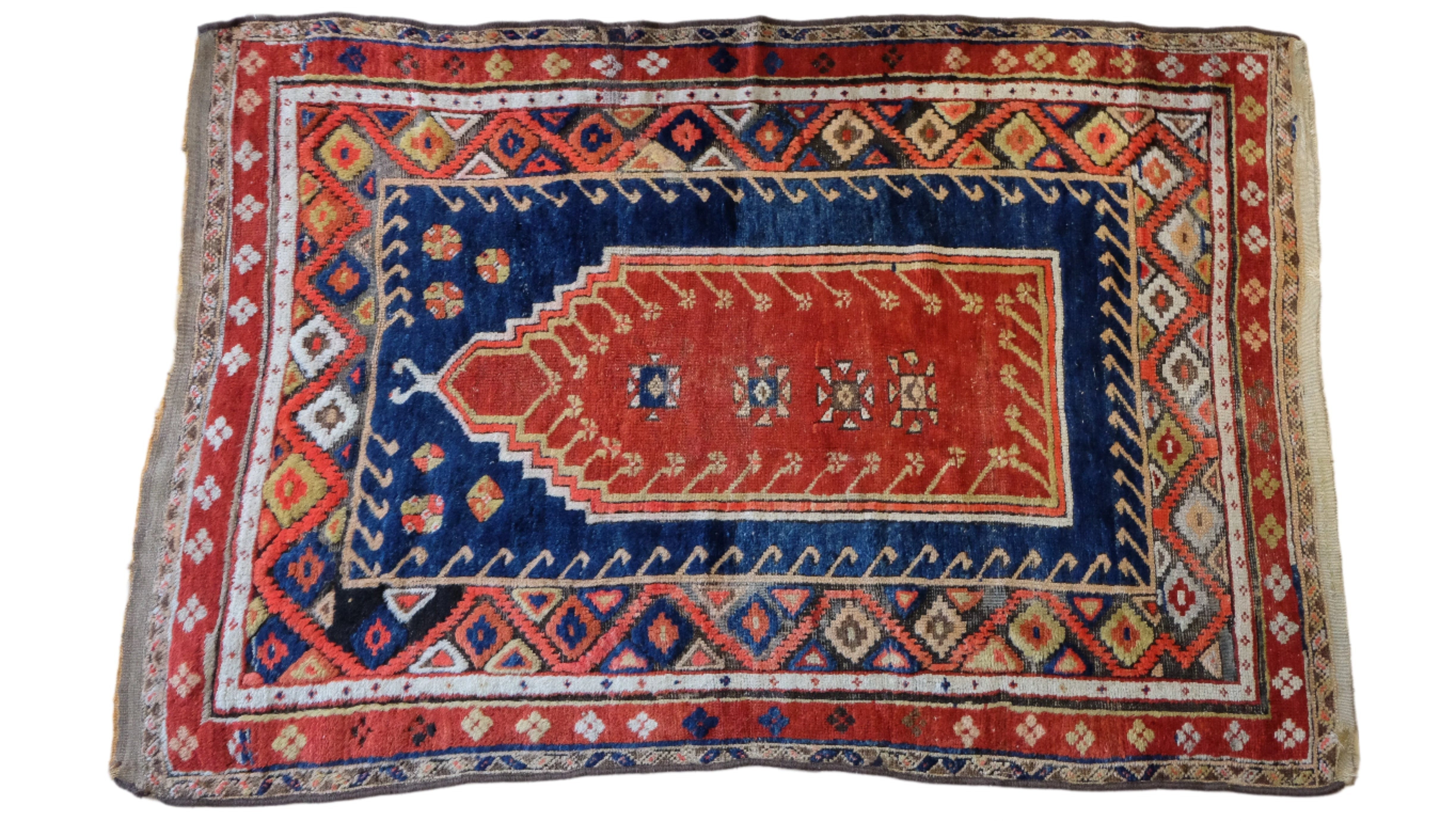 Turkish Konya prayer rug with a nice, wool pile and vibrant tones of tomato red, blue, chartreuse, watermelon and coral