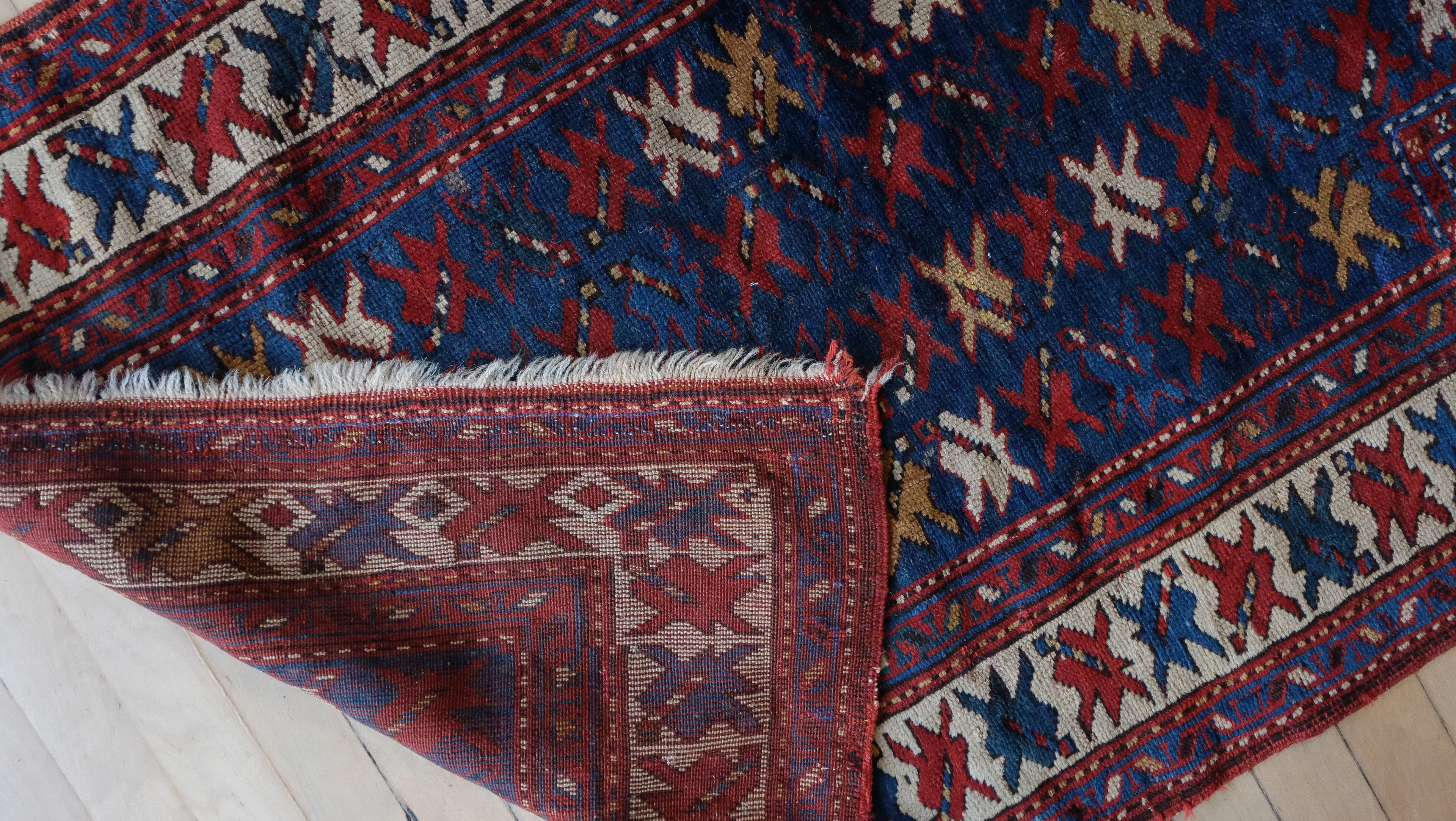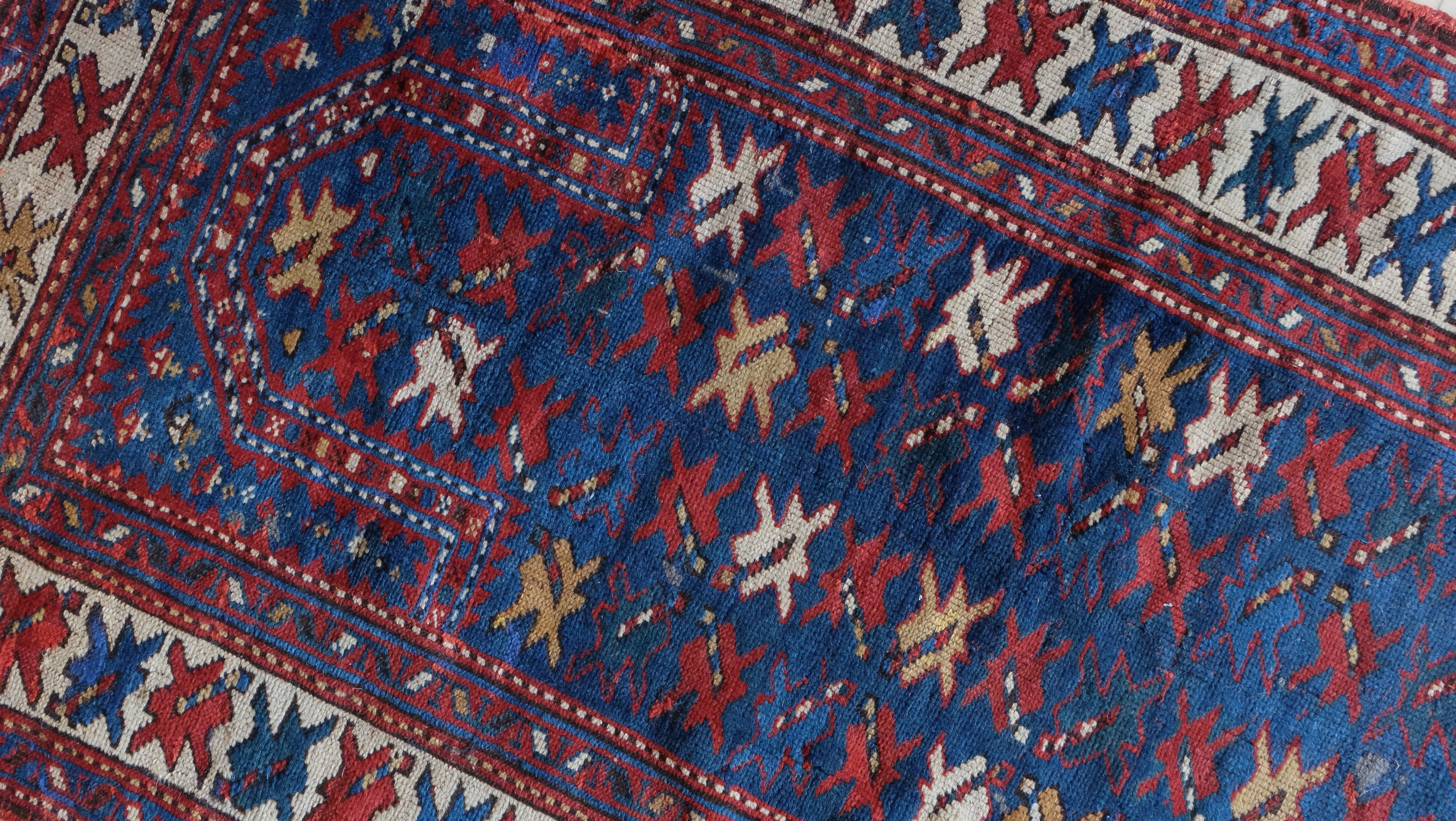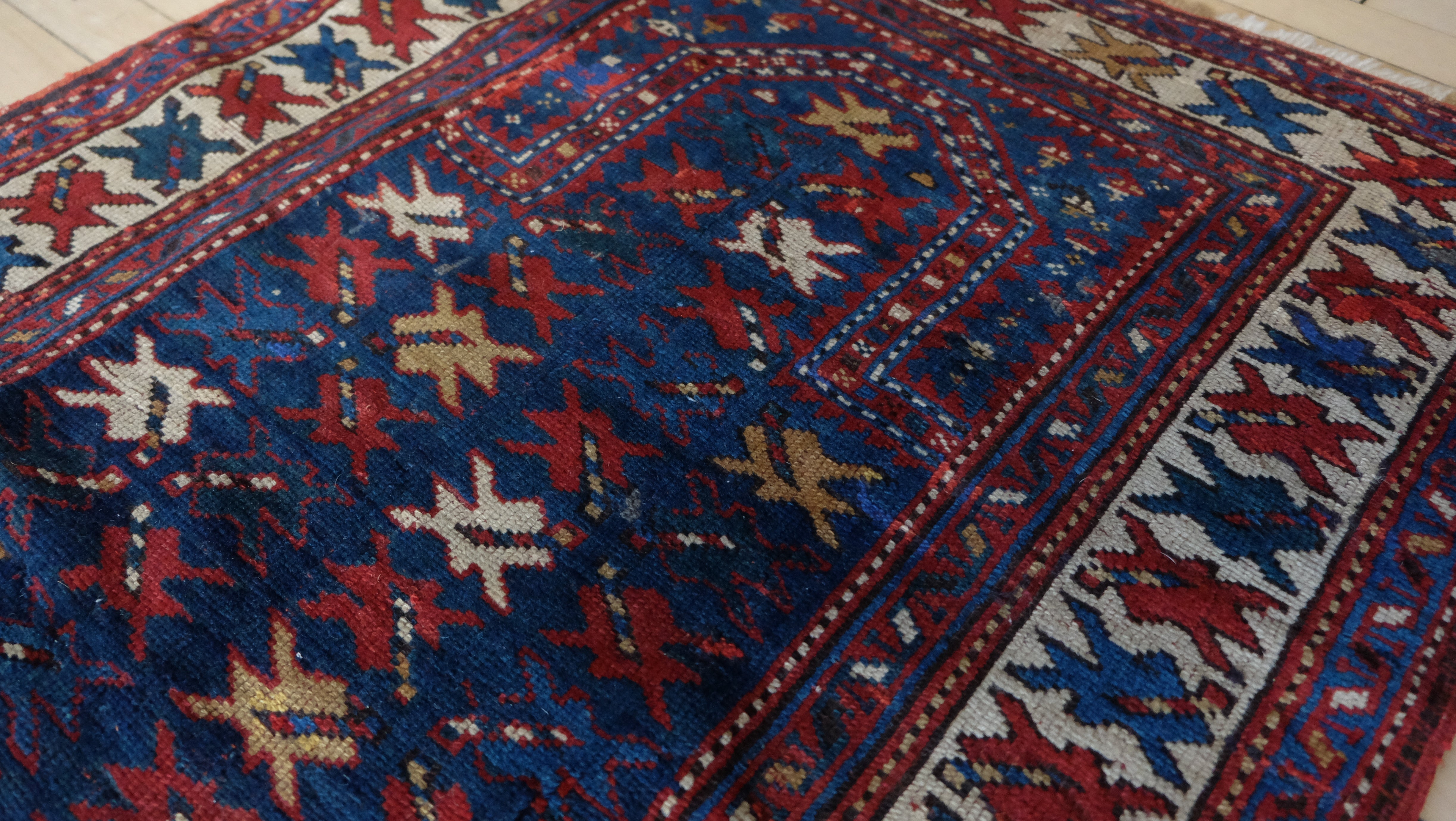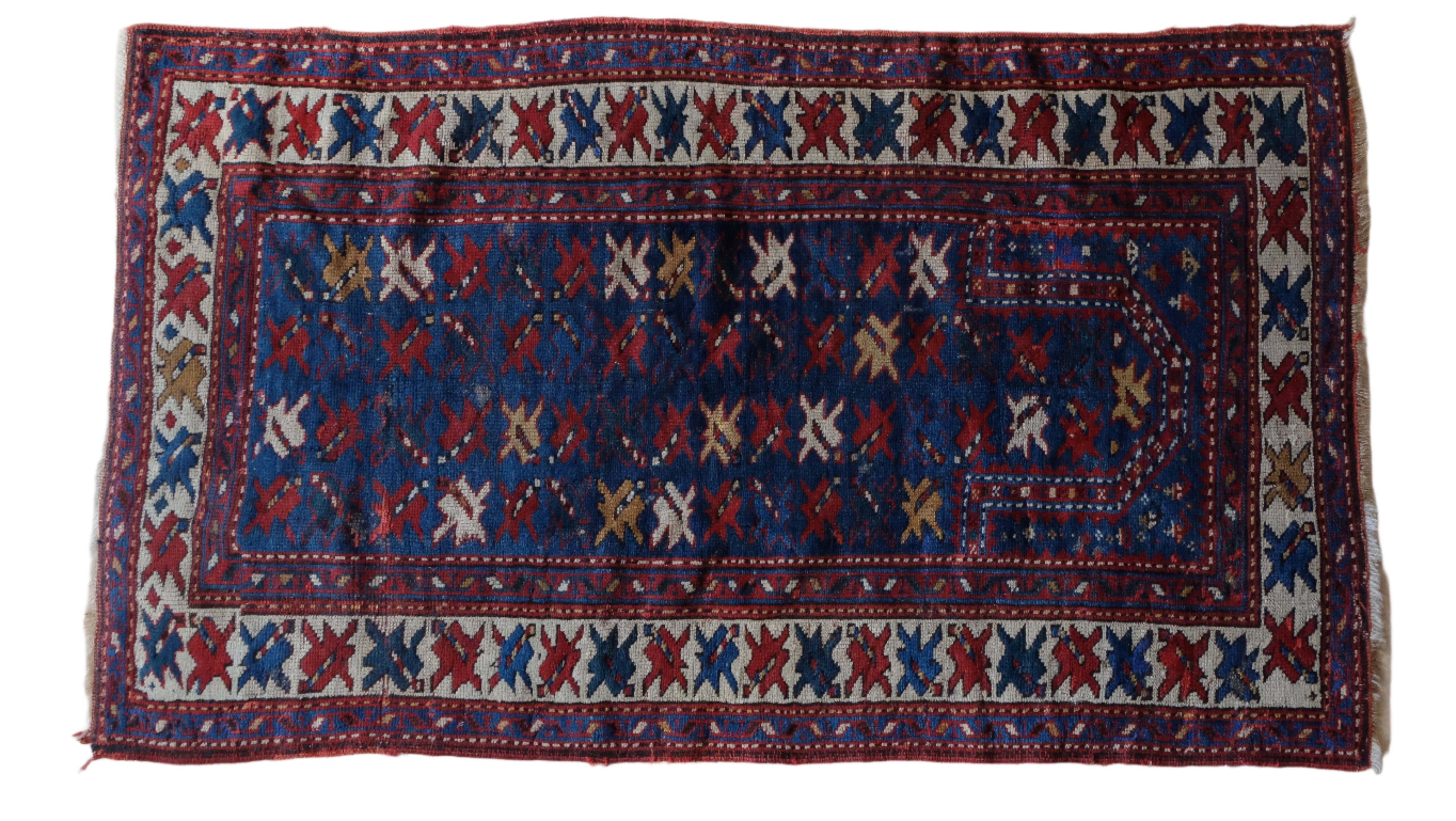 Antique prayer rug with a deep blue field, red, wheat and an ivory border