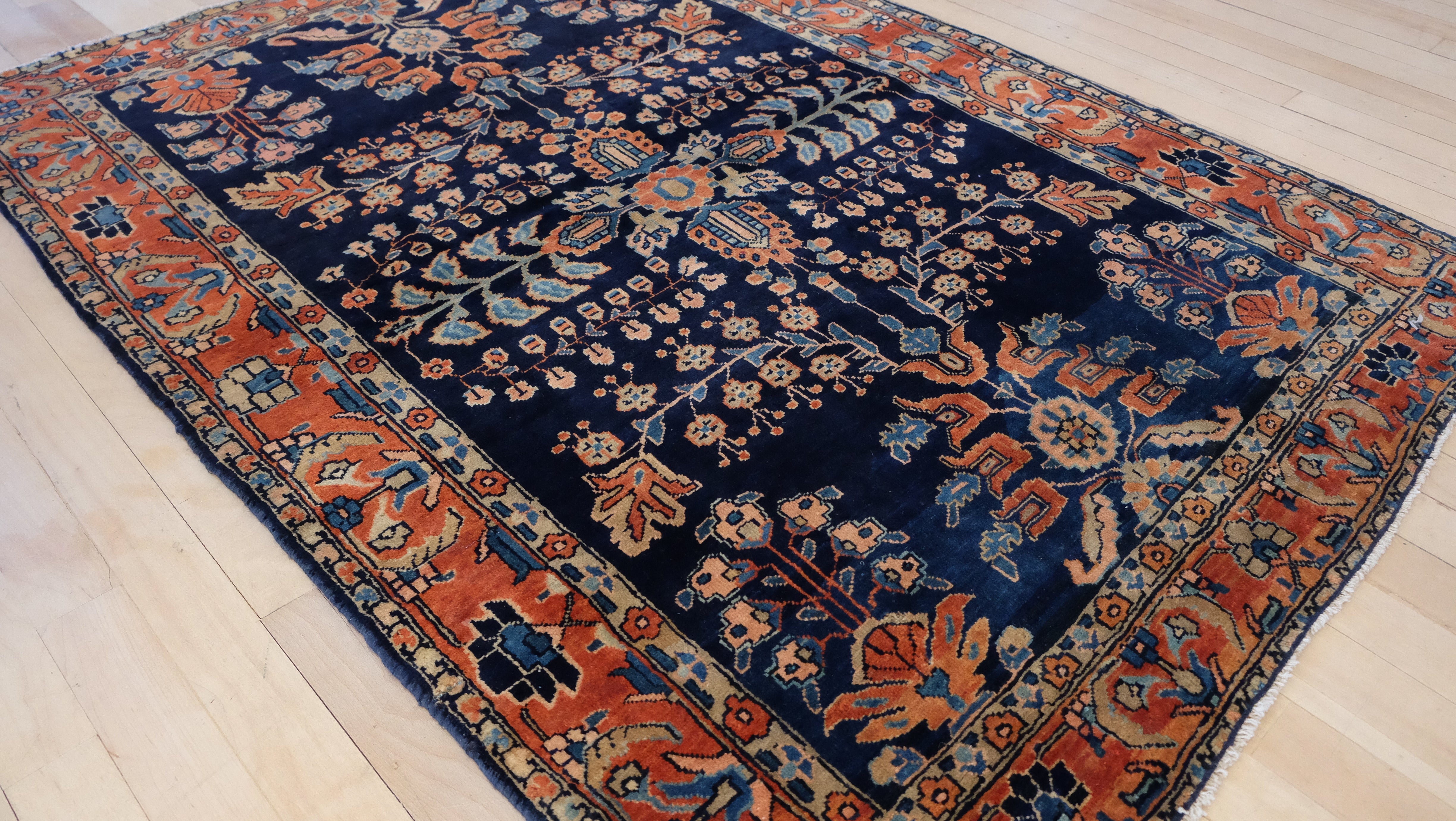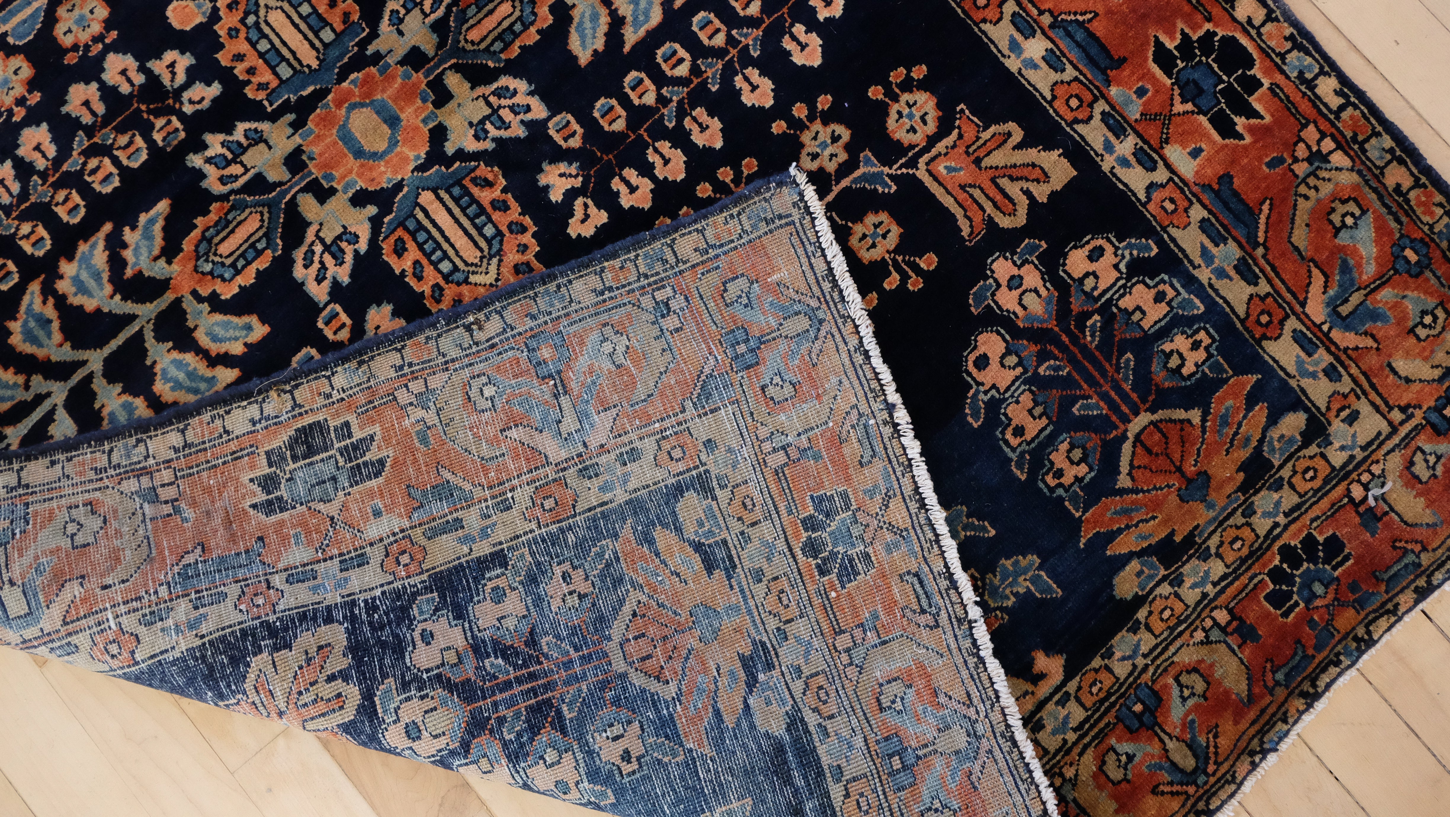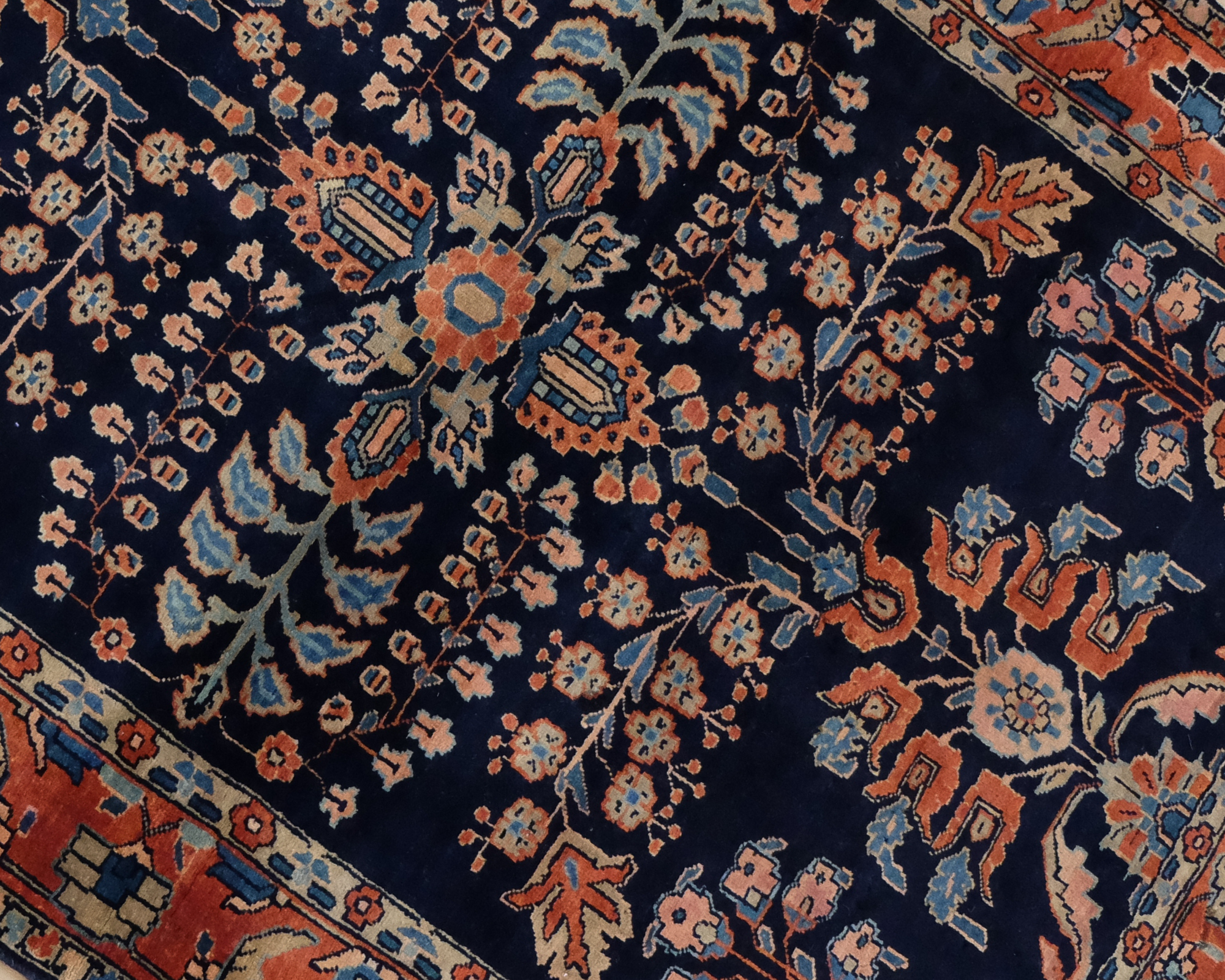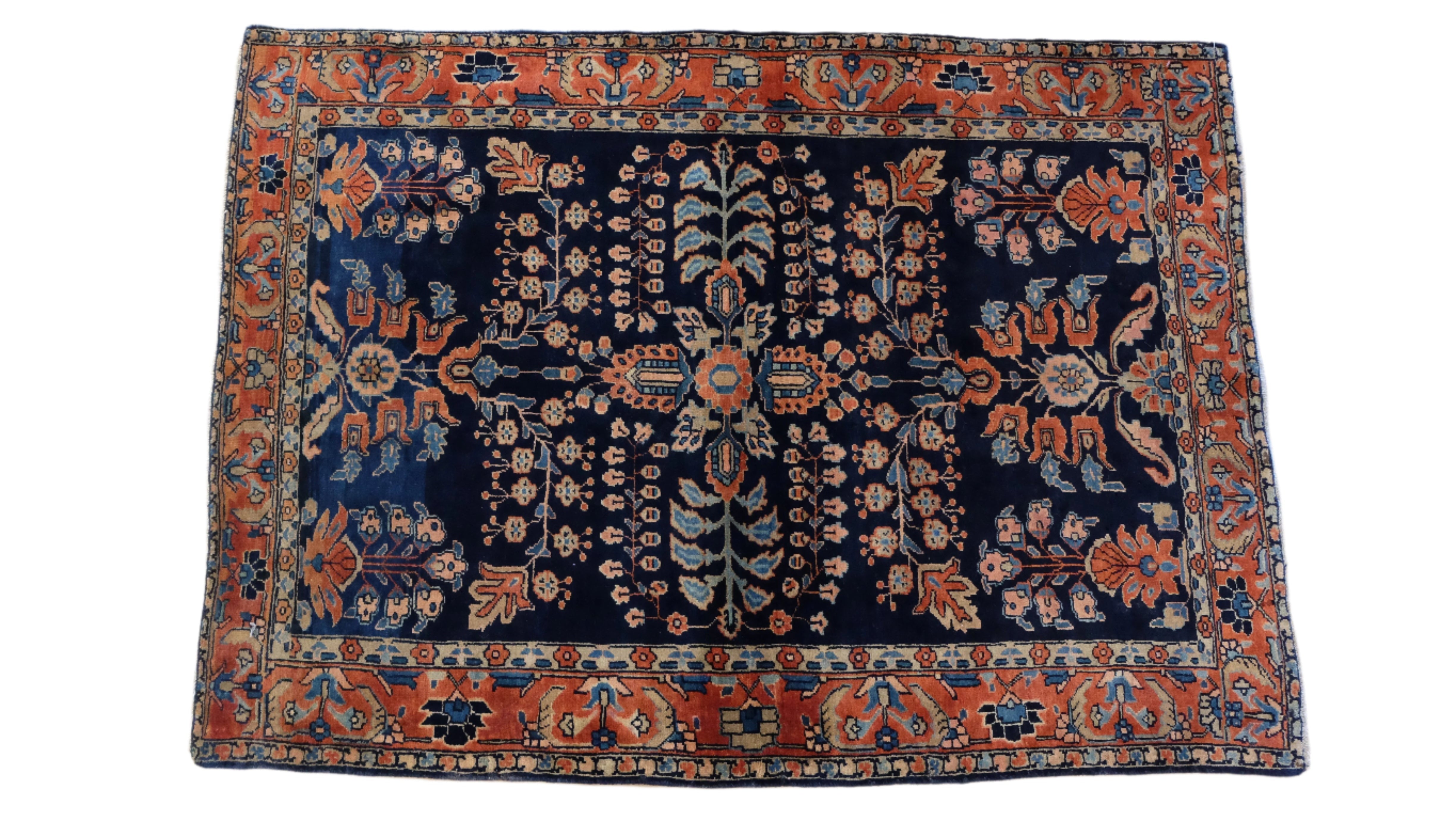 A fine Mohajeran Sarouk with a navy blue center field and tones of terracotta, cream and olive green