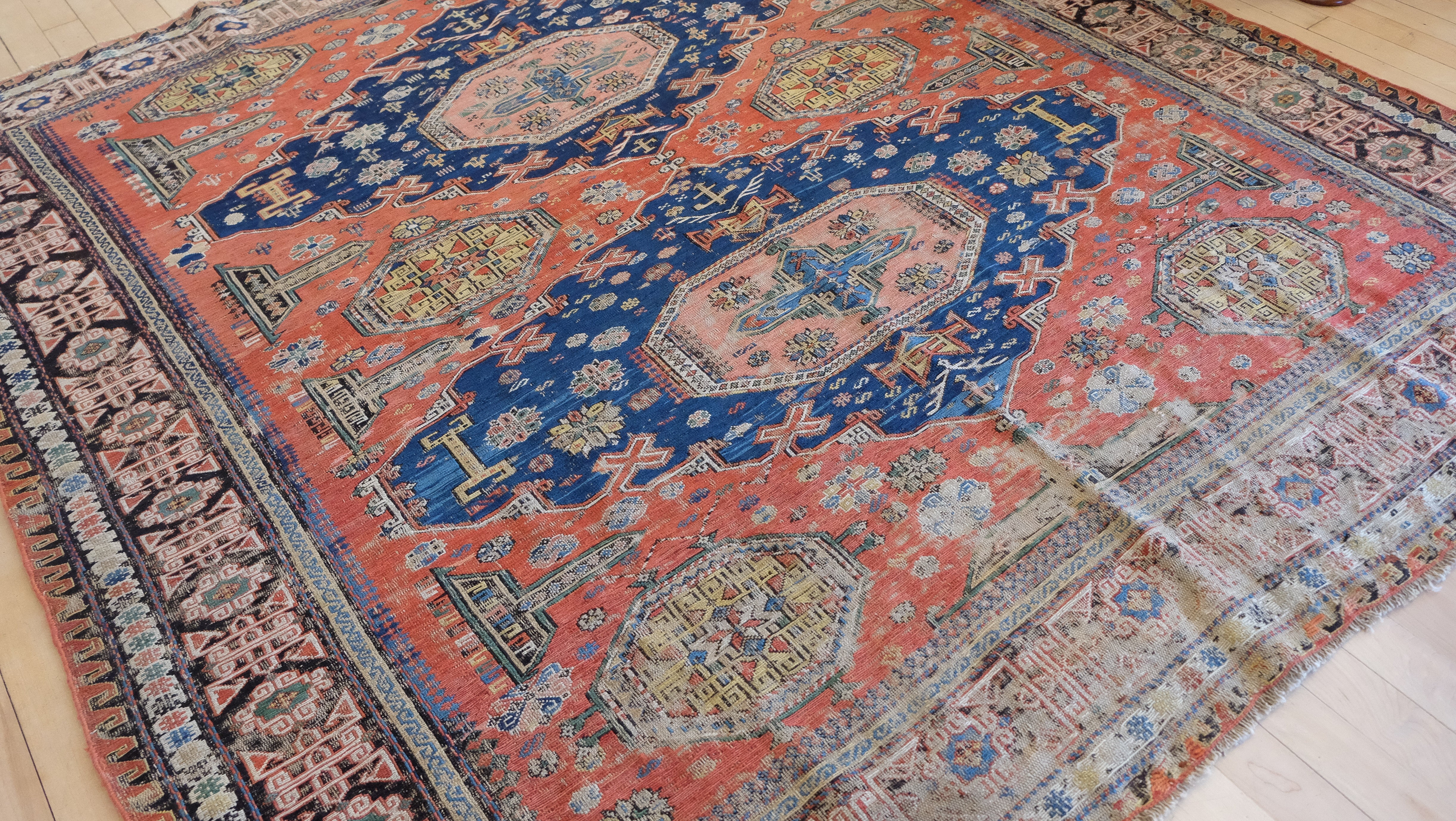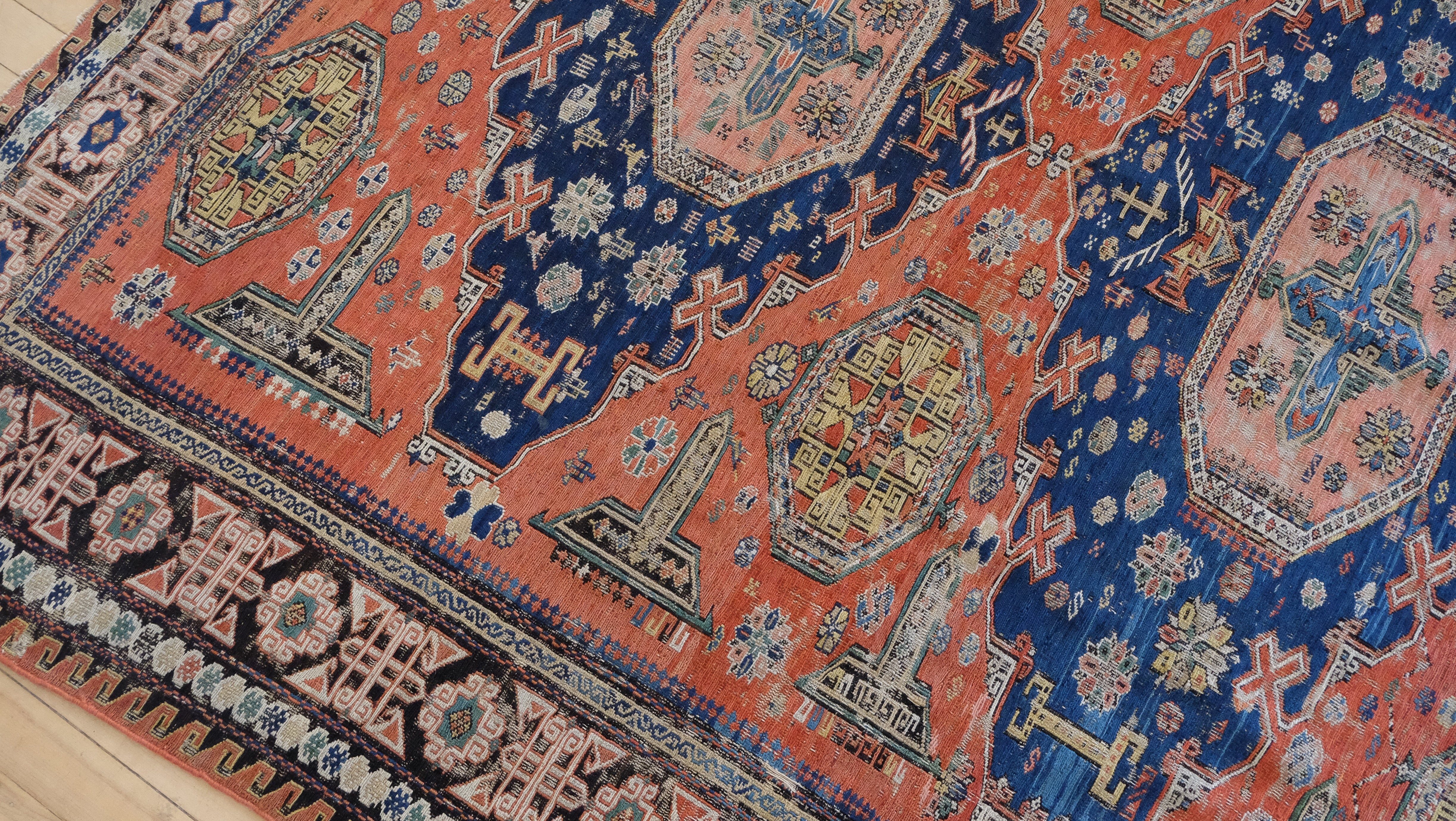 A turn of the century Soumac with rust, navy, mustard, olive and jade green