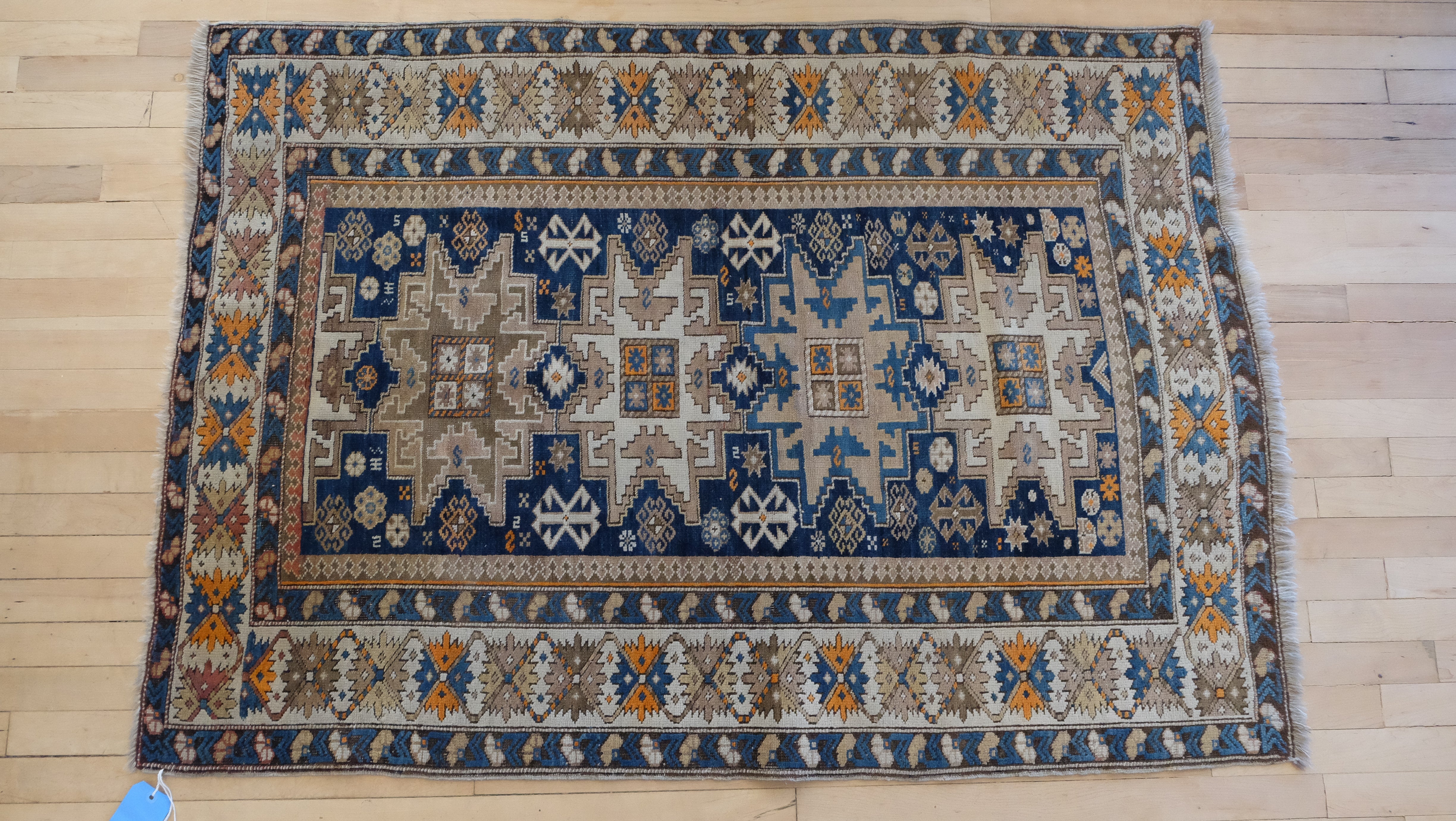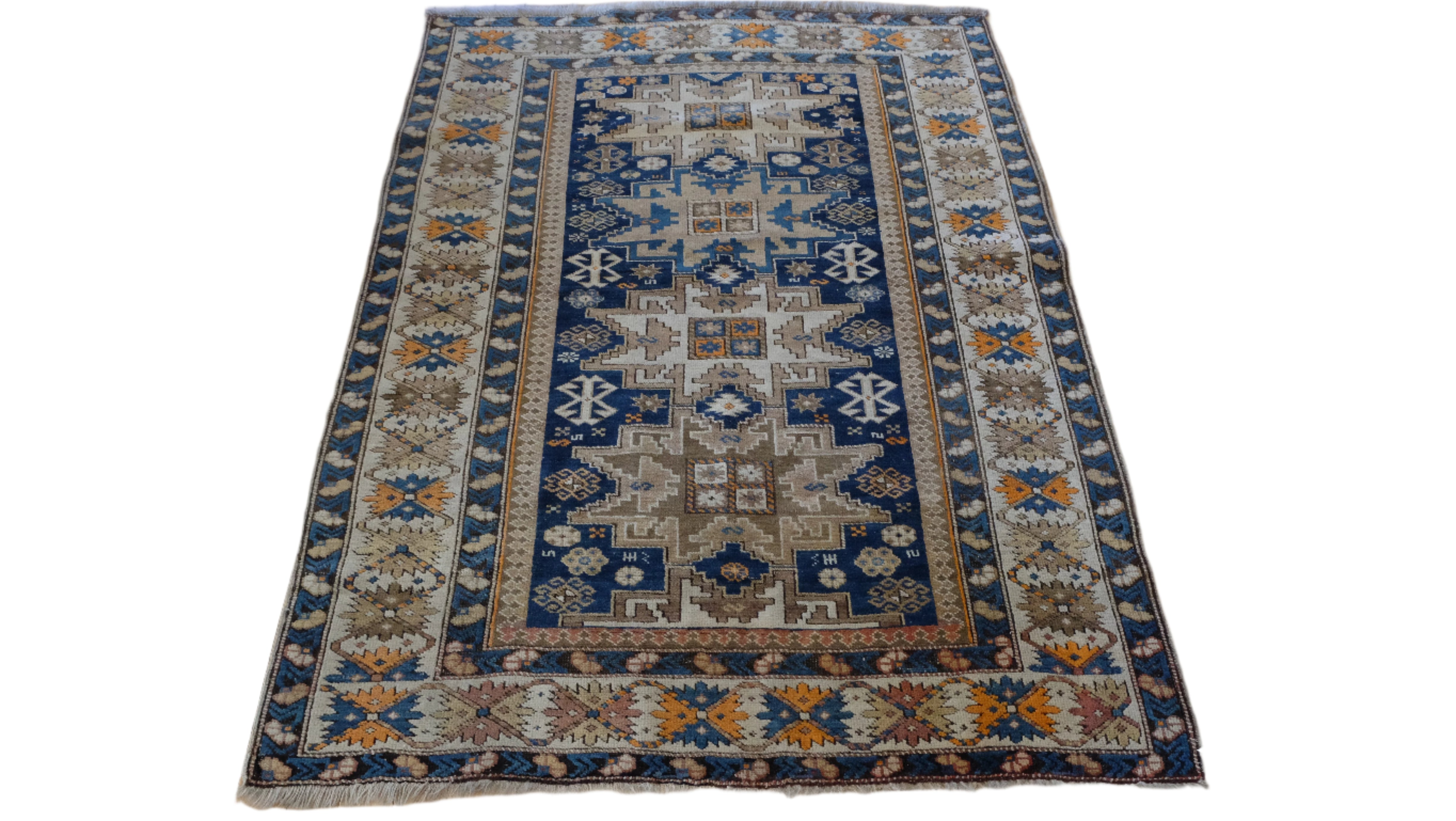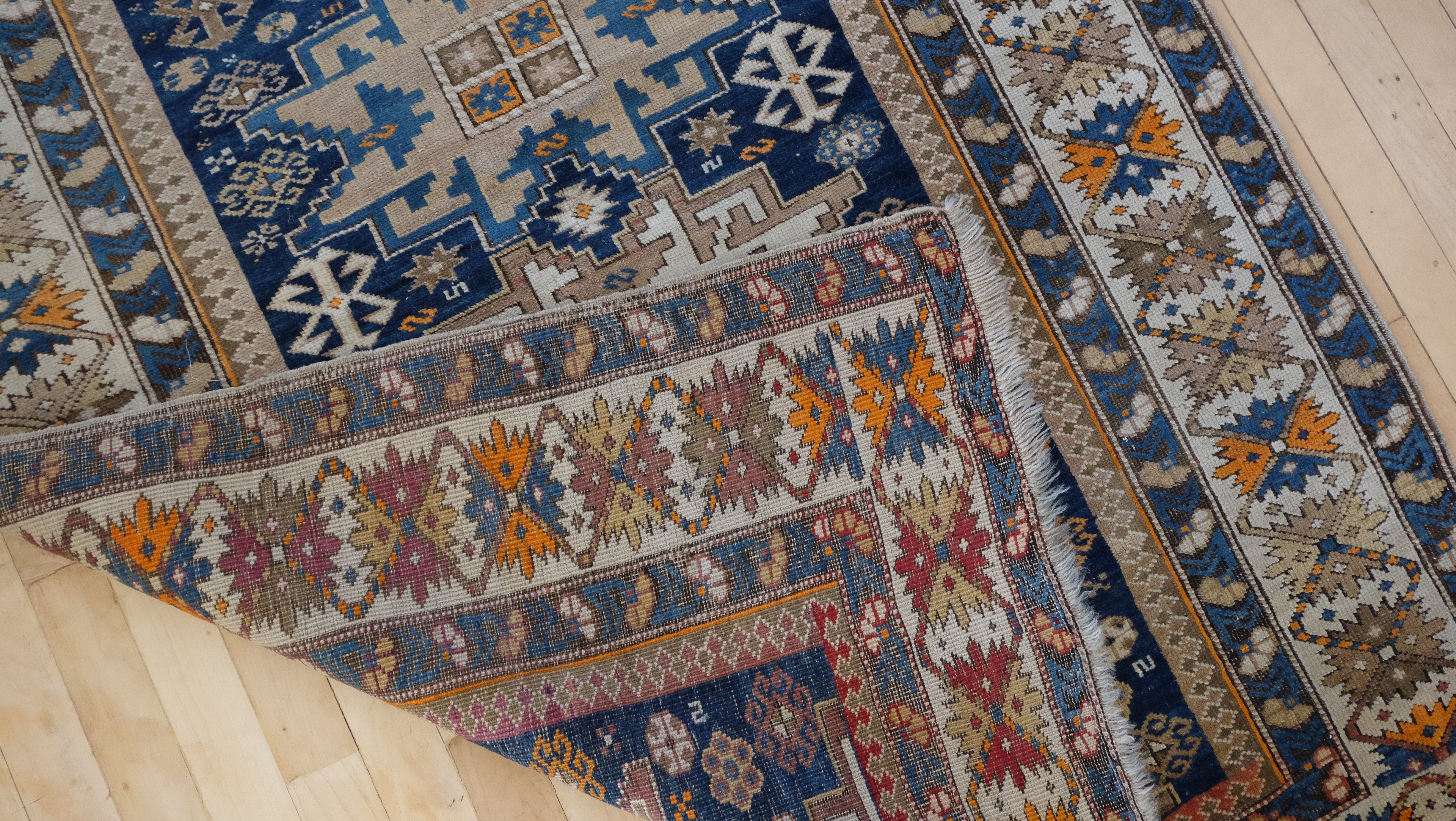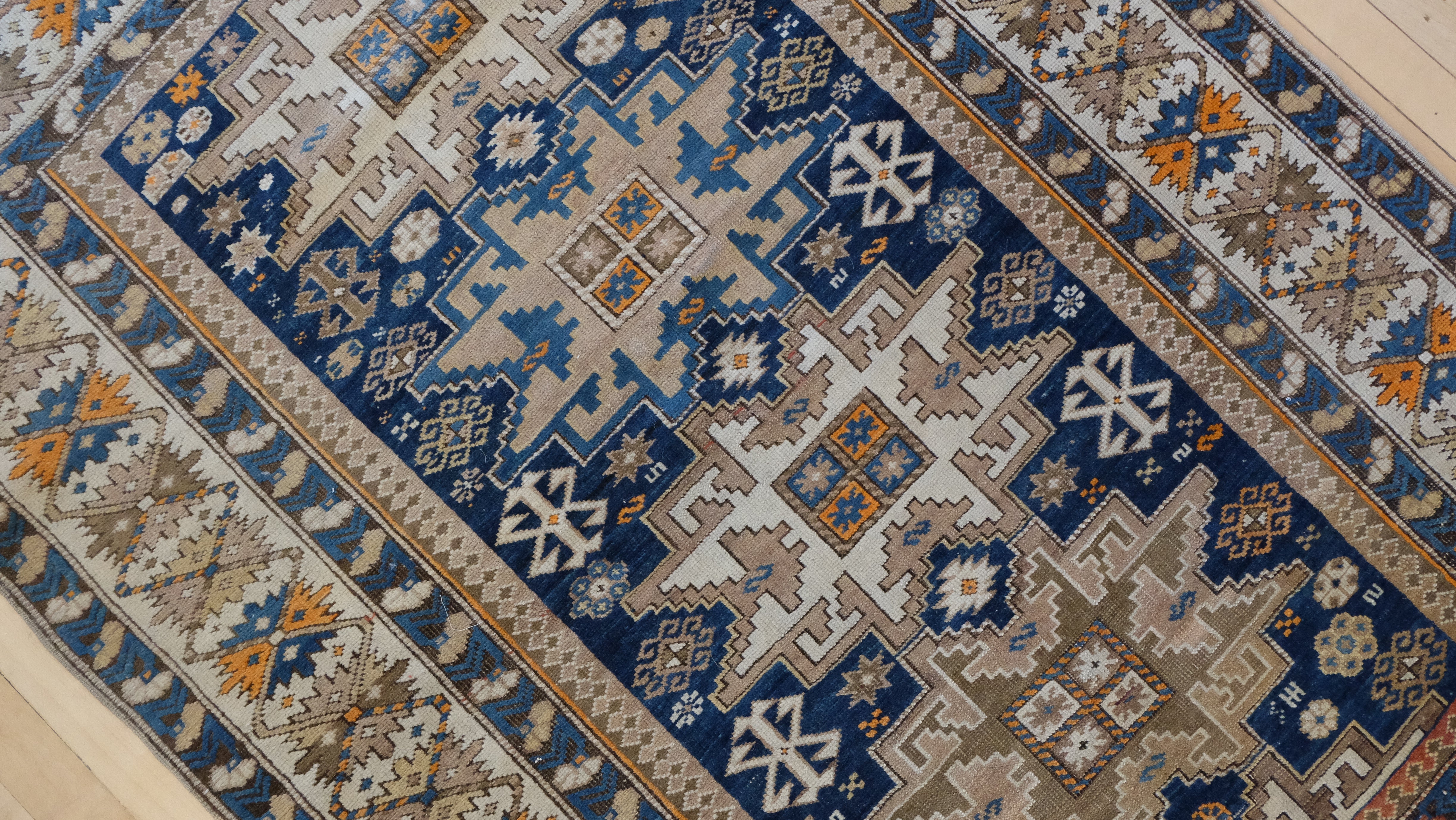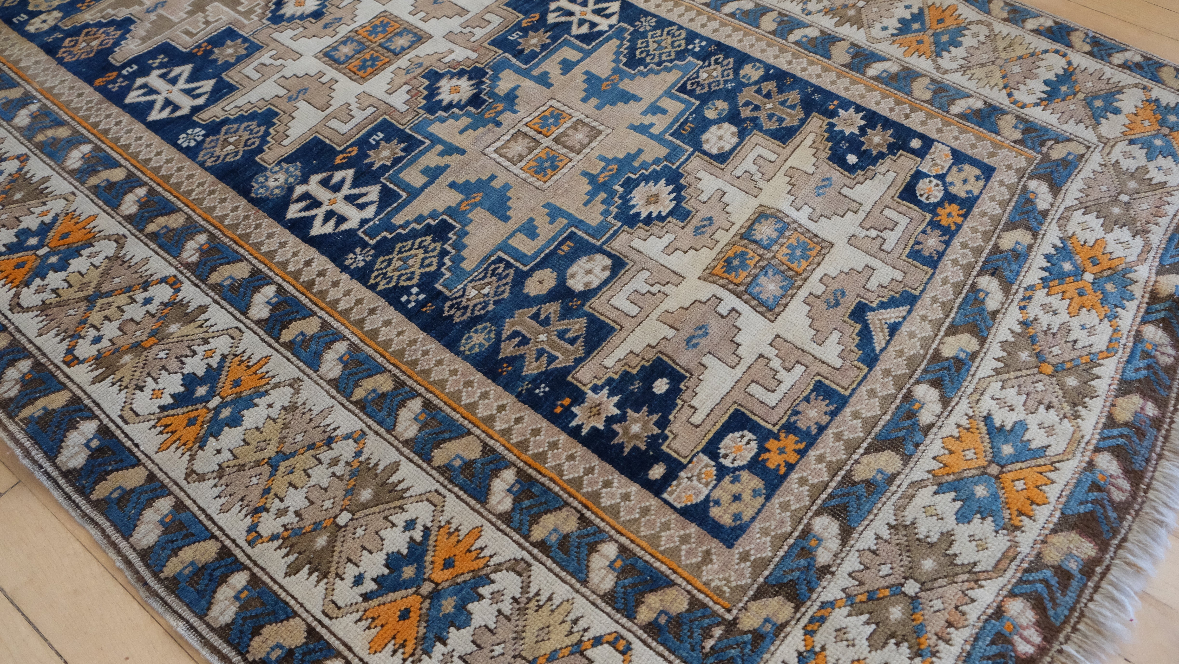 Lesghi Kazak with a versatile palette of neutrals and blues.  Tones of navy, cornflower blue, tangerine, camel and khaki