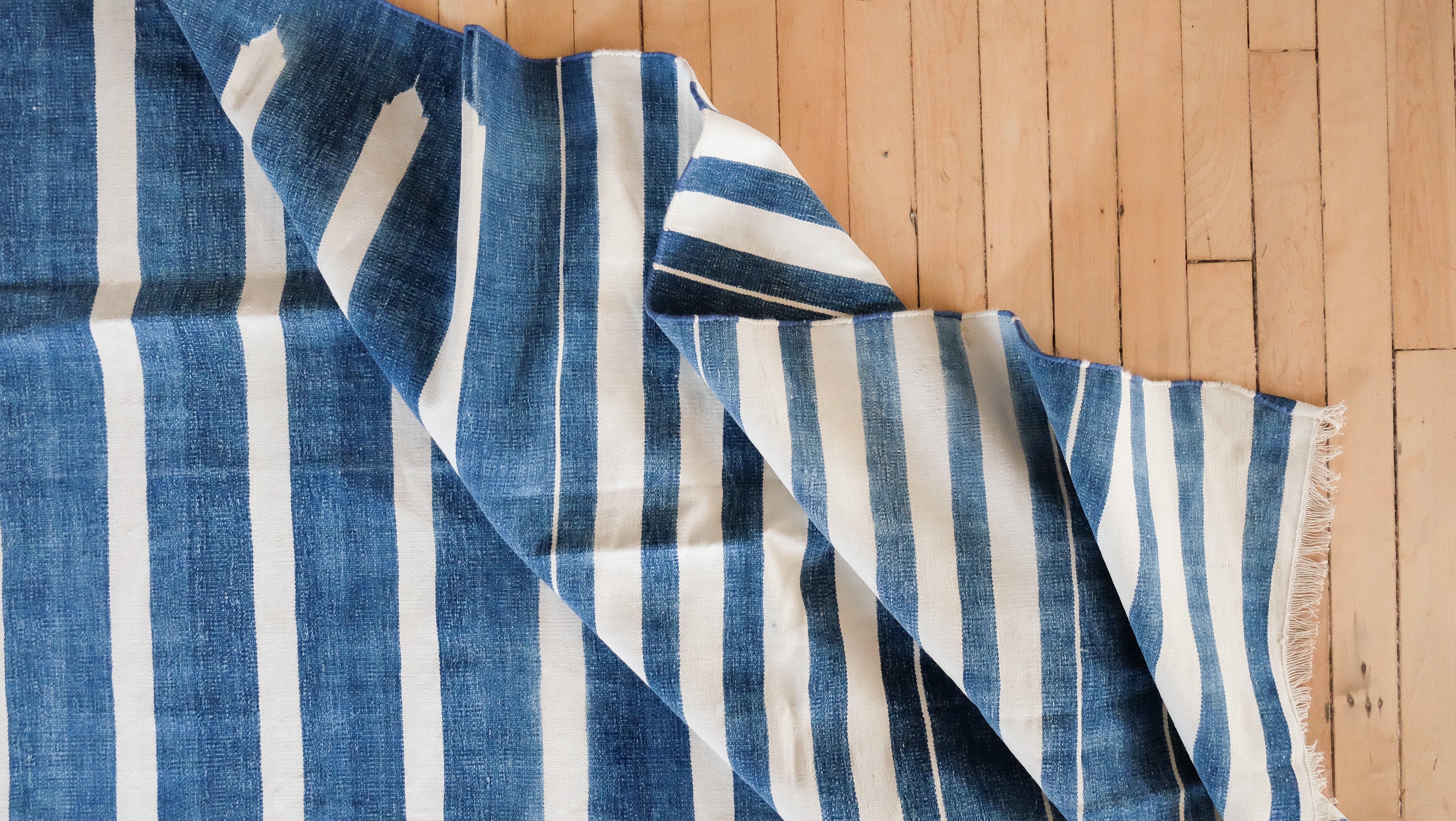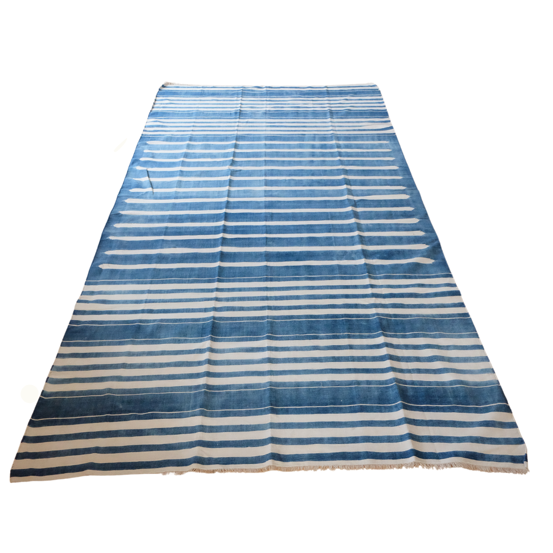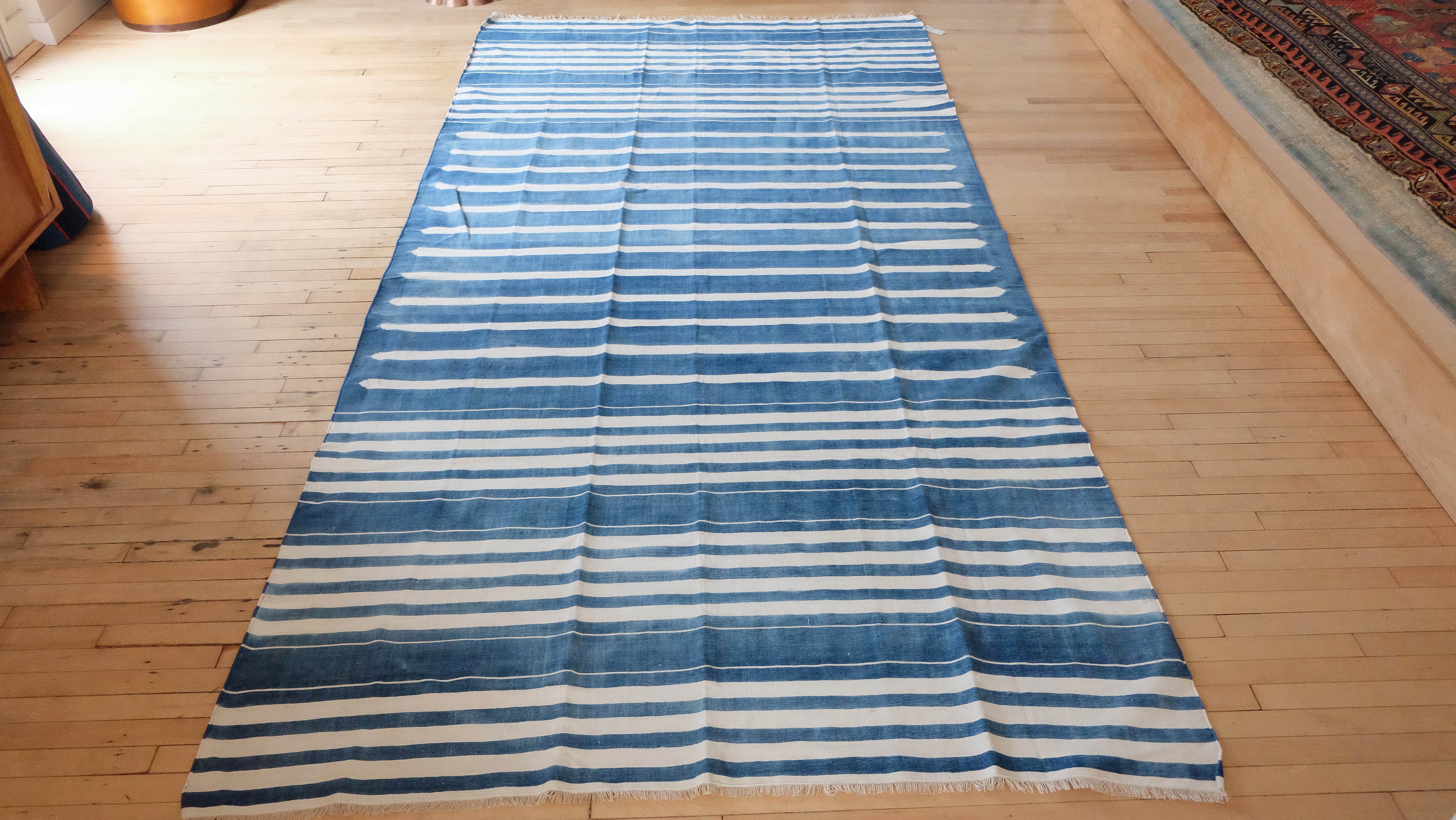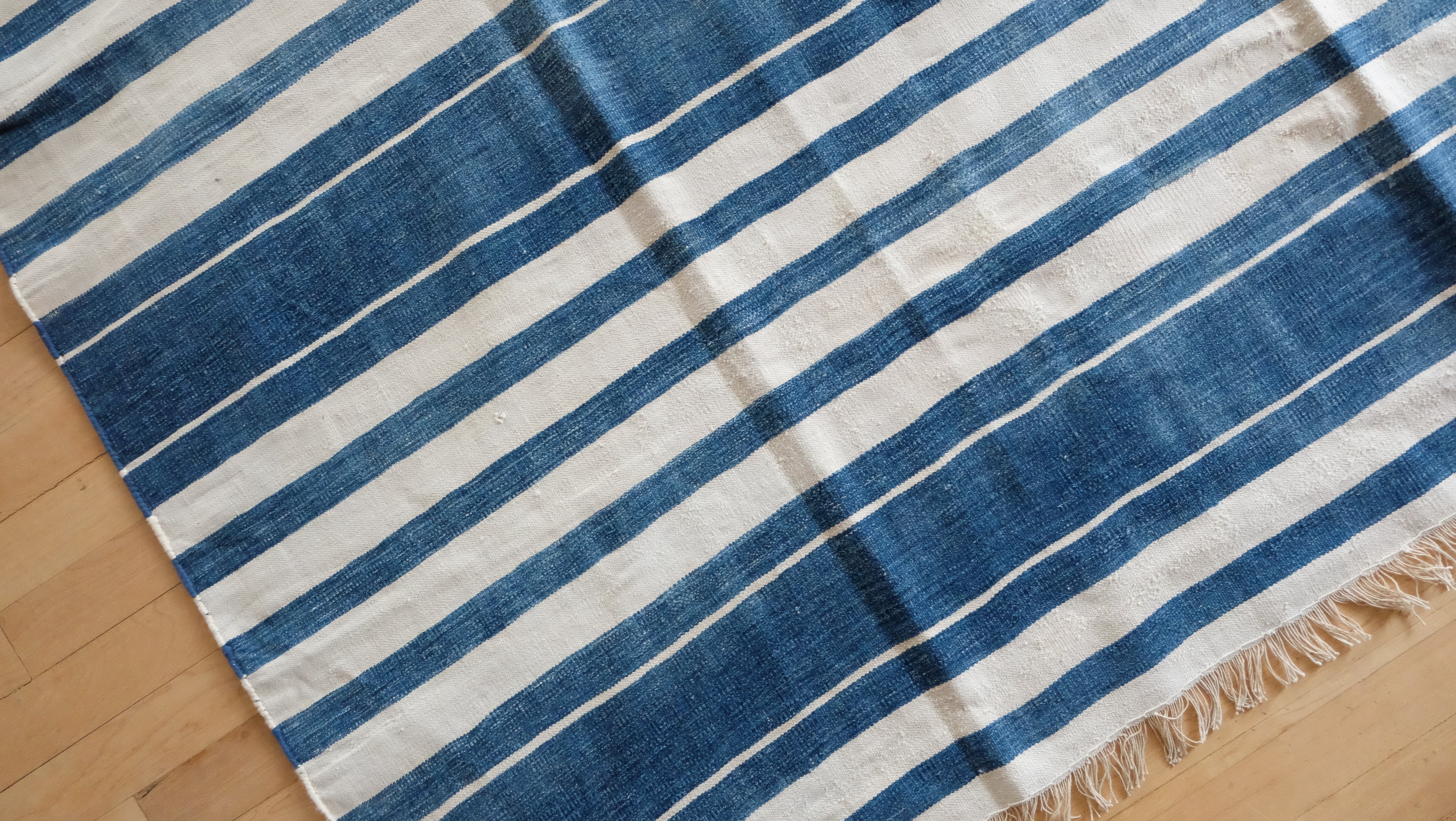 Antique Dhurrie with a soft cotton and an indigo and ivory stripe