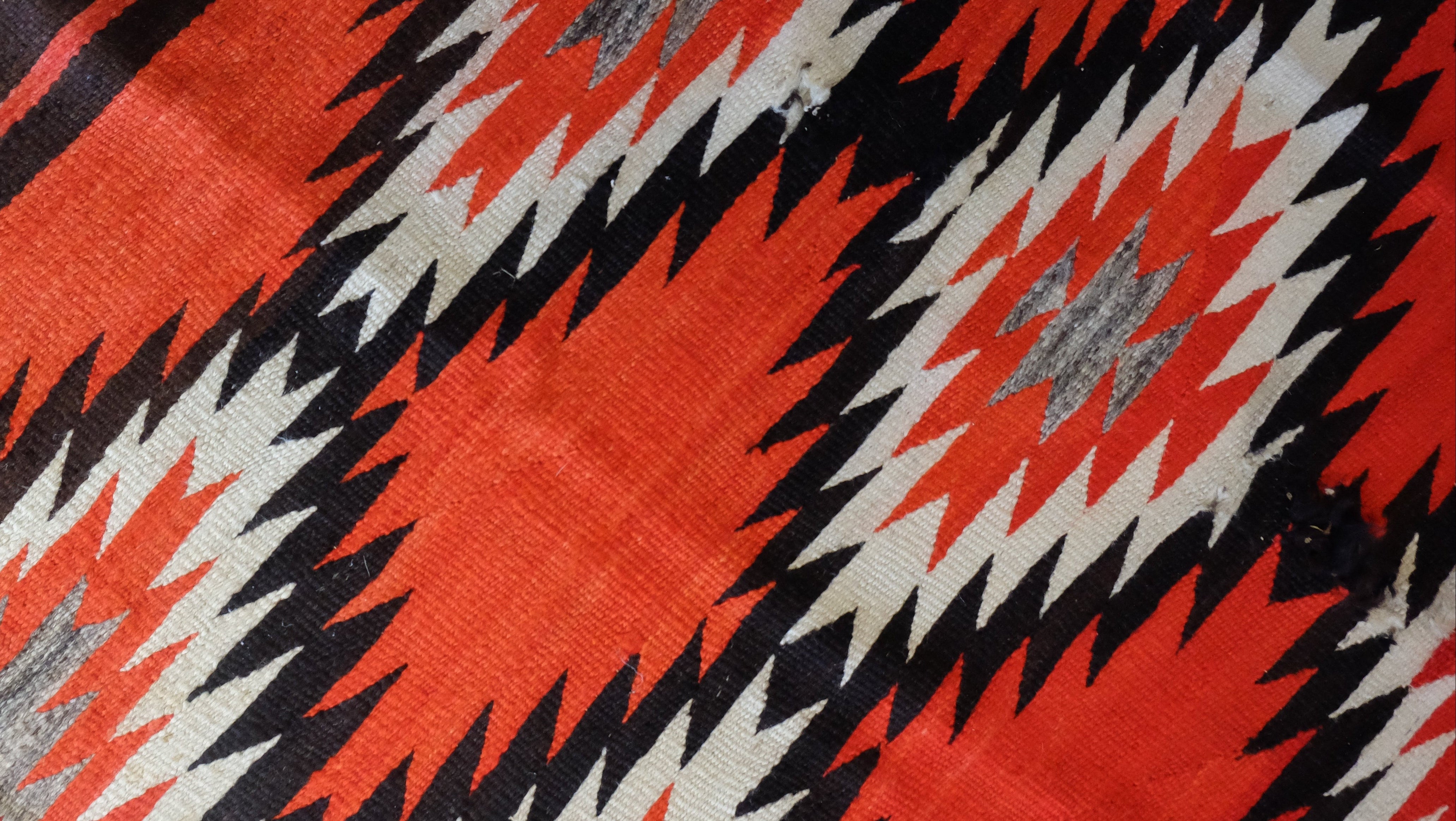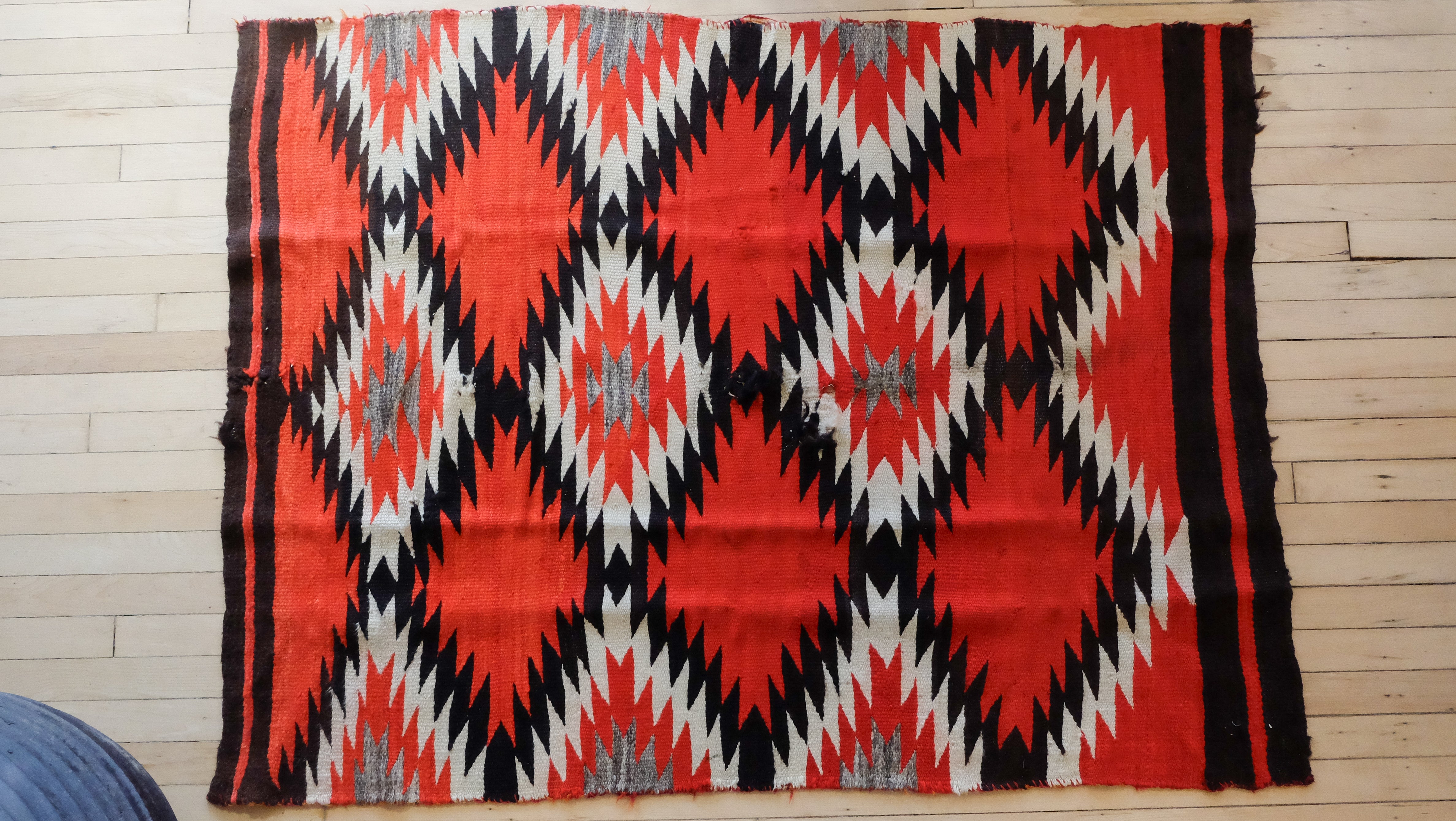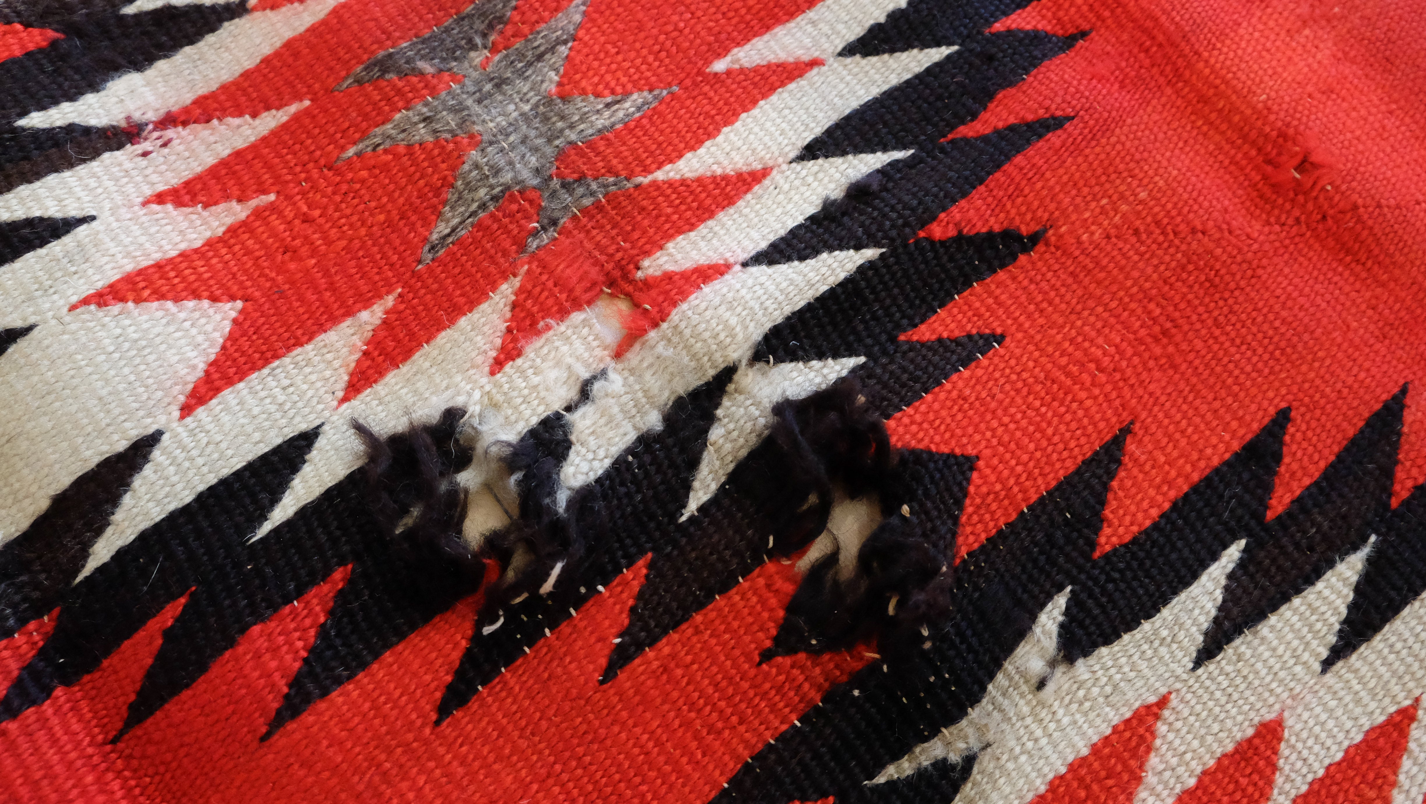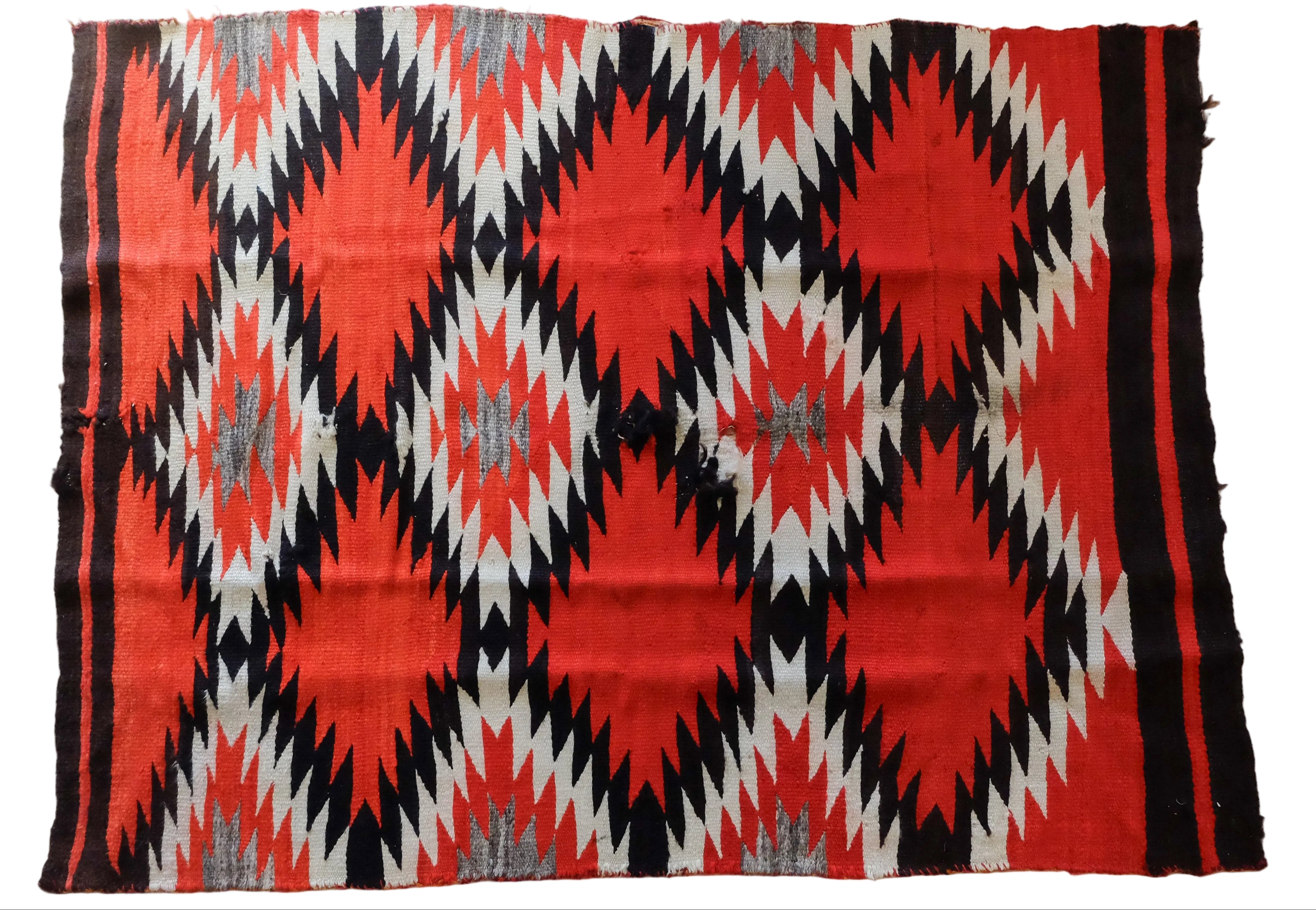 Antique Navajo with the eye dazzler design. Ganado red, black, gray and ivory. Has wear.