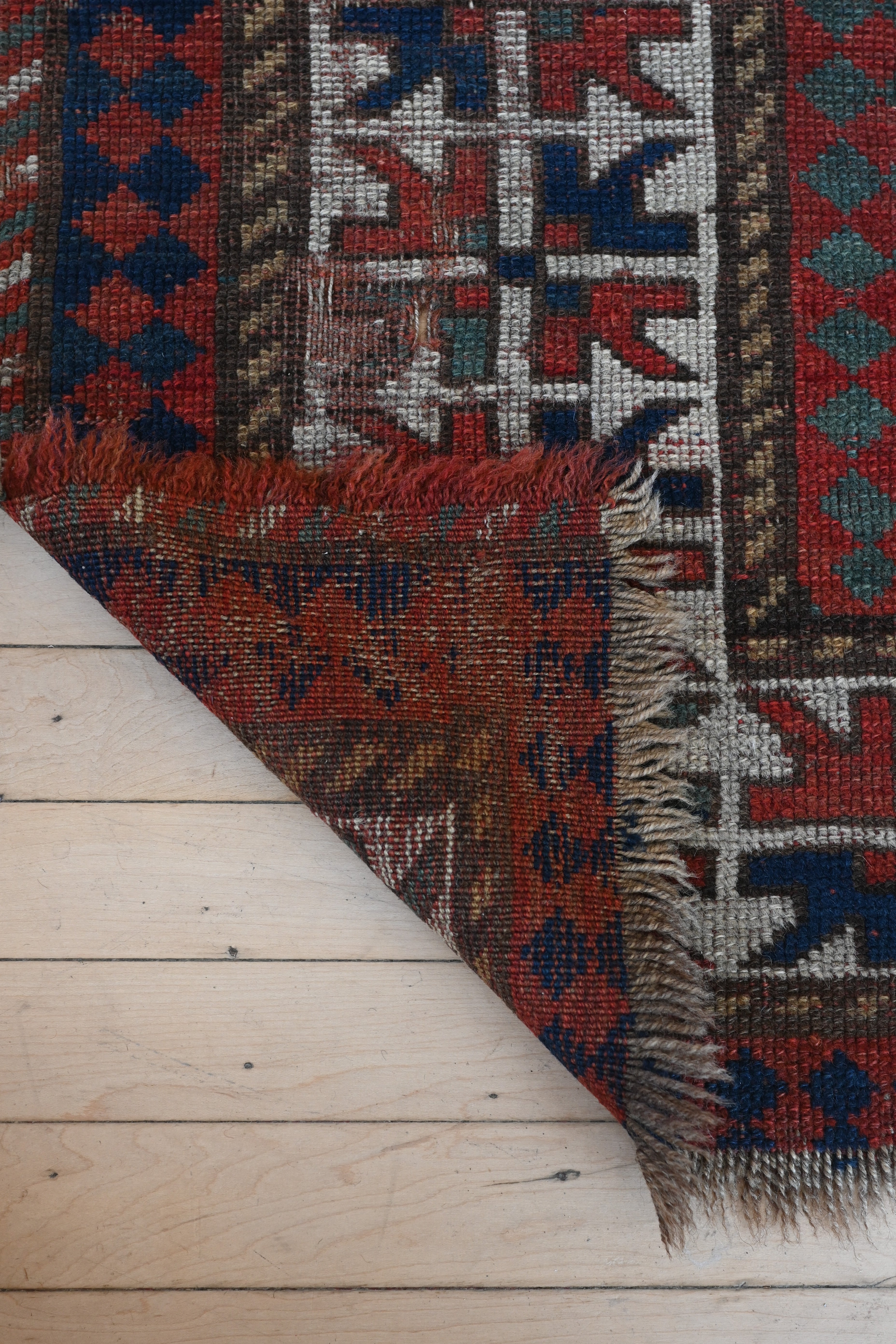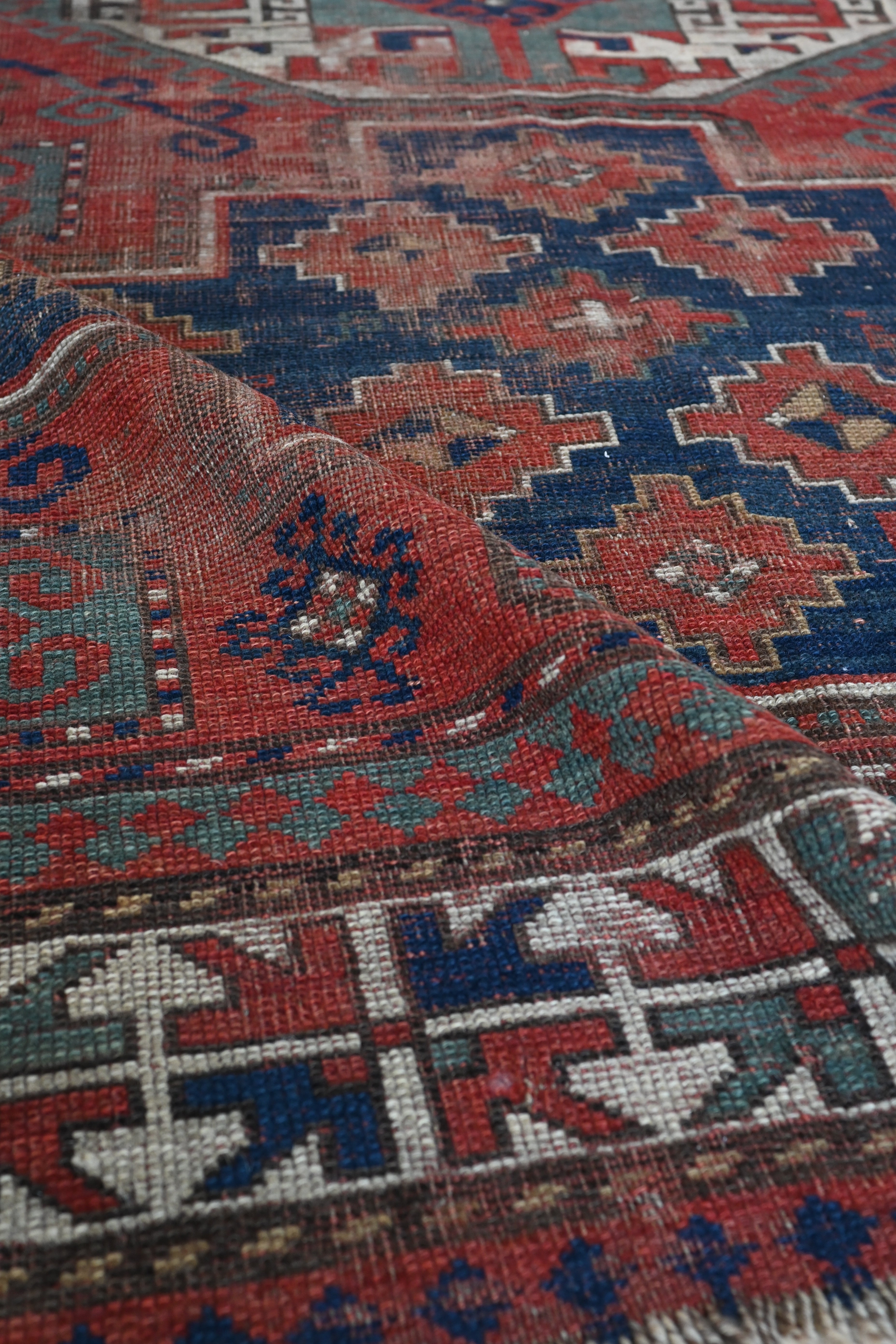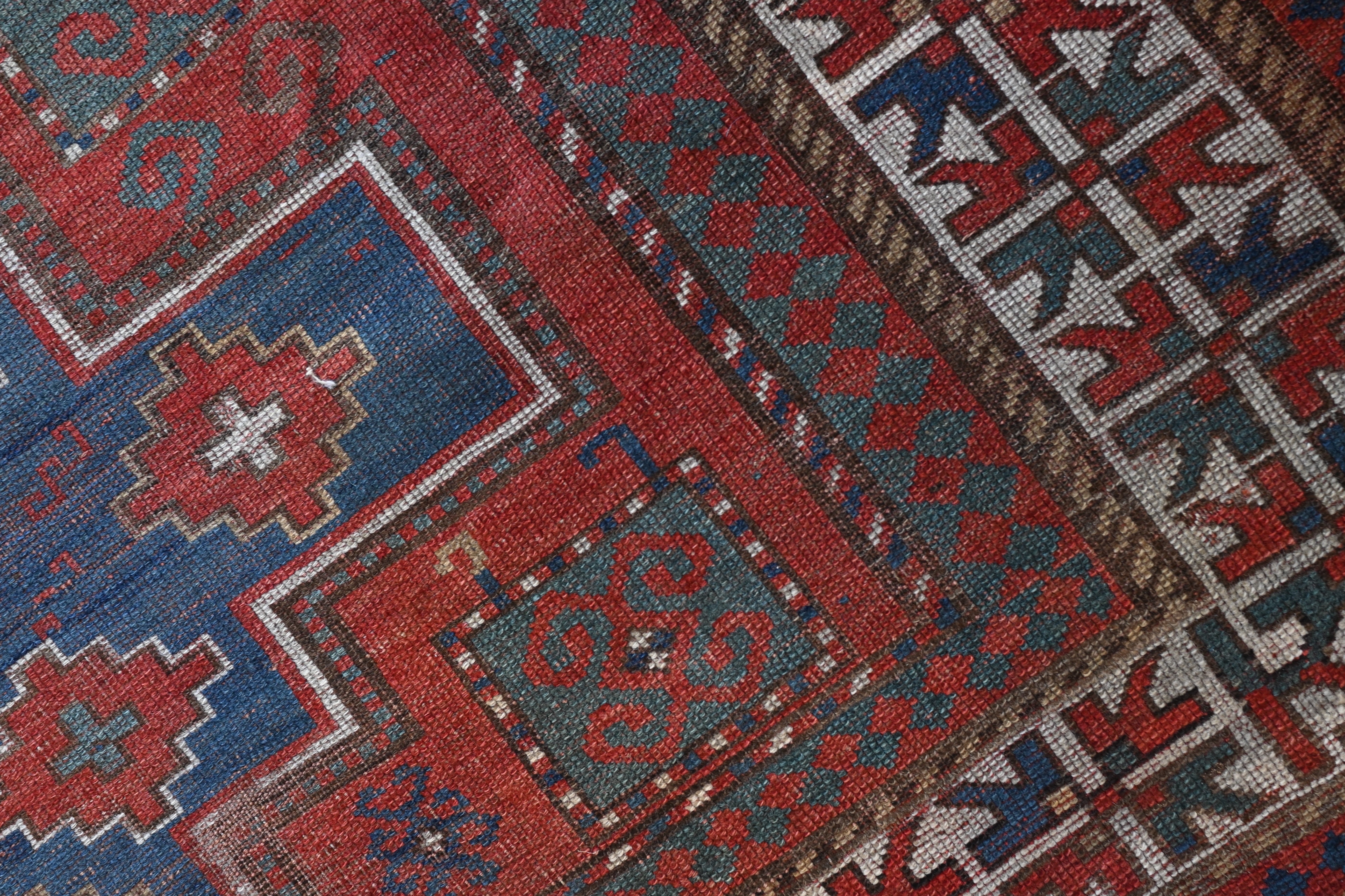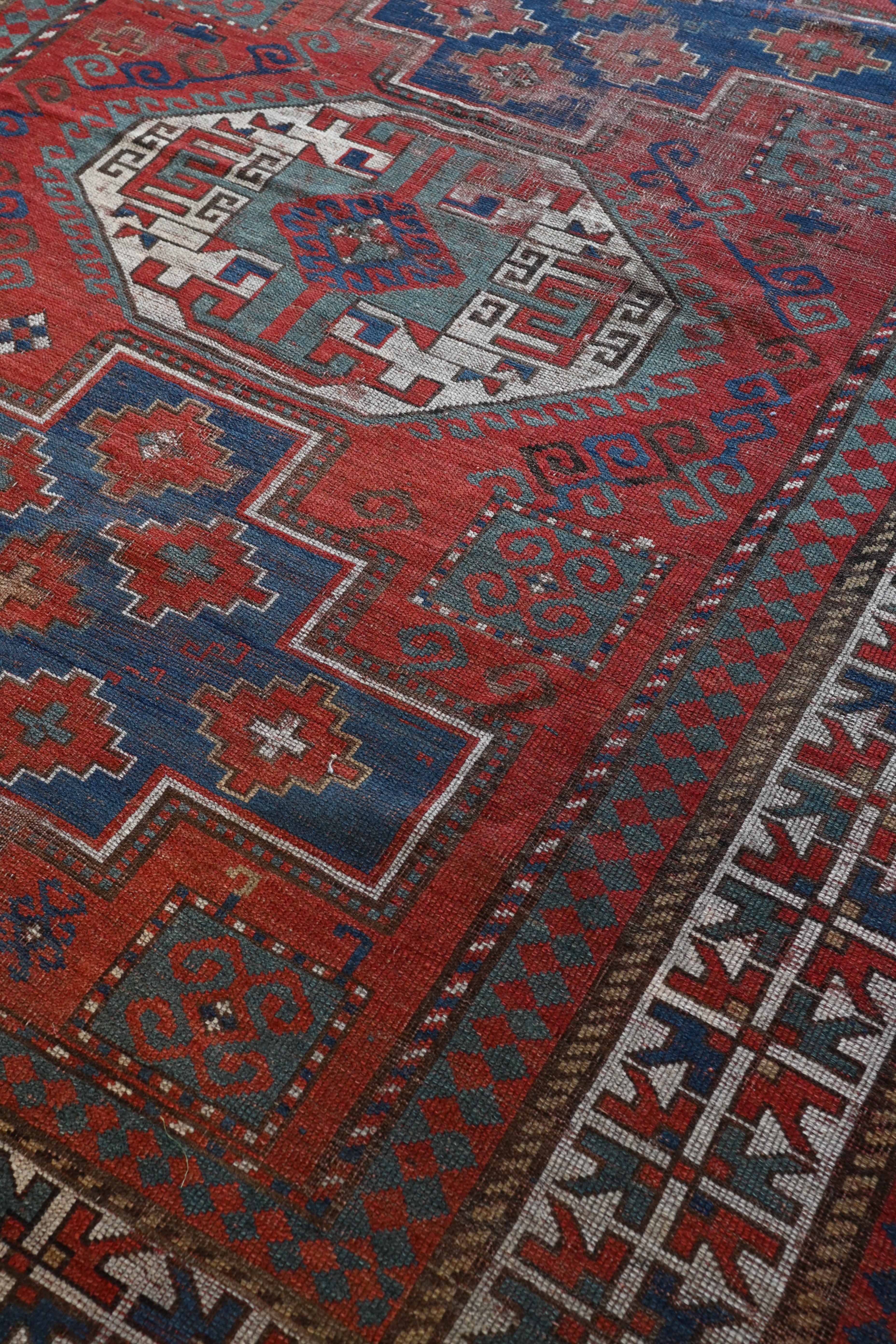 Distressed, 19th century Kazak with indigo blue, madder red, hunter green and ivory