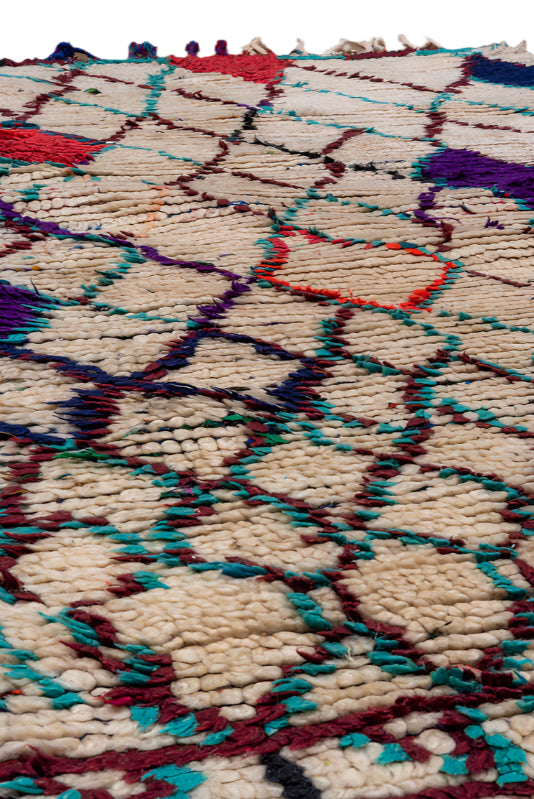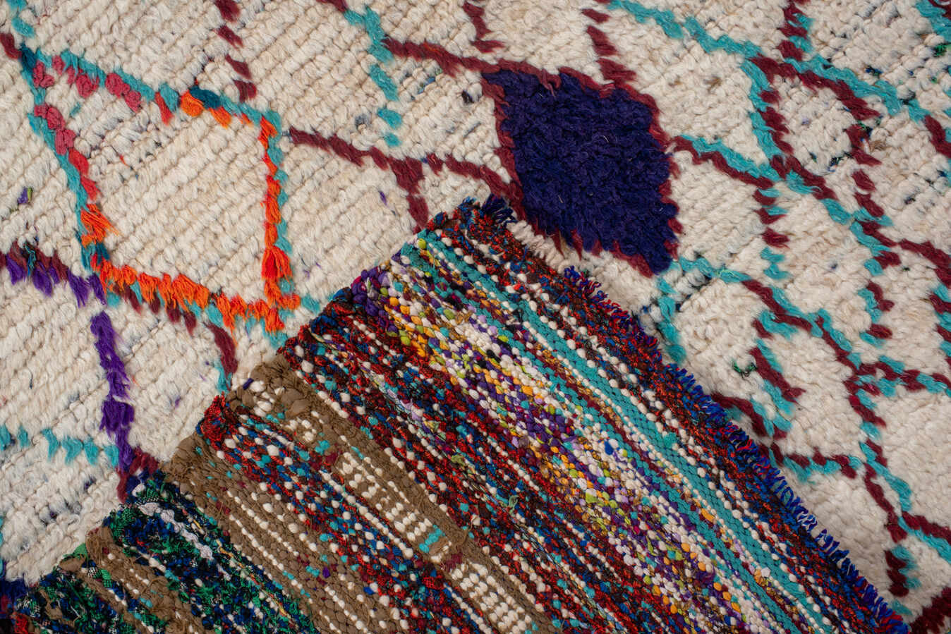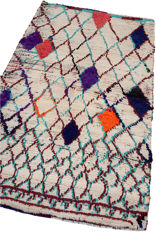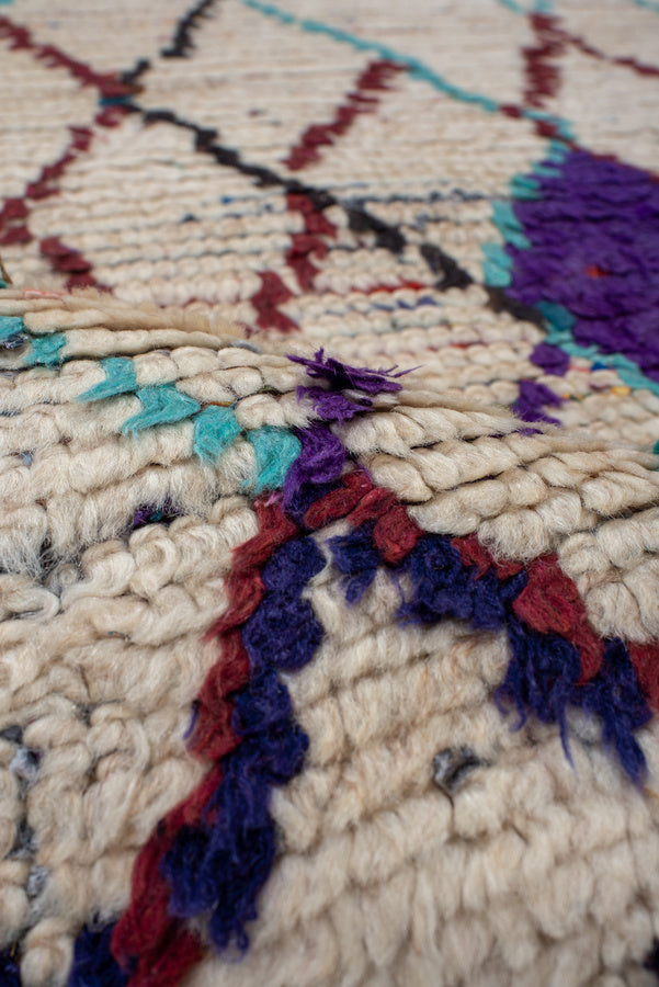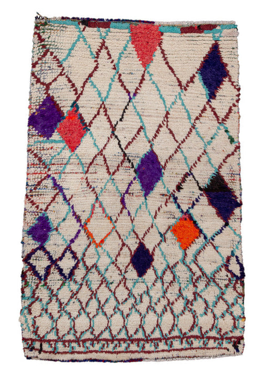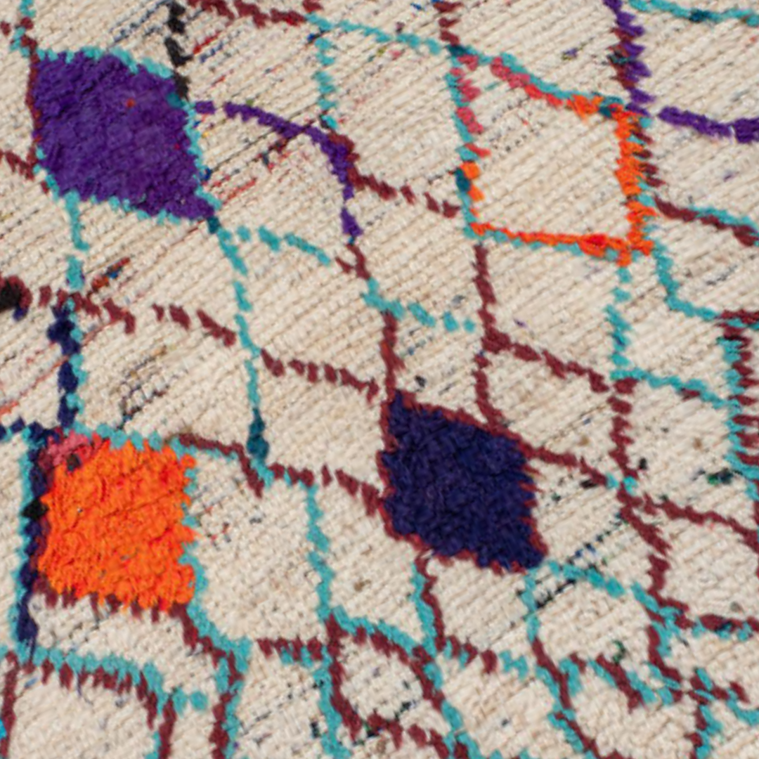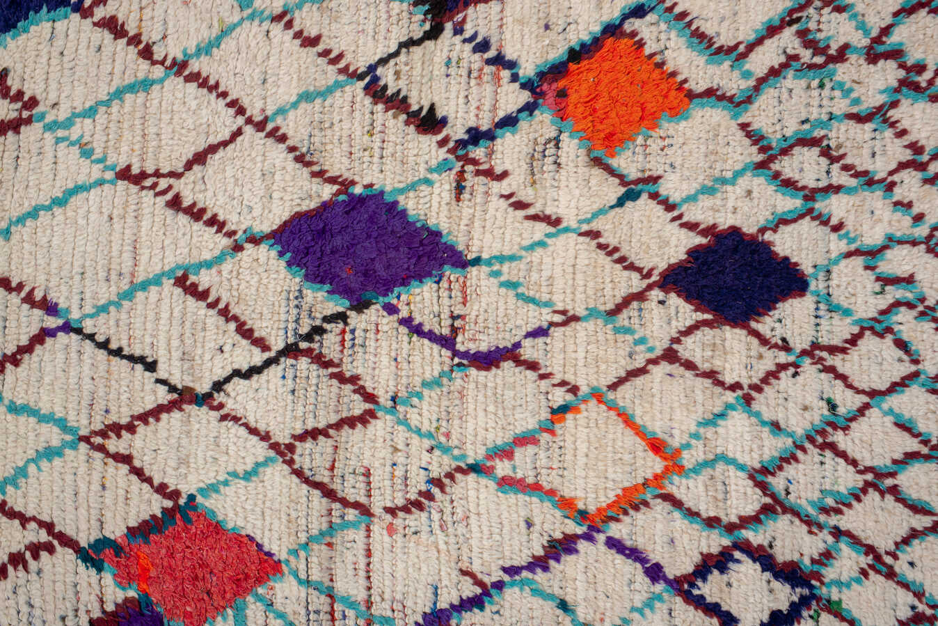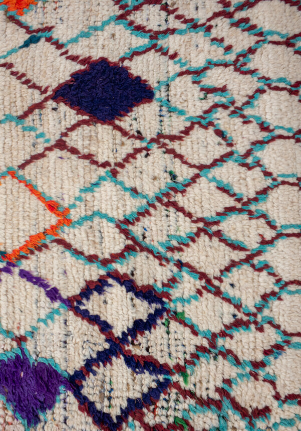 A diamond patterned Moroccan with tones of purple, orange, navy and turquoise