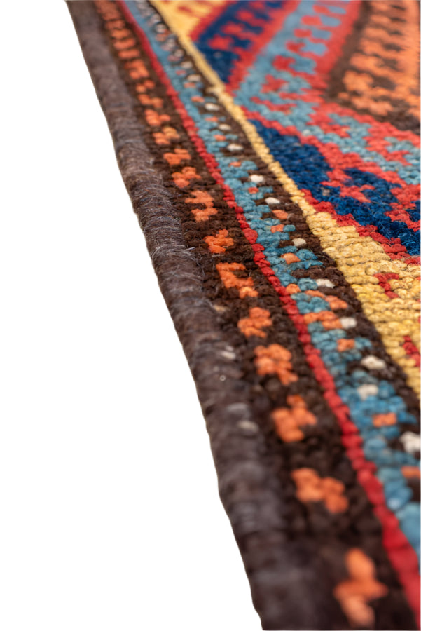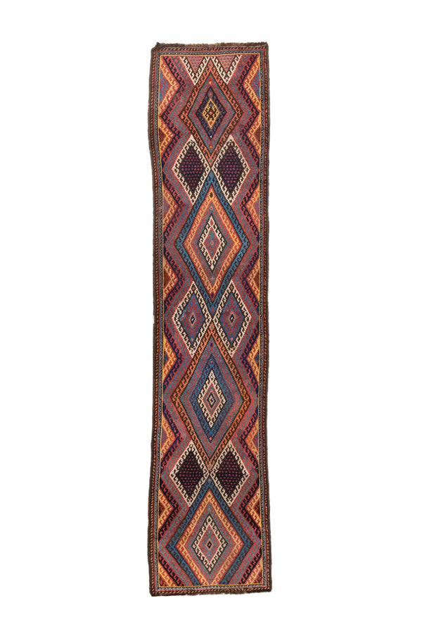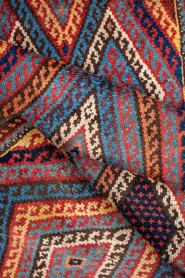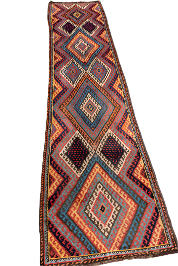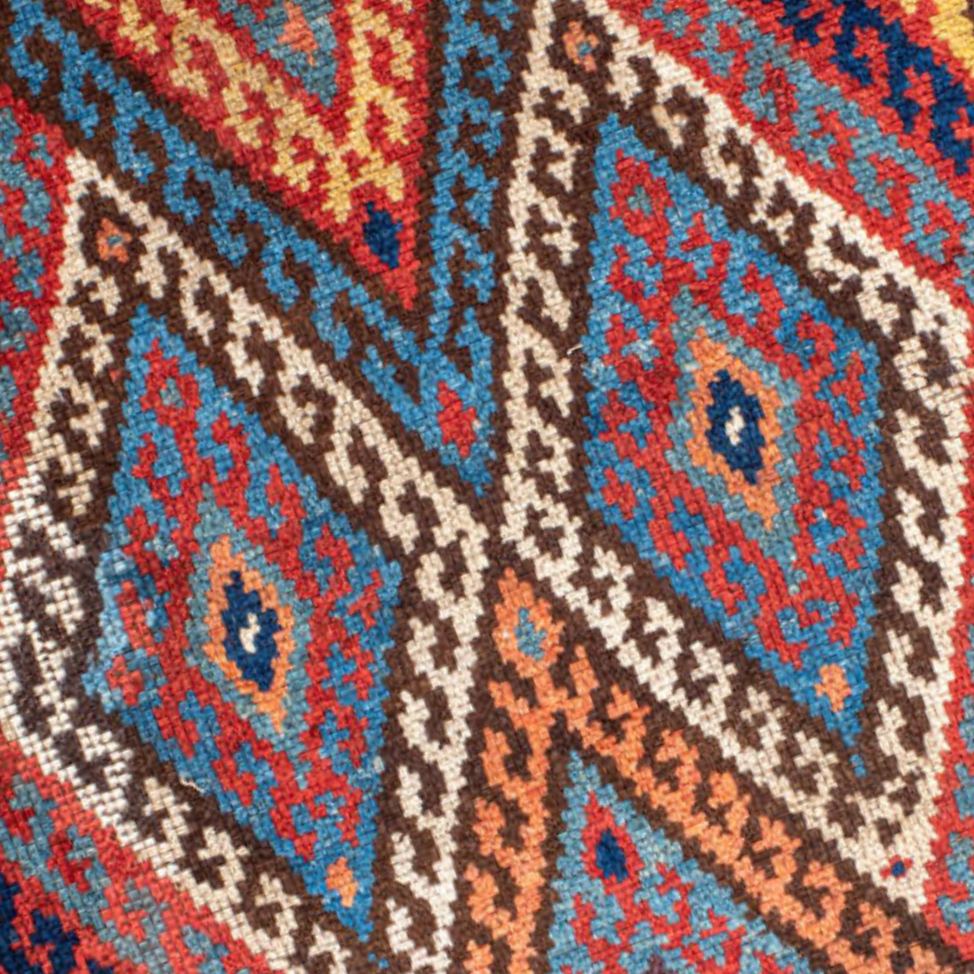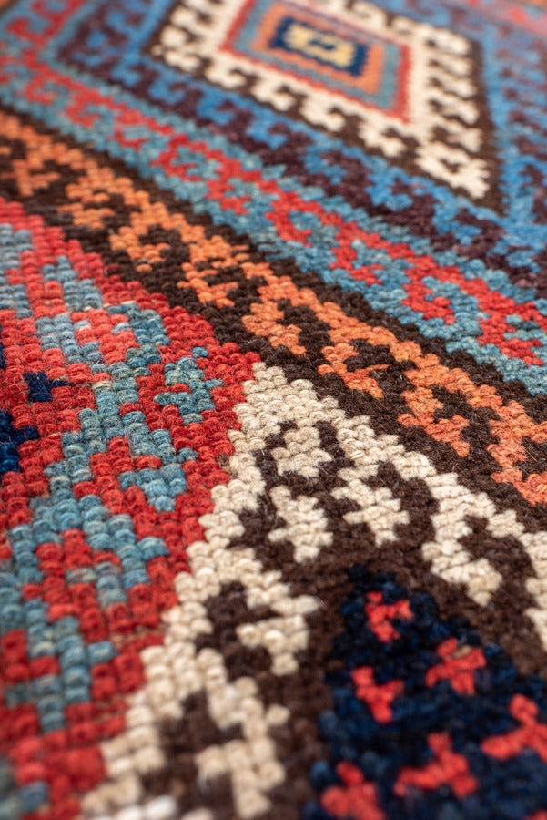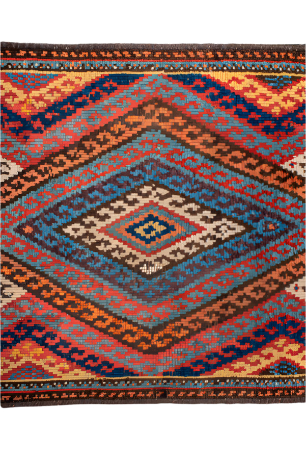 Kurdish with an intricate diamond pattern & tones of blues, orange, madder red, coral, ivory and cocoa brown