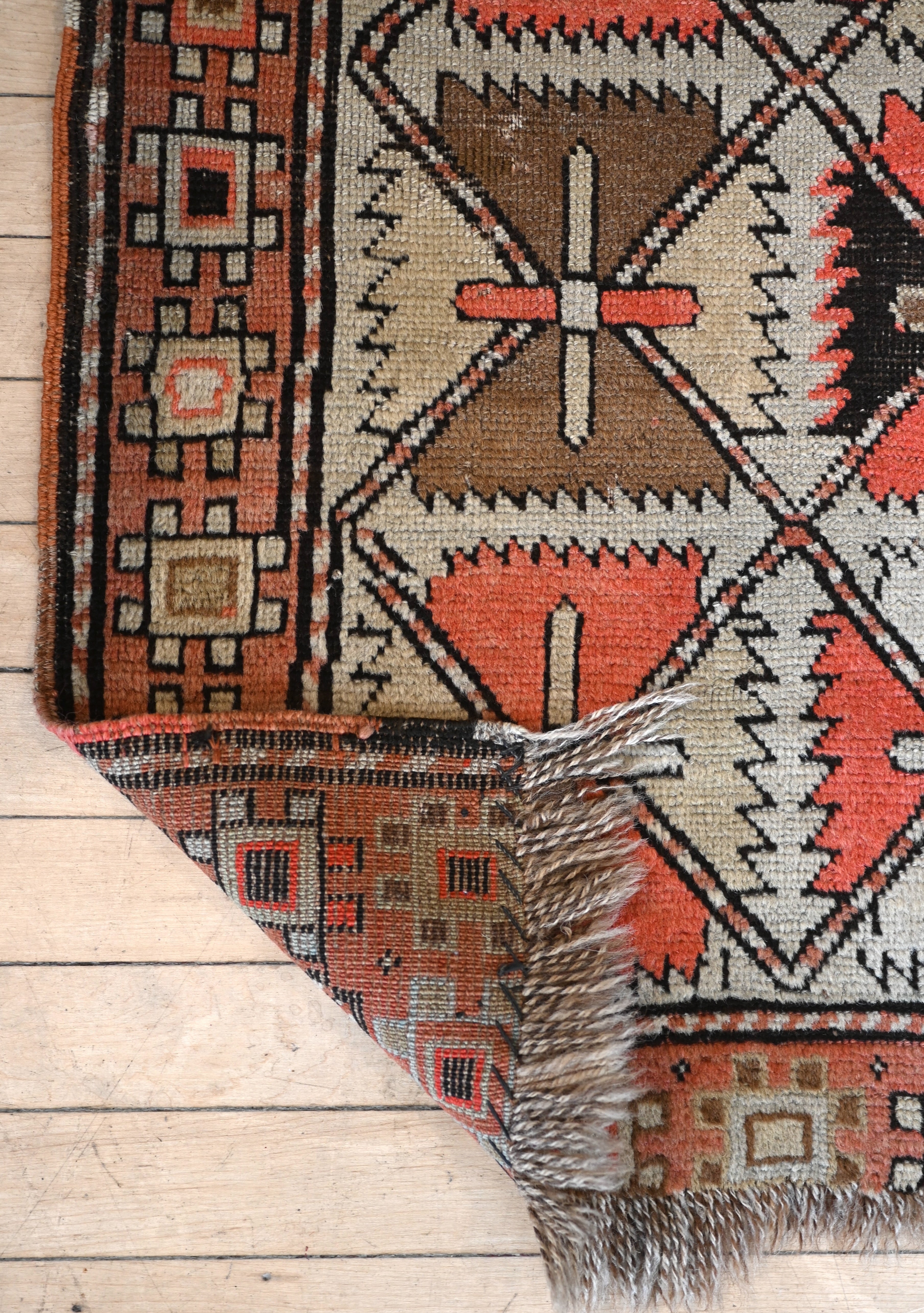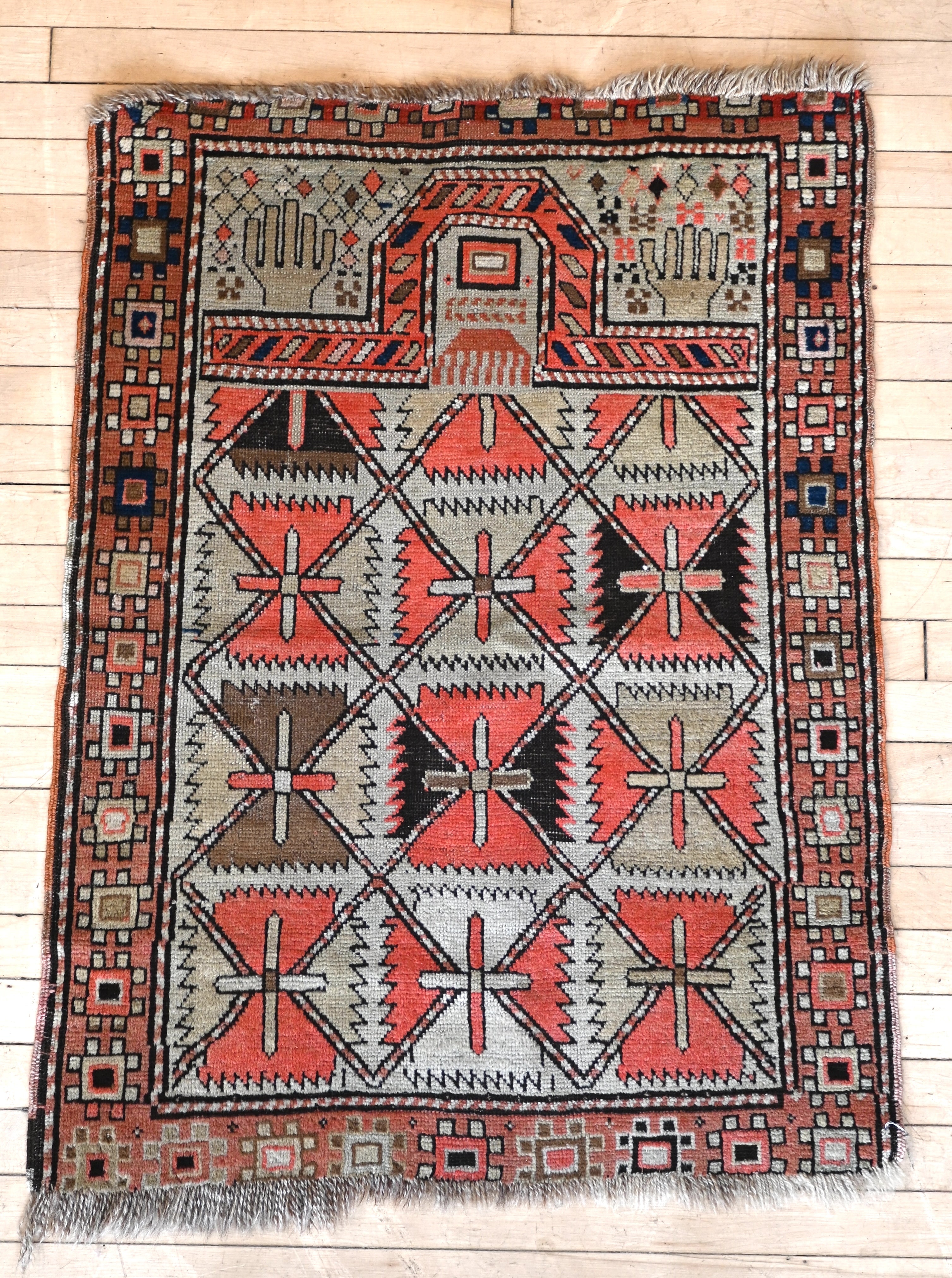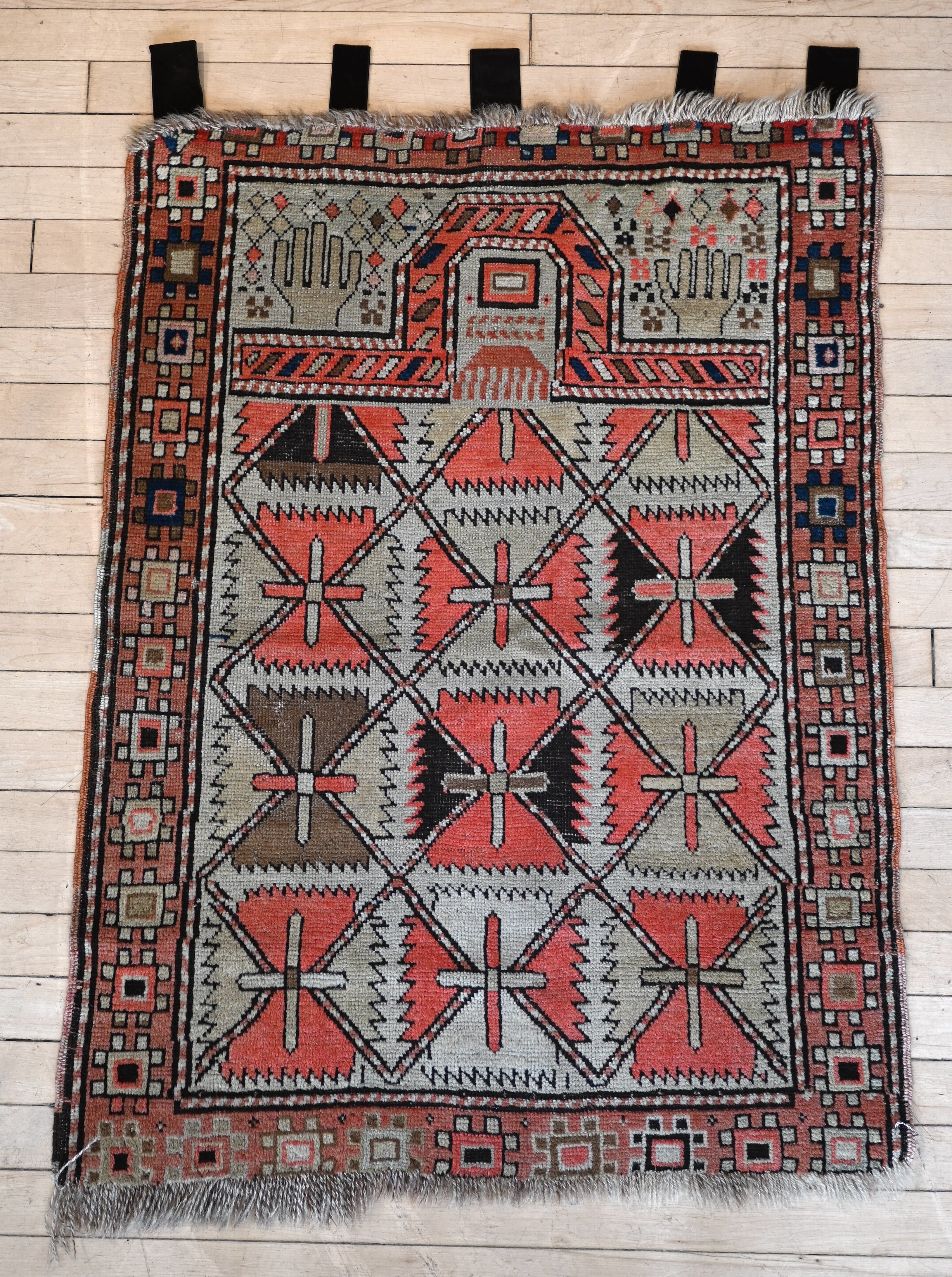 a prayer rug with coral, khaki, camel, ivory and cocoa