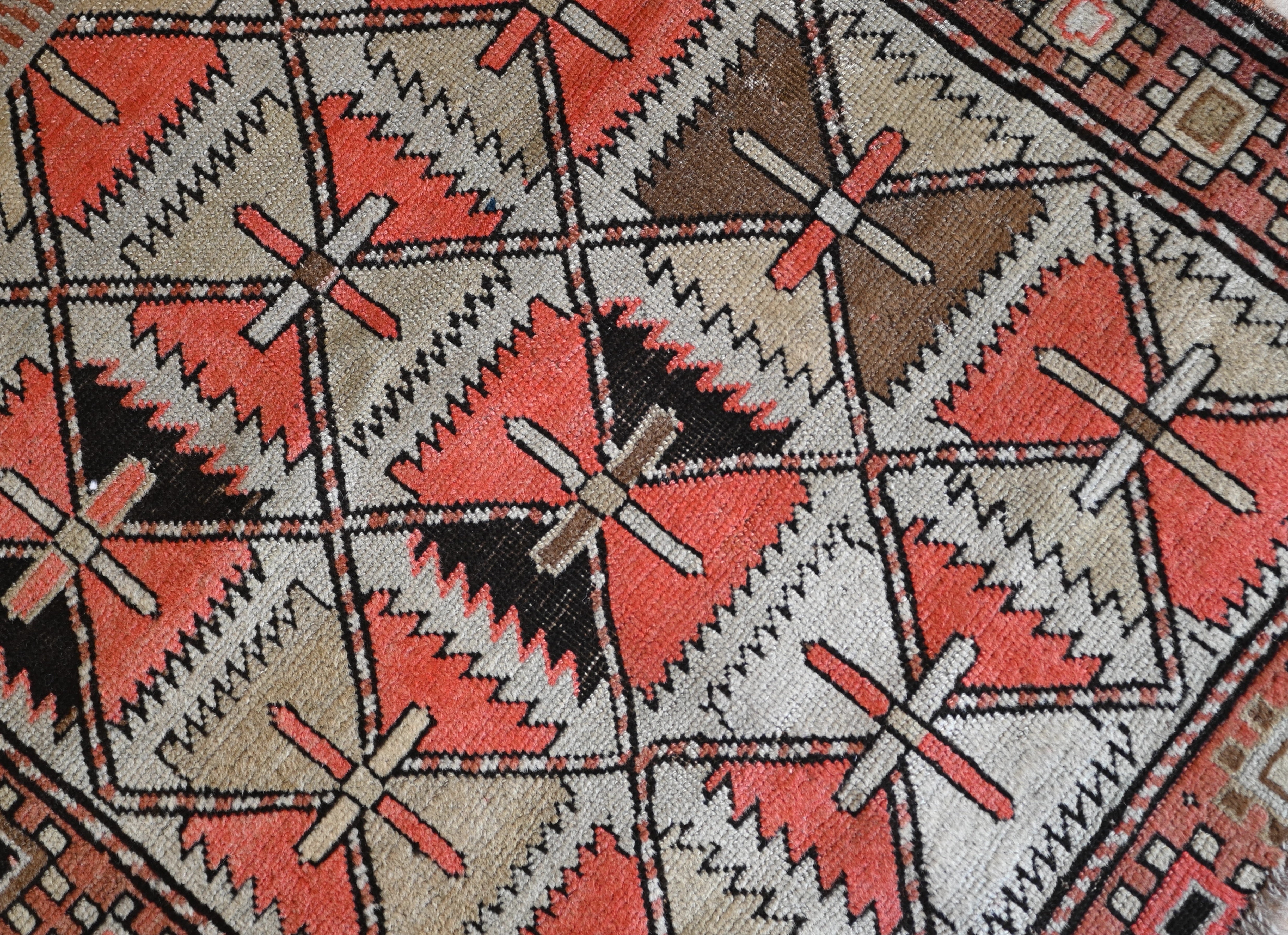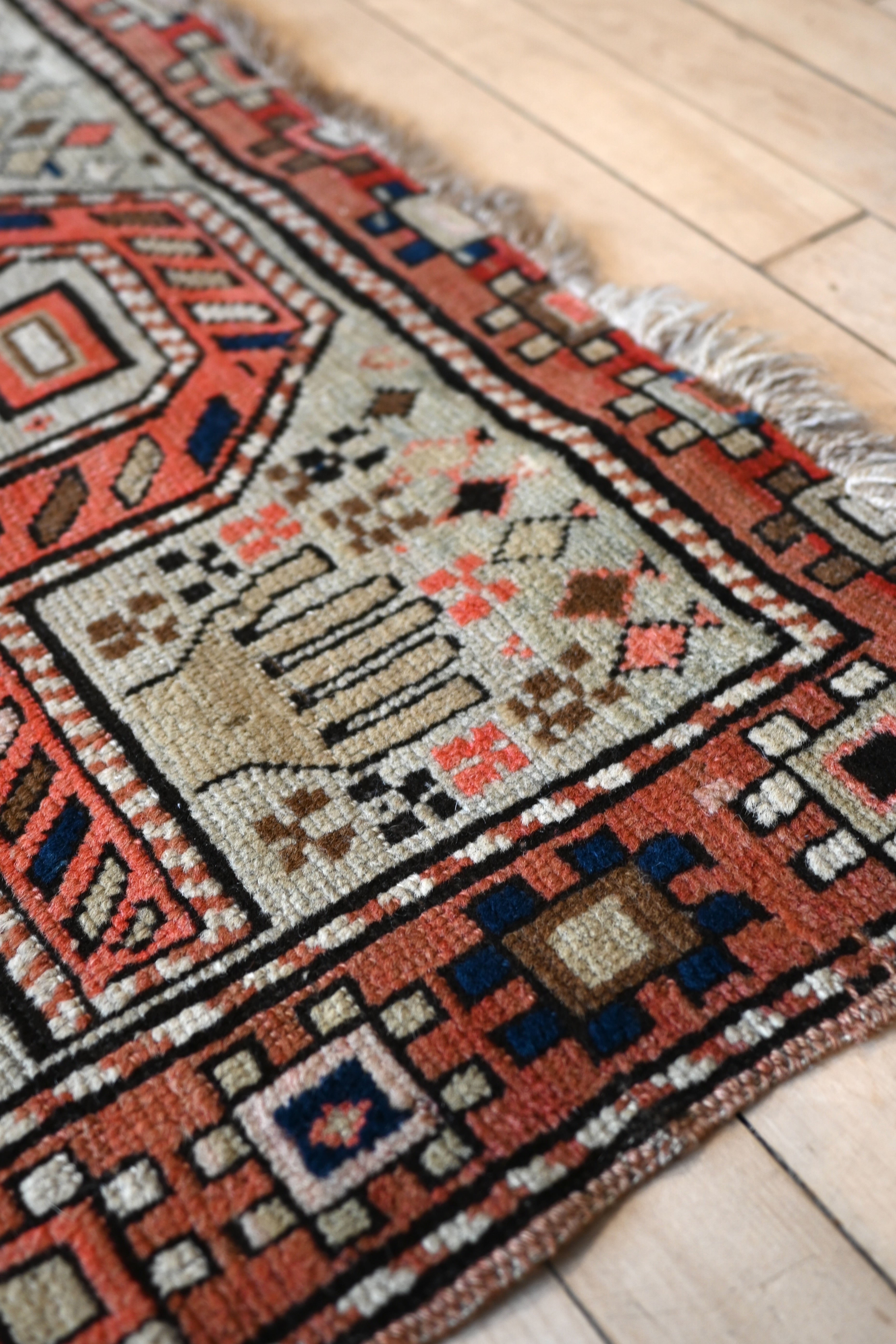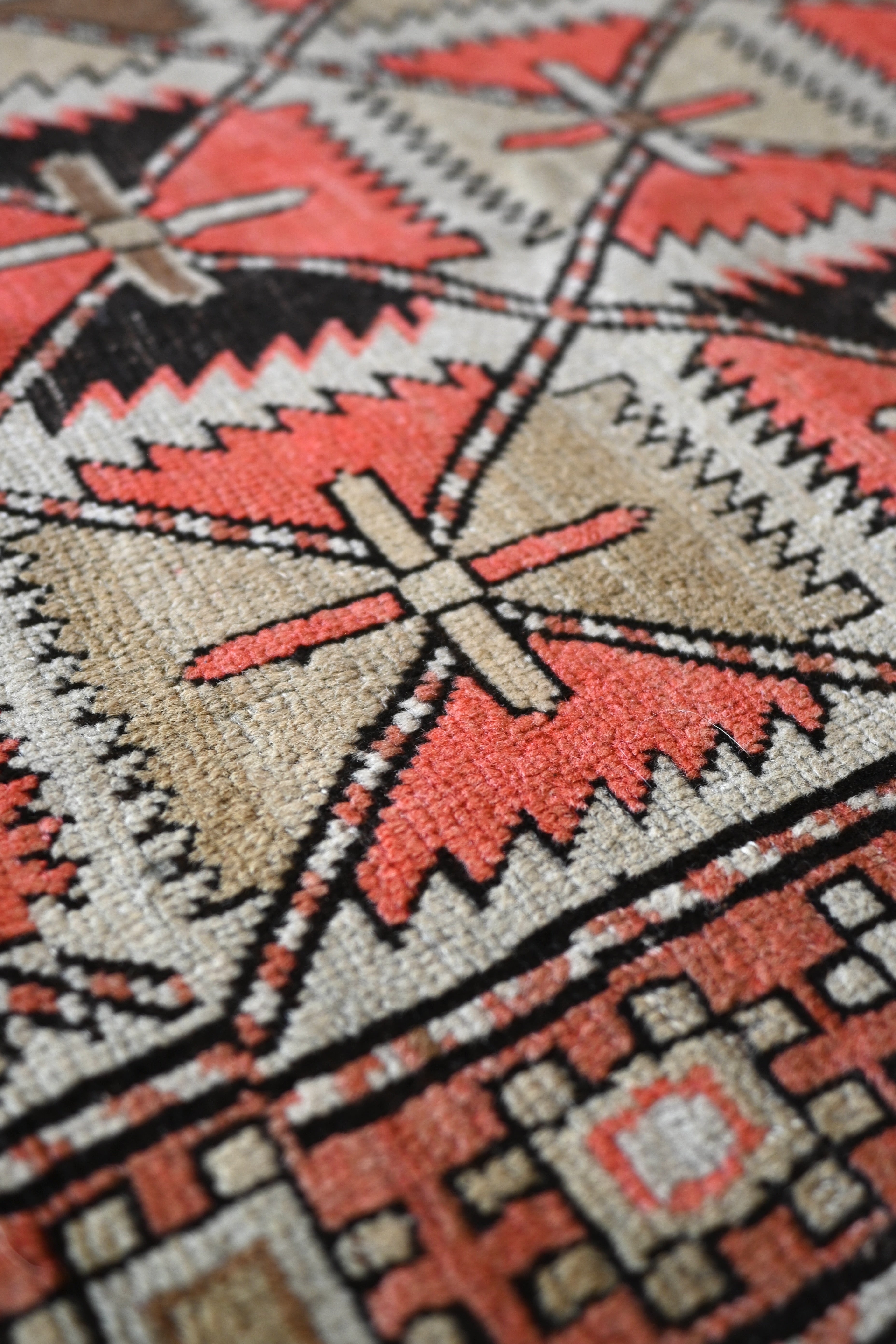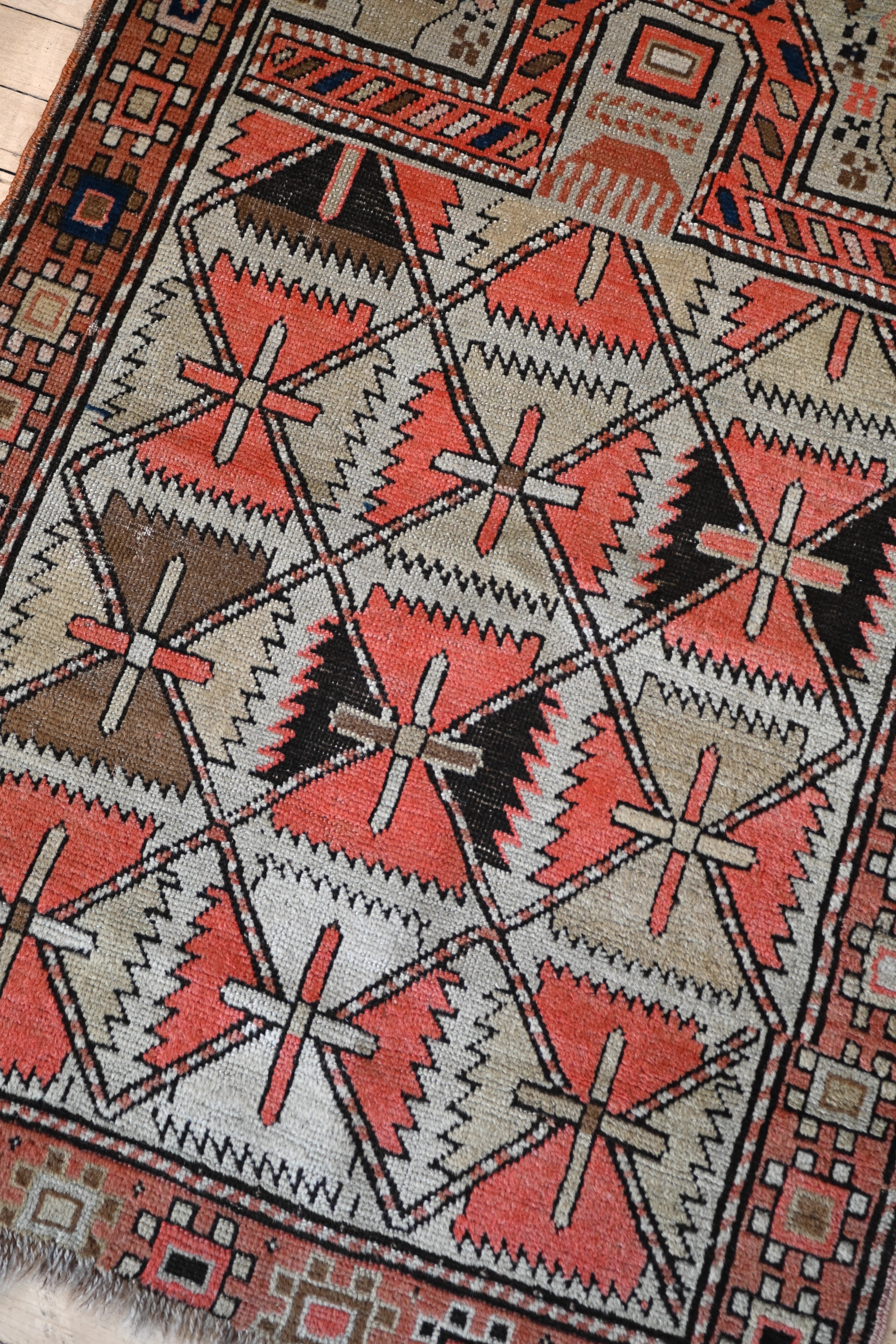 a prayer rug with coral, khaki, camel, ivory and cocoa