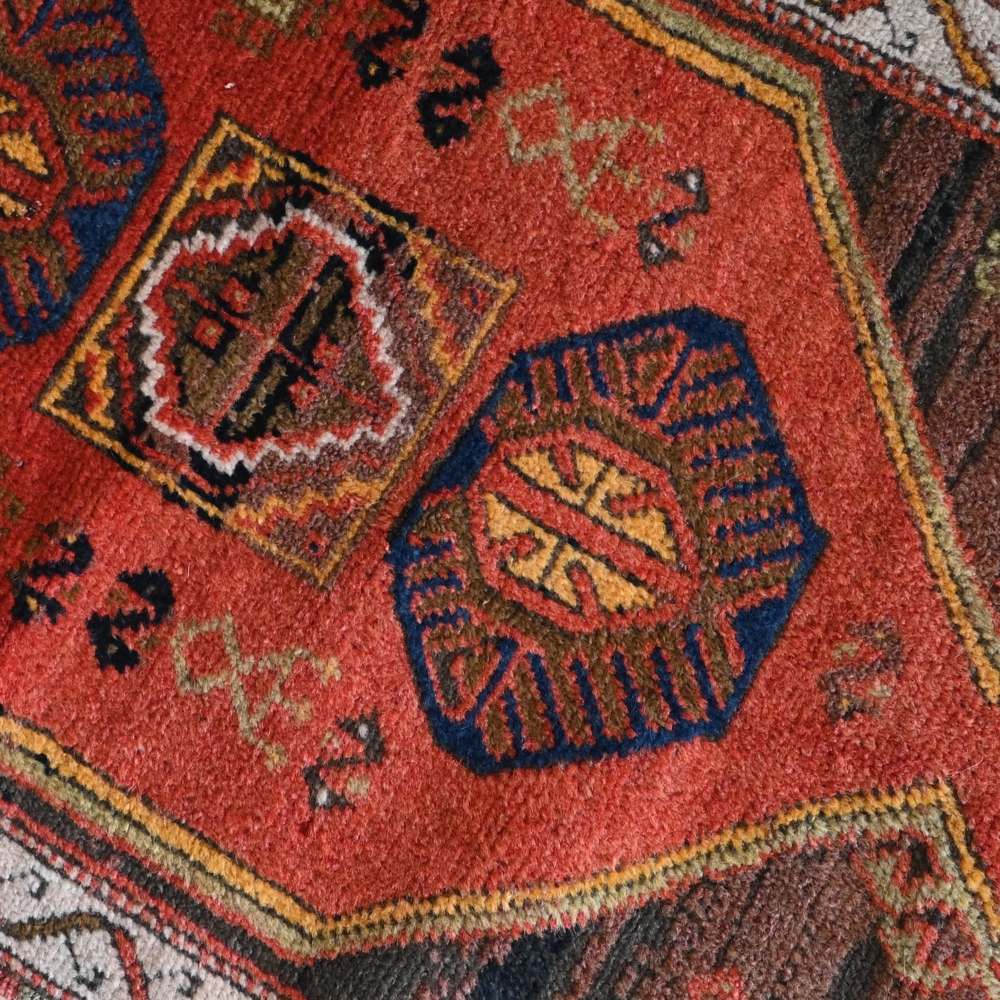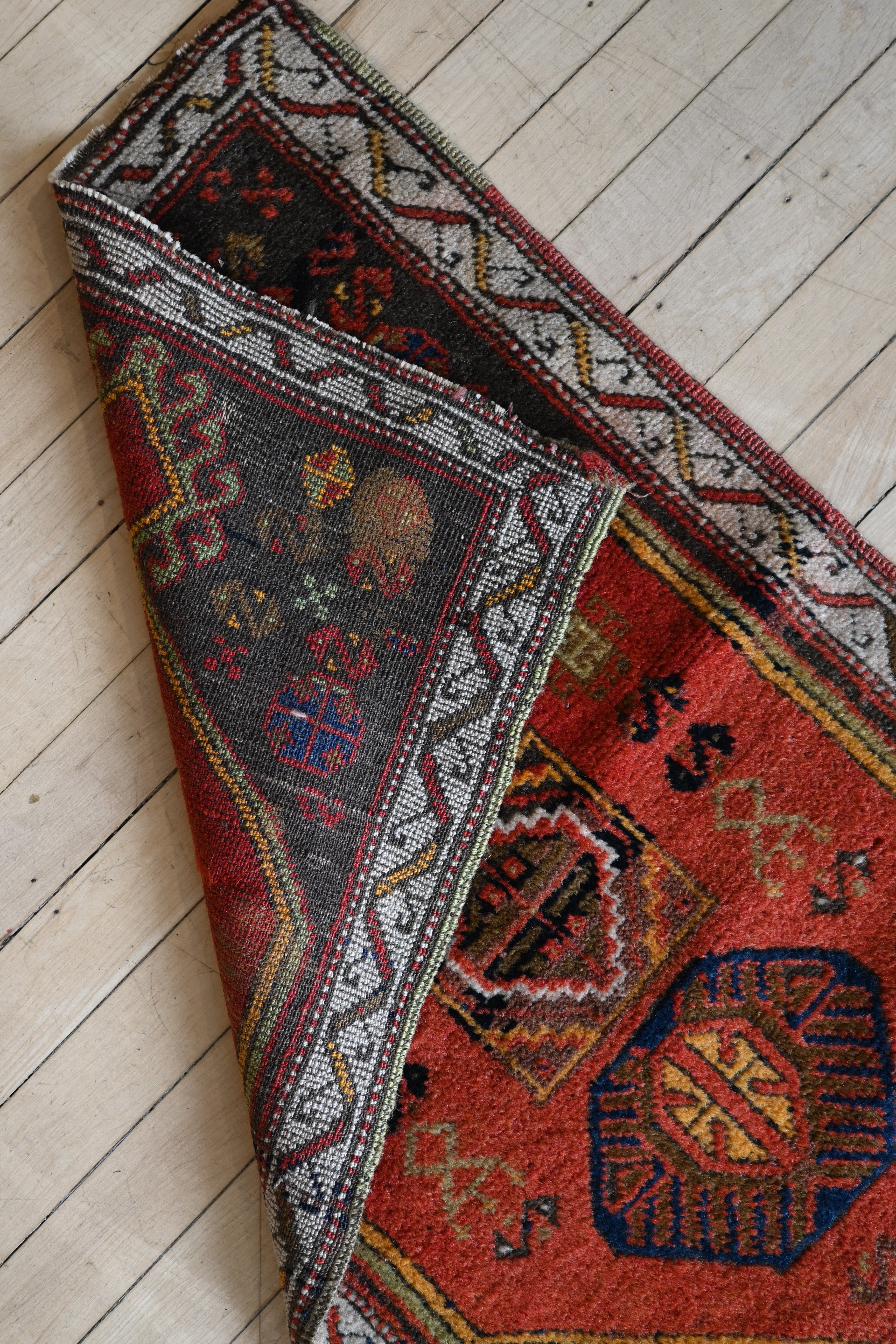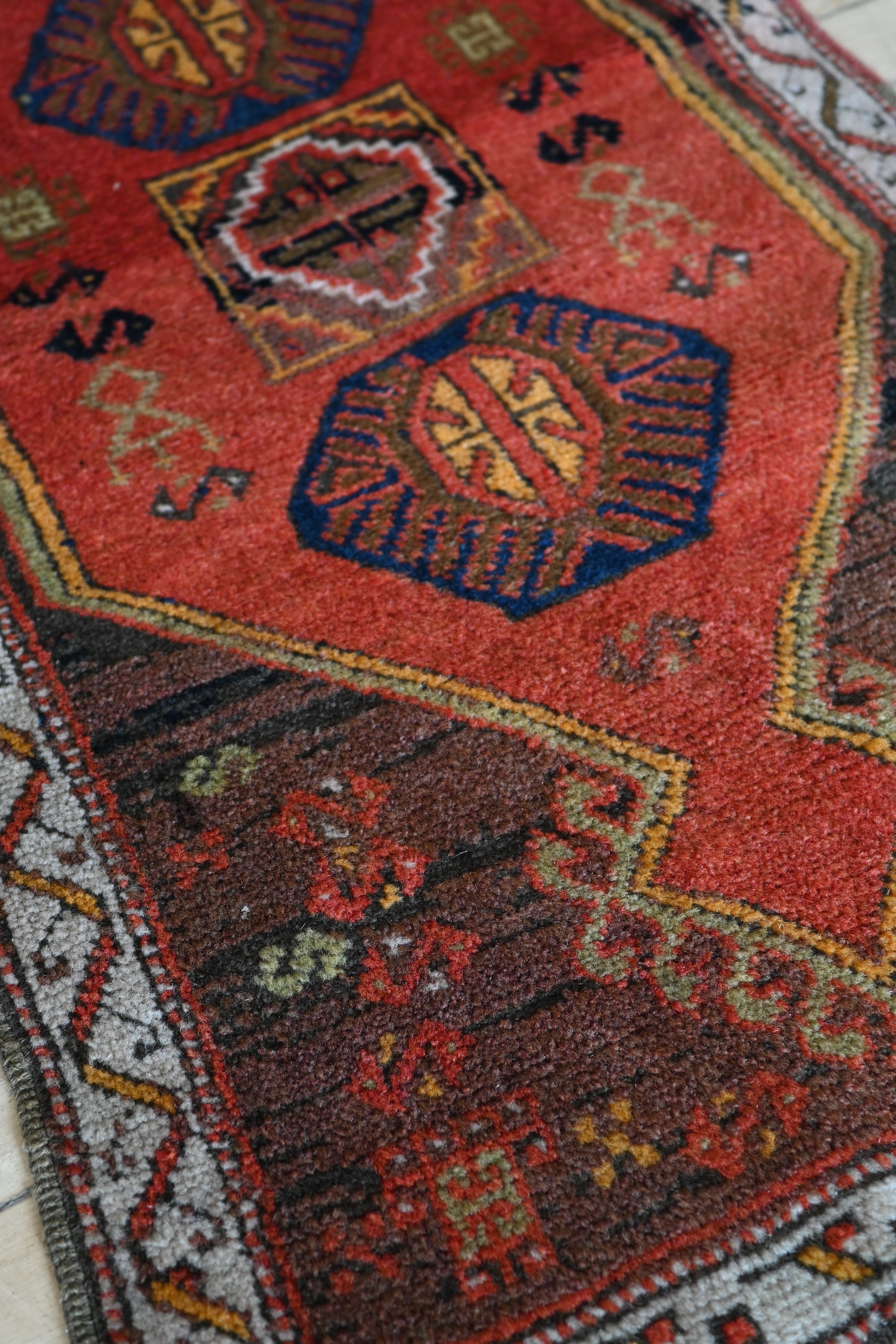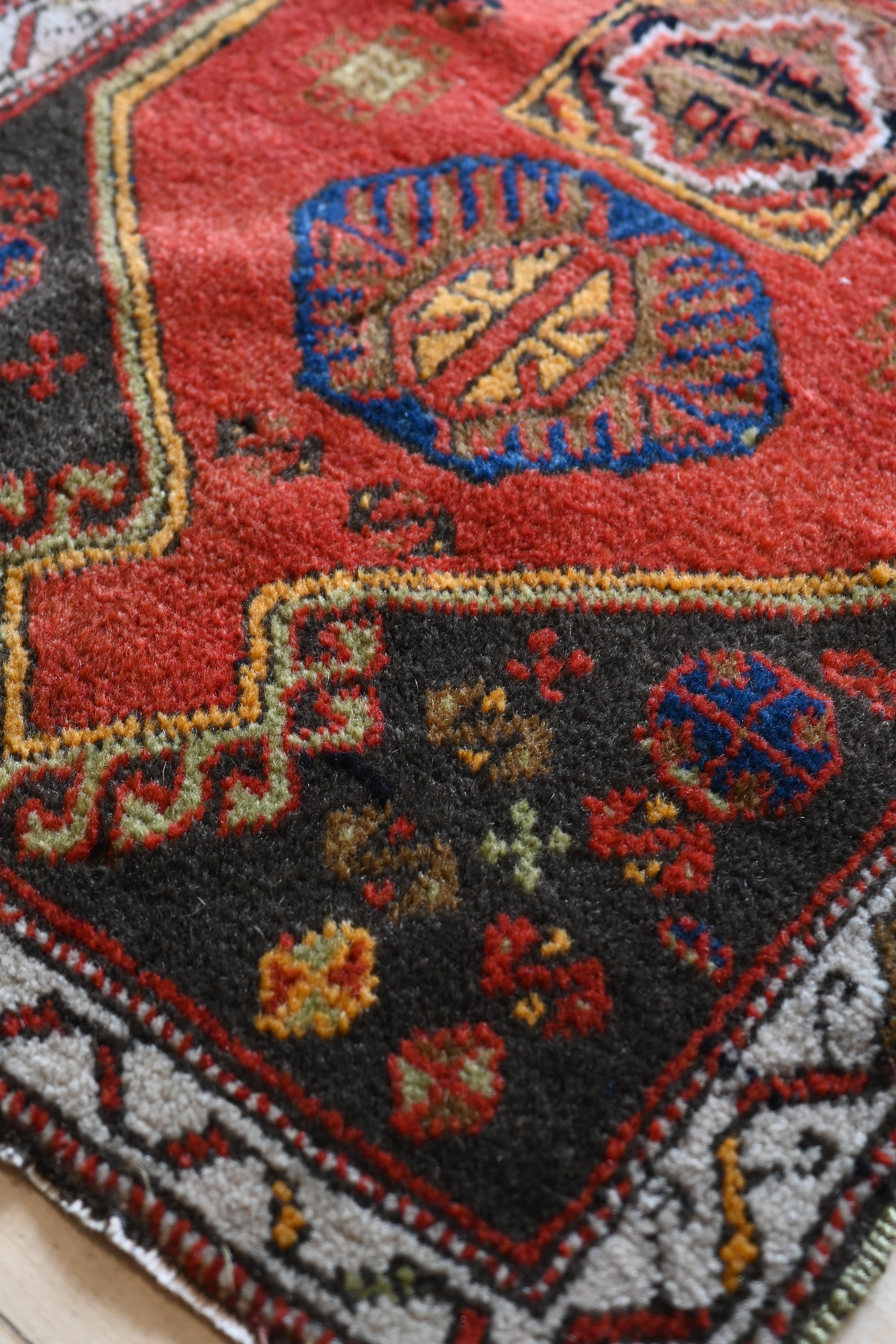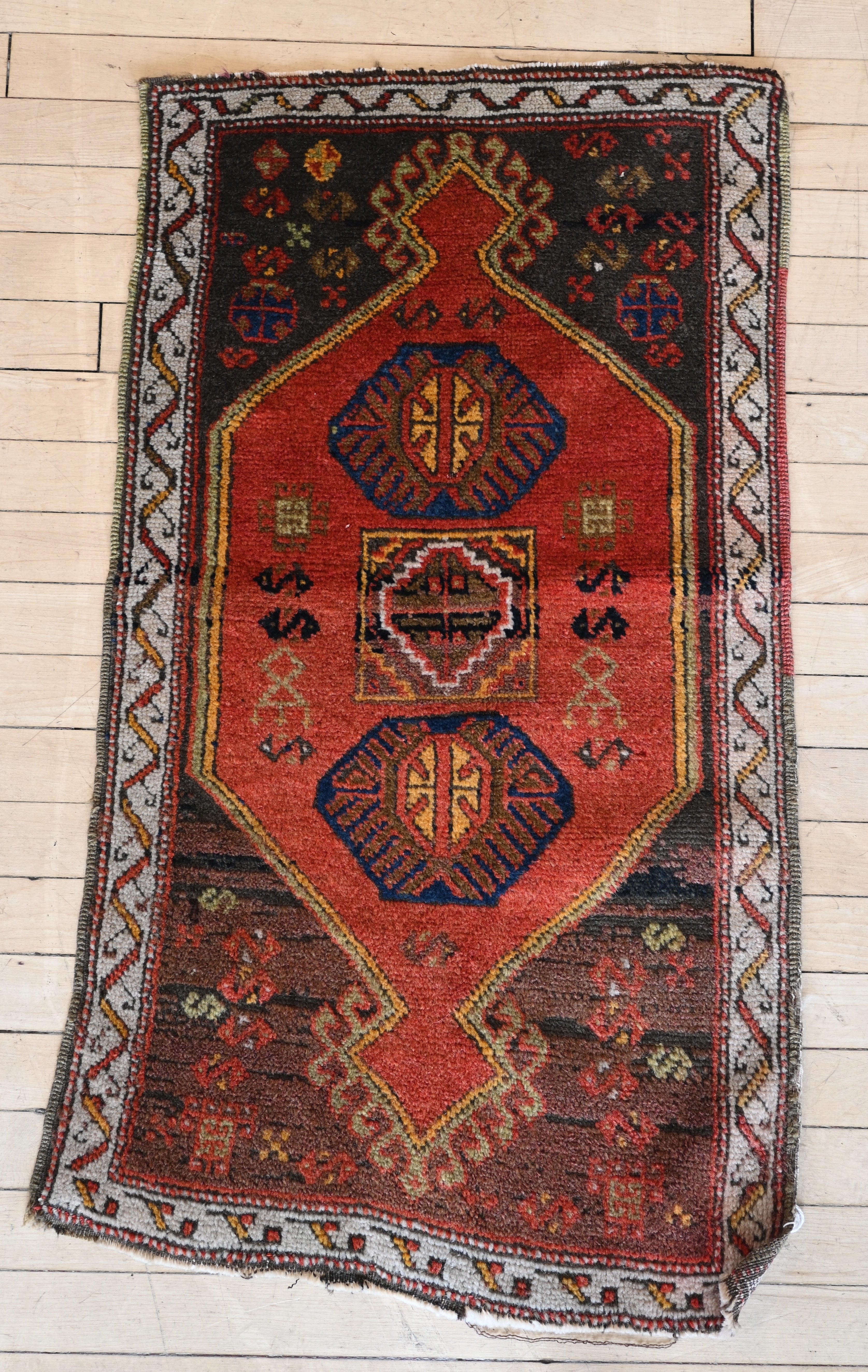 a turkish mat with tones of chocolate, orange, navy, lime and ivory