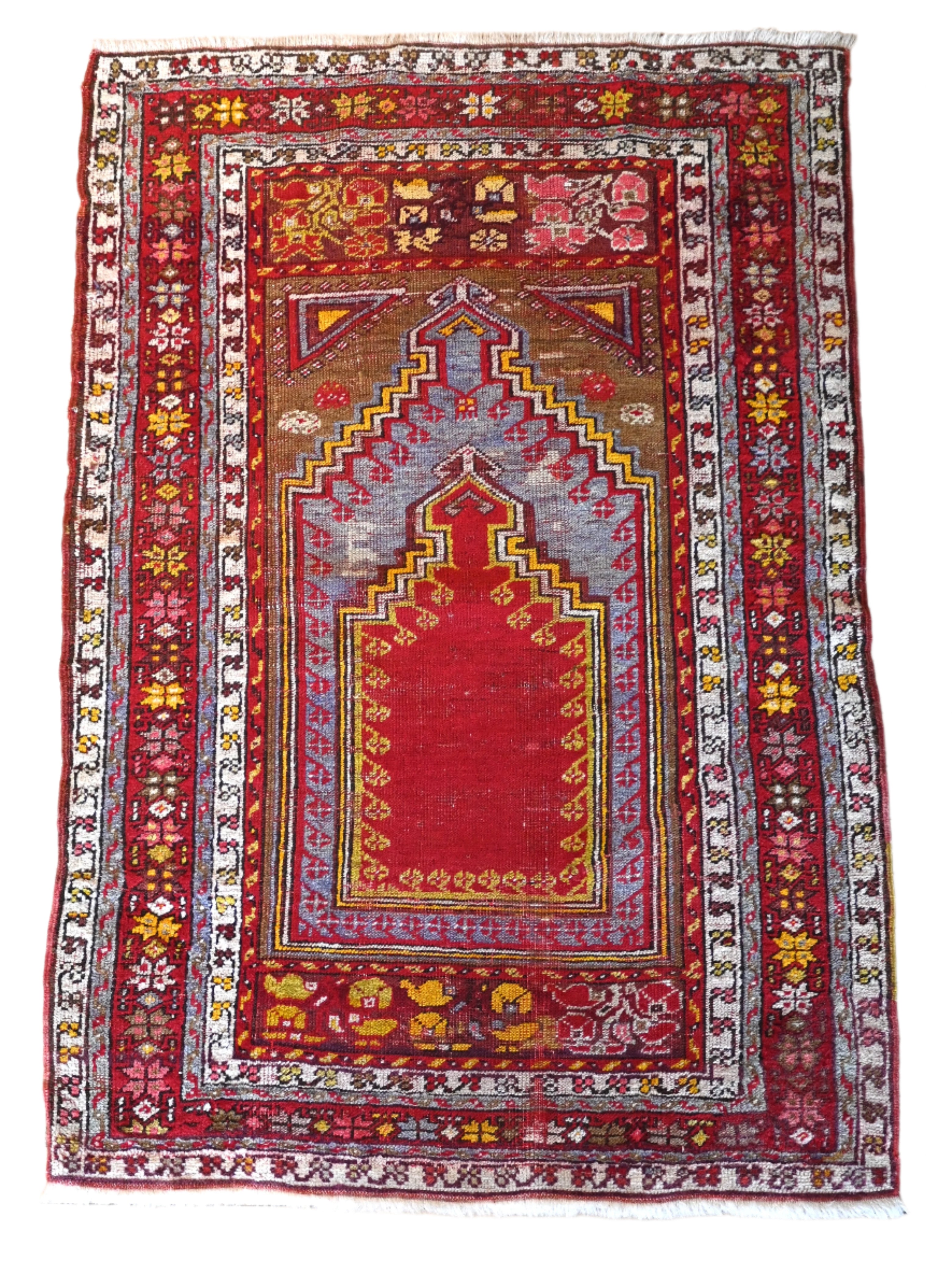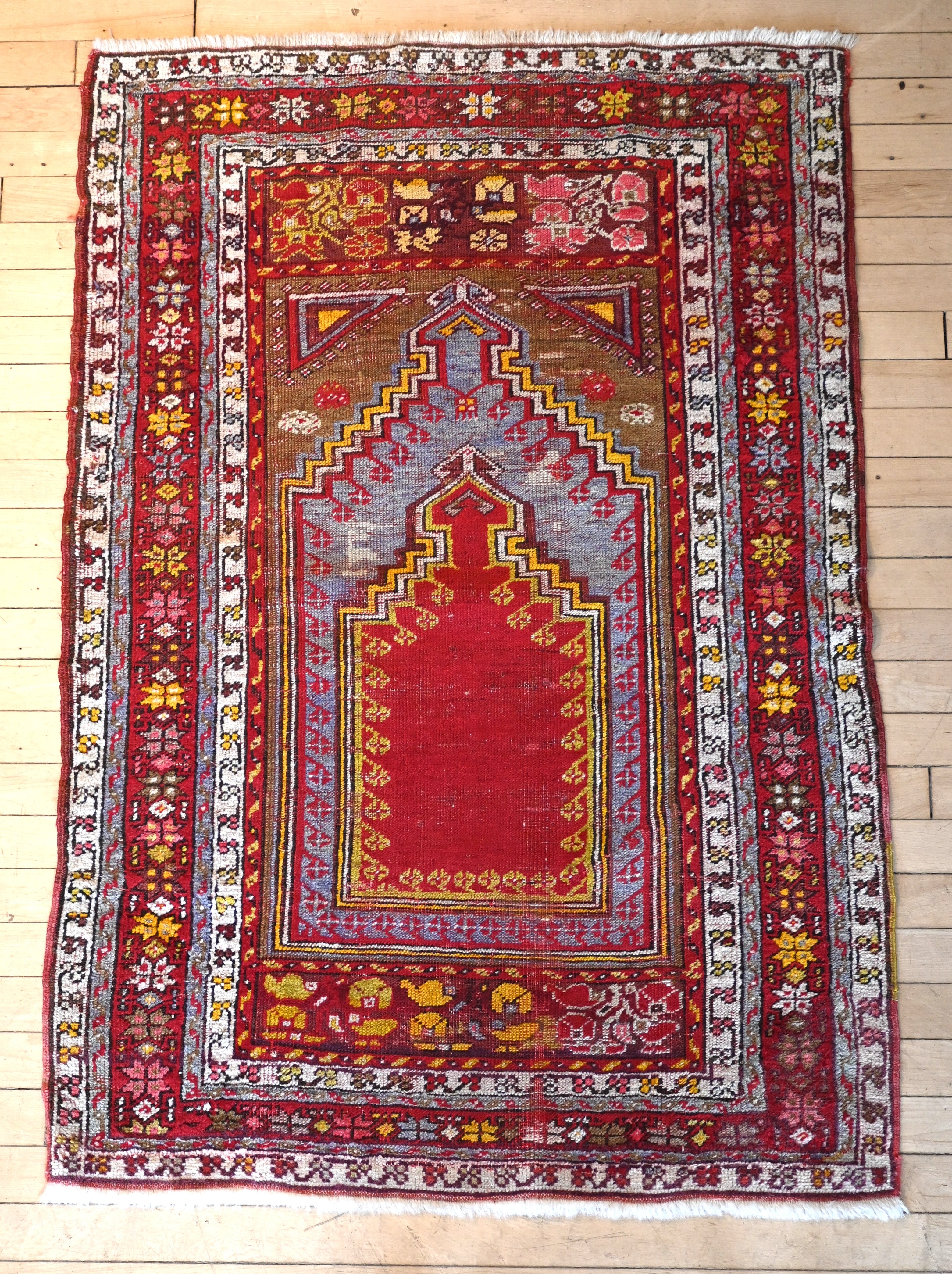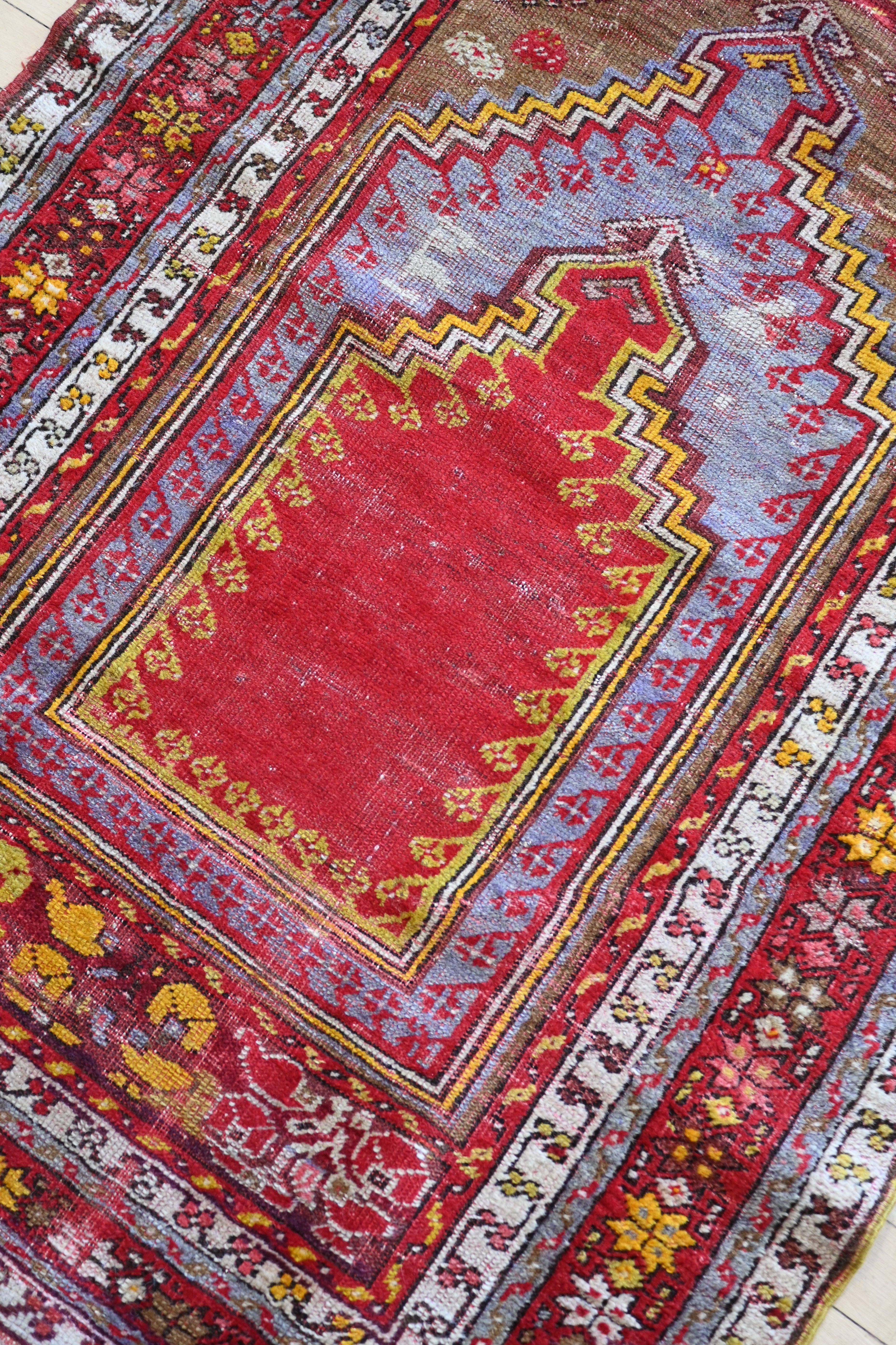 Antique Turkish prayer rug with fuchsia, soft blue, yellow and camel