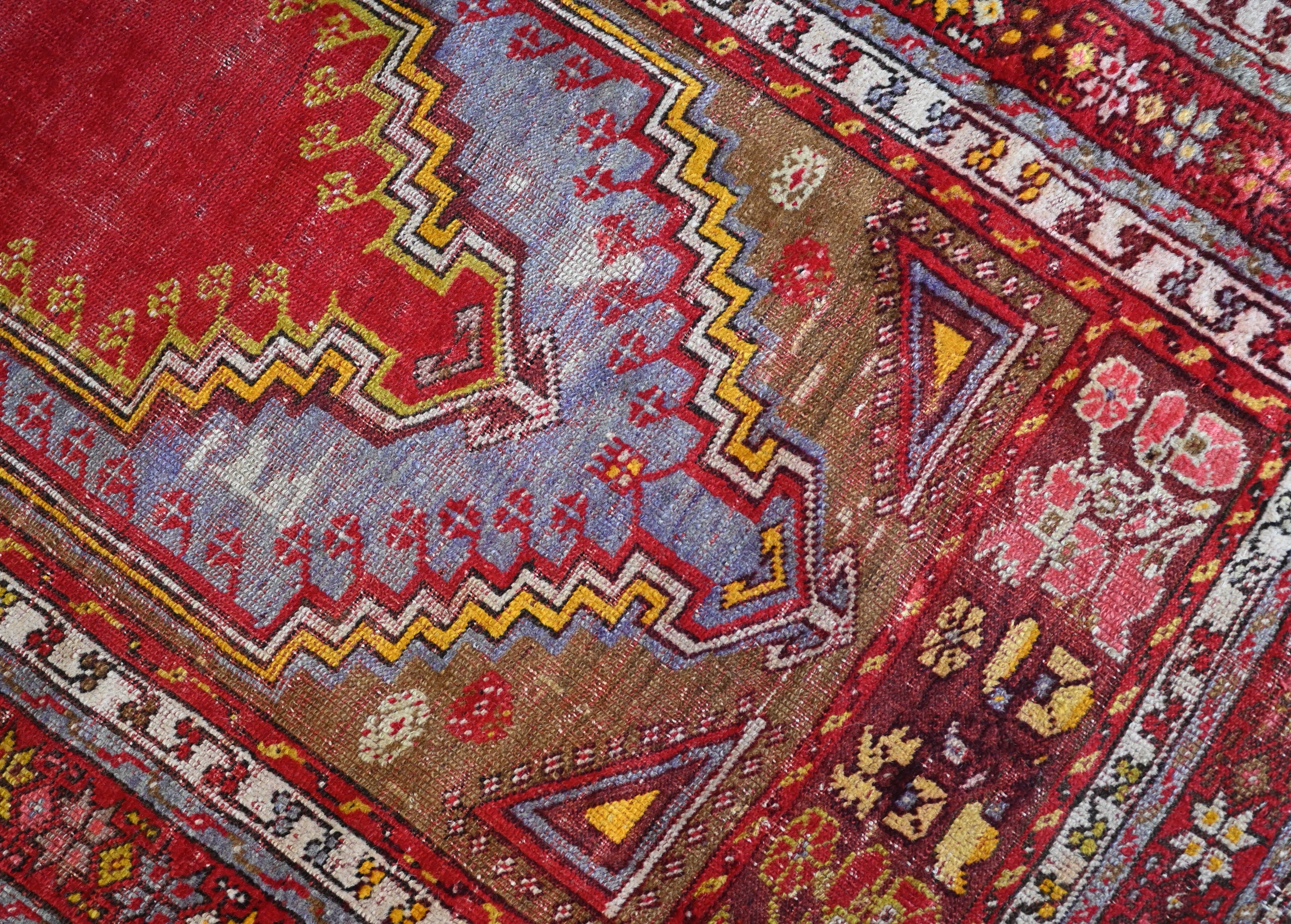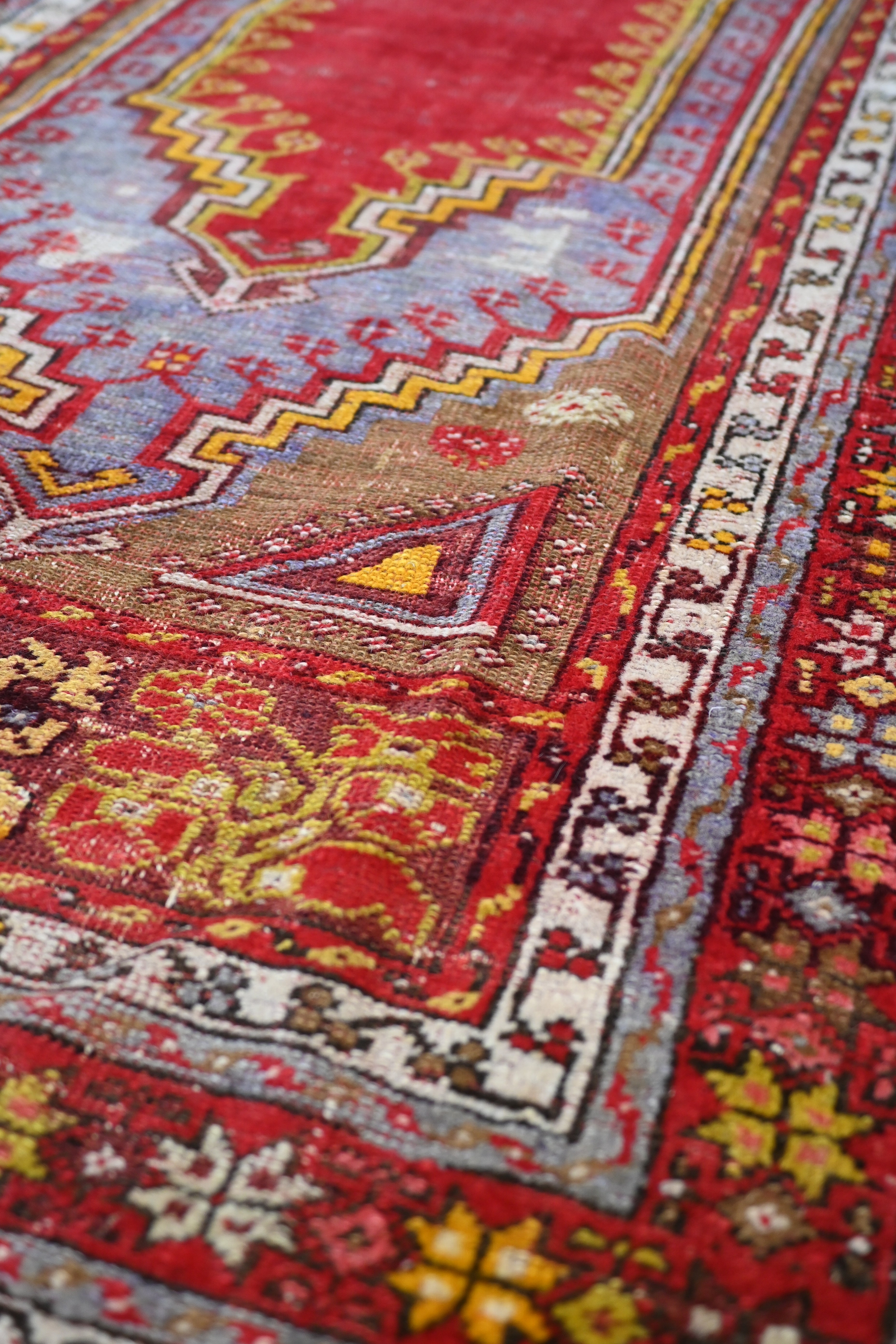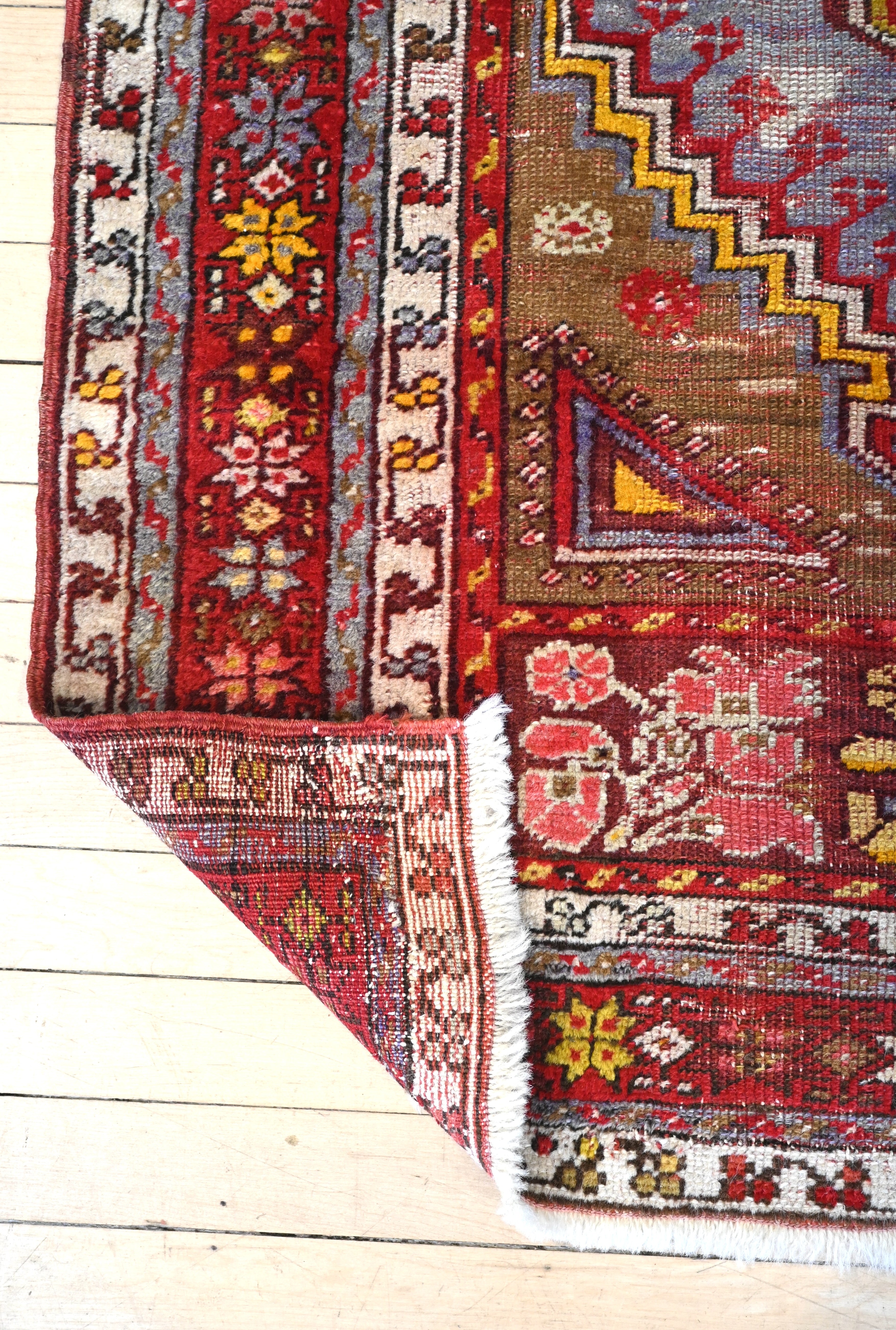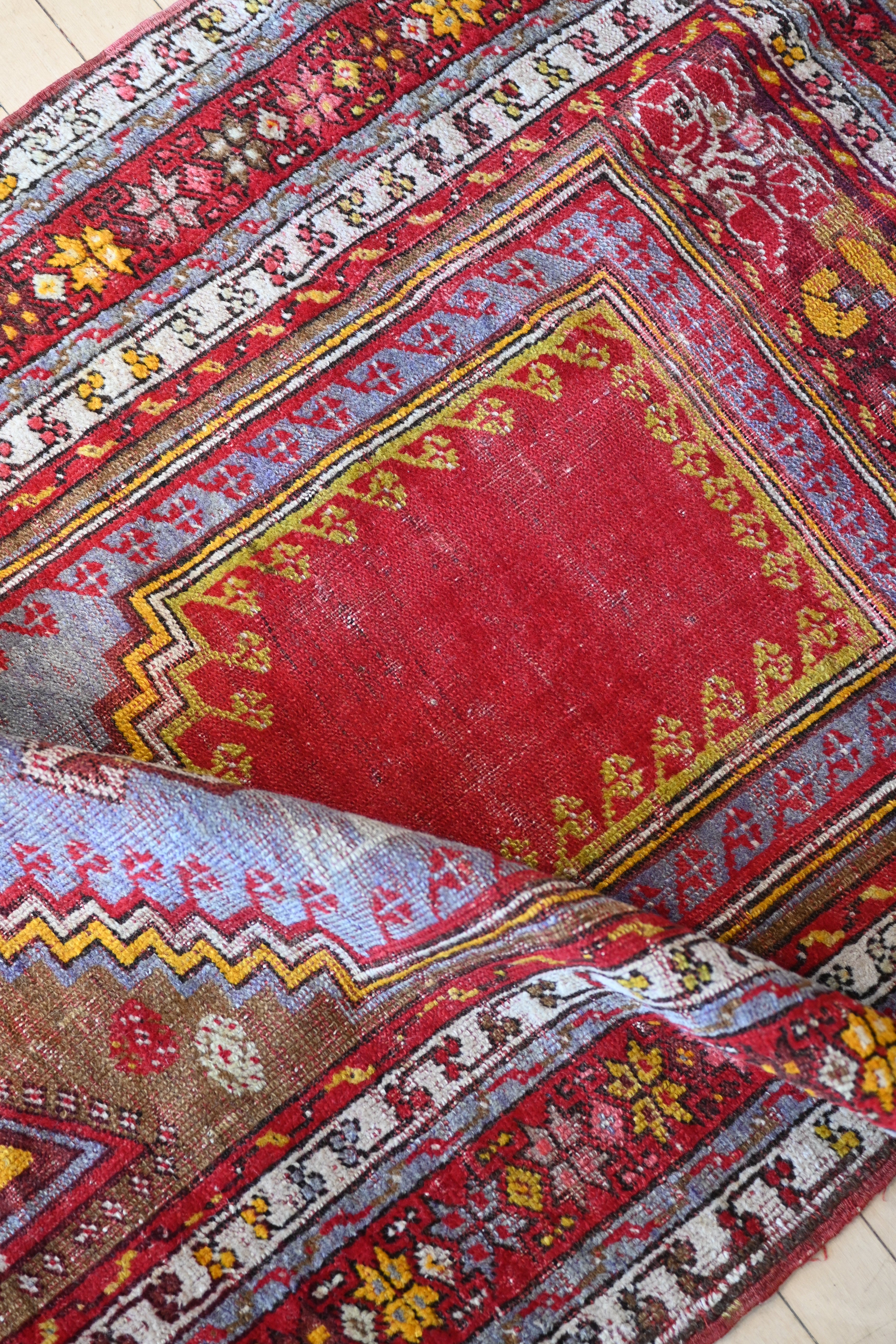 Antique Turkish prayer rug with fuchsia, soft blue, yellow and camel