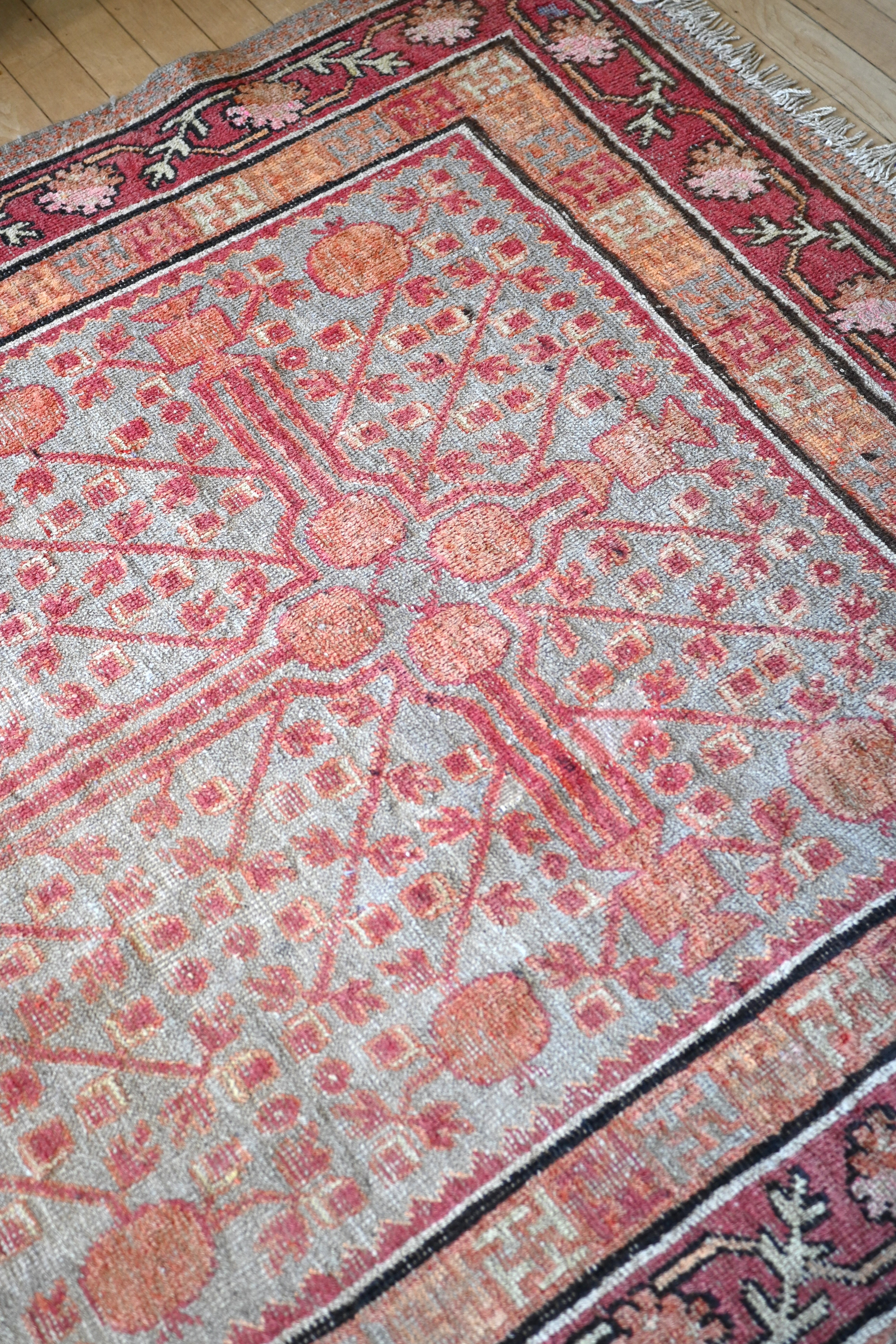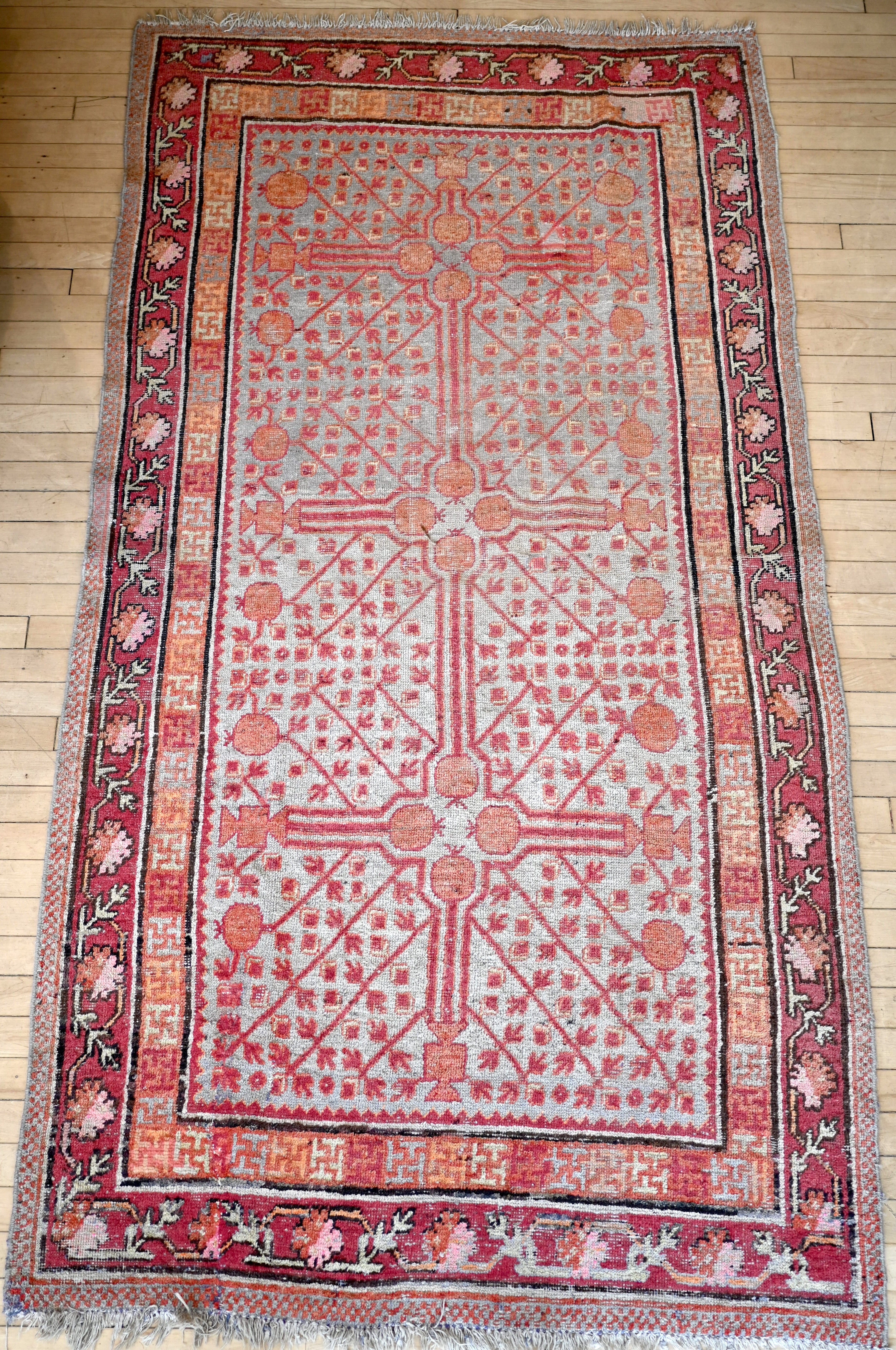 Antique Khotan with a soft blue field, pink, tangerine and chocolate brown