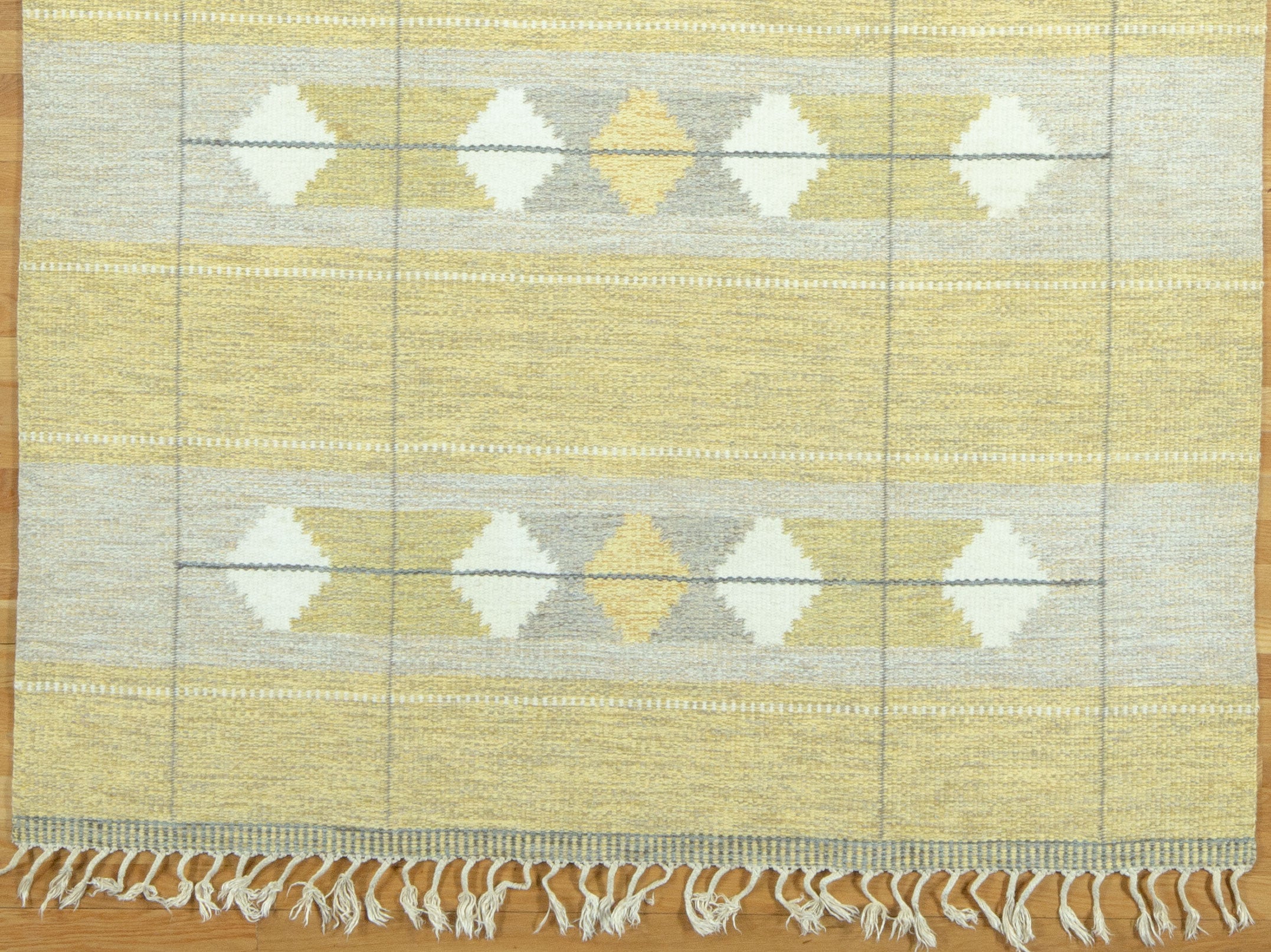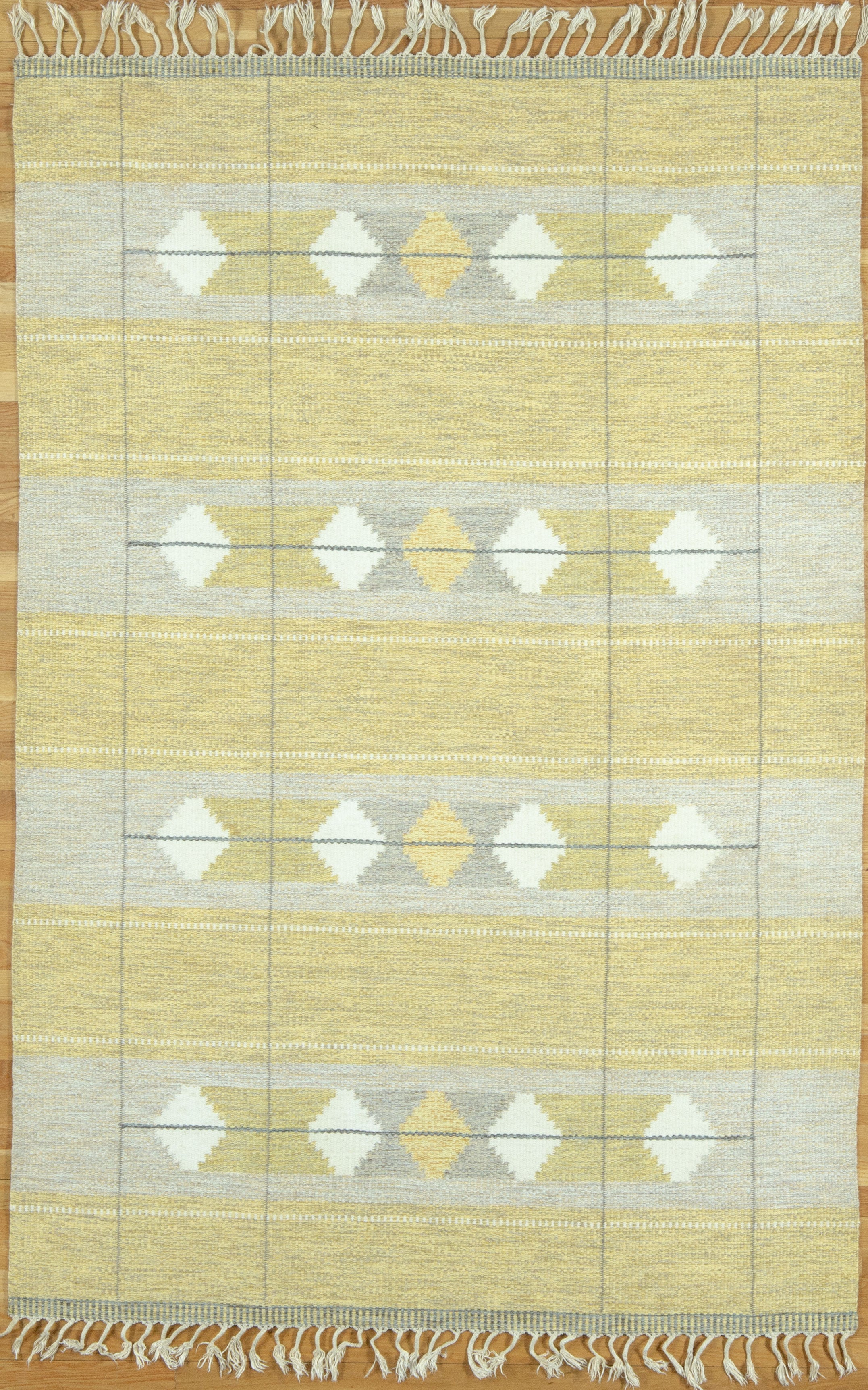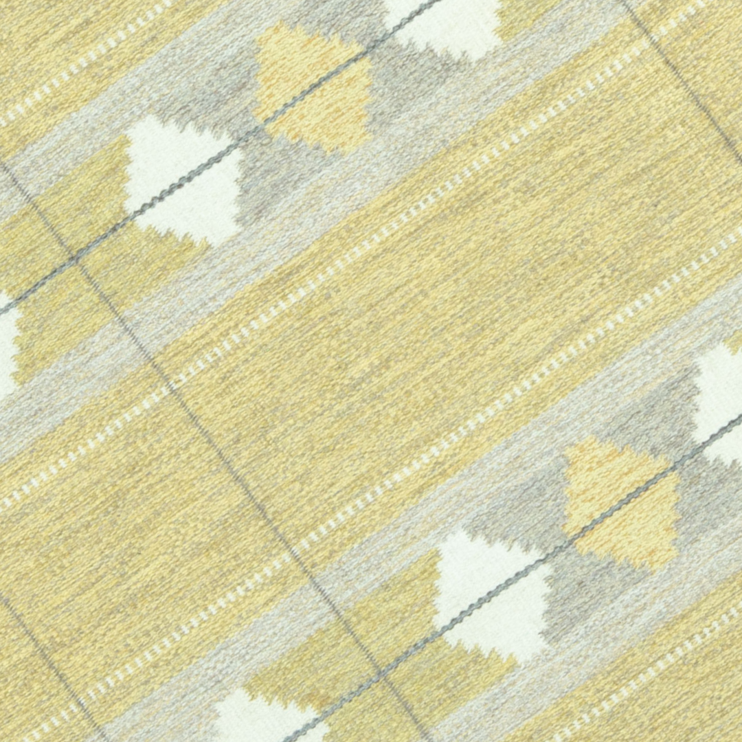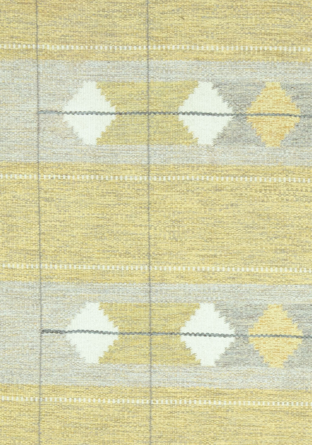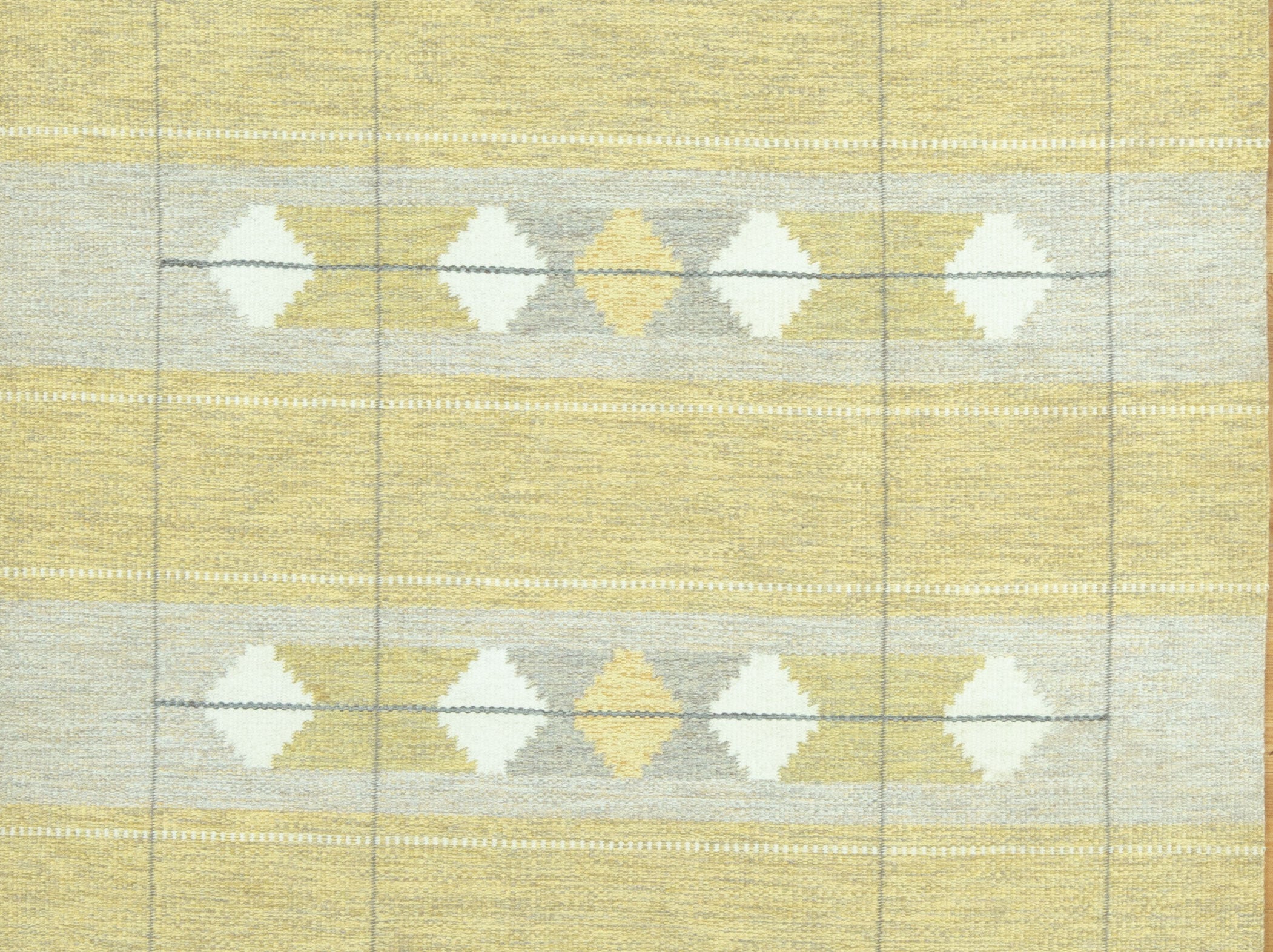 mid century Swedish with a subtle diamond pattern and tones of pale yellow, lime green, grey, beige and ivory