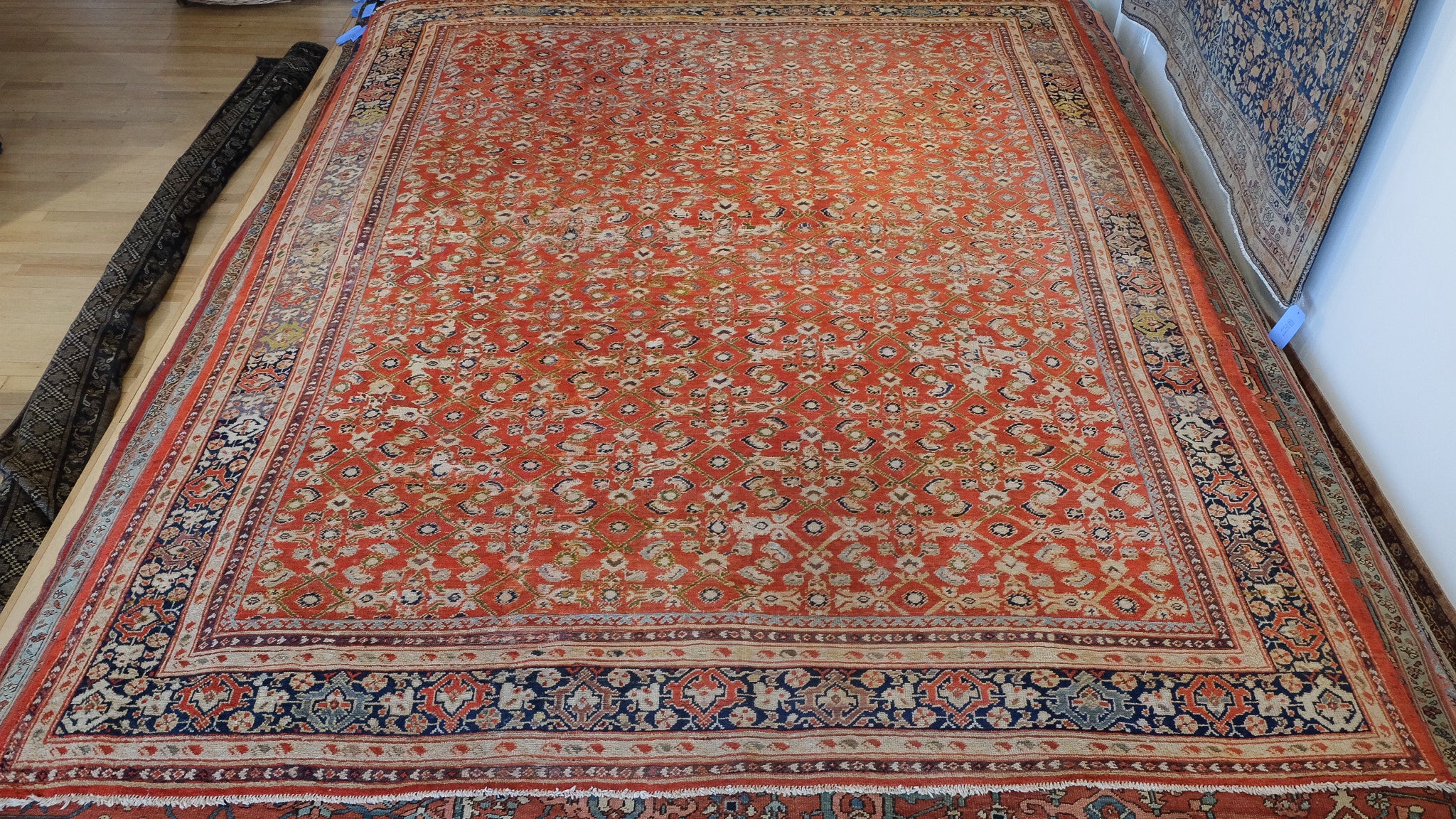 Late 19th century Sultanabad with a watermelon red field and all over design with deep navy, ivory and chartreuse.
