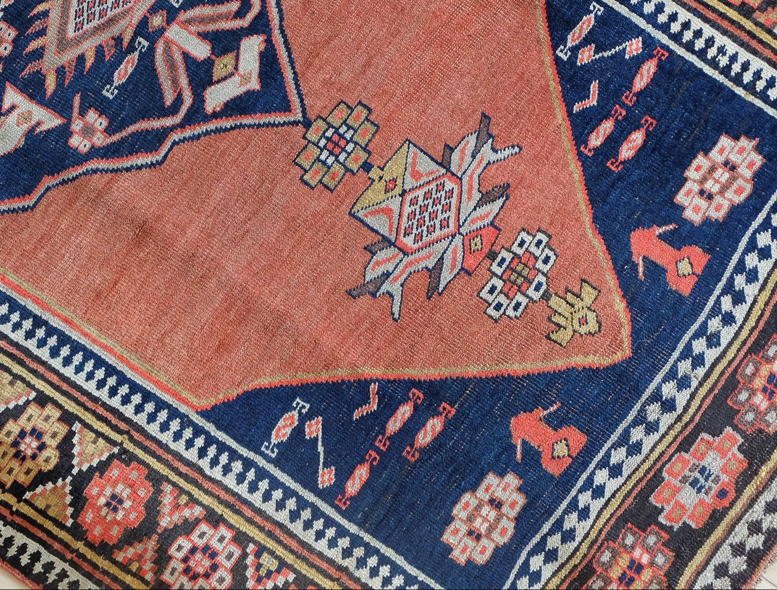 Bidjar with shades of rust, coral, bright pink, sunny yellow and navy
