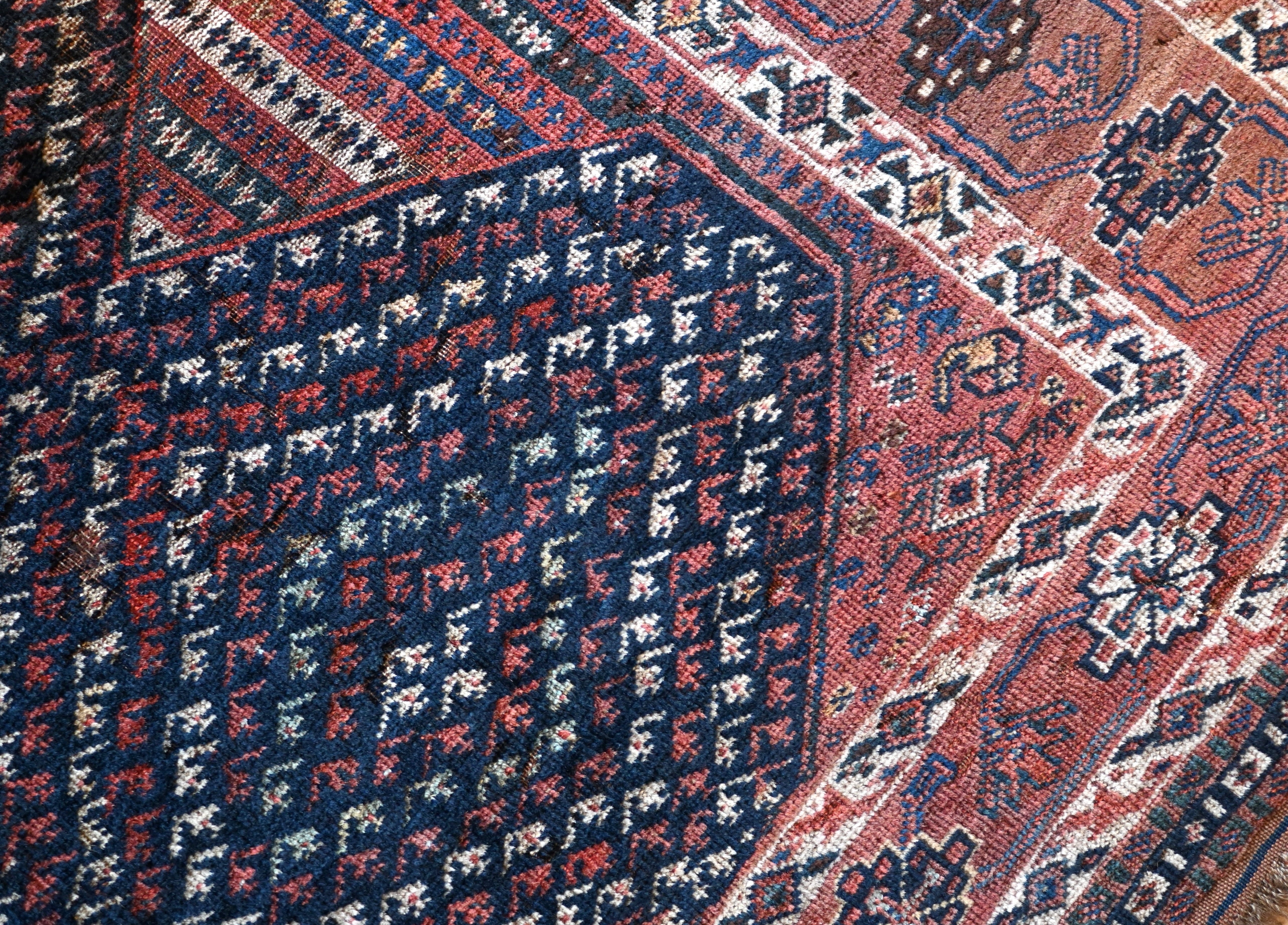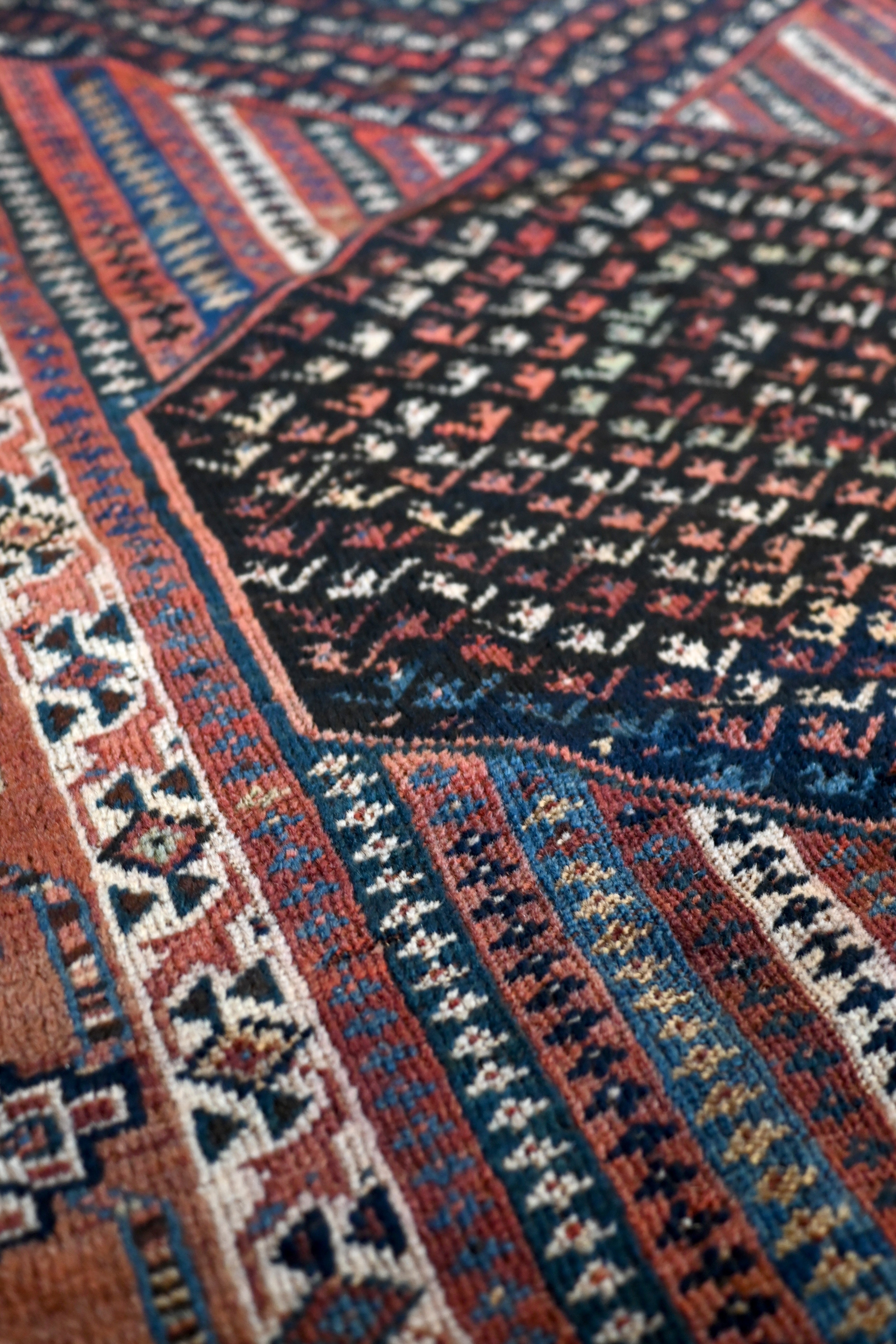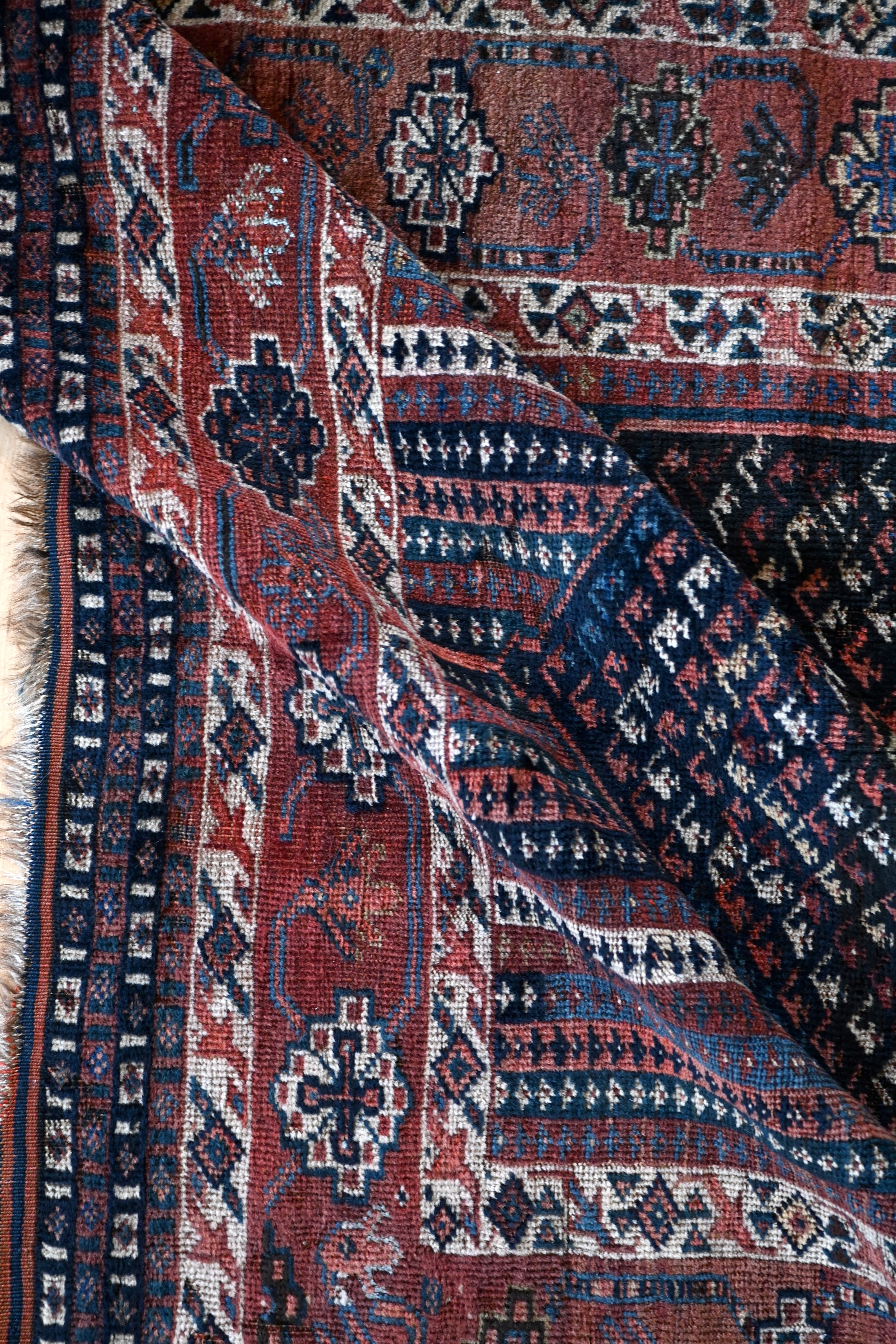 A south Persian tribal rug with deep navy, made red, ivory and jade green. Lovely kilim ends.