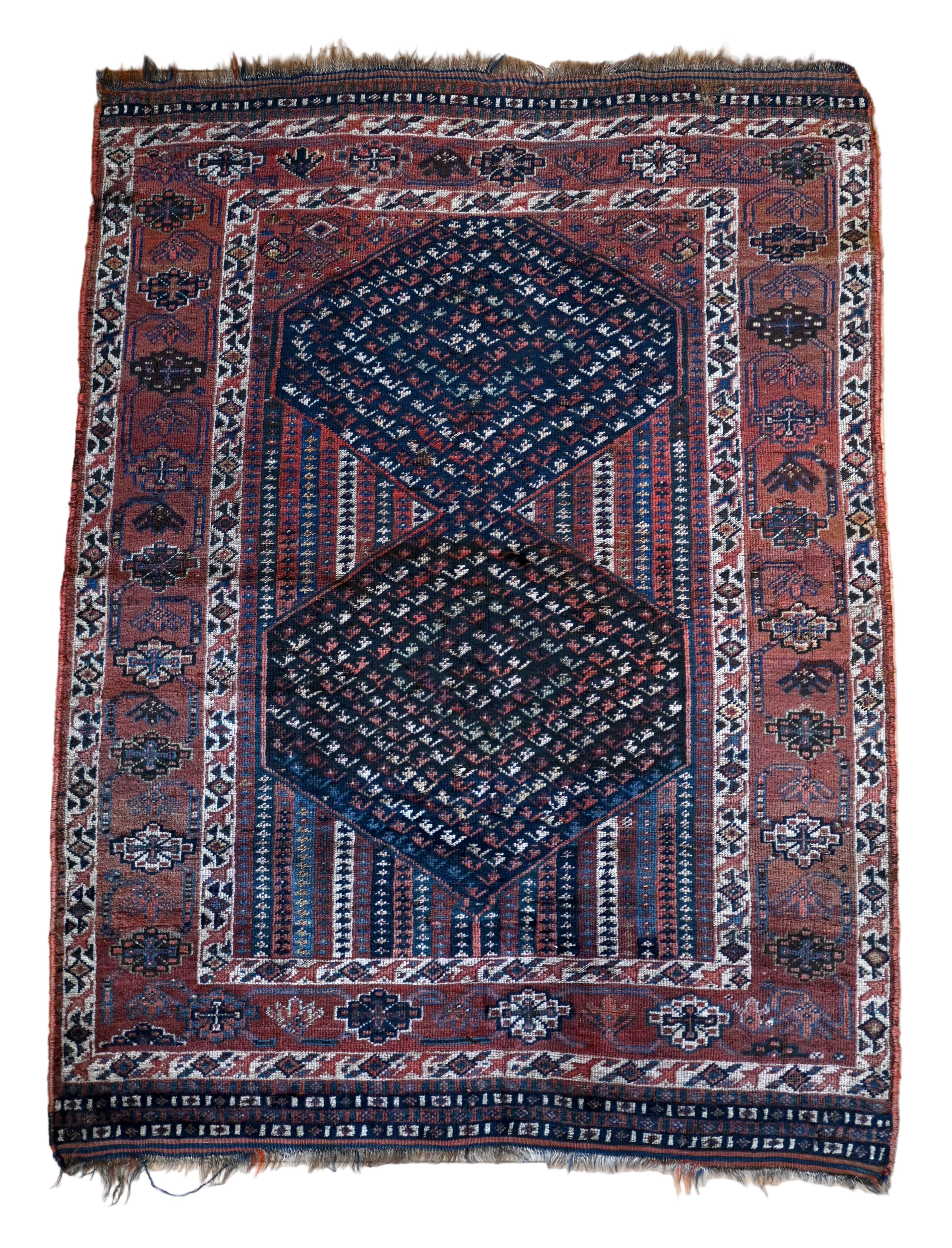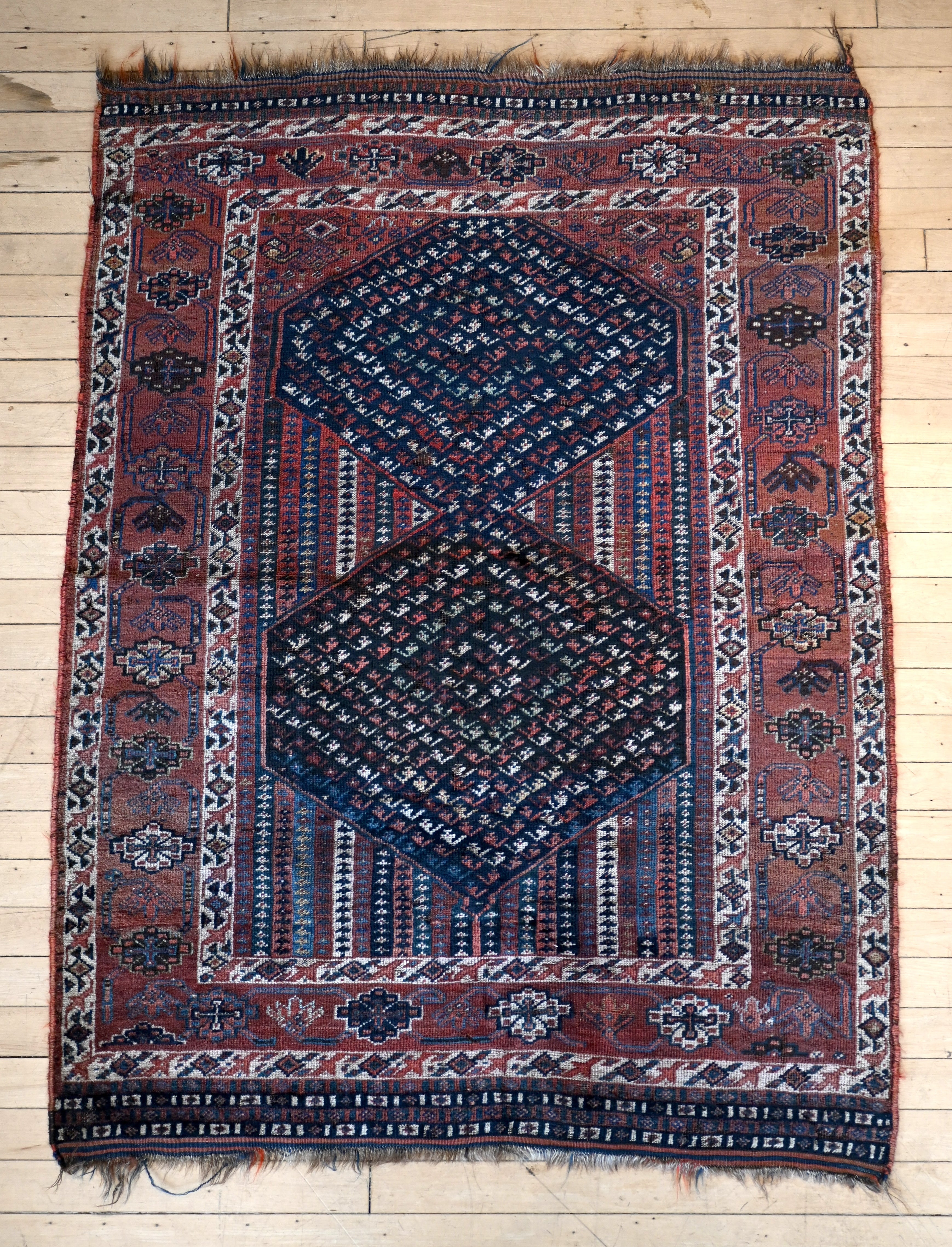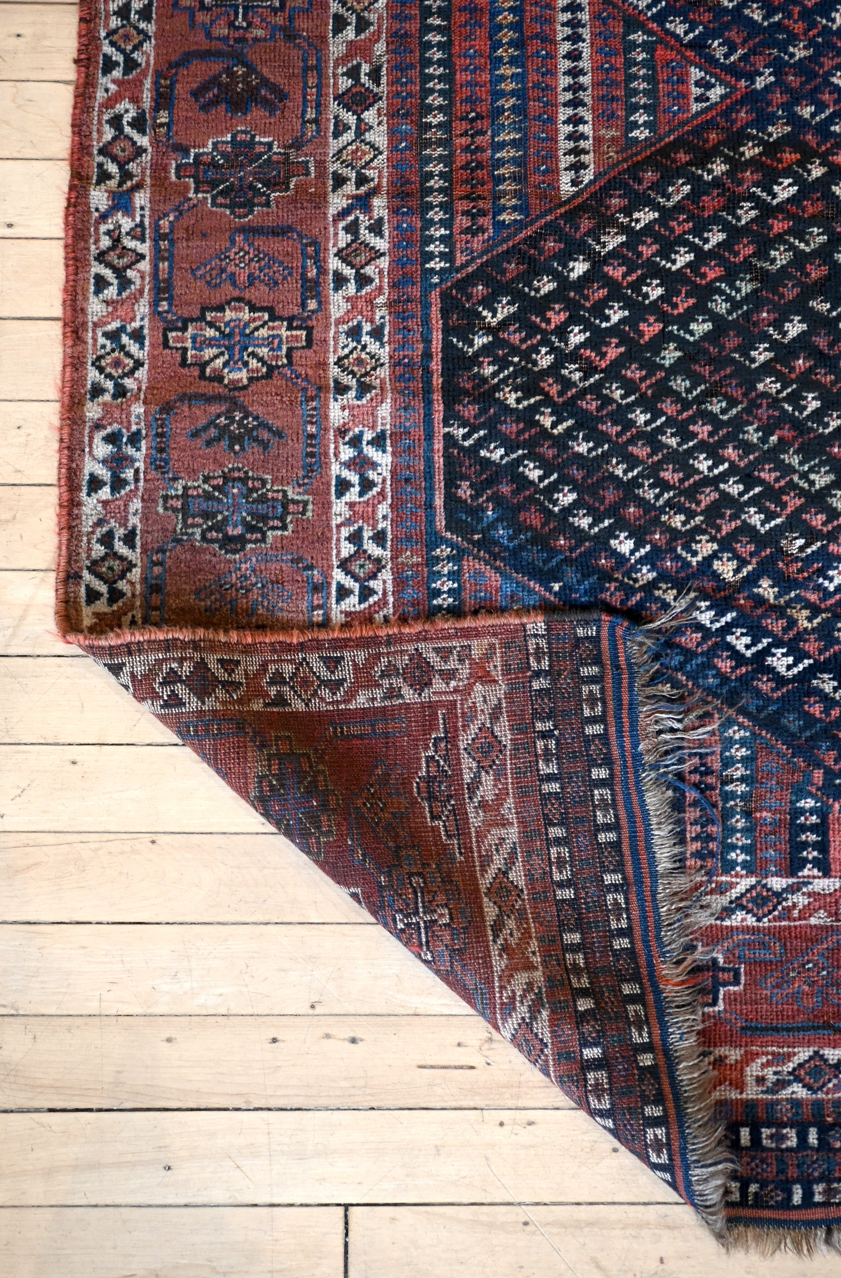 A south Persian tribal rug with deep navy, made red, ivory and jade green. Lovely kilim ends.