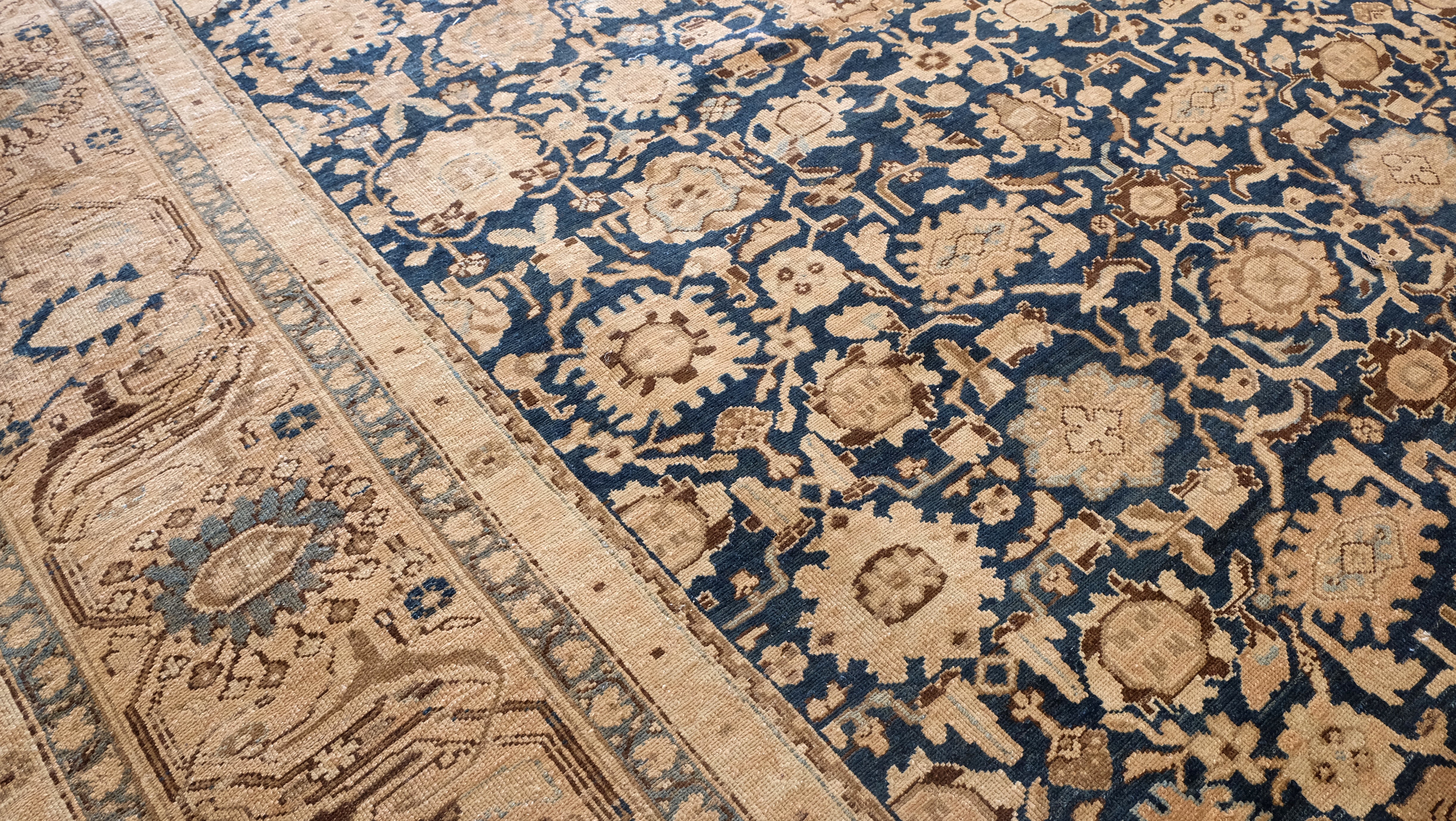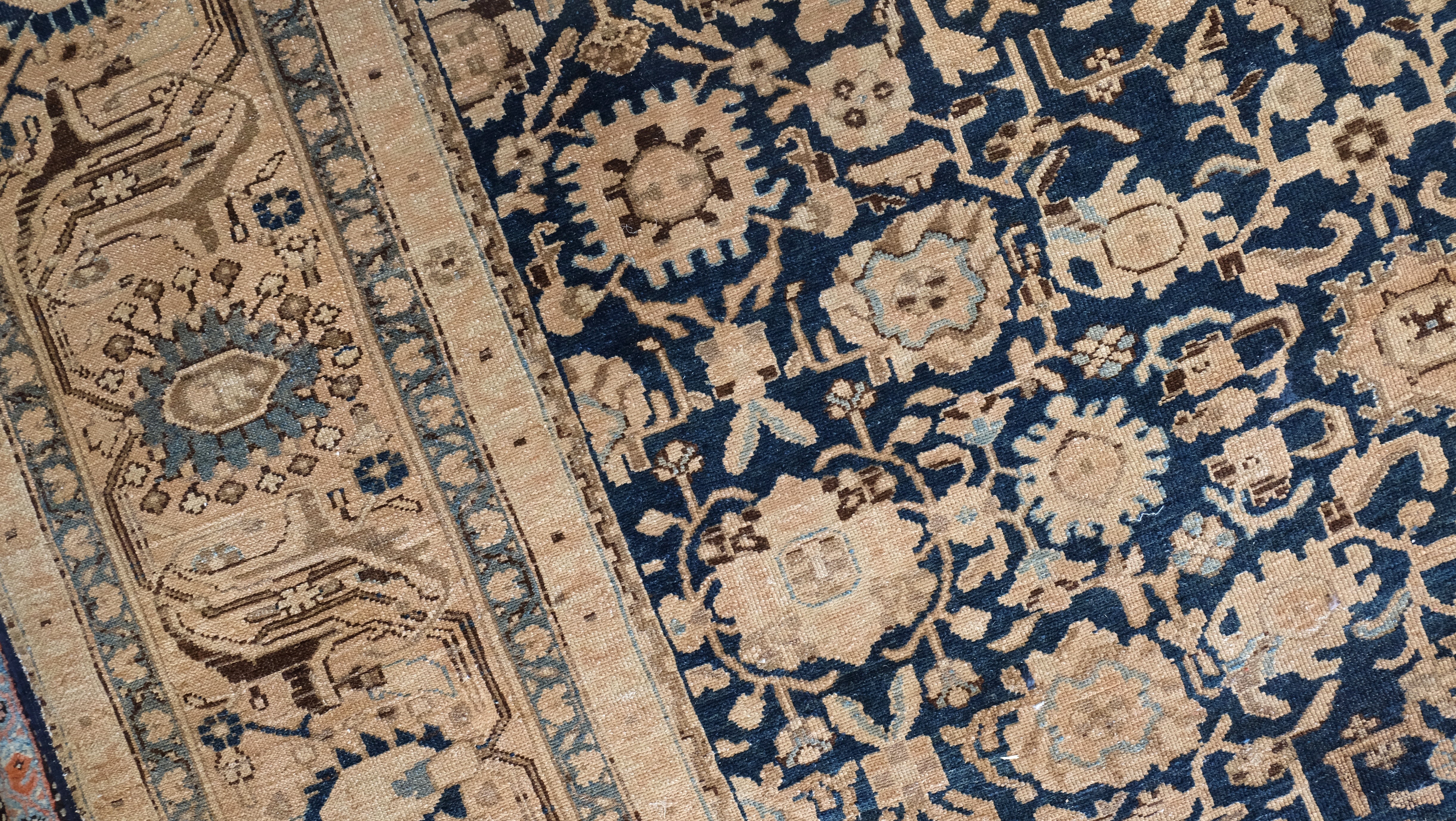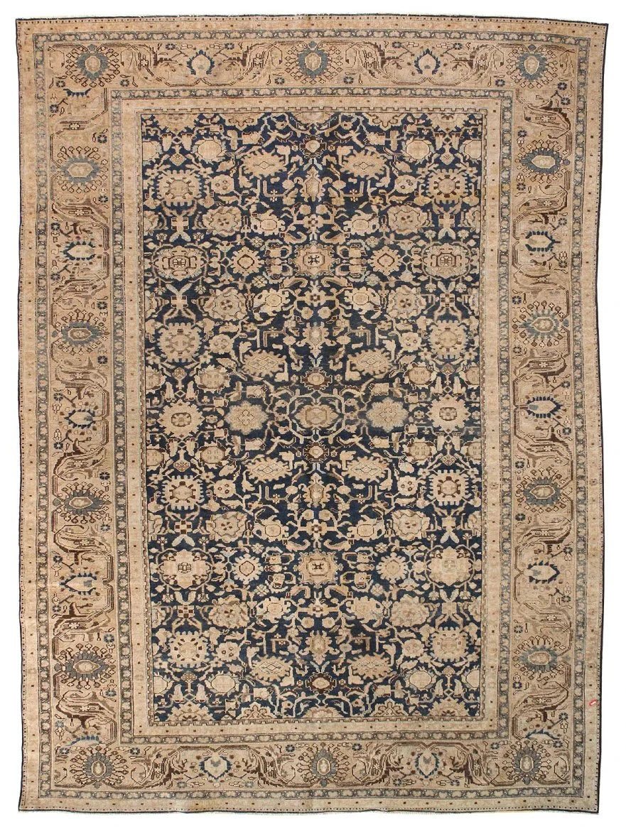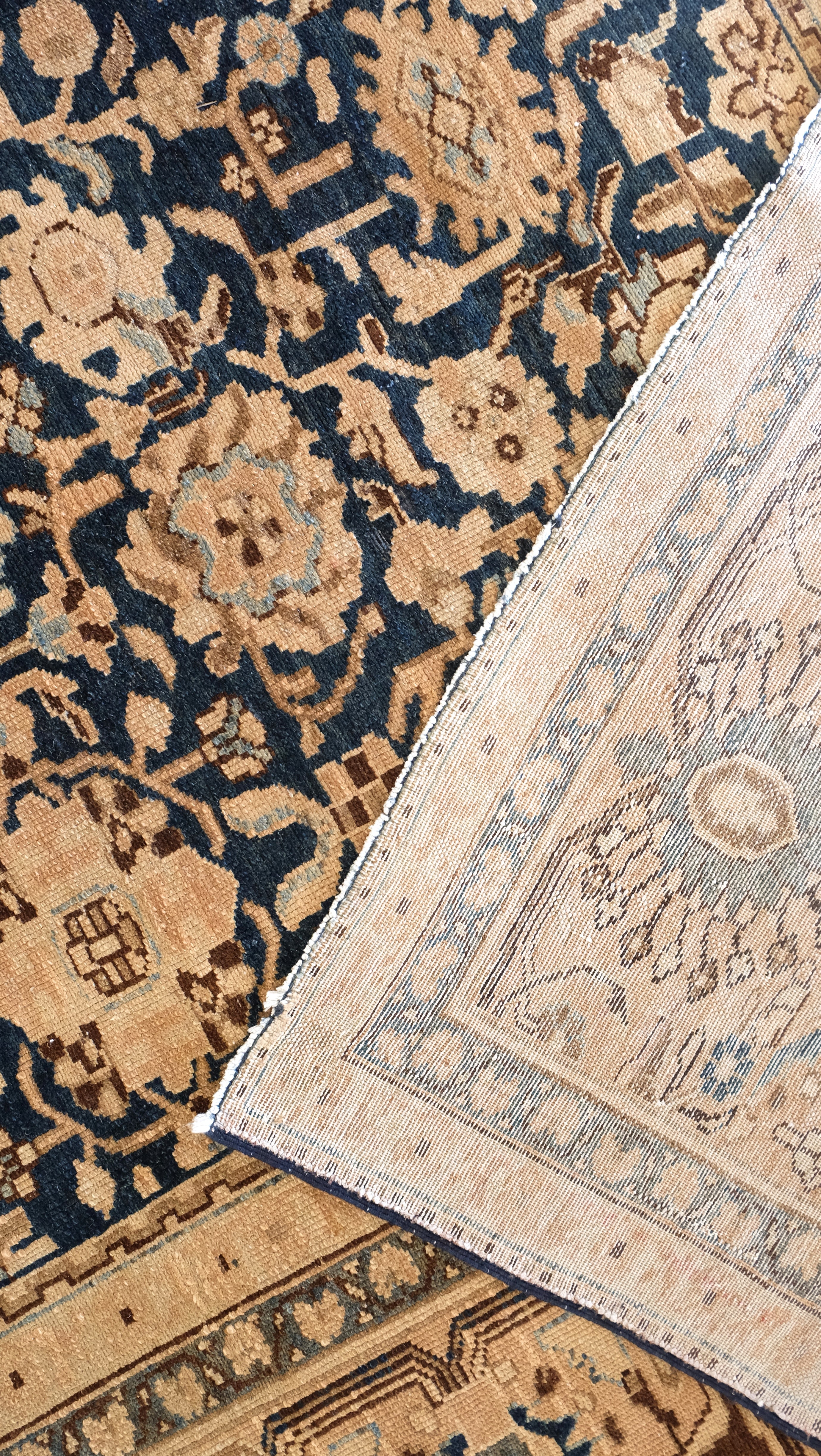 Antique Malayer with a rich navy field and all over design in cream, chocolate brown and soft blush tones.