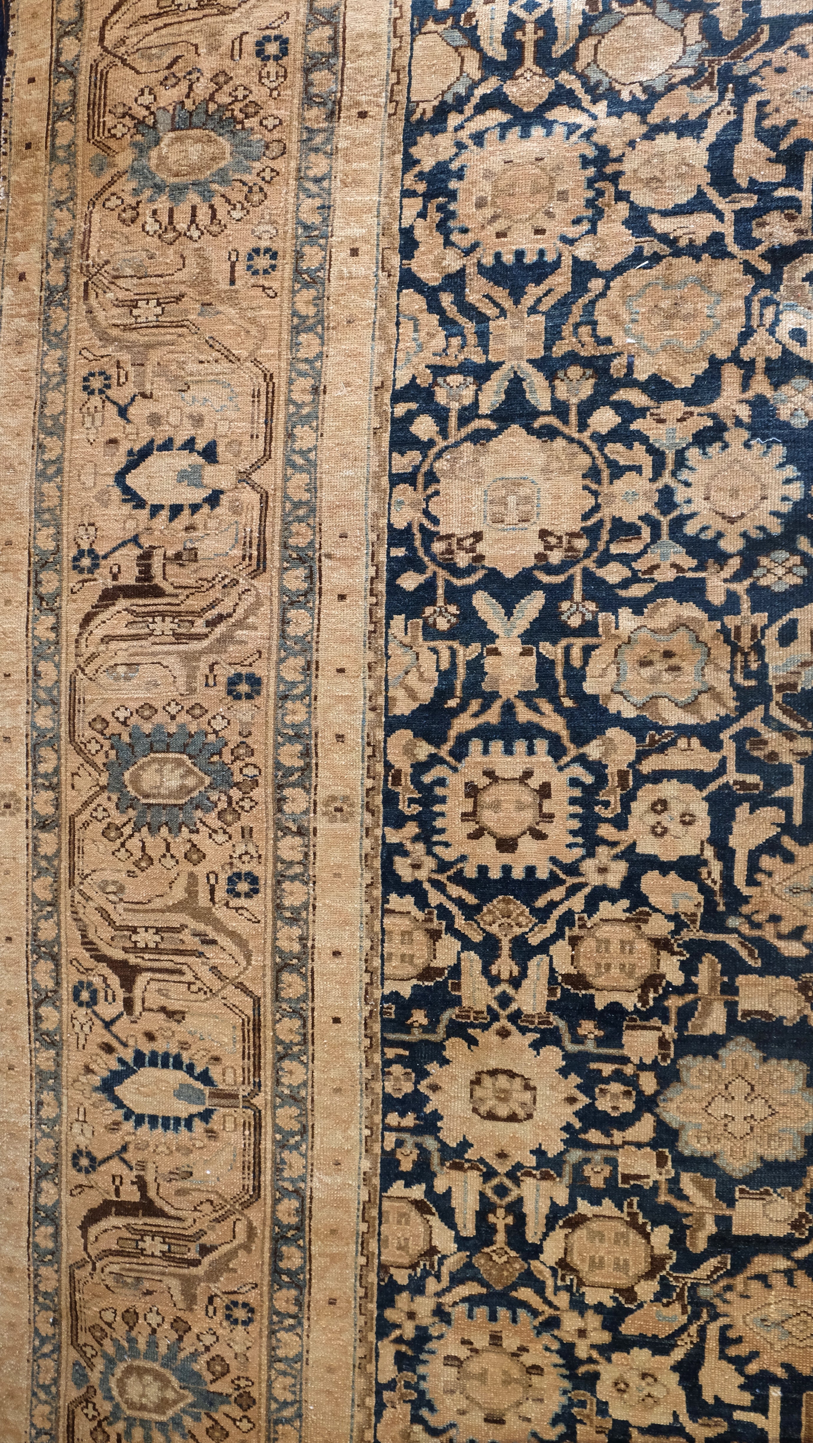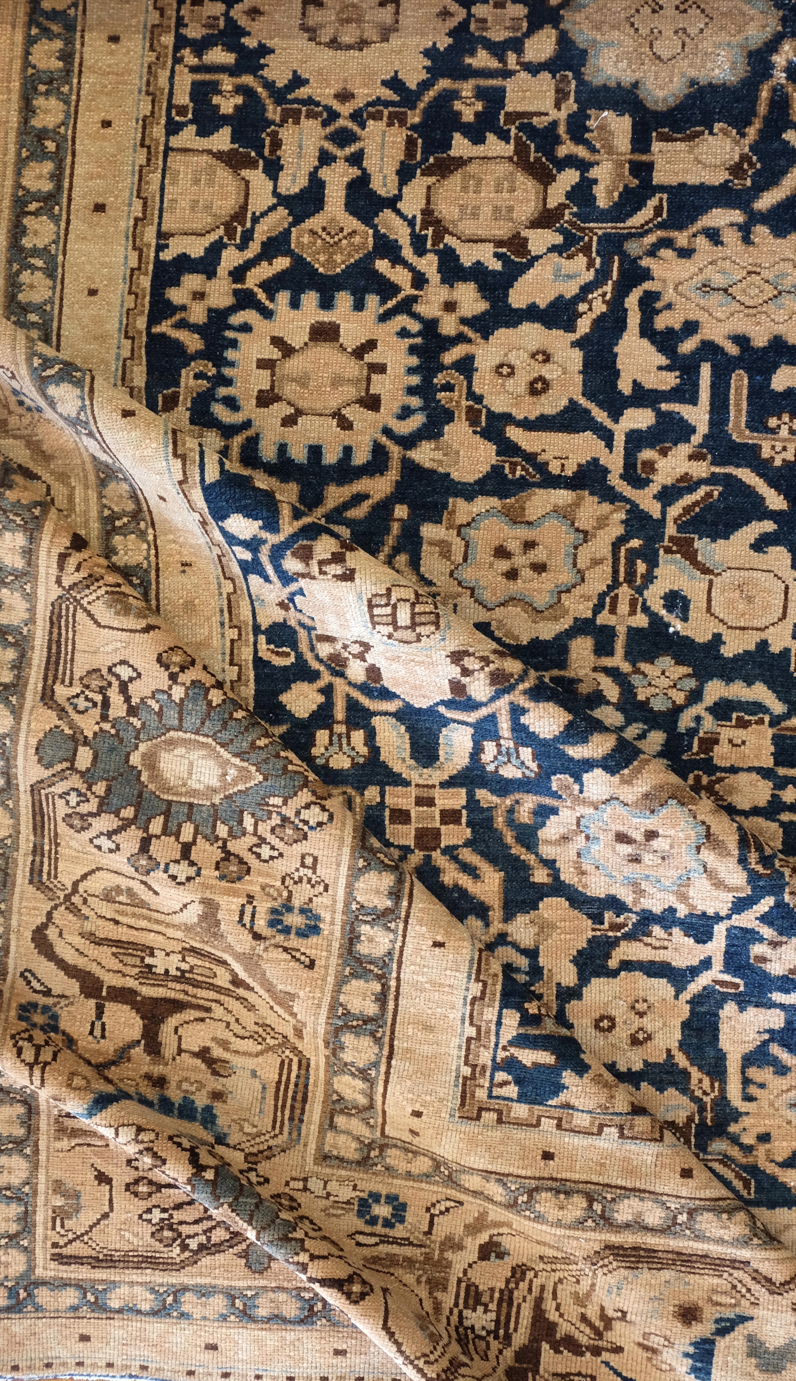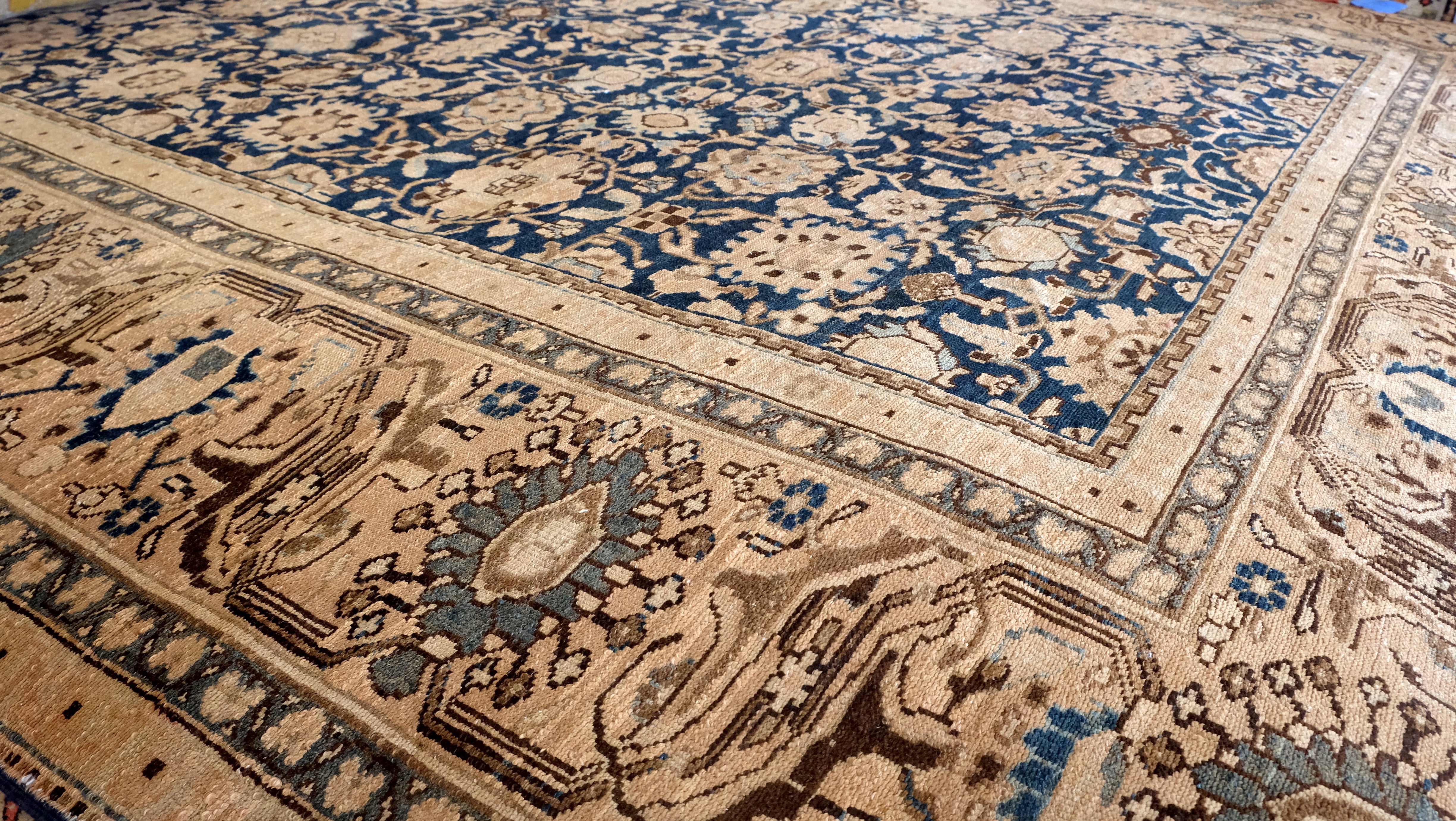 Antique Malayer with a rich navy field and all over design in cream, chocolate brown and soft blush tones.