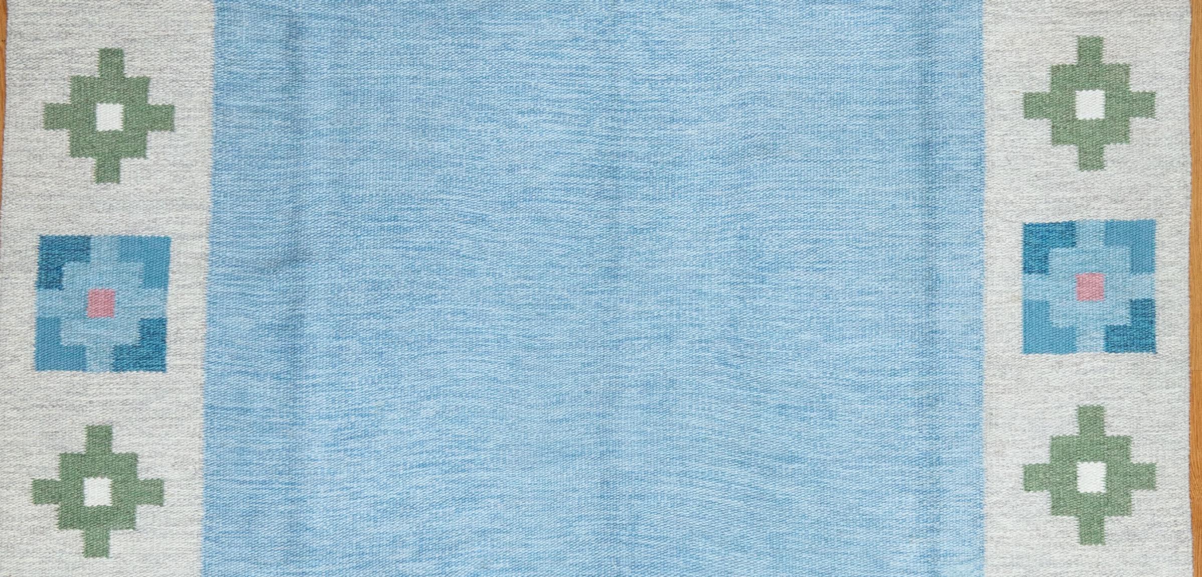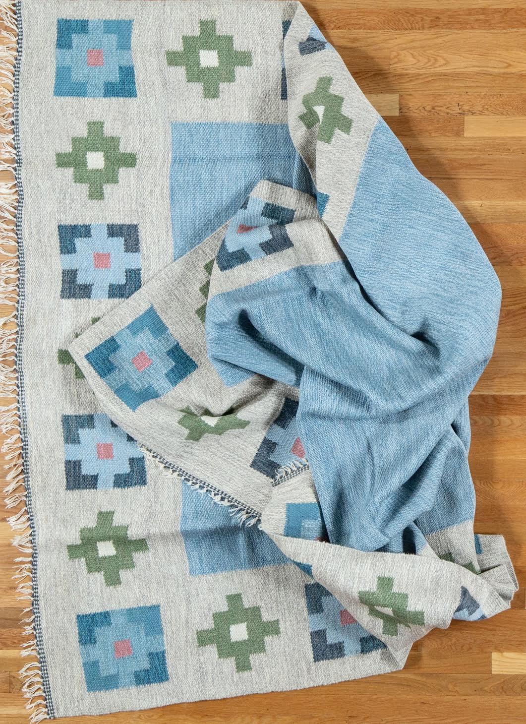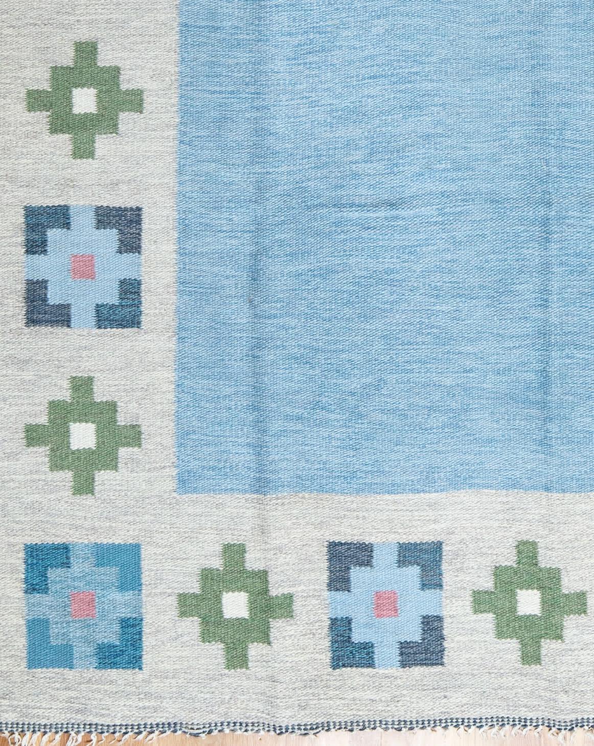 Swedish flat weave with a wide open cornflower blue field with tones of sage green, navy and grey