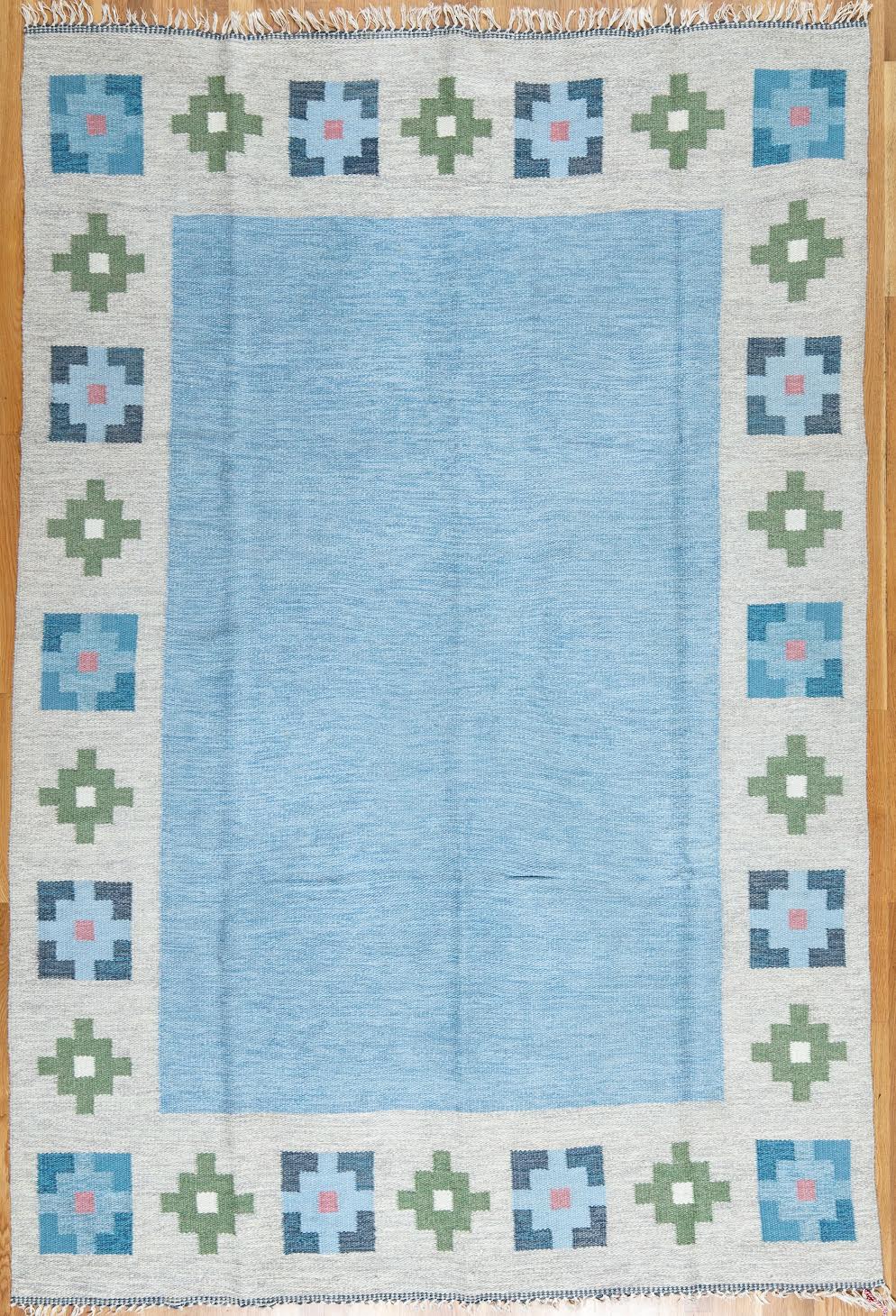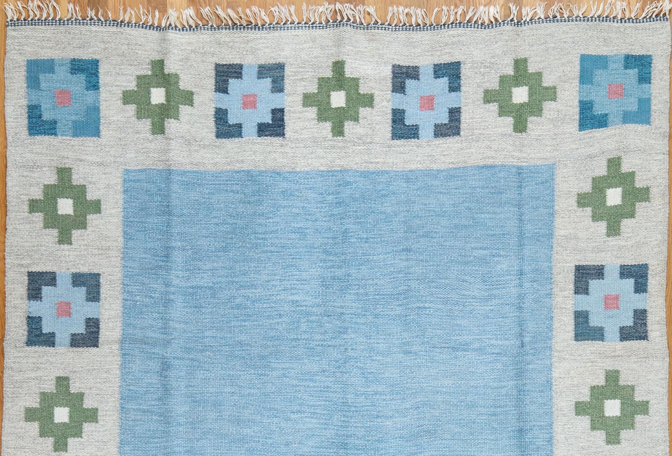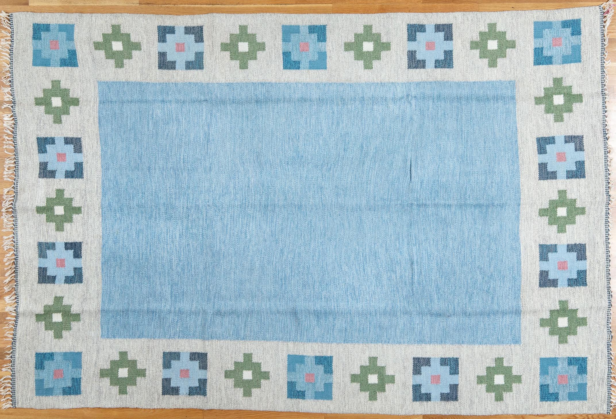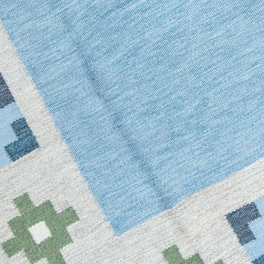 Swedish flat weave with a wide open cornflower blue field with tones of sage green, navy and grey