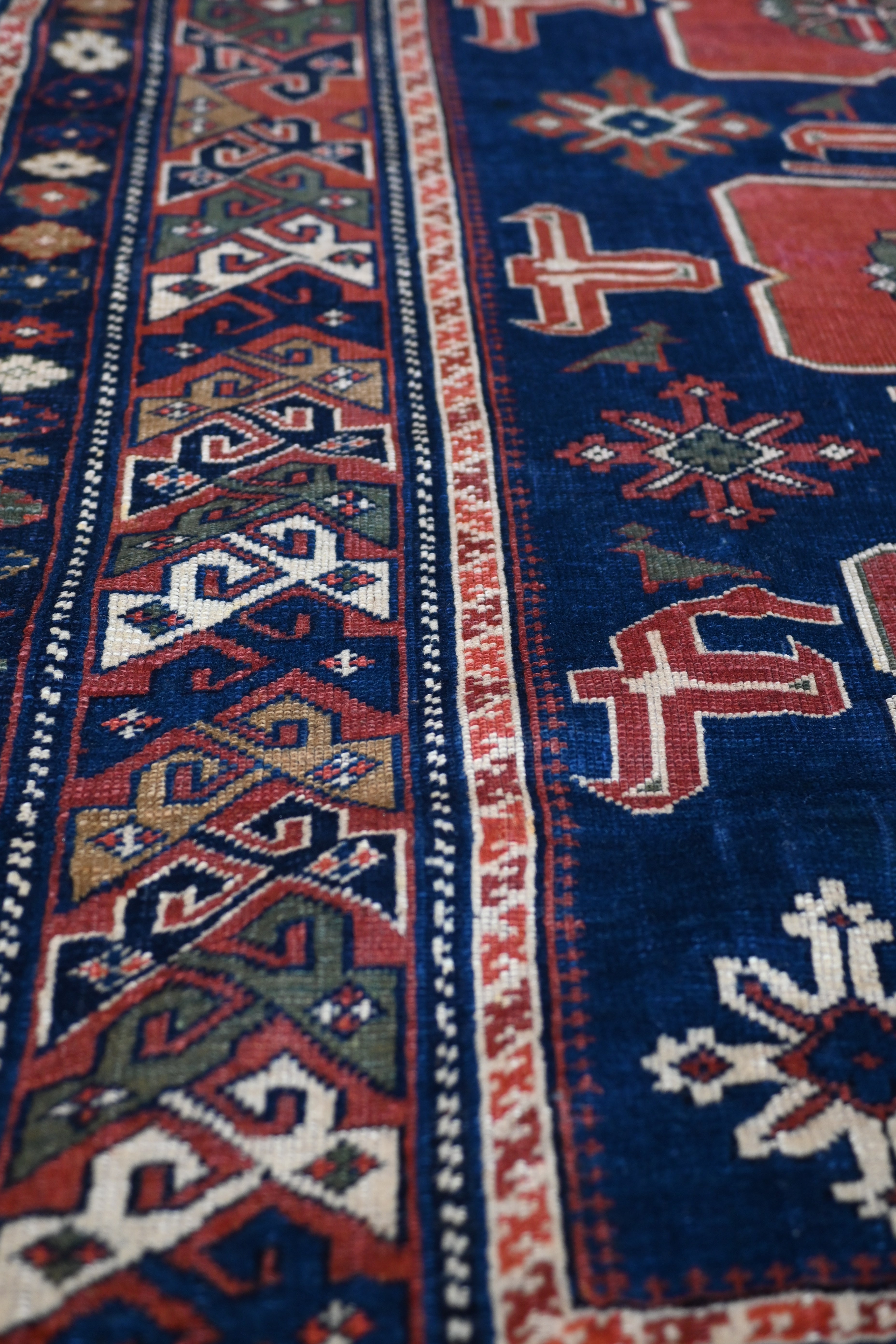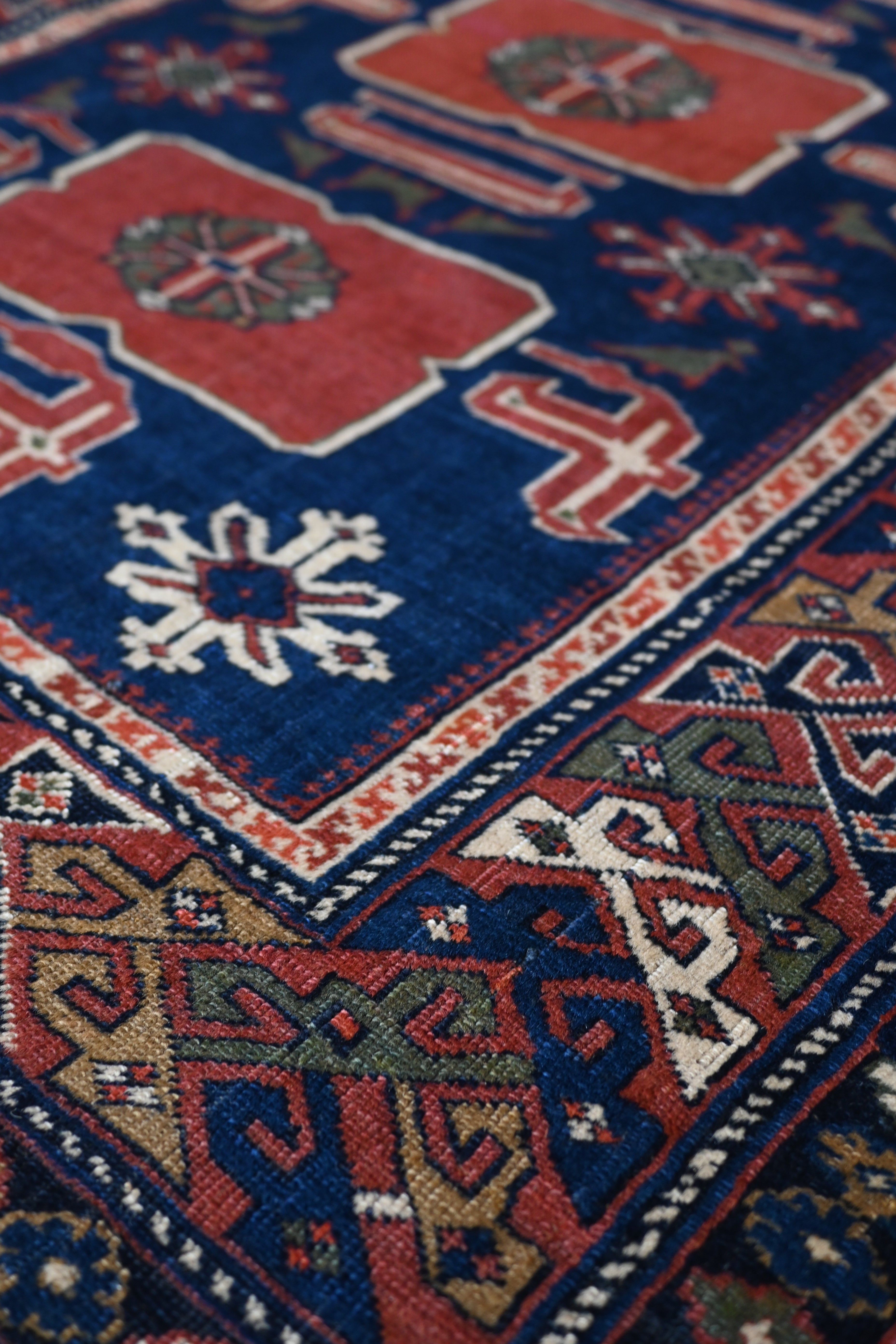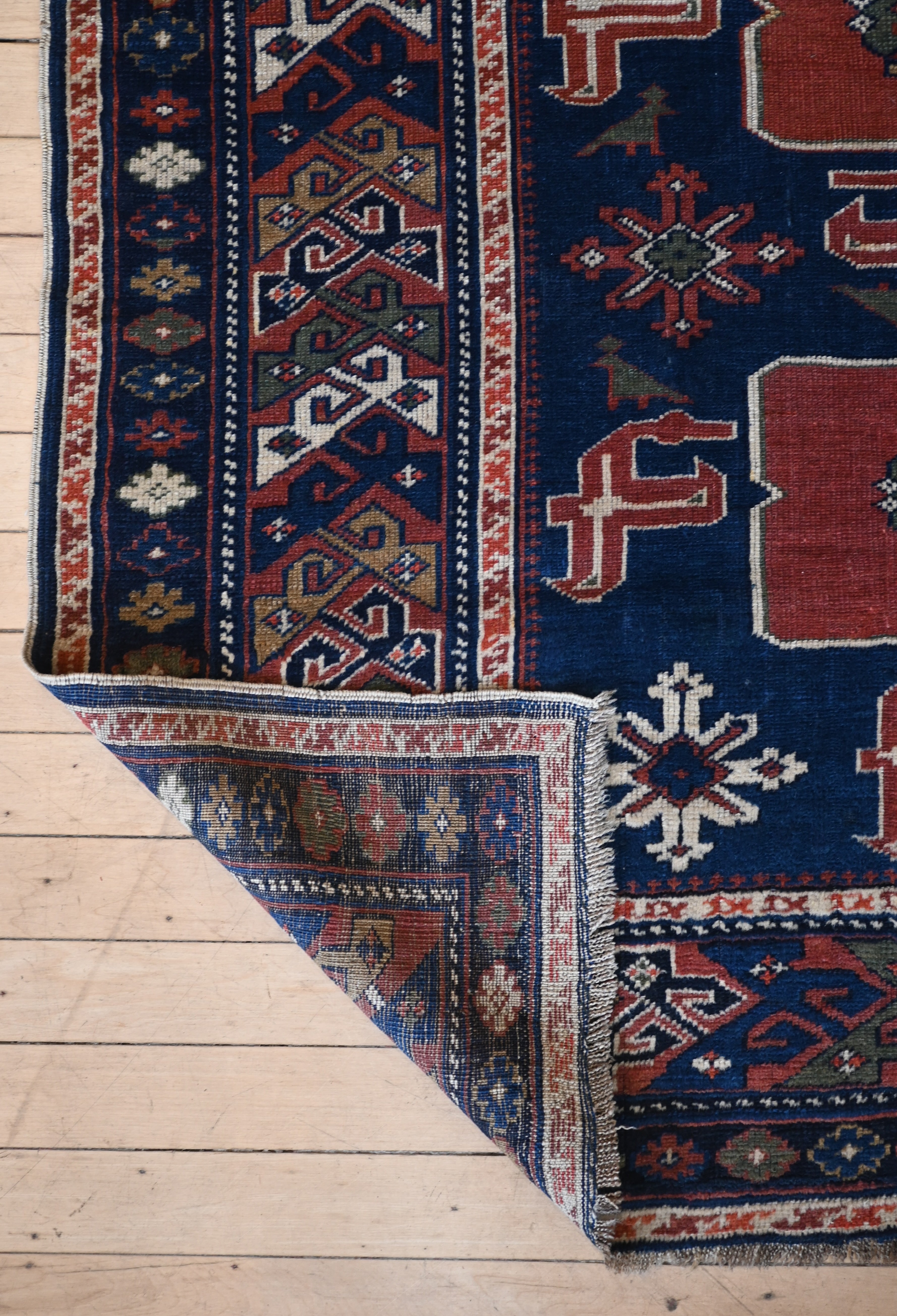Early 20th century Qaraqashli Kazak. Deep indigo blue with madder red medallions and accents of ivory and olive green.