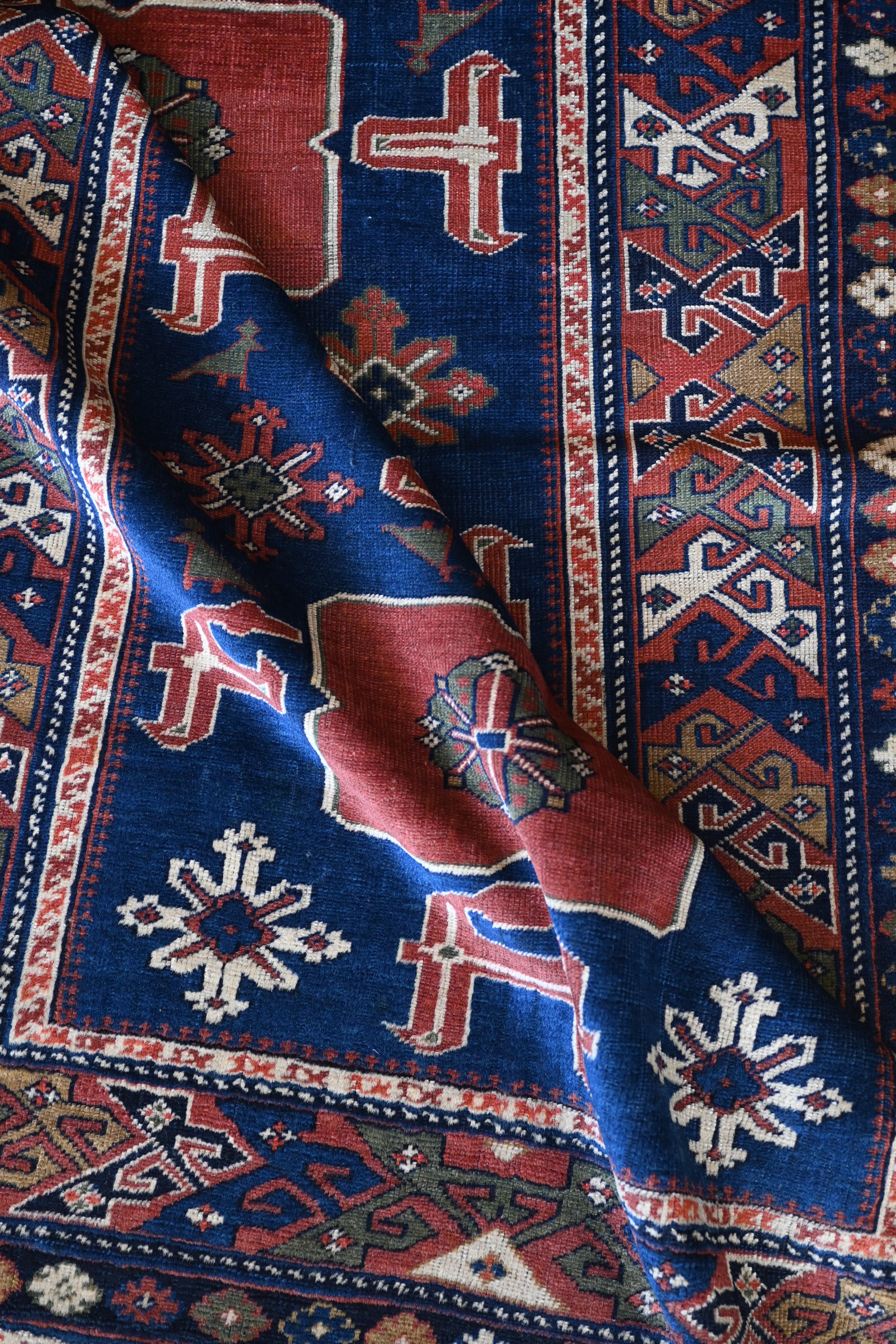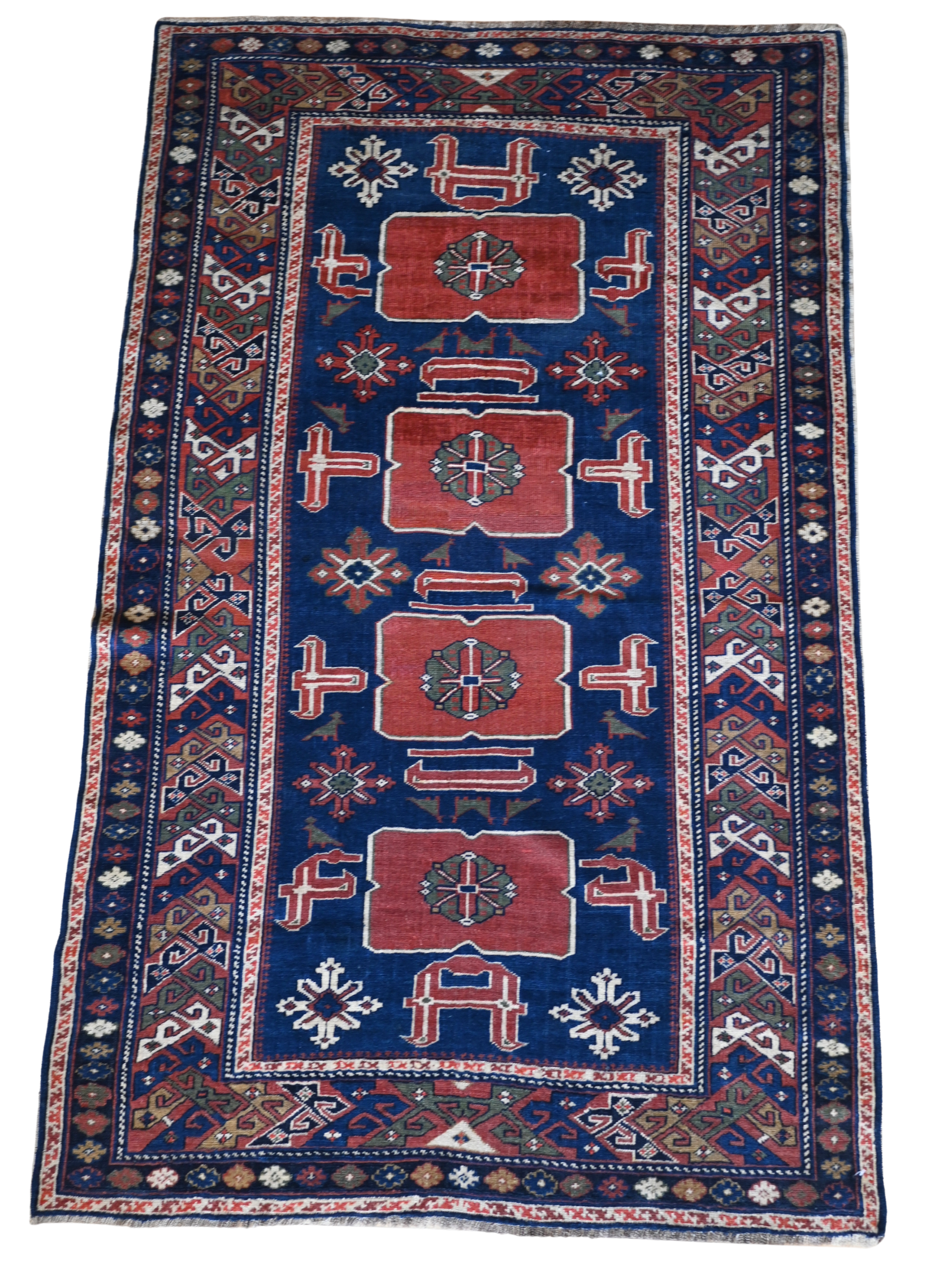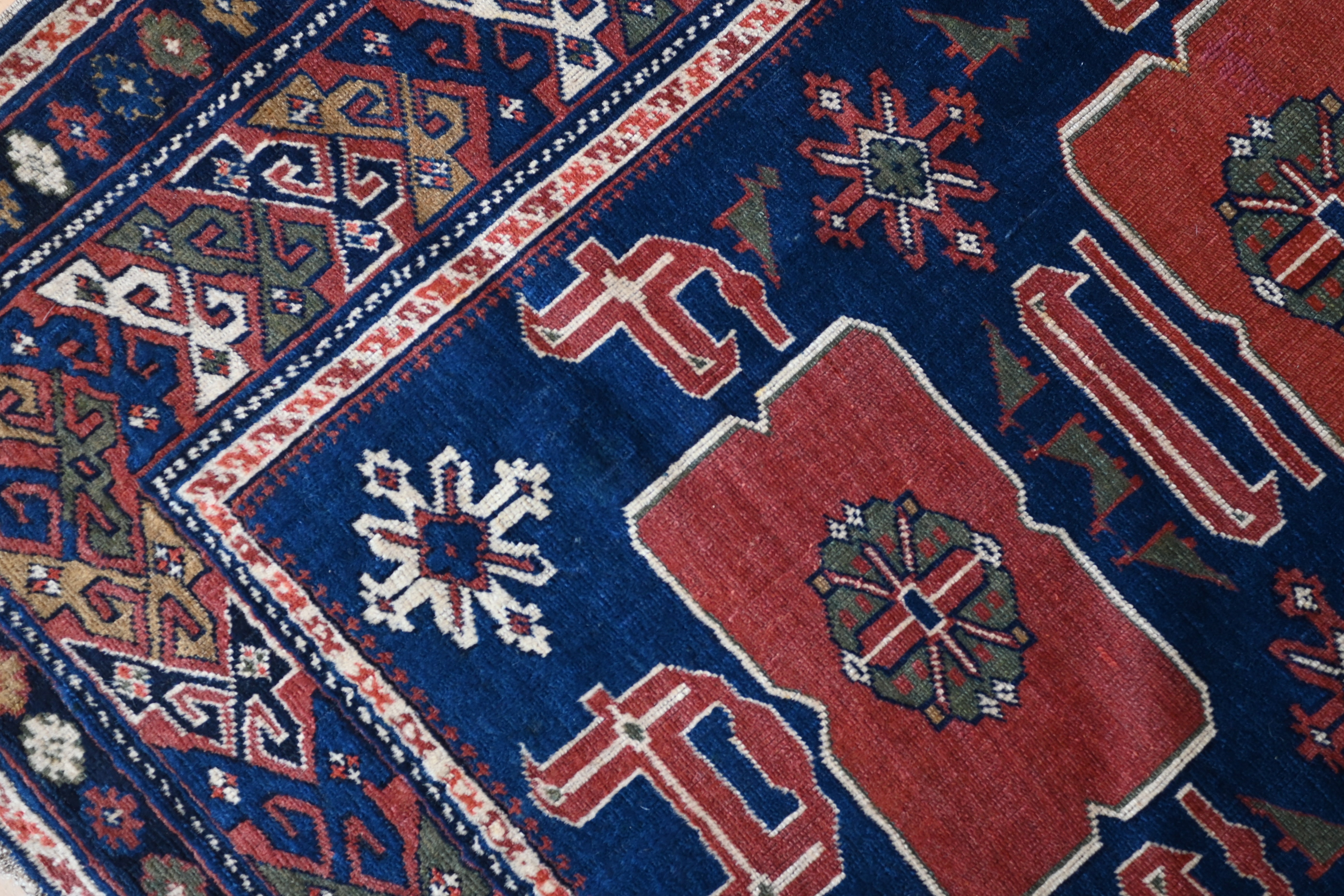 Early 20th century Qaraqashli Kazak. Deep indigo blue with madder red medallions and accents of ivory and olive green.