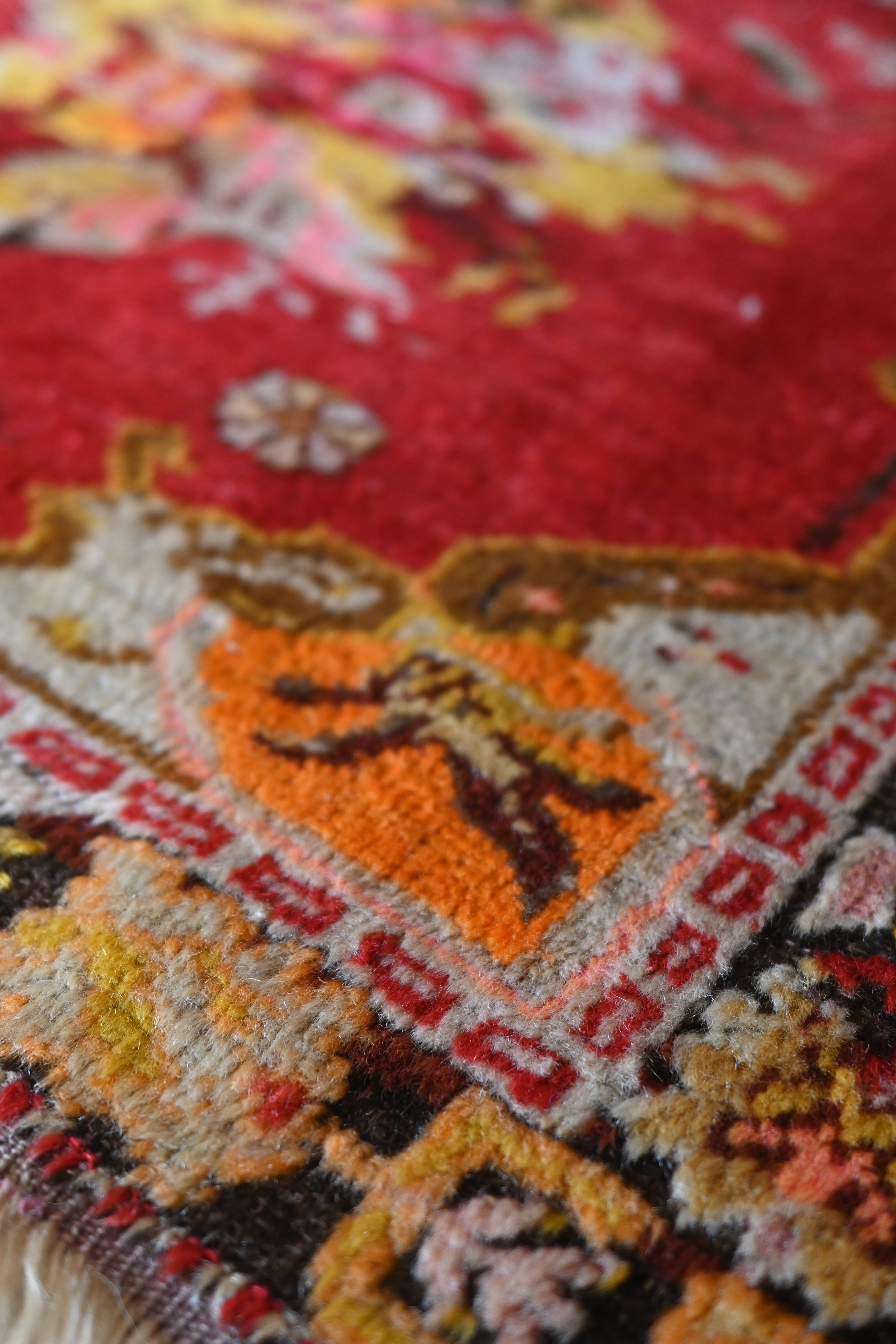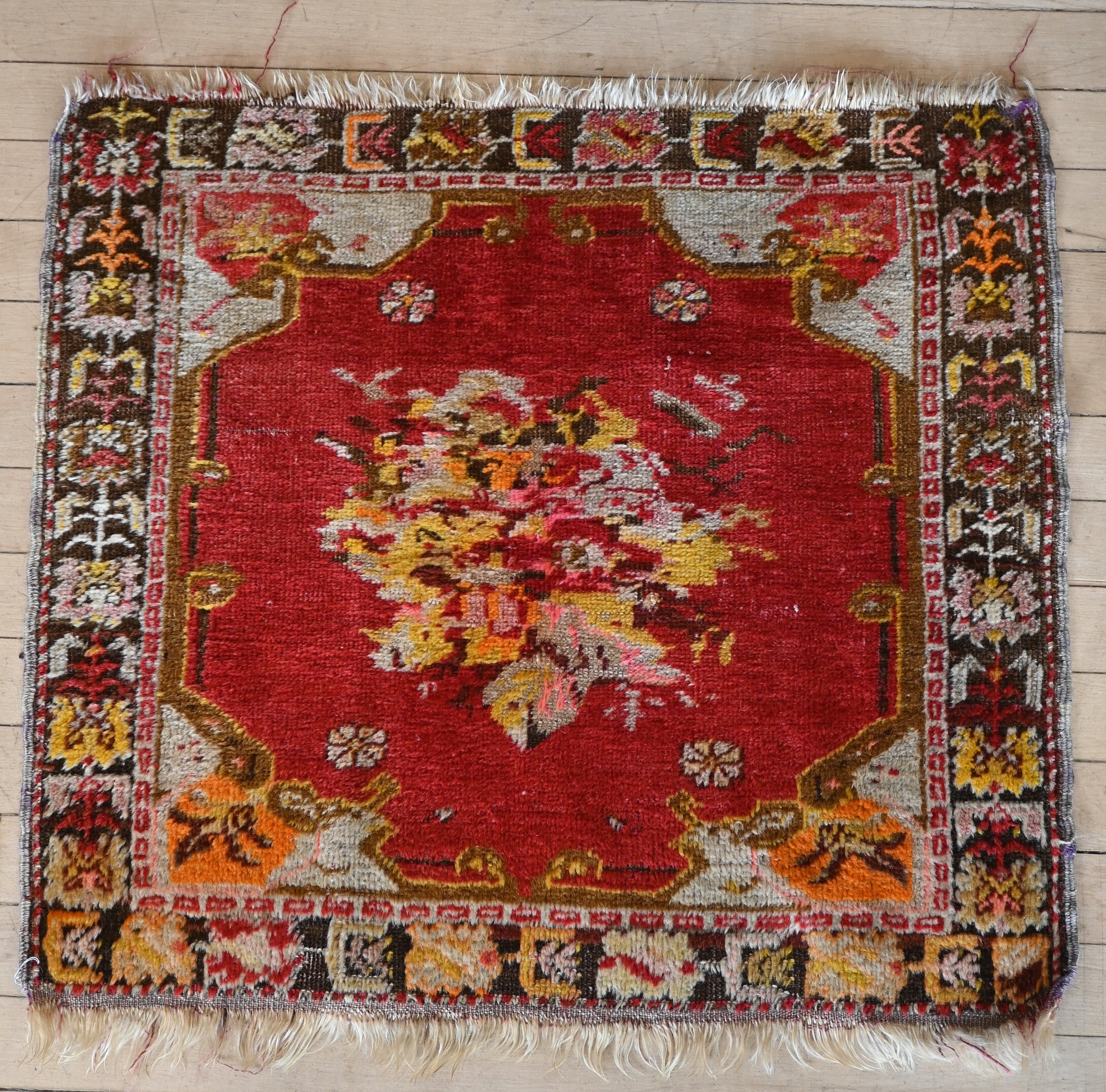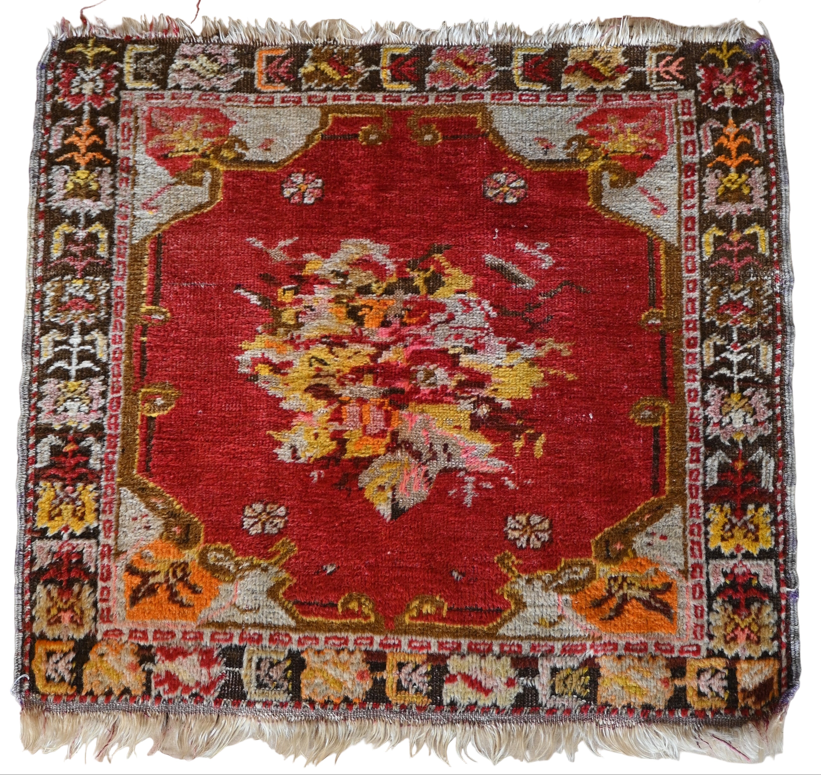 A vibrant antique Turkish mat with a fuchsia field and floral design in yellow, orange, ivory and chocolate brown.