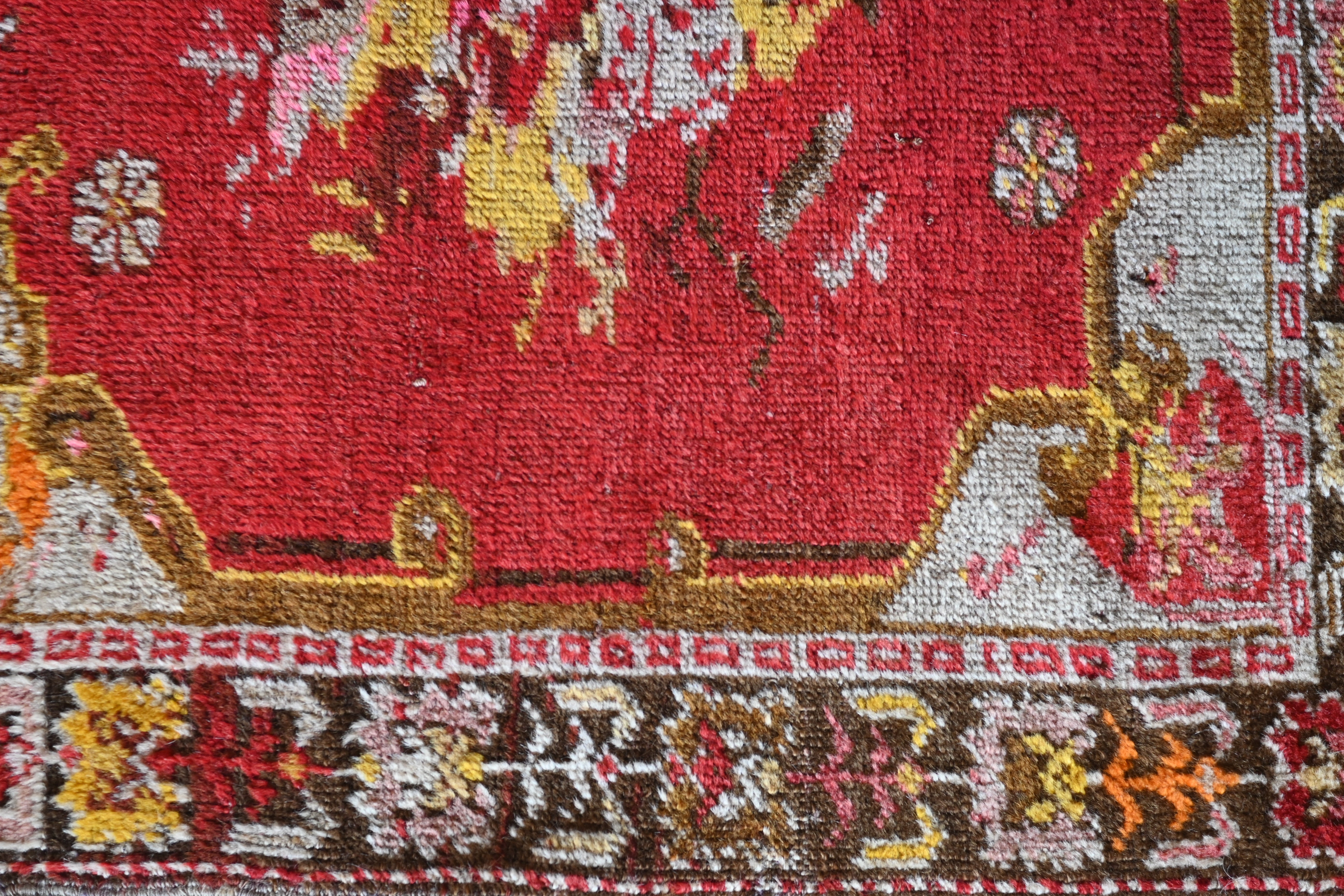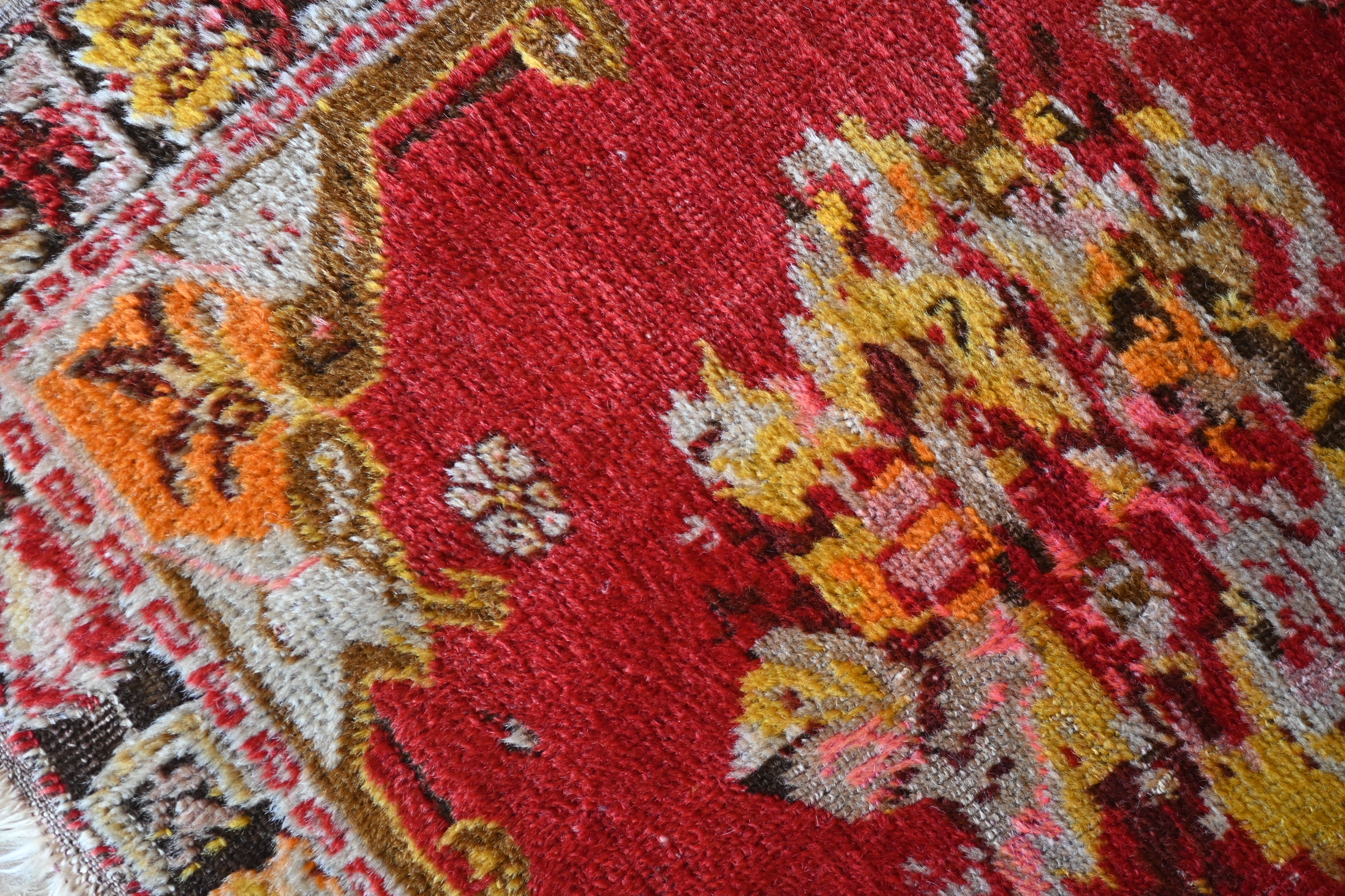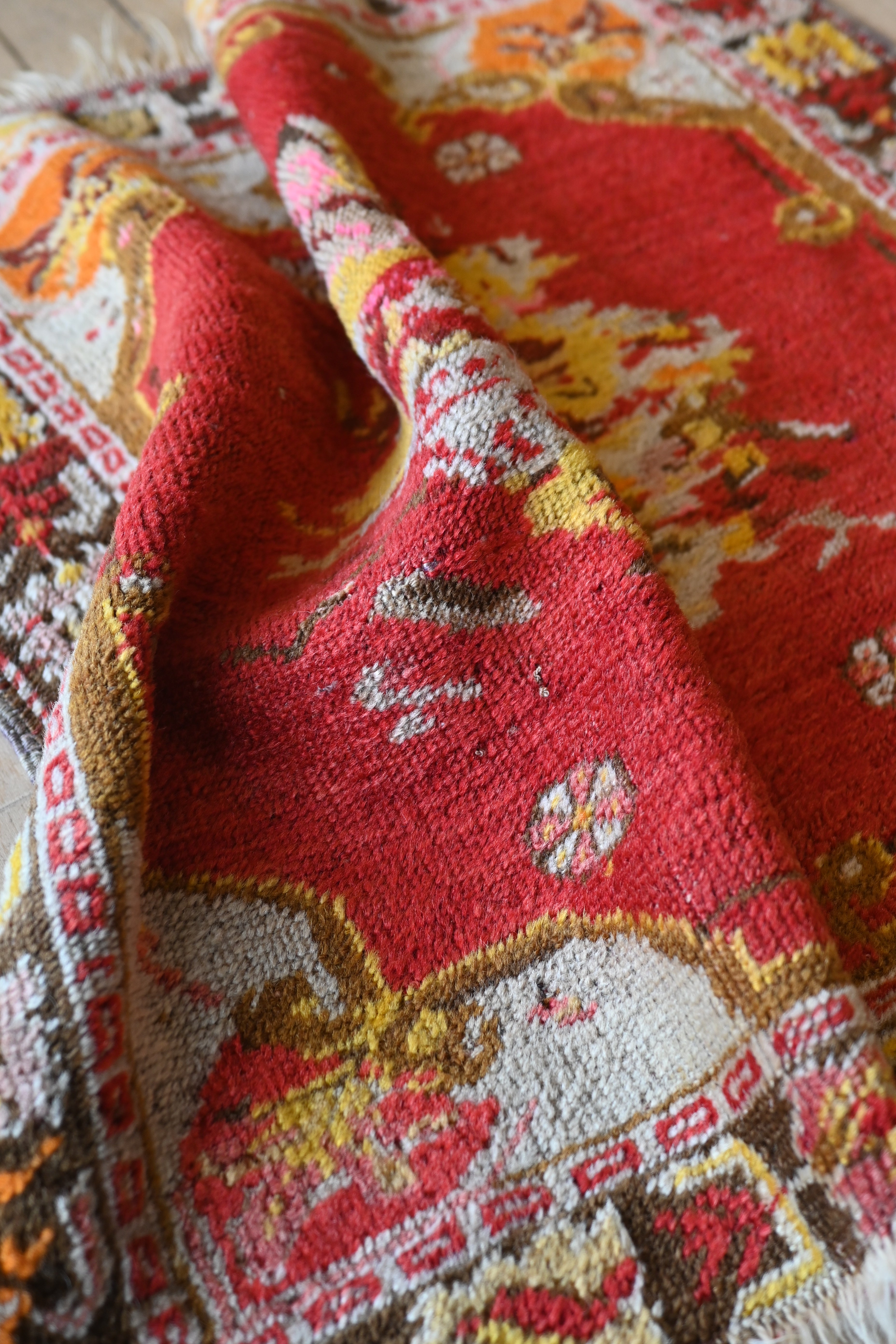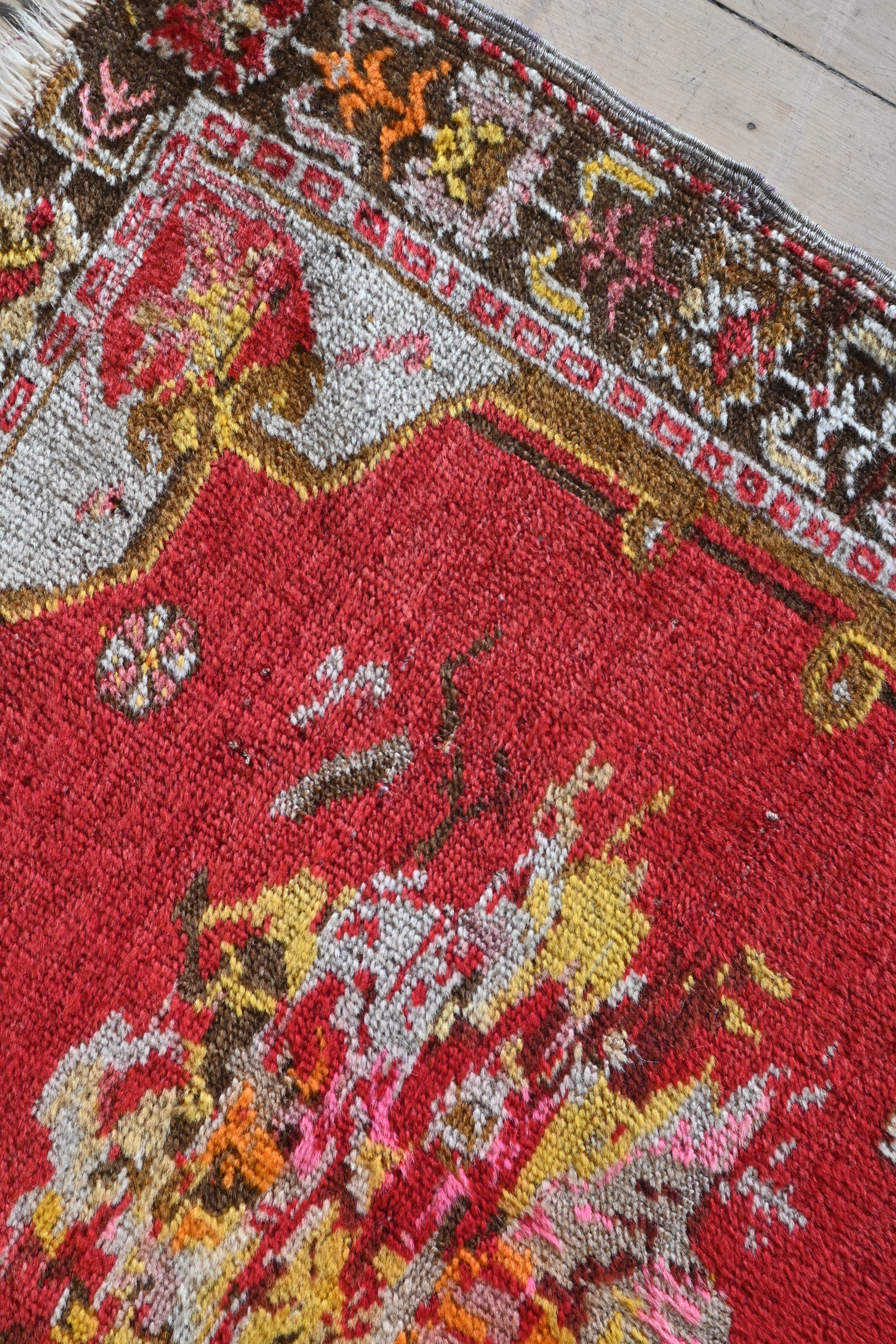 A vibrant antique Turkish mat with a fuchsia field and floral design in yellow, orange, ivory and chocolate brown.