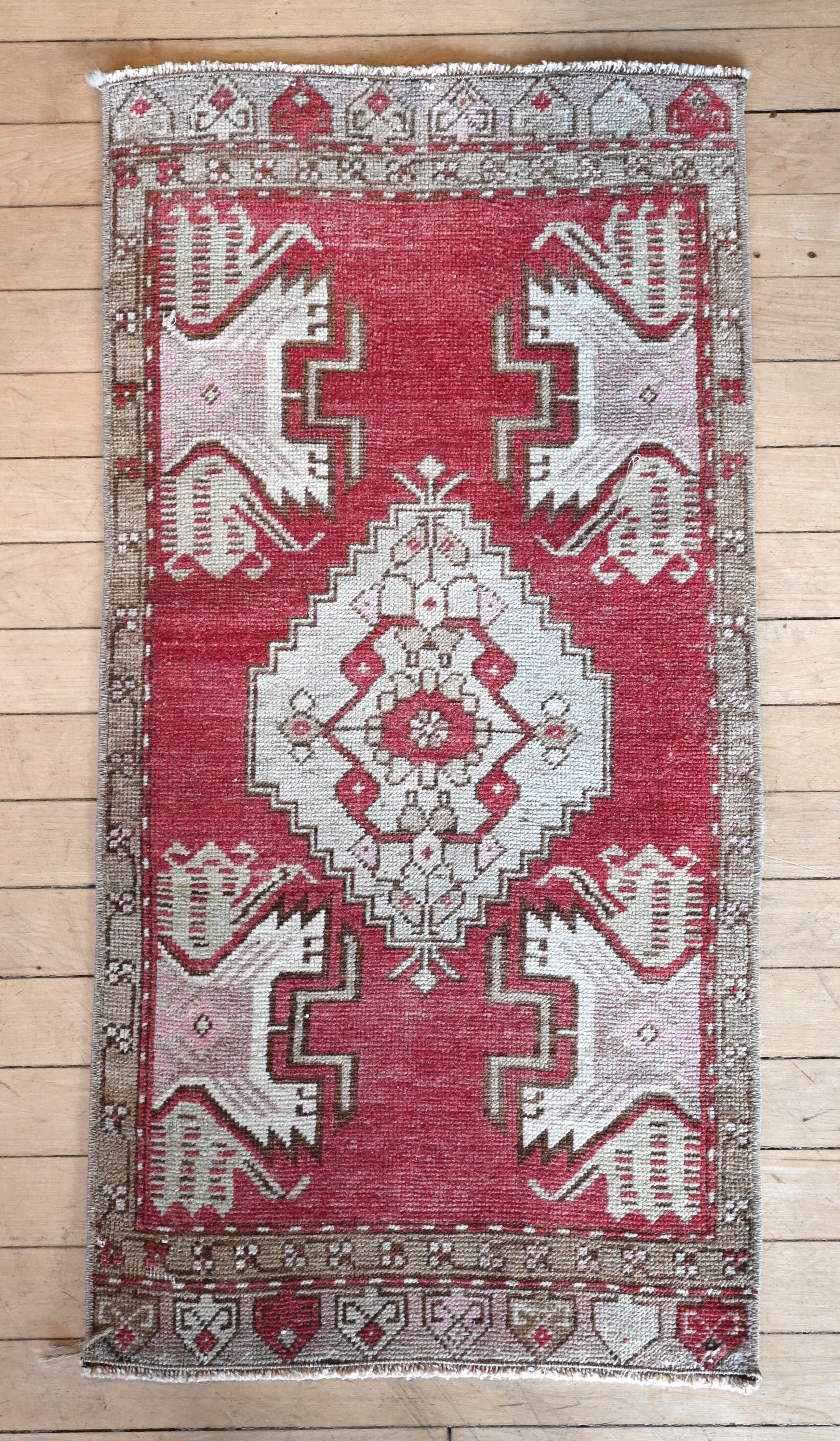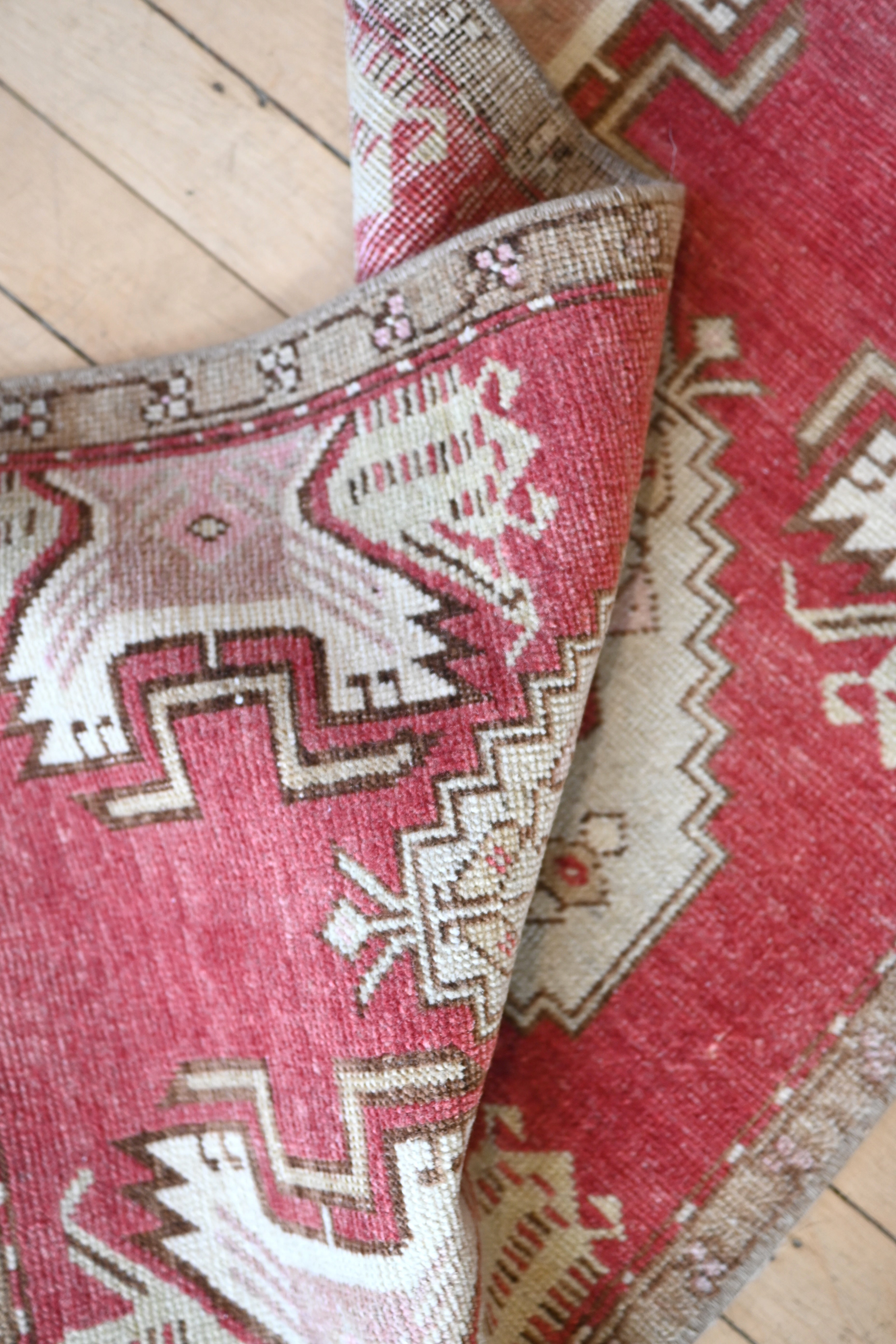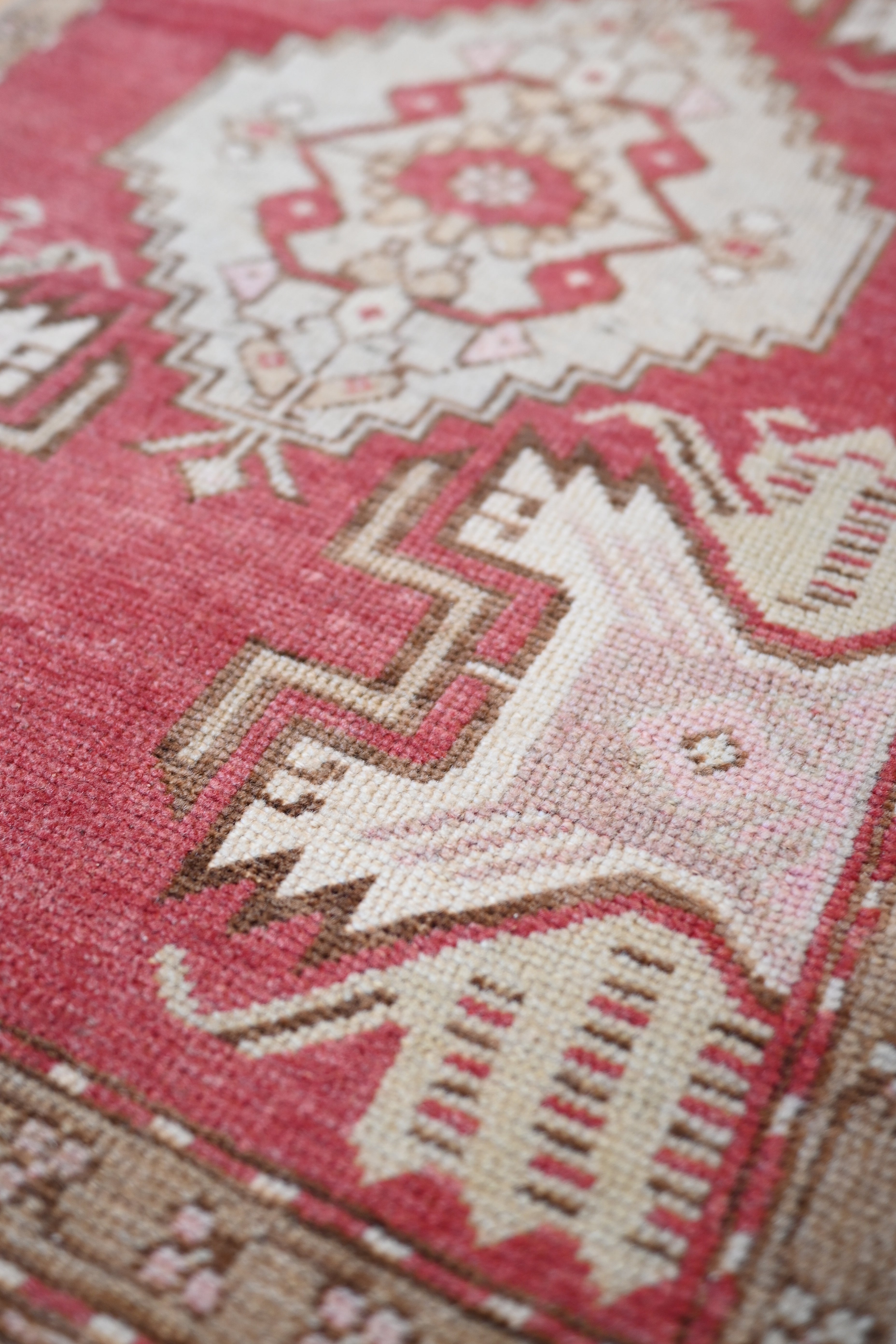 Vintage mat in raspberry red, soft browns, pink, purple and ivory.
