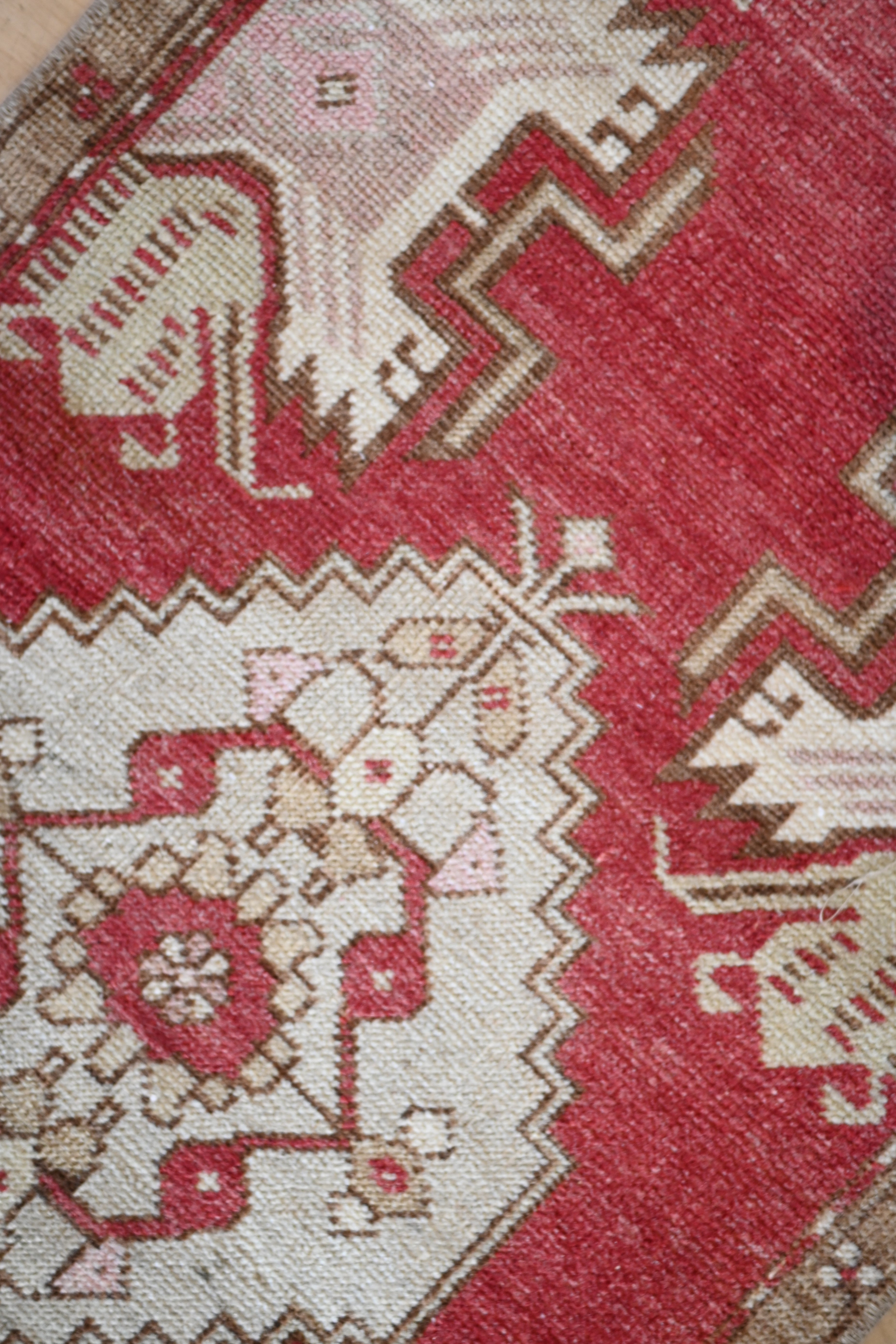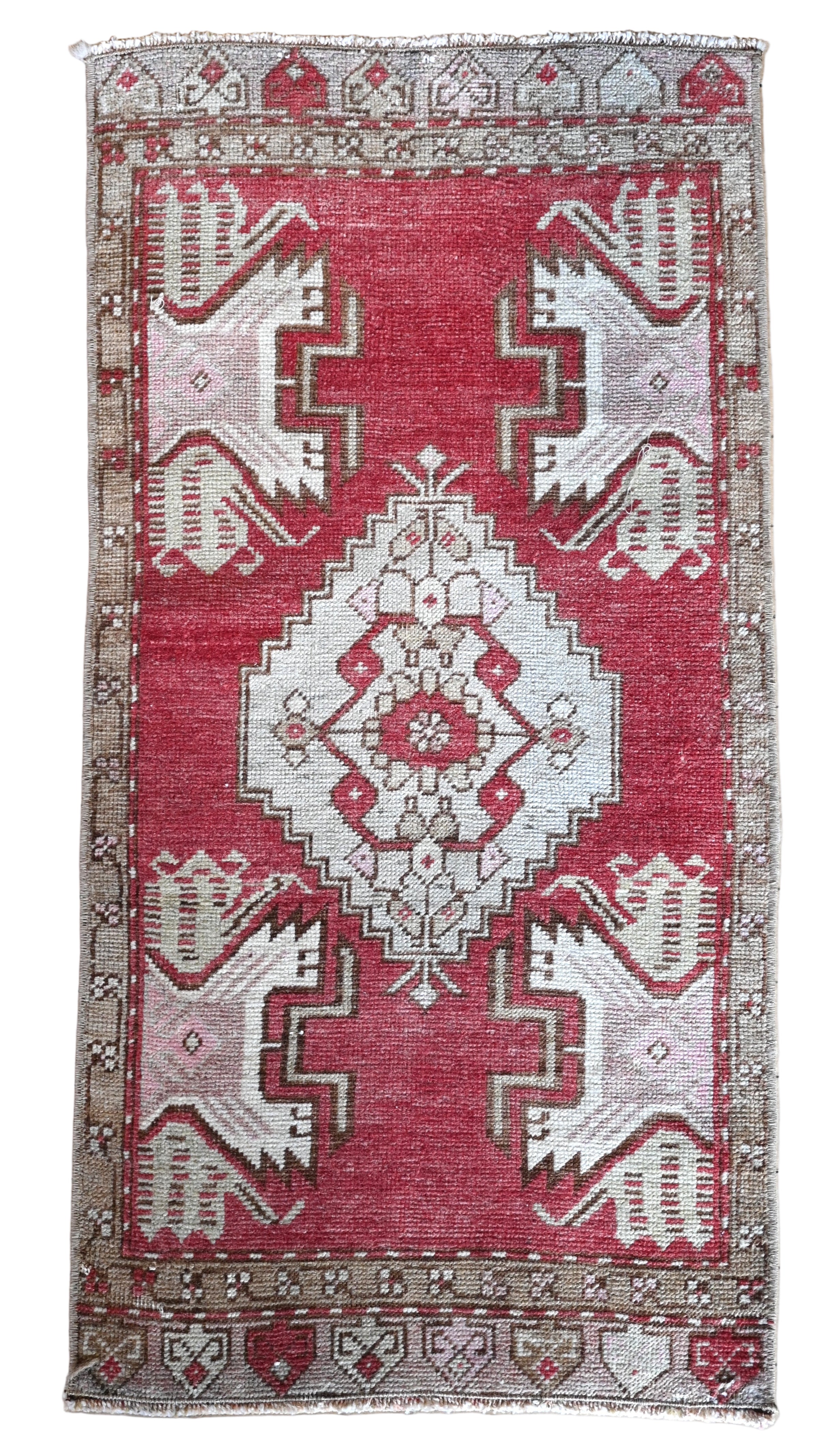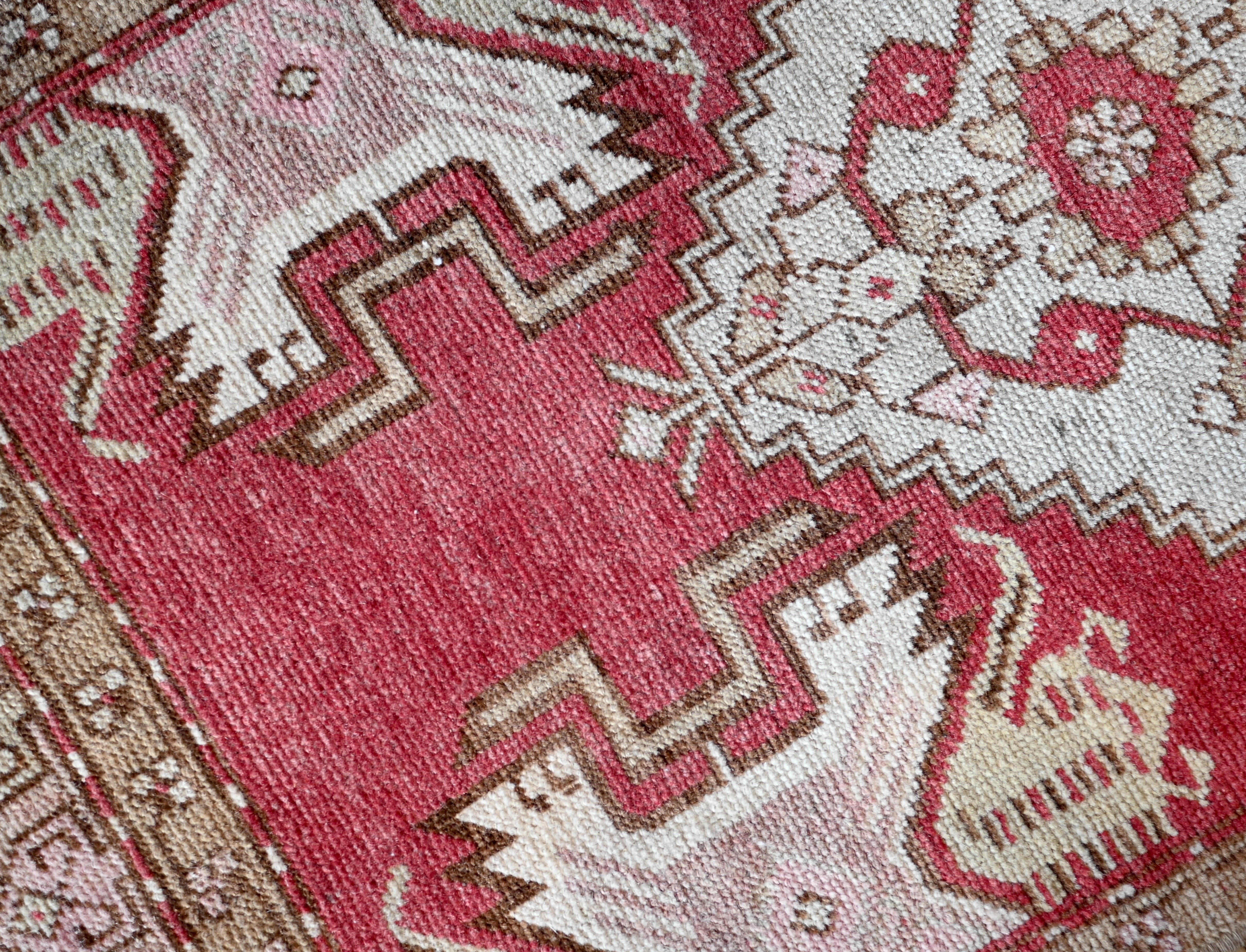 Vintage mat in raspberry red, soft browns, pink, purple and ivory.
