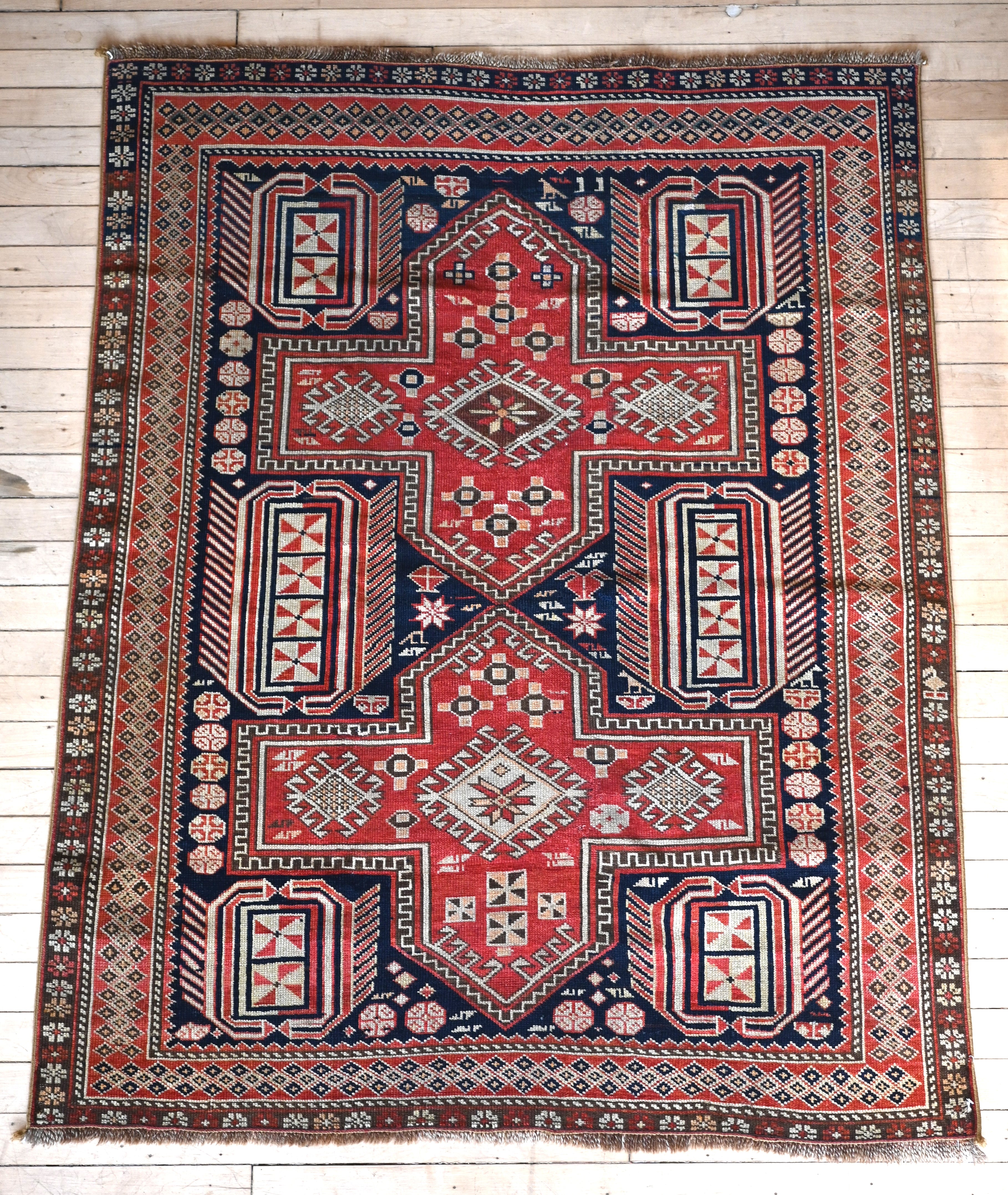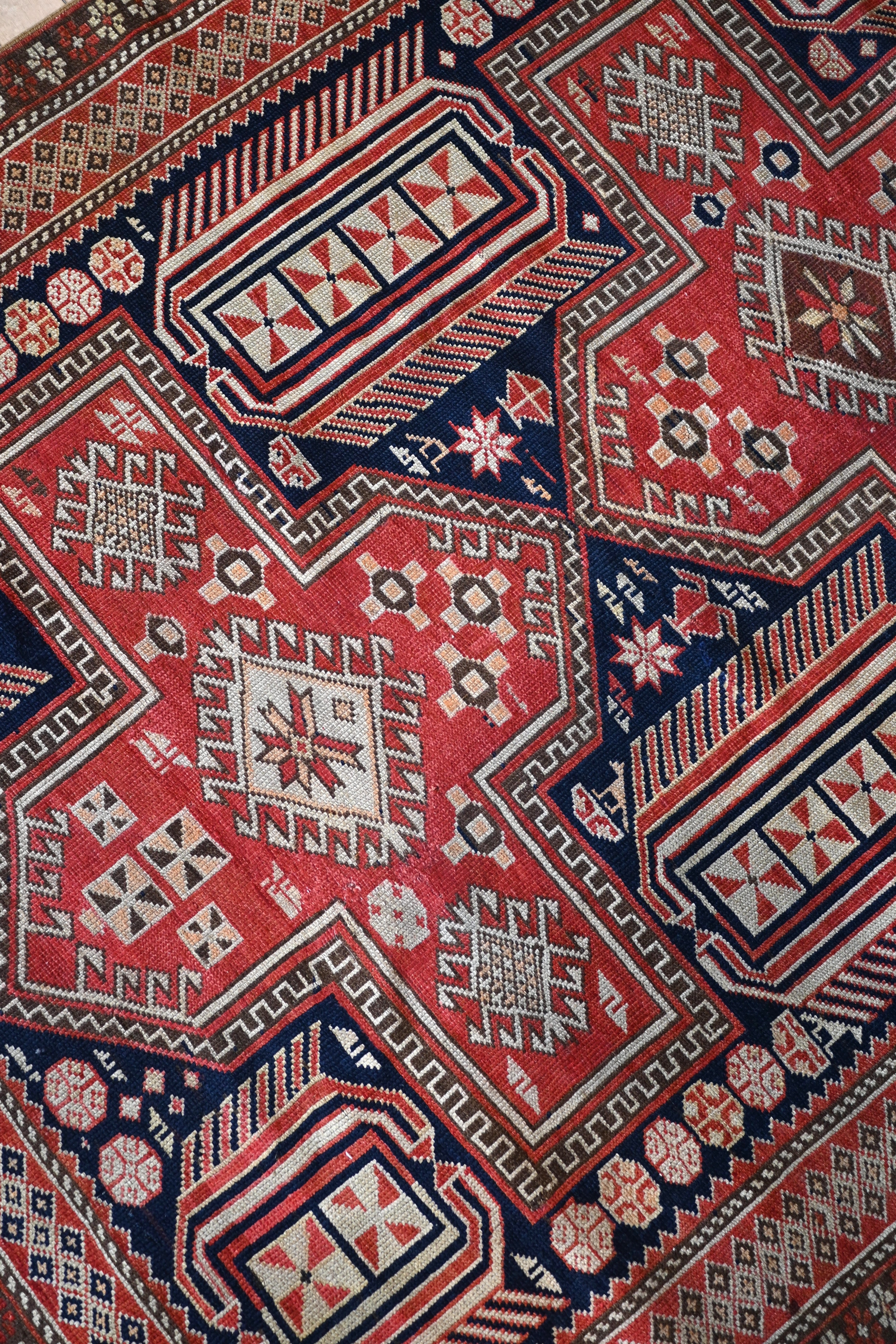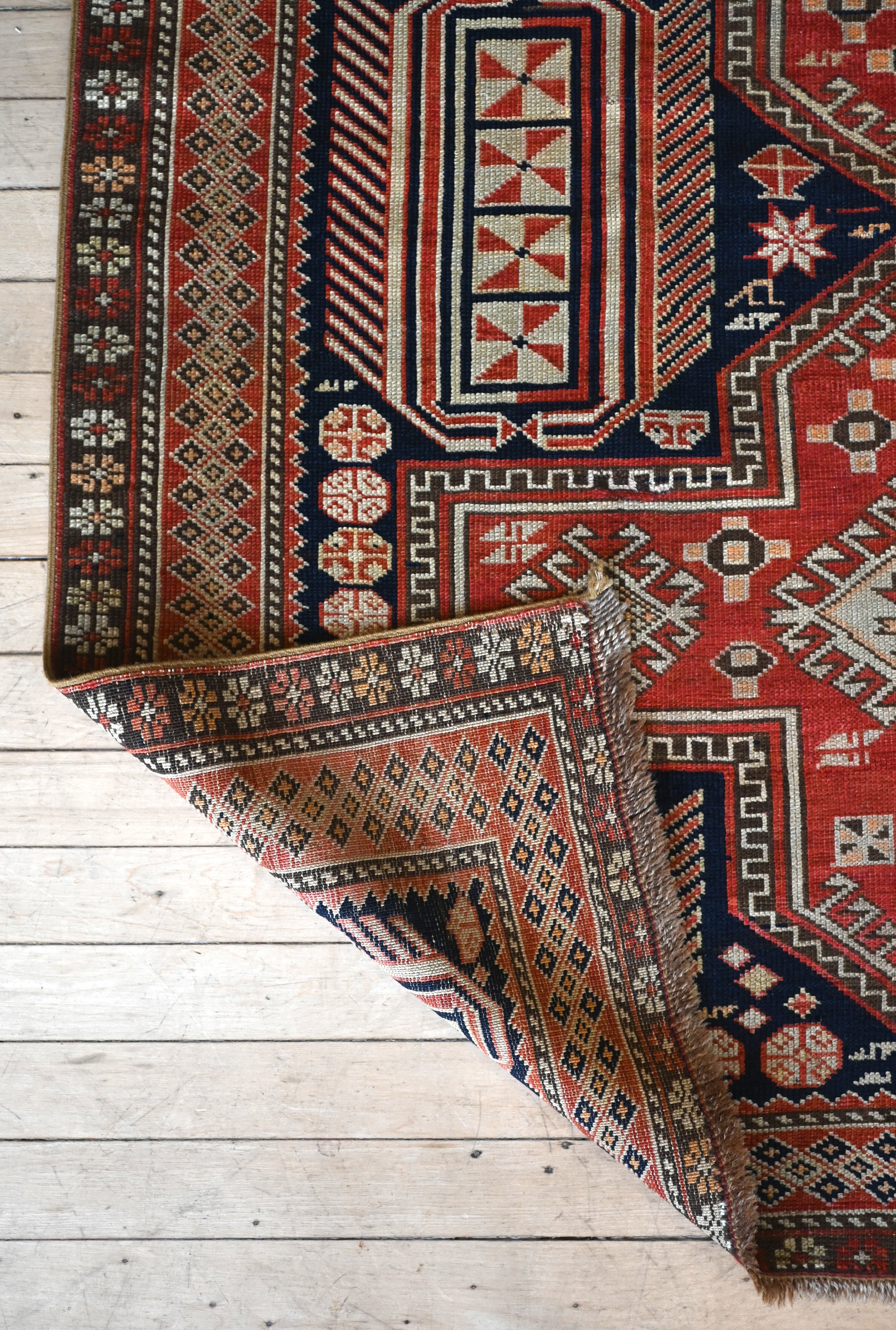 Late 19th century Shirvan Kazak with deep navy, camel, madder red and ivory