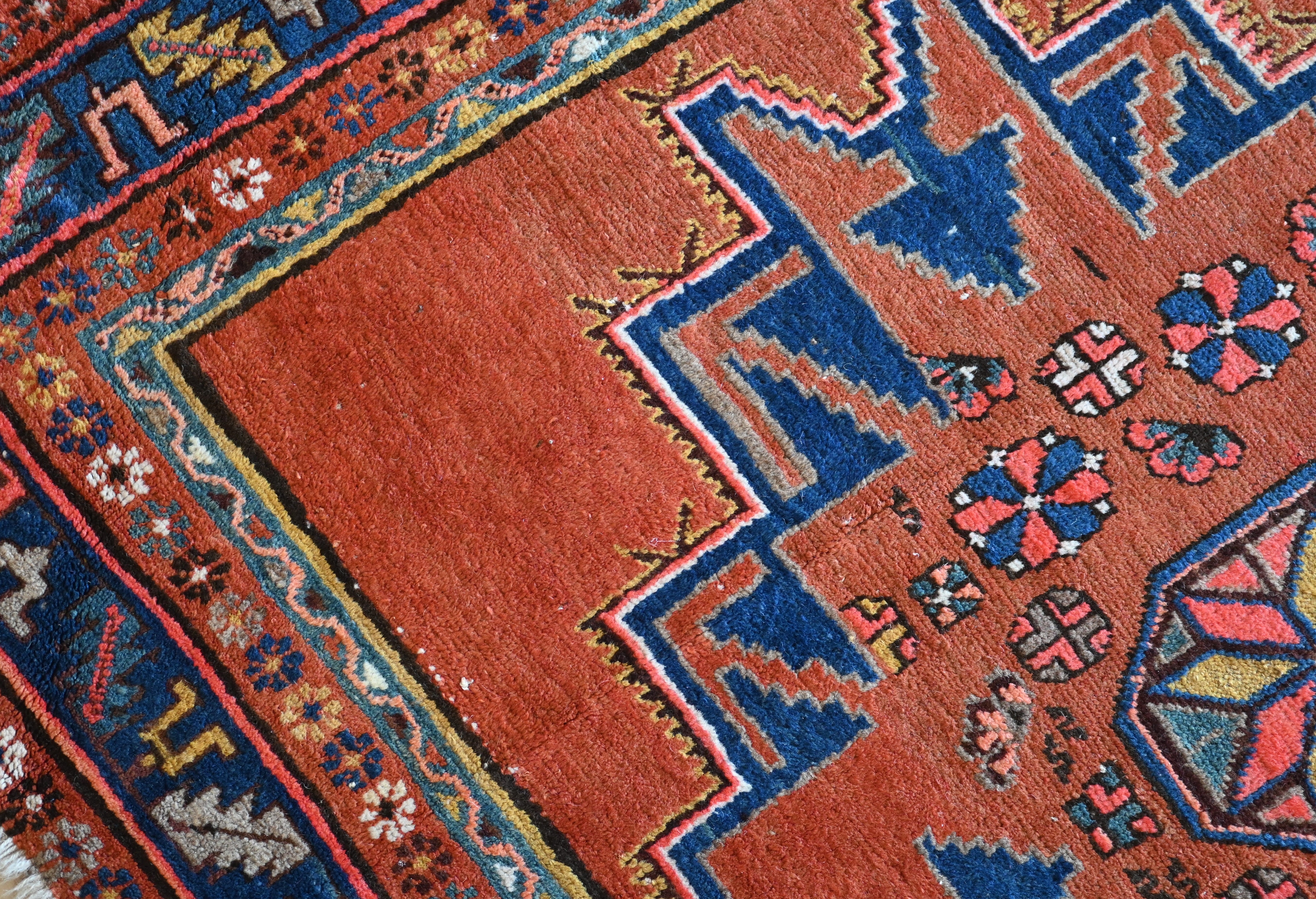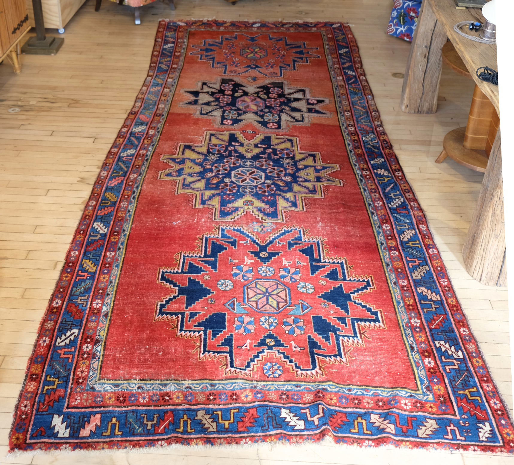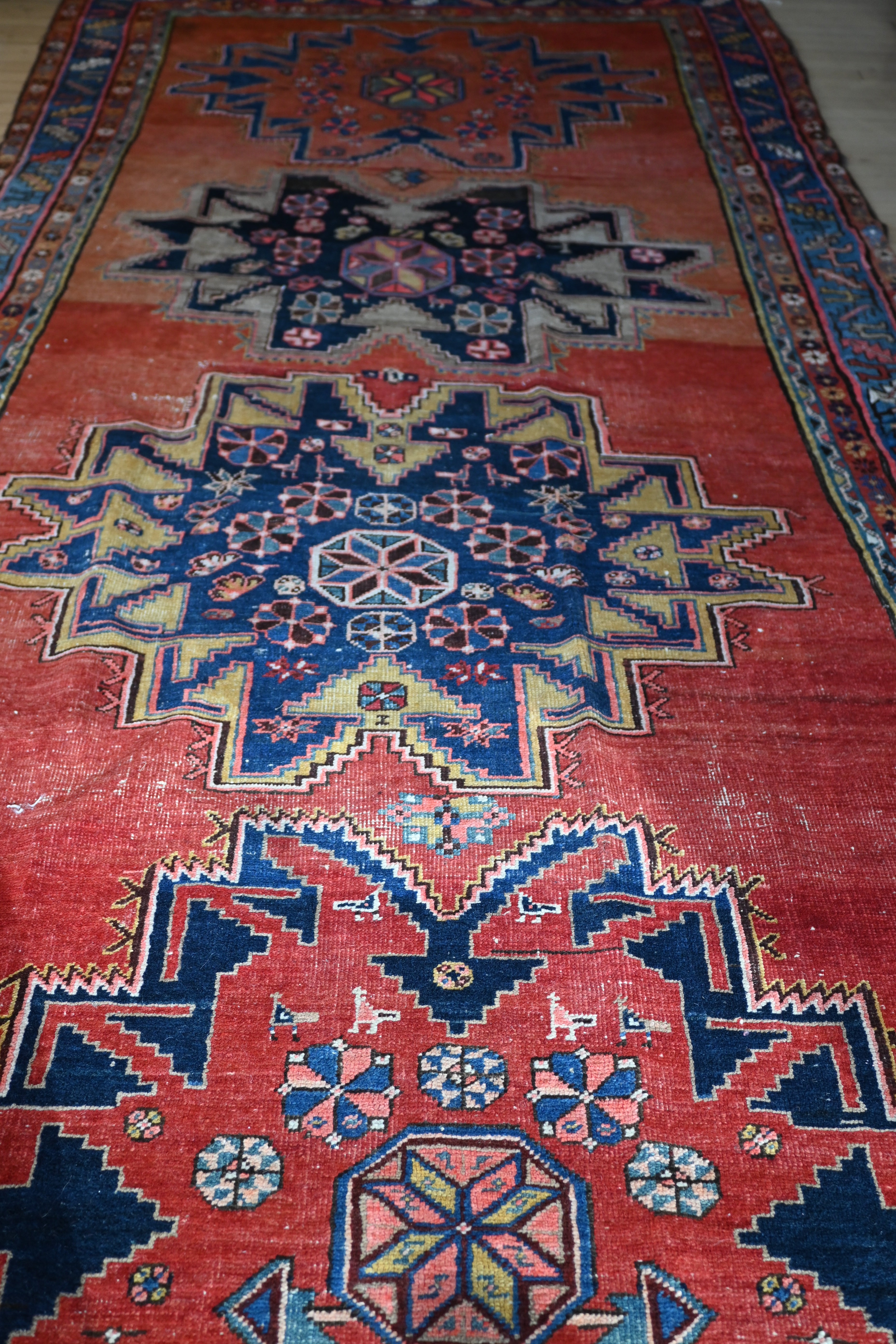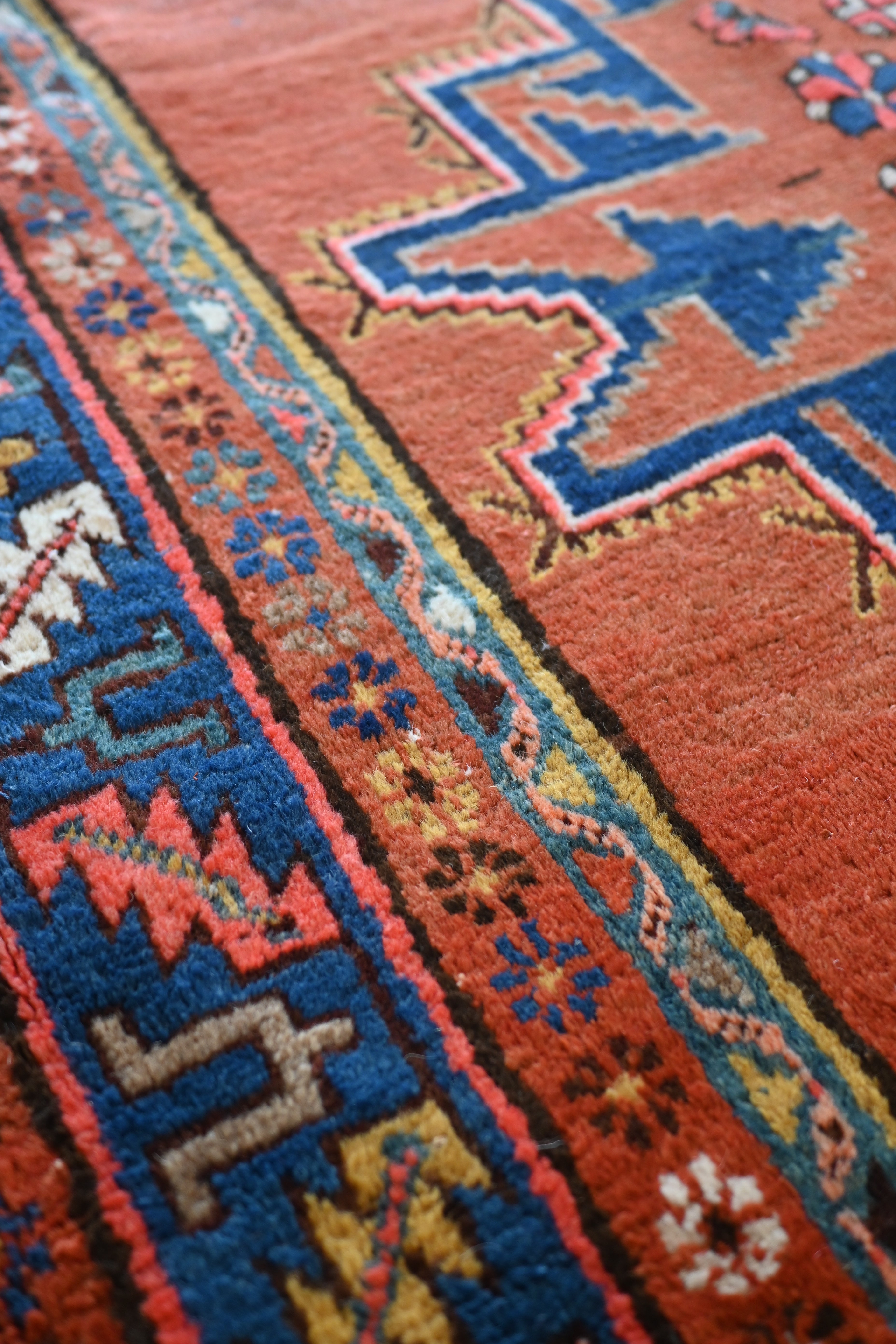 A striking gallery carpet with a large lesghi star design and vibrant tones of rust orange, hot pink, blue, camel and jade green