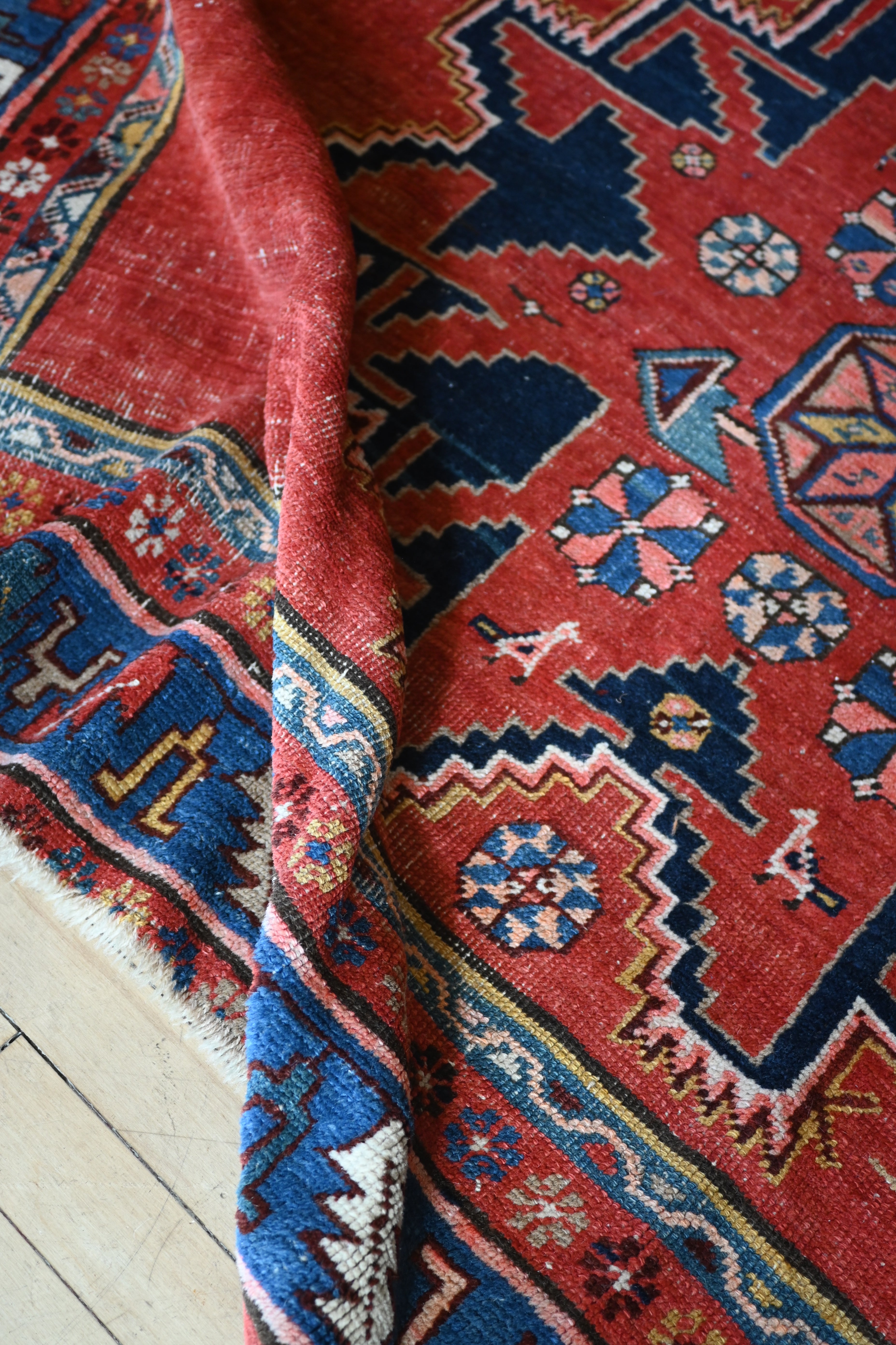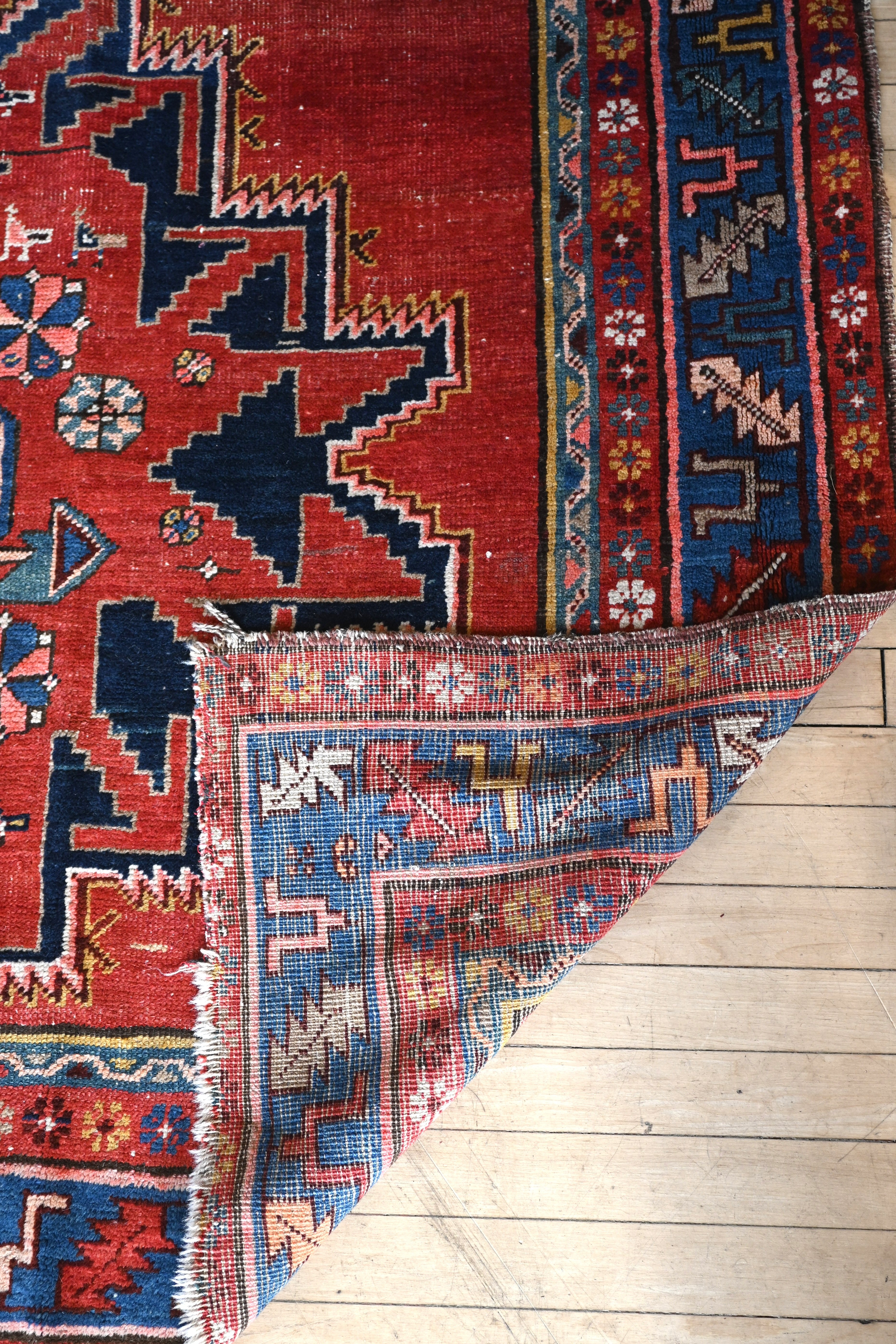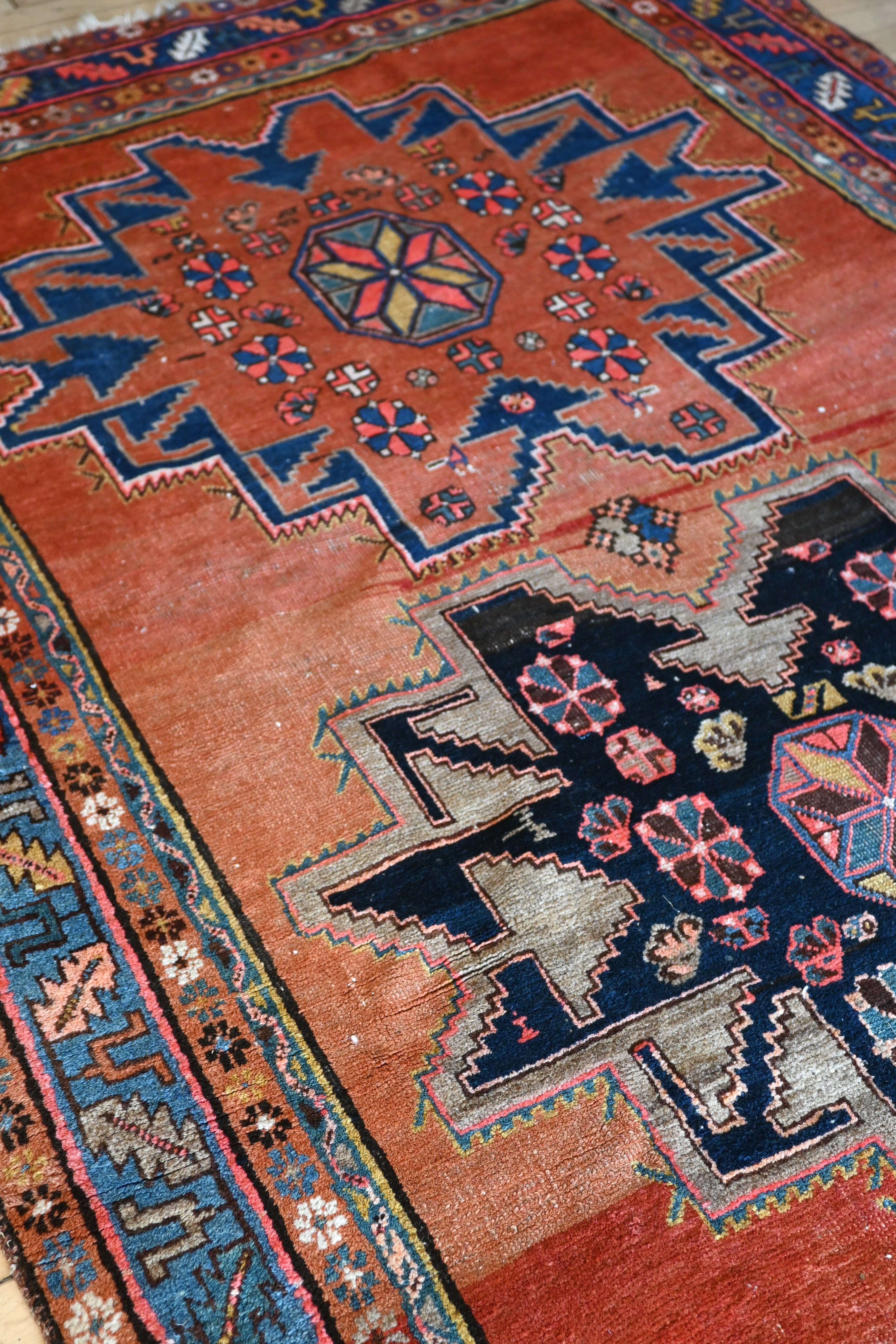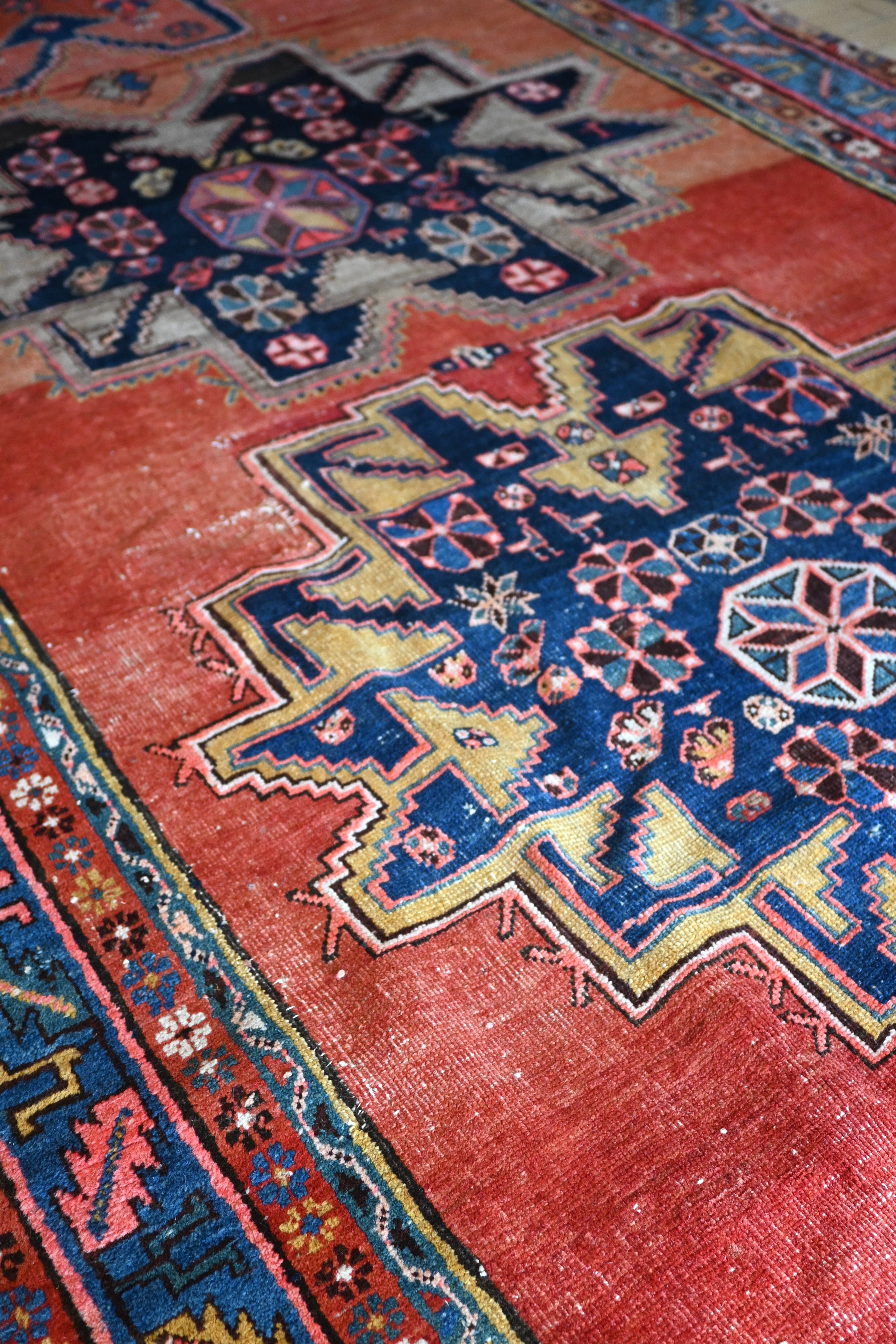 A striking gallery carpet with a large lesghi star design and vibrant tones of rust orange, hot pink, blue, camel and jade green
