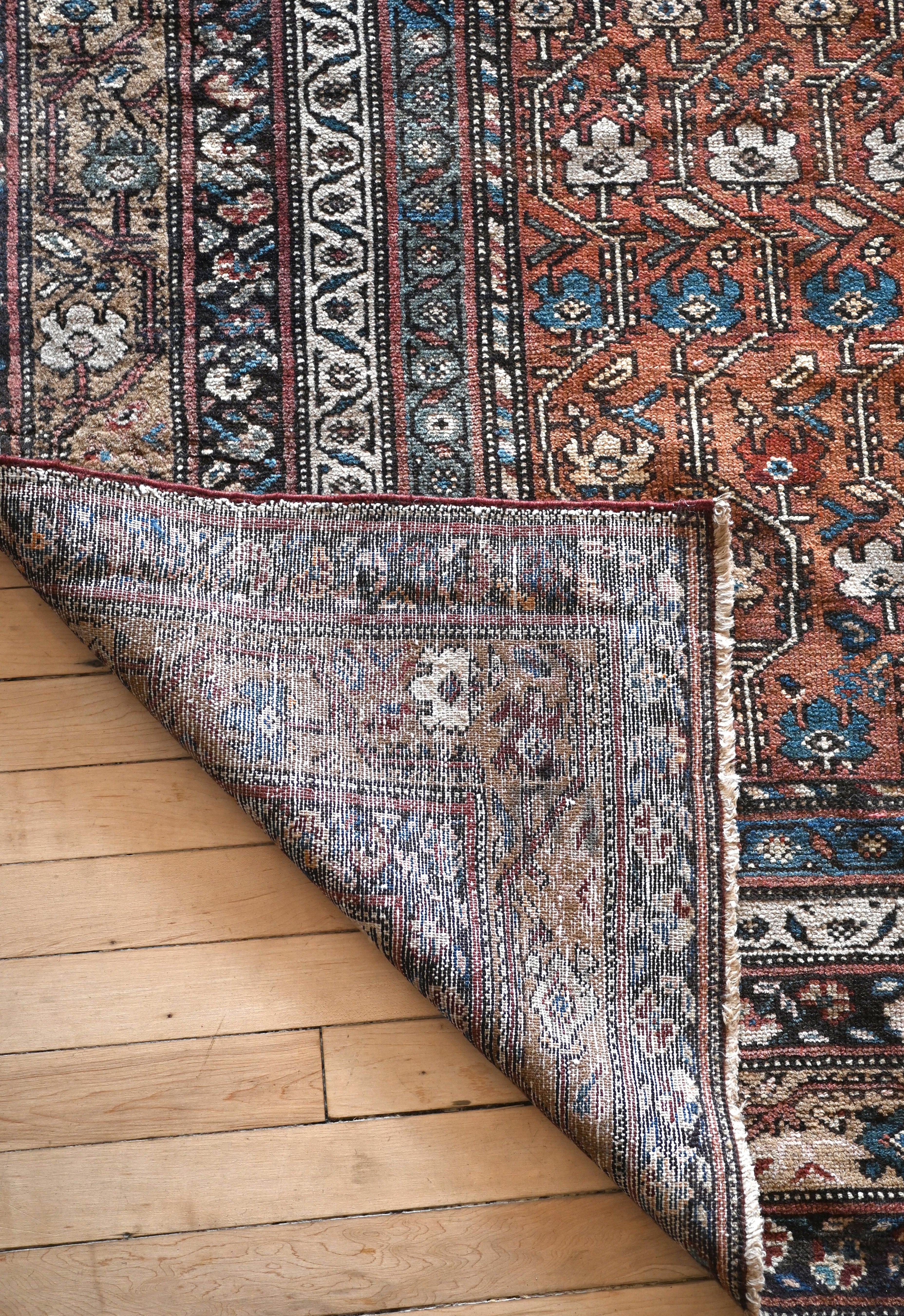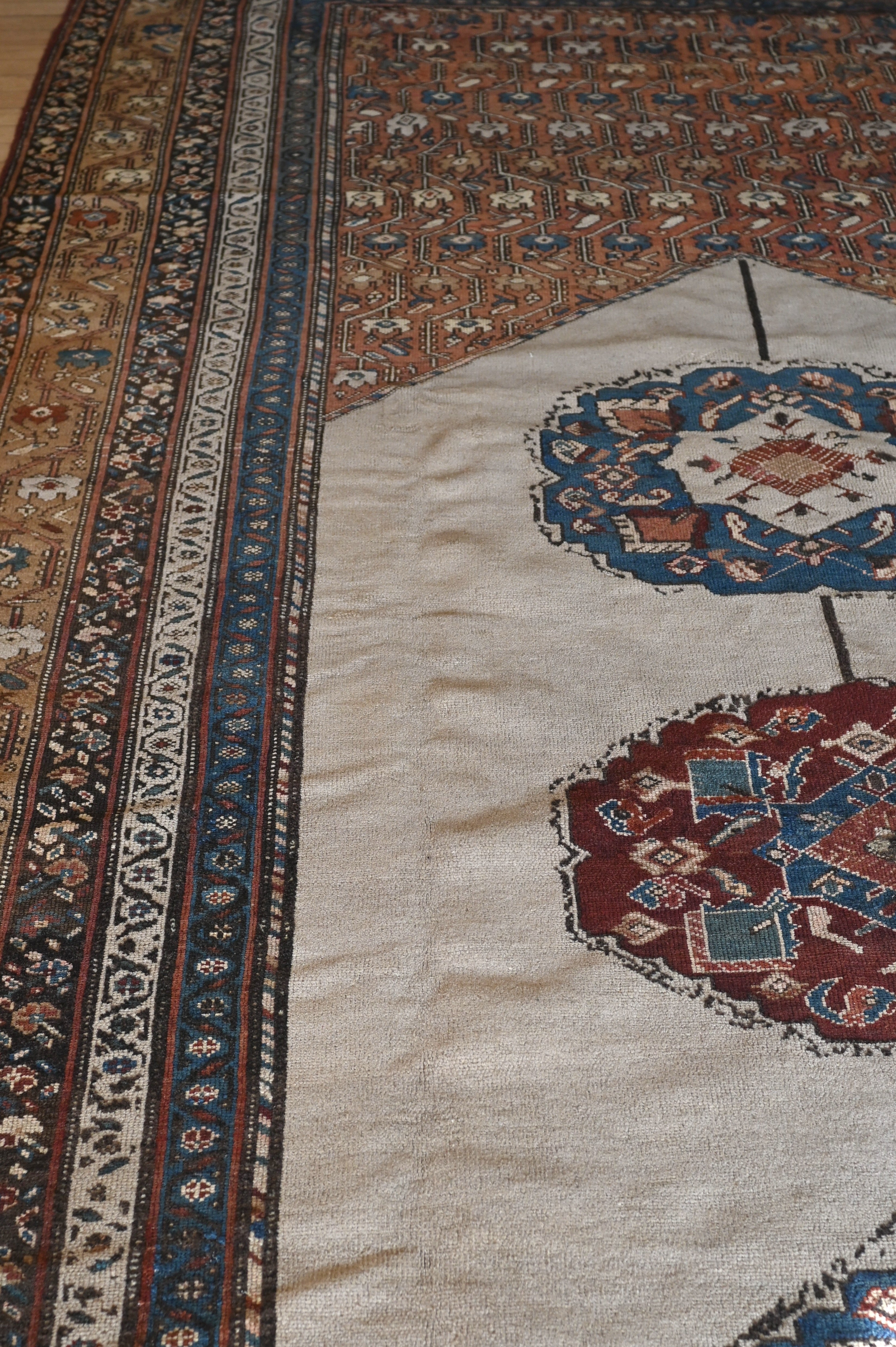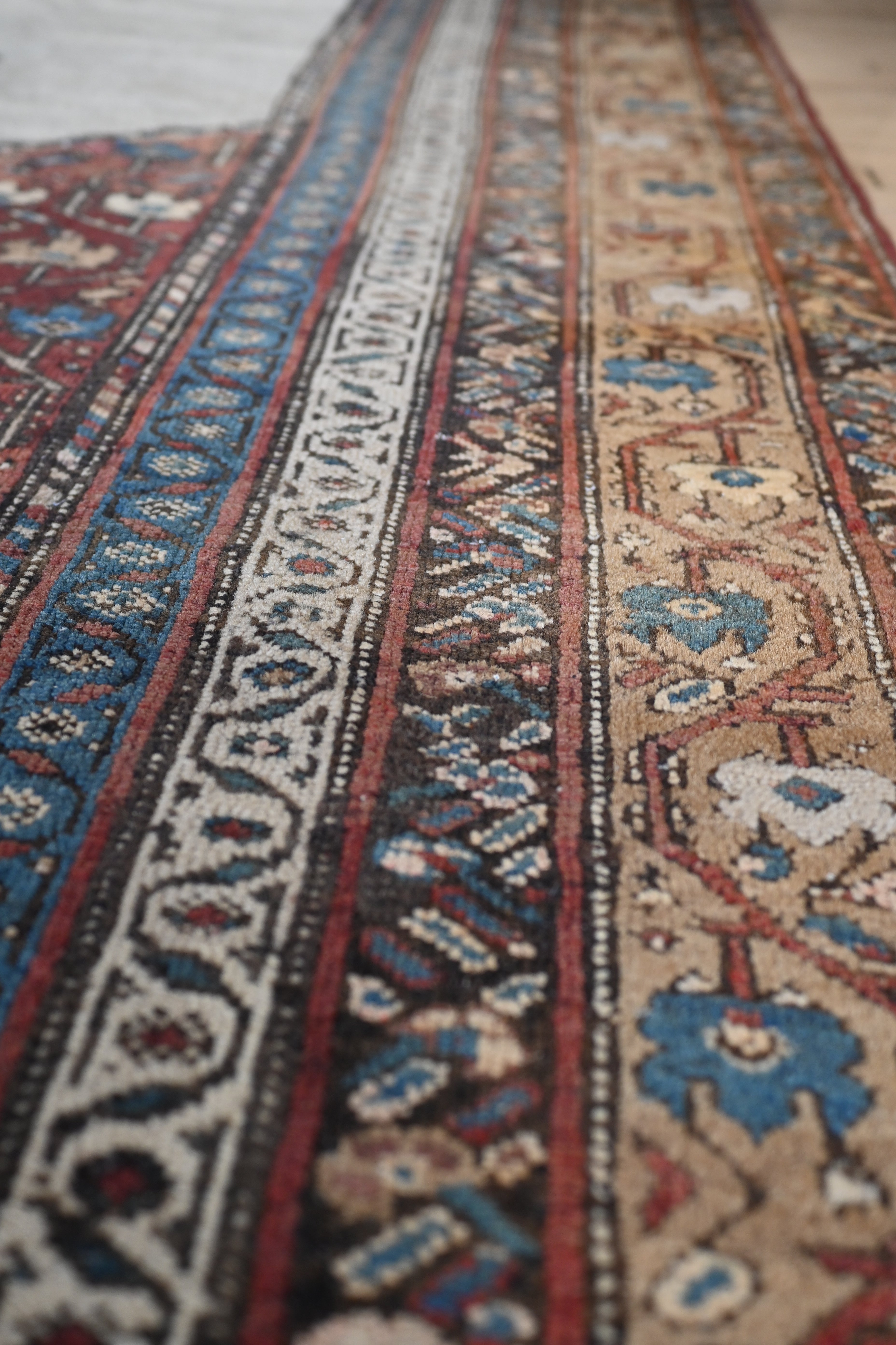 Early 20th century gallery carpet with rich browns, ivory, rust and indigo blue